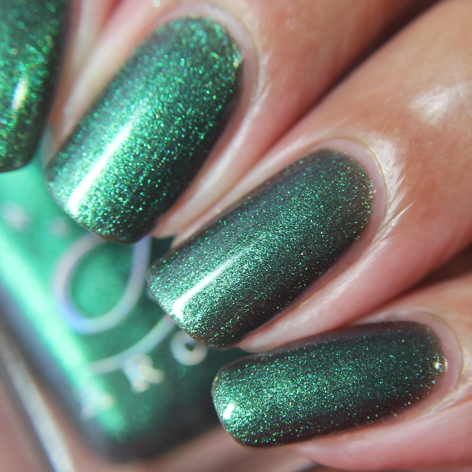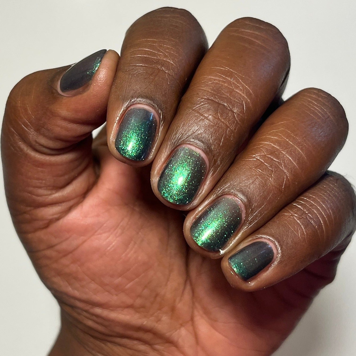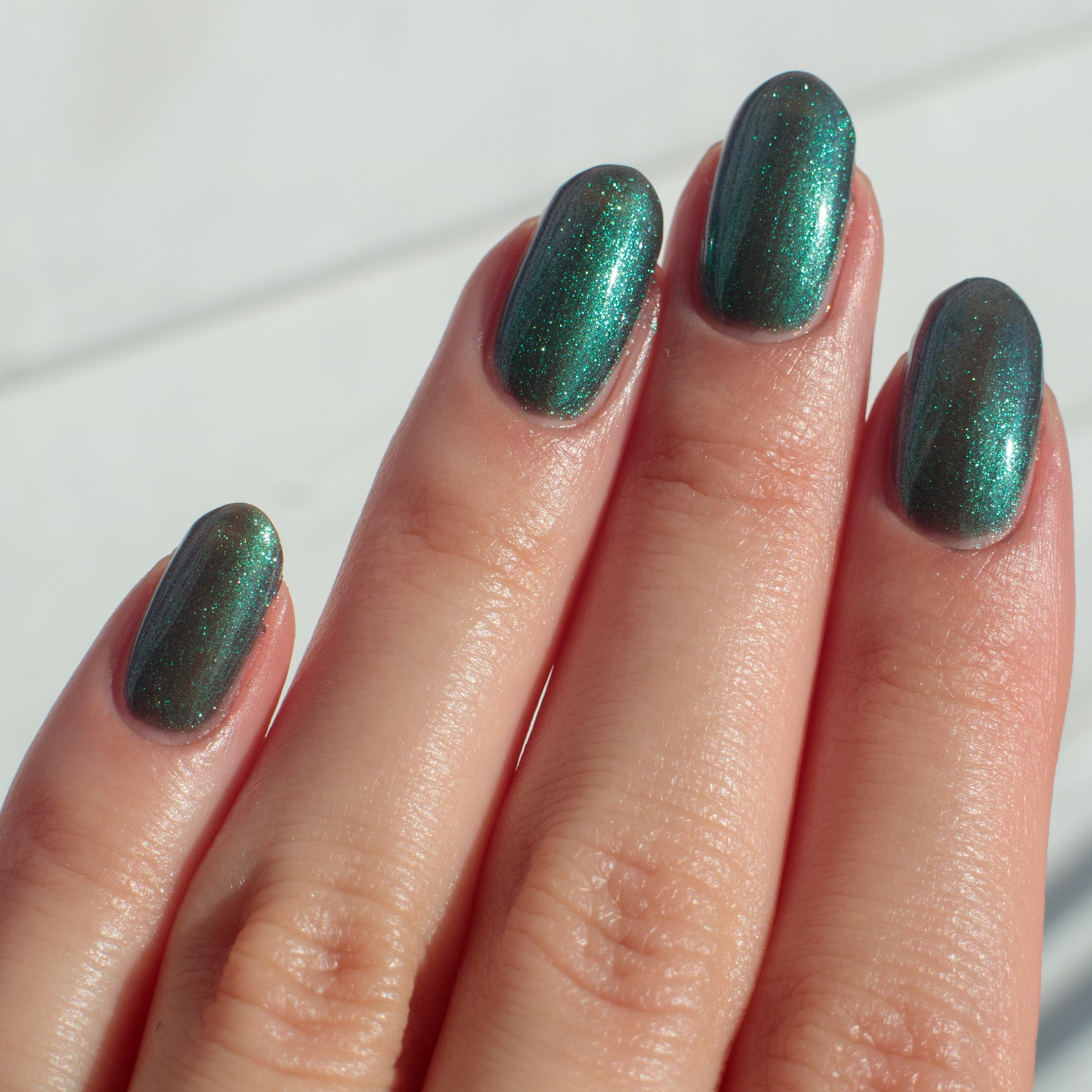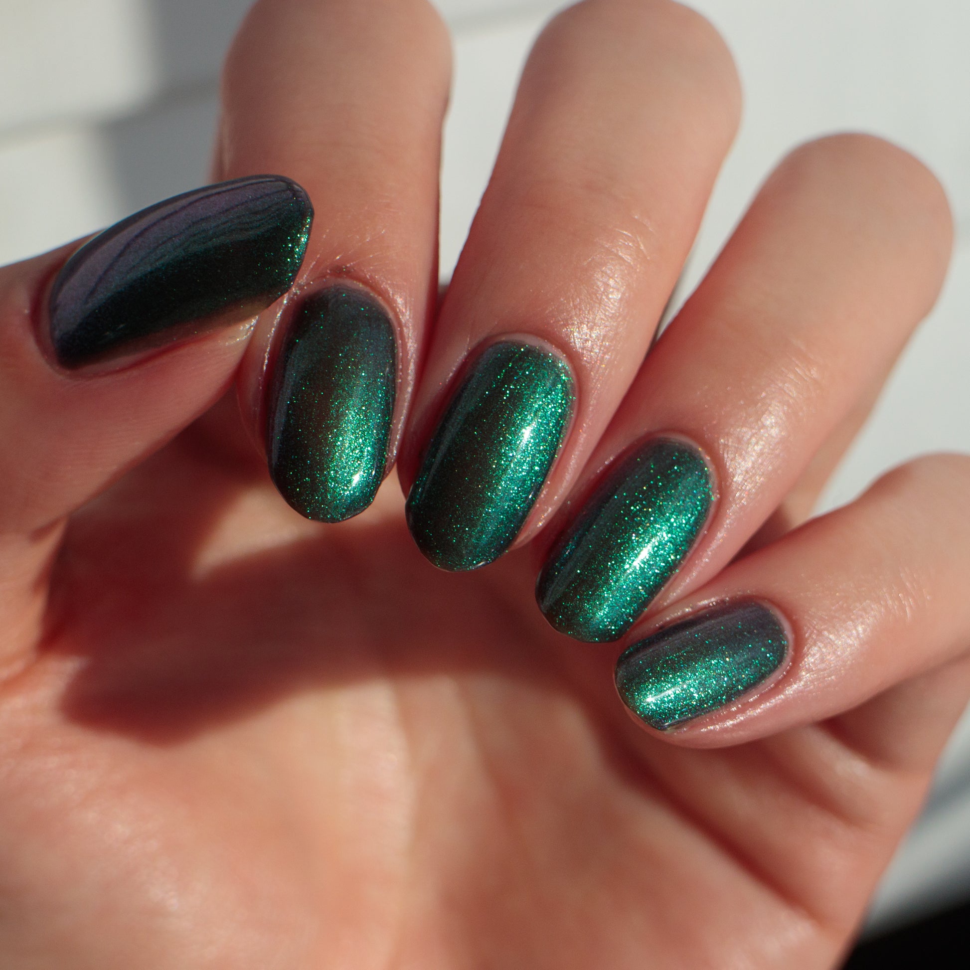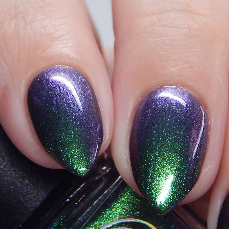 Into the Abyss is inspired by the depths of the ocean (and also the black and green nudibranch!) This polish has a smoky black base with strong larger particle green shimmer that shifts to purple at sharp angles.