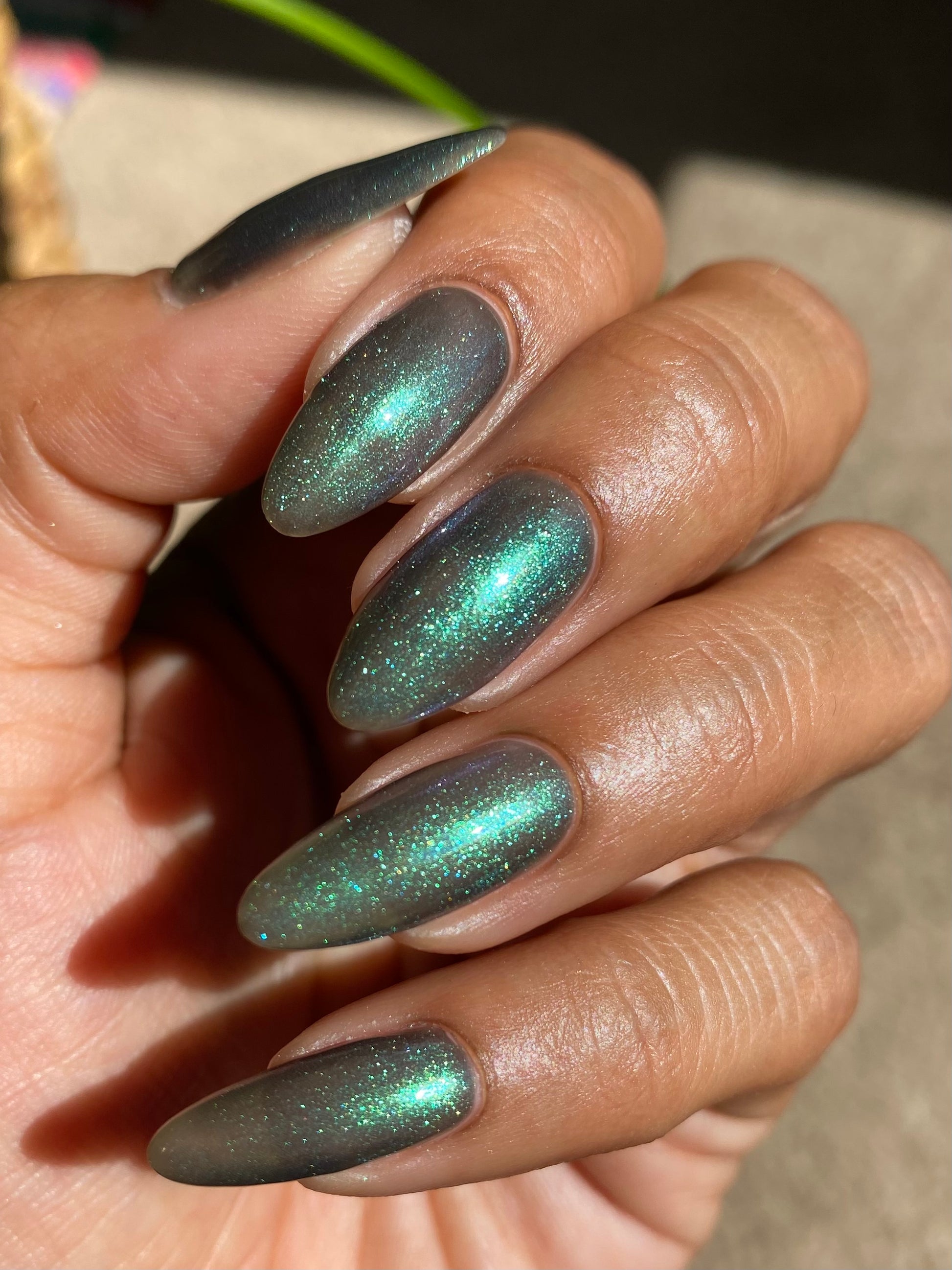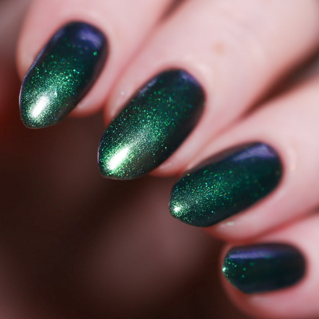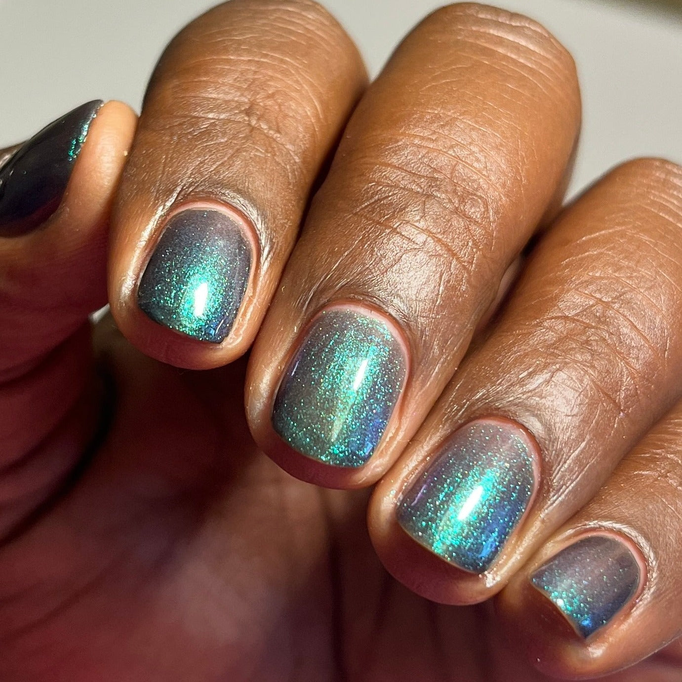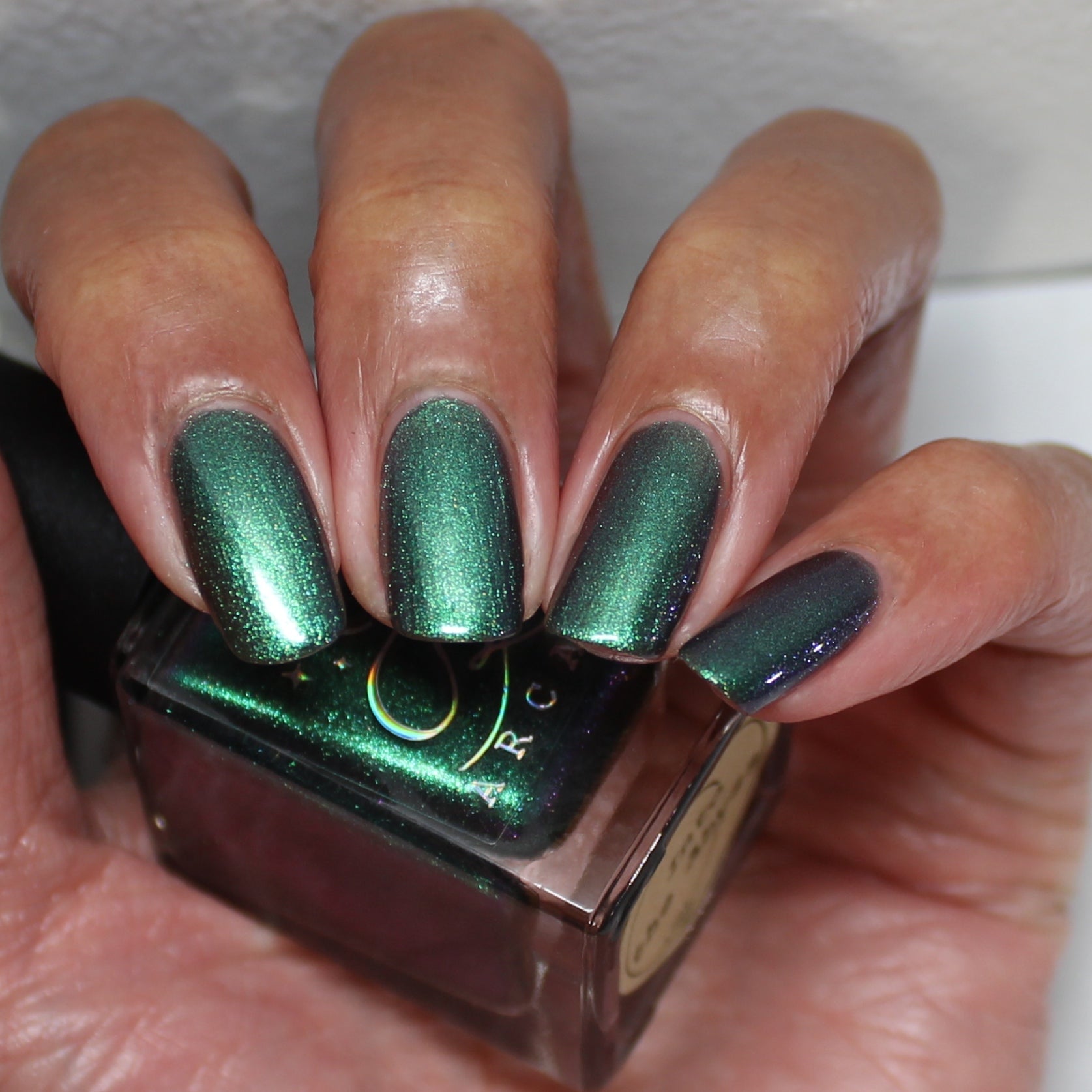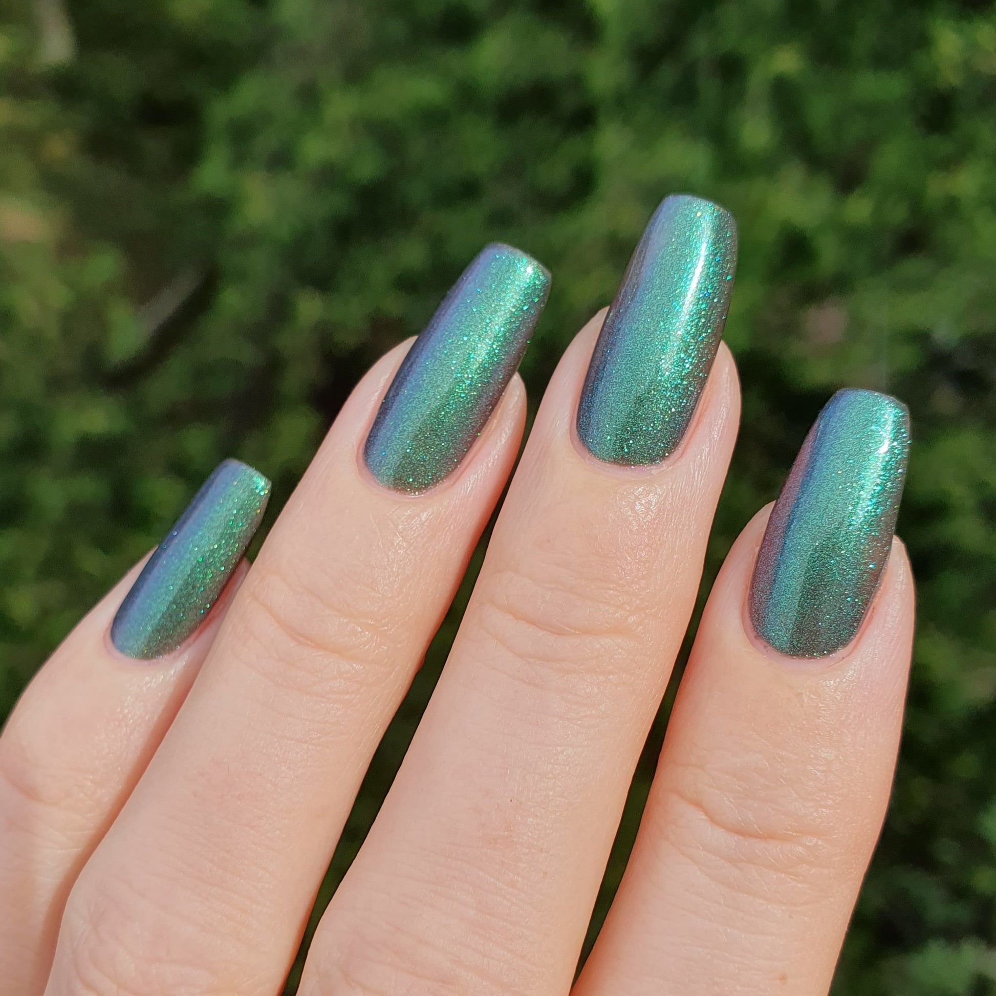 Into the Abyss is inspired by the depths of the ocean (and also the black and green nudibranch!) This polish has a smoky black base with strong larger particle green shimmer that shifts to purple at sharp angles.