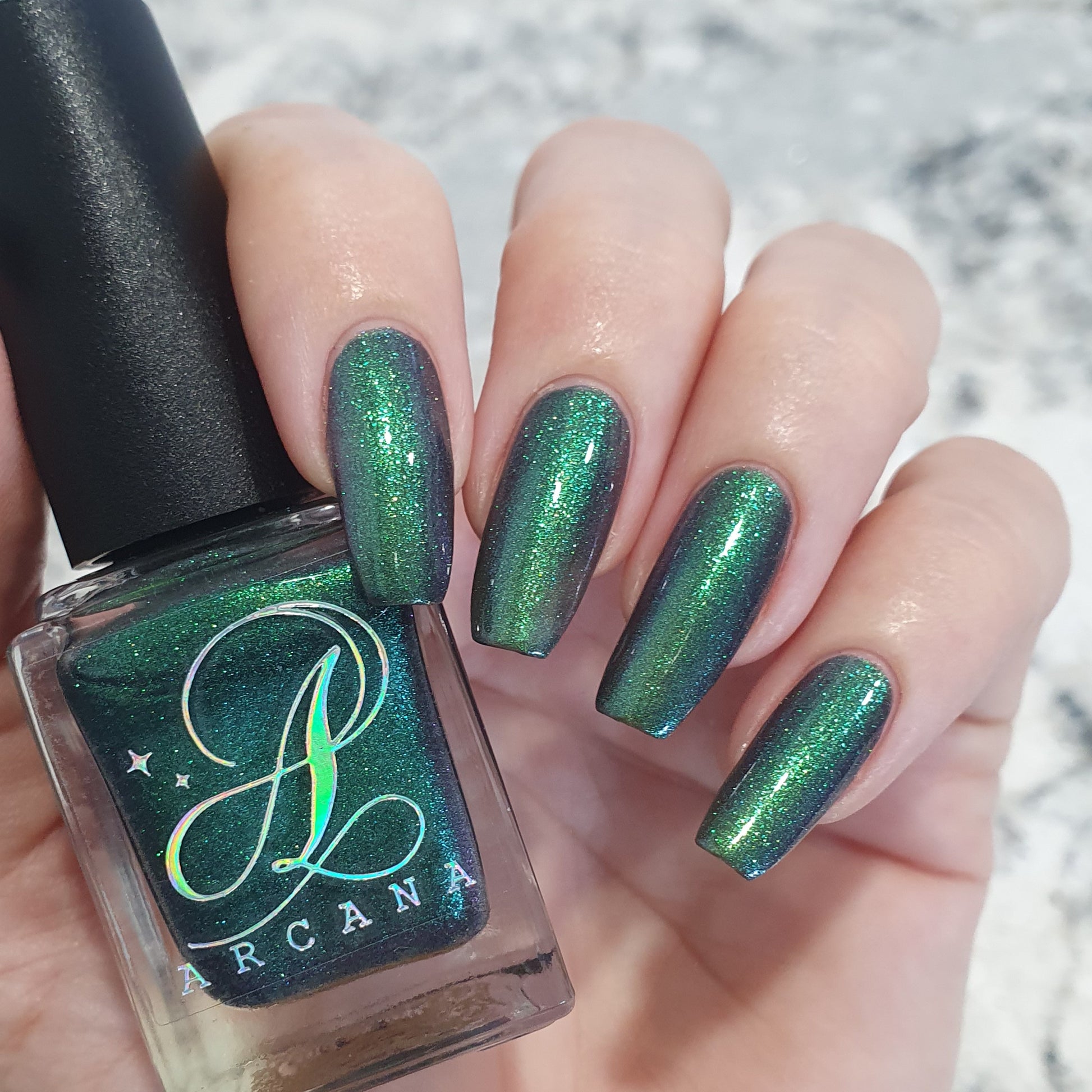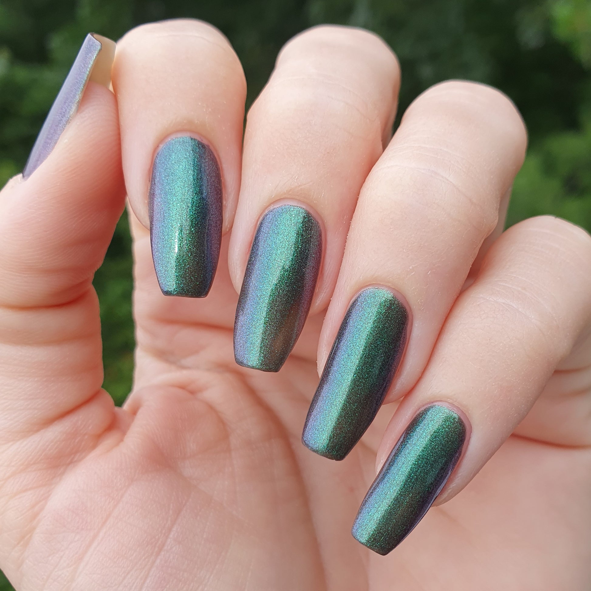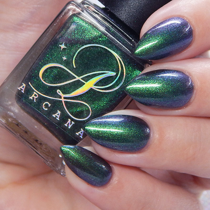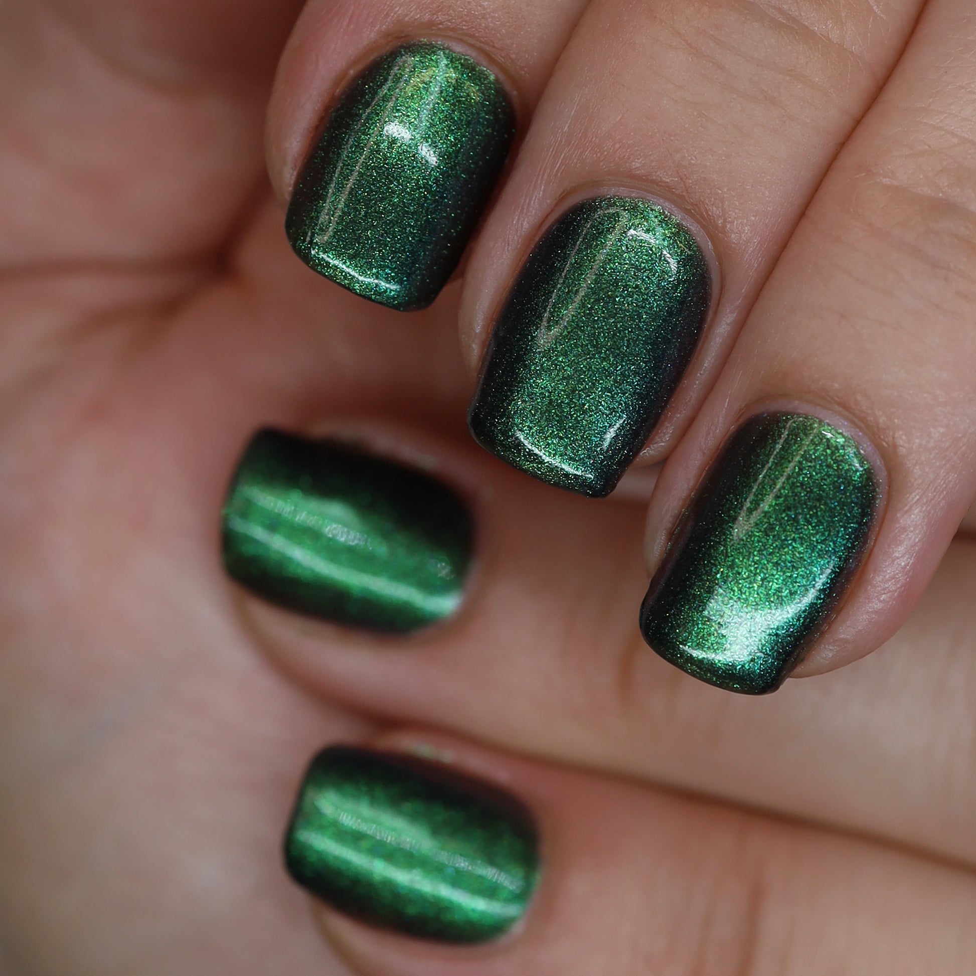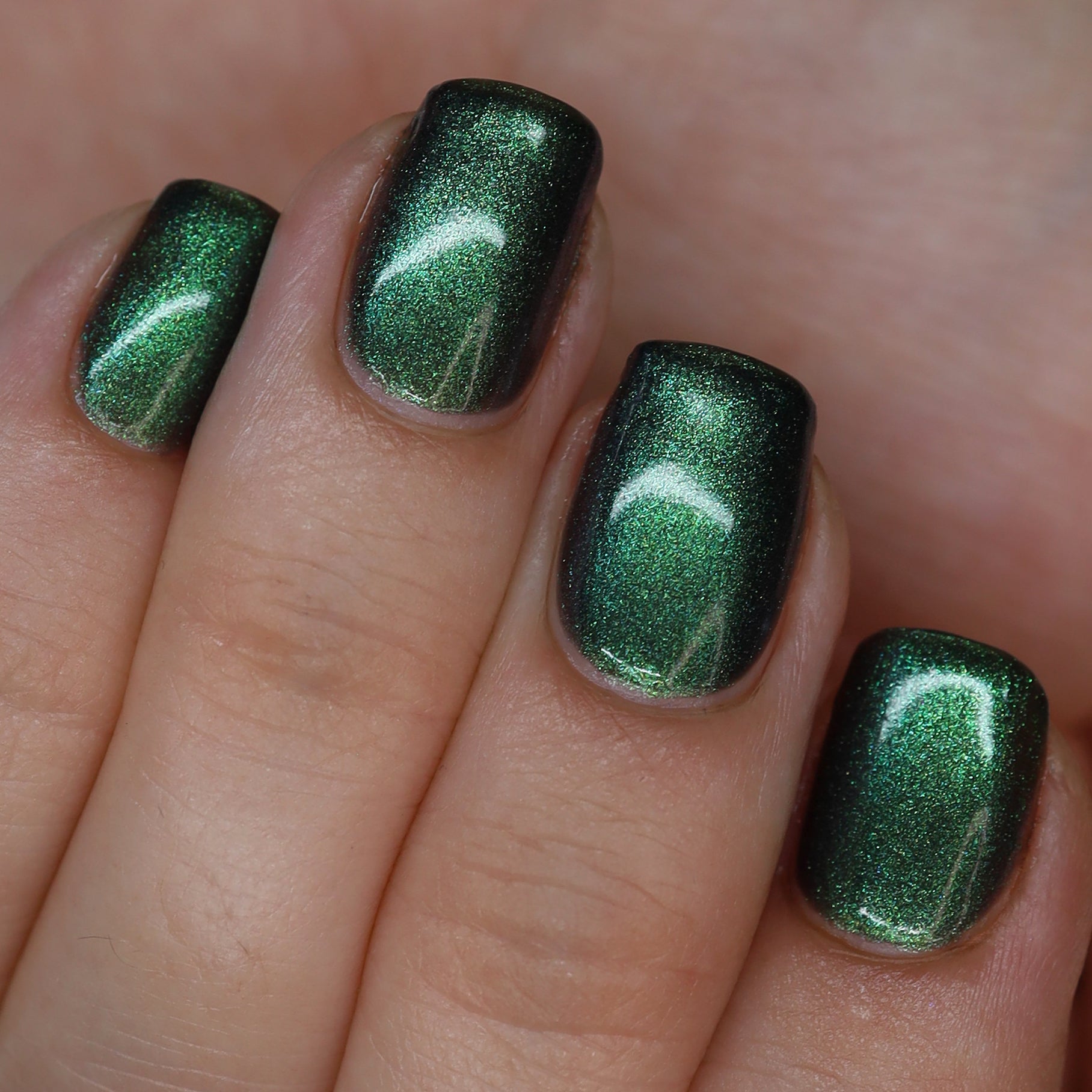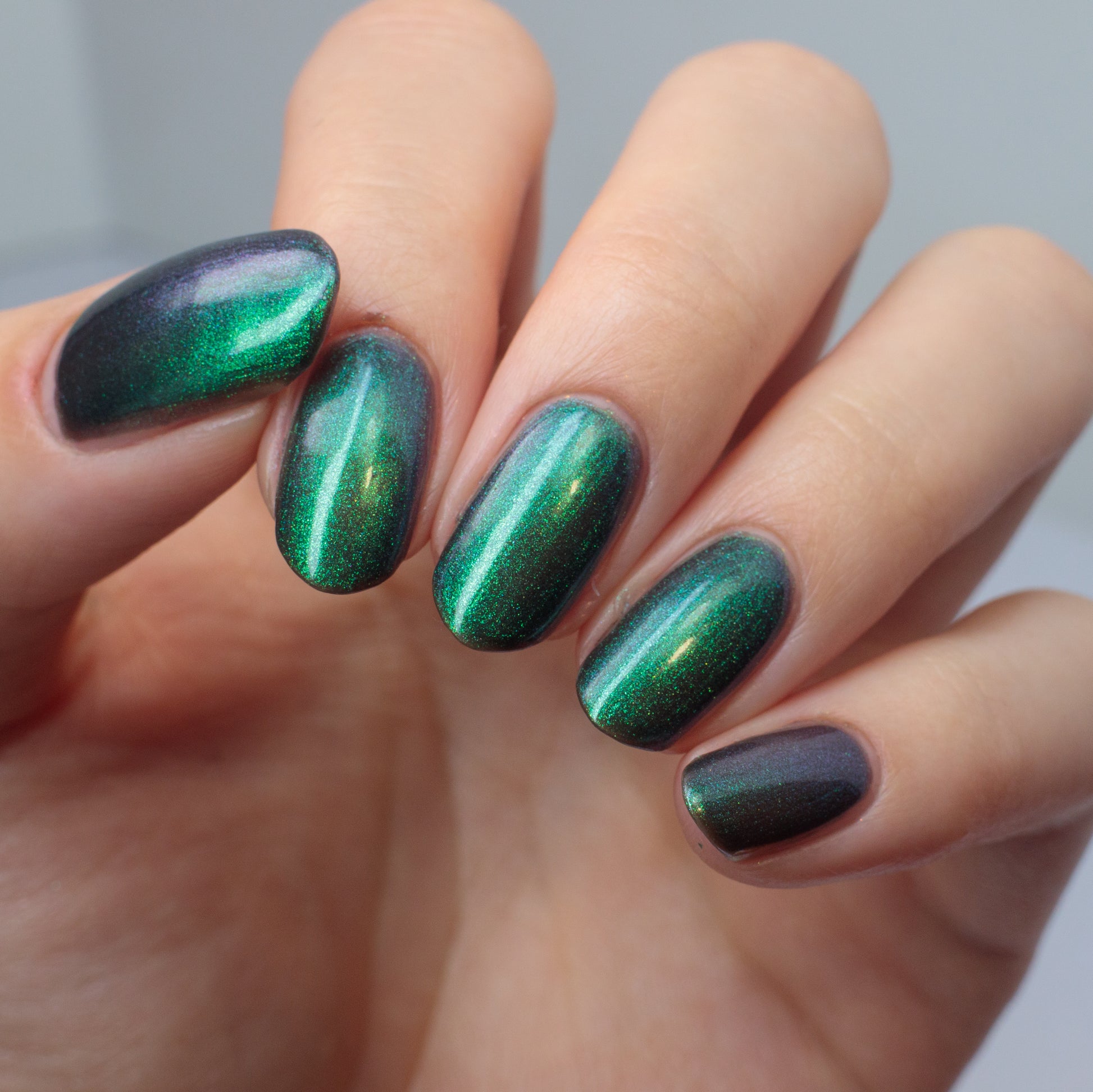 Into the Abyss is inspired by the depths of the ocean (and also the black and green nudibranch!) This polish has a smoky black base with strong larger particle green shimmer that shifts to purple at sharp angles.