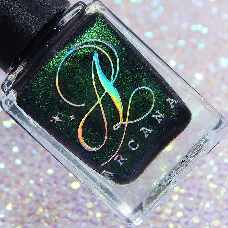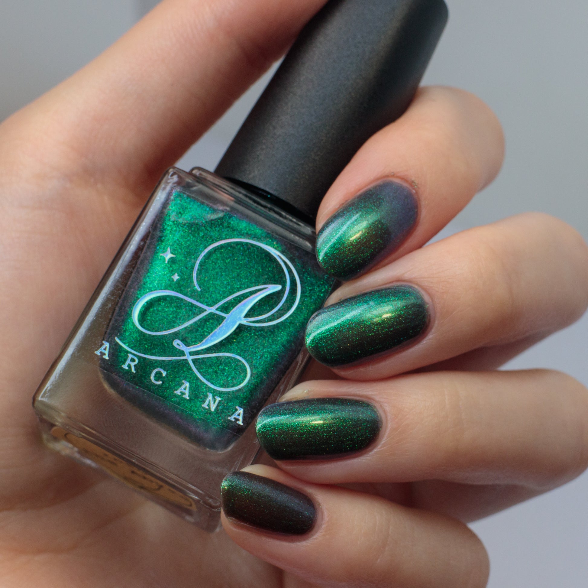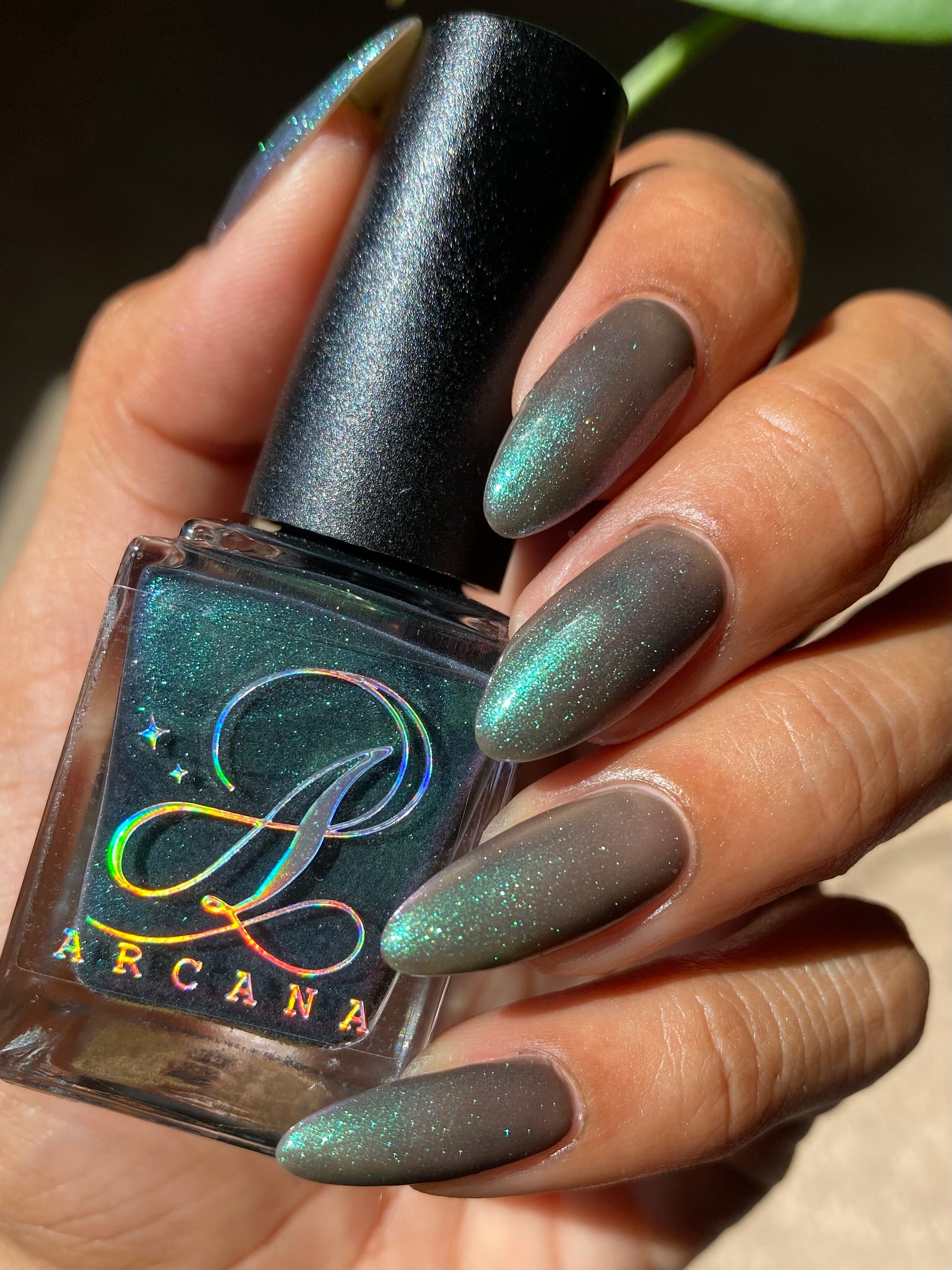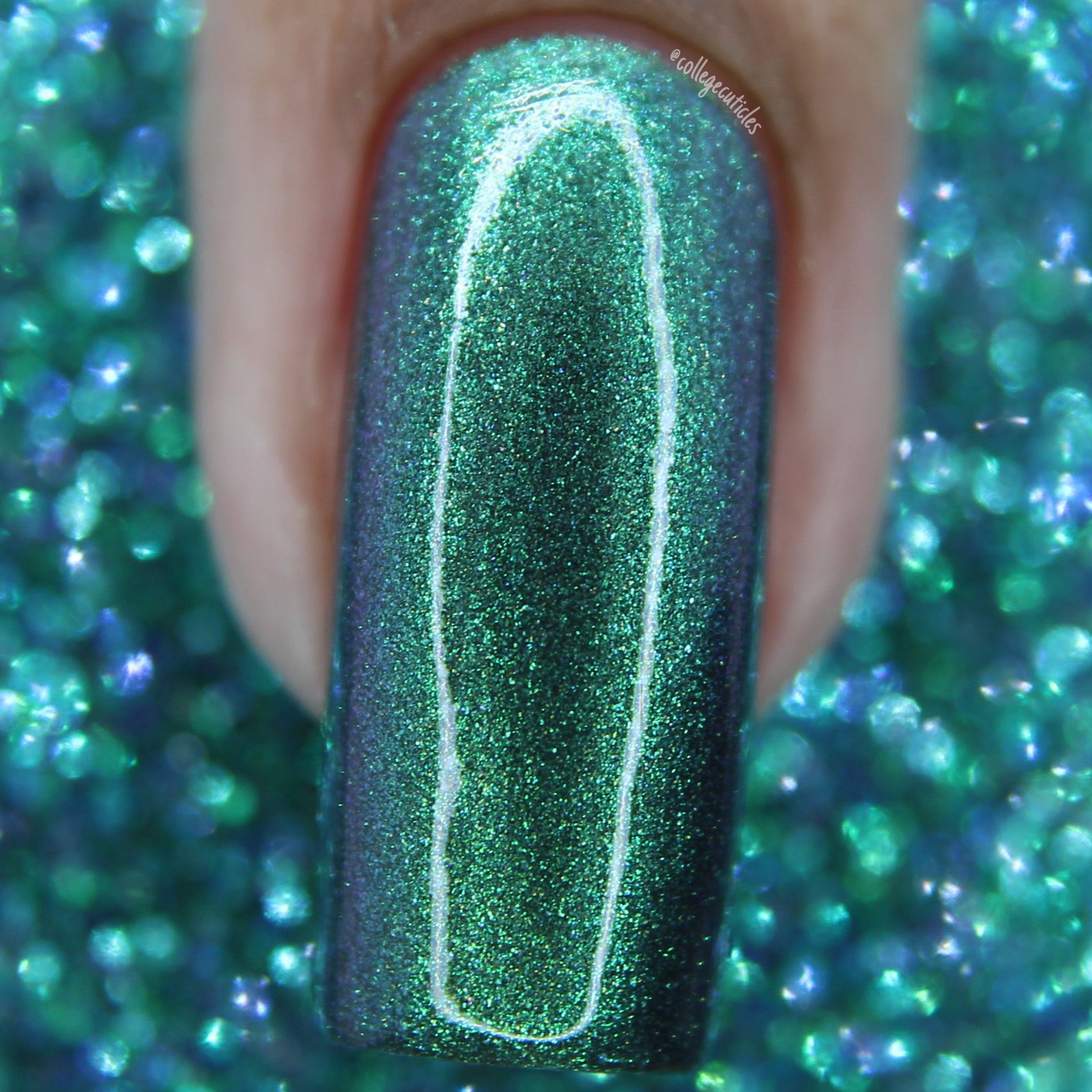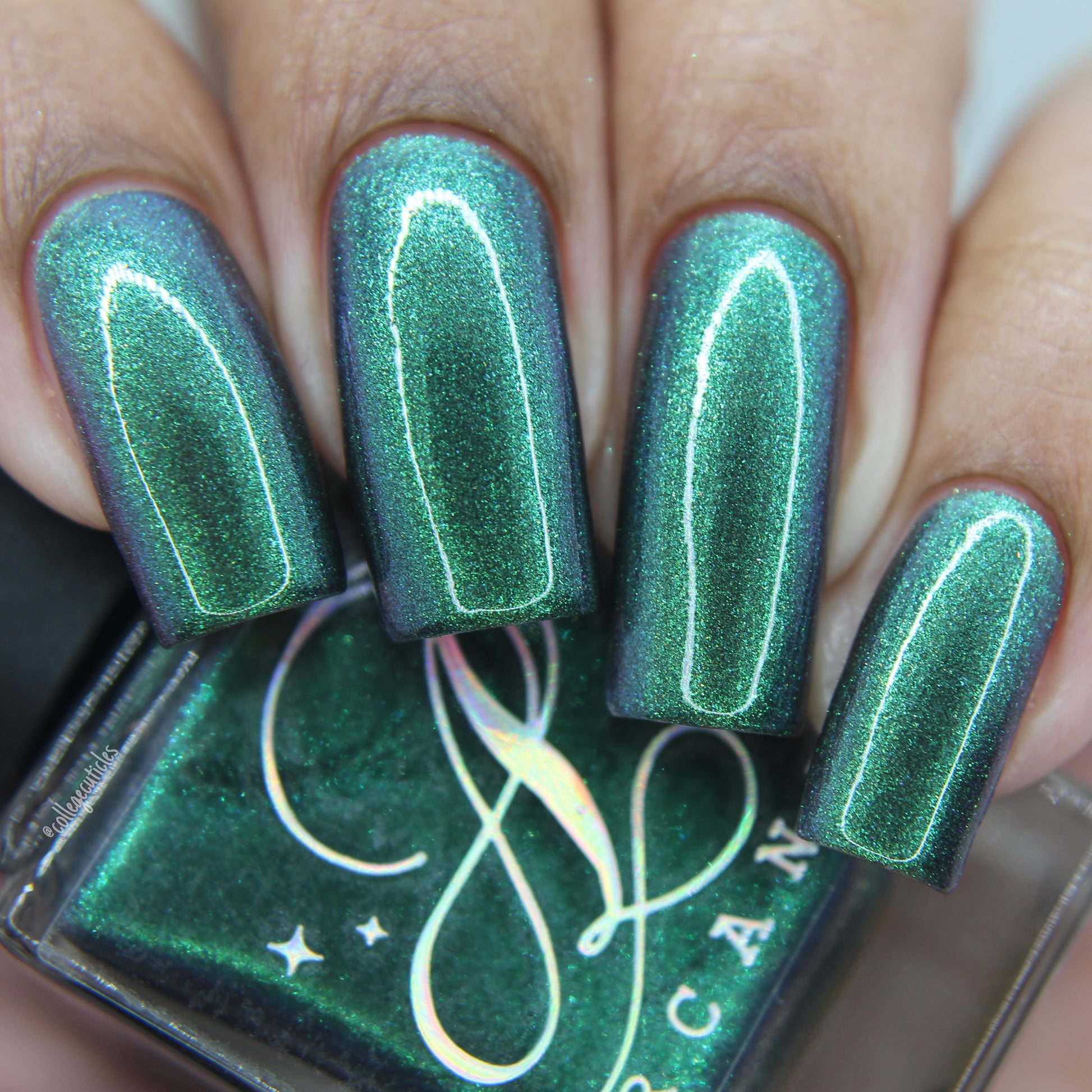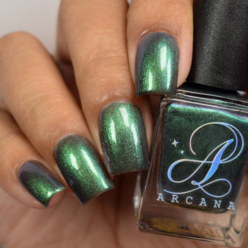 Into the Abyss is inspired by the depths of the ocean (and also the black and green nudibranch!) This polish has a smoky black base with strong larger particle green shimmer that shifts to purple at sharp angles.