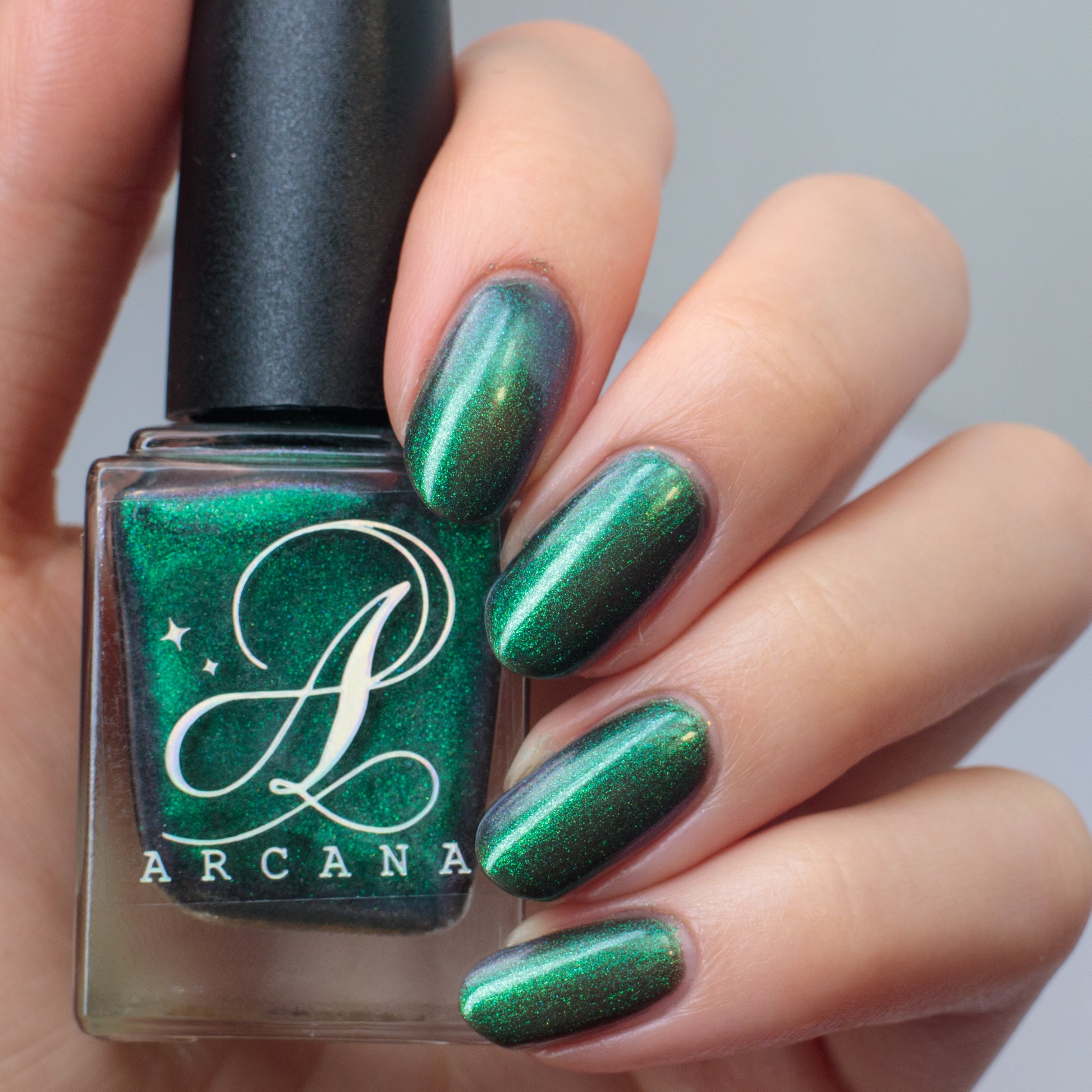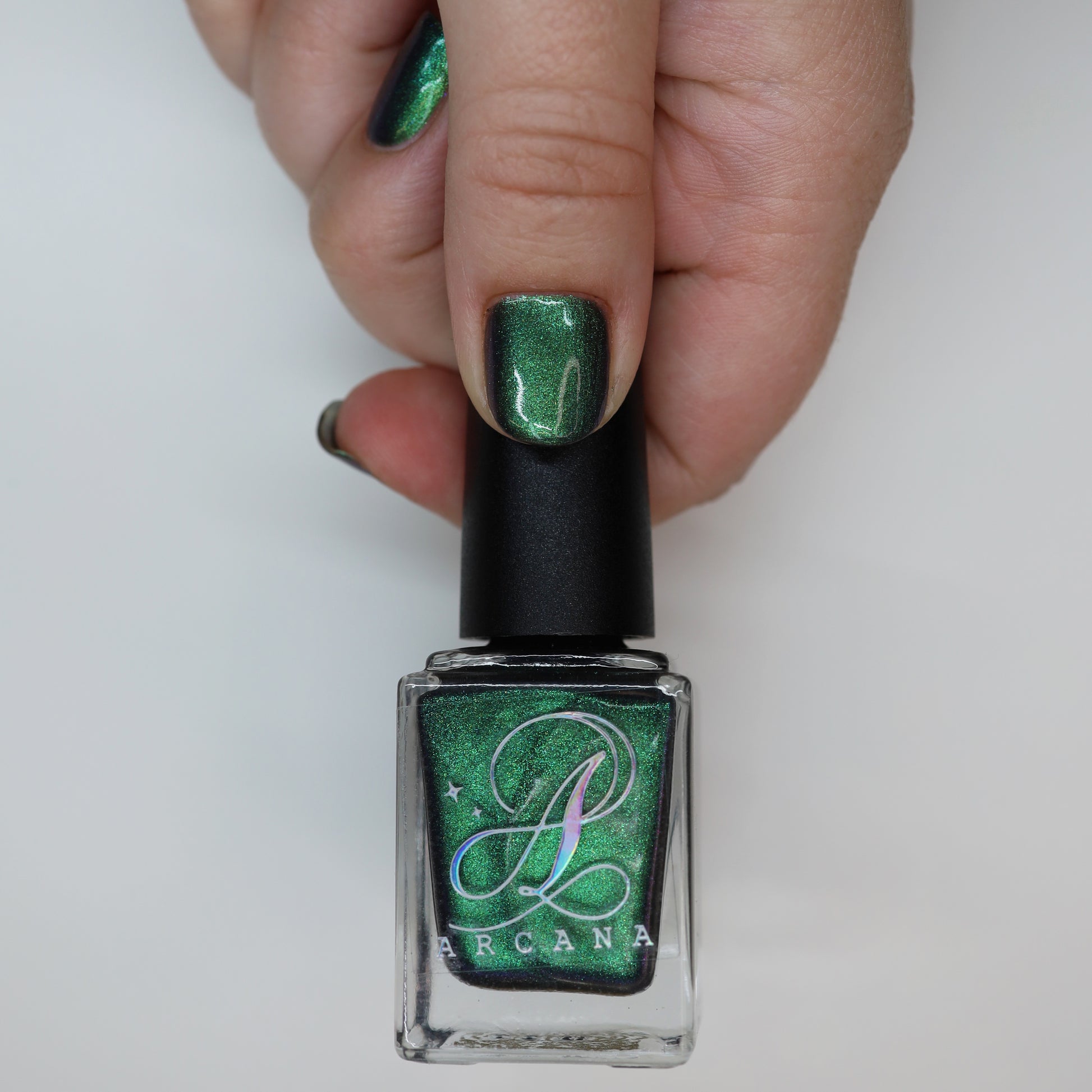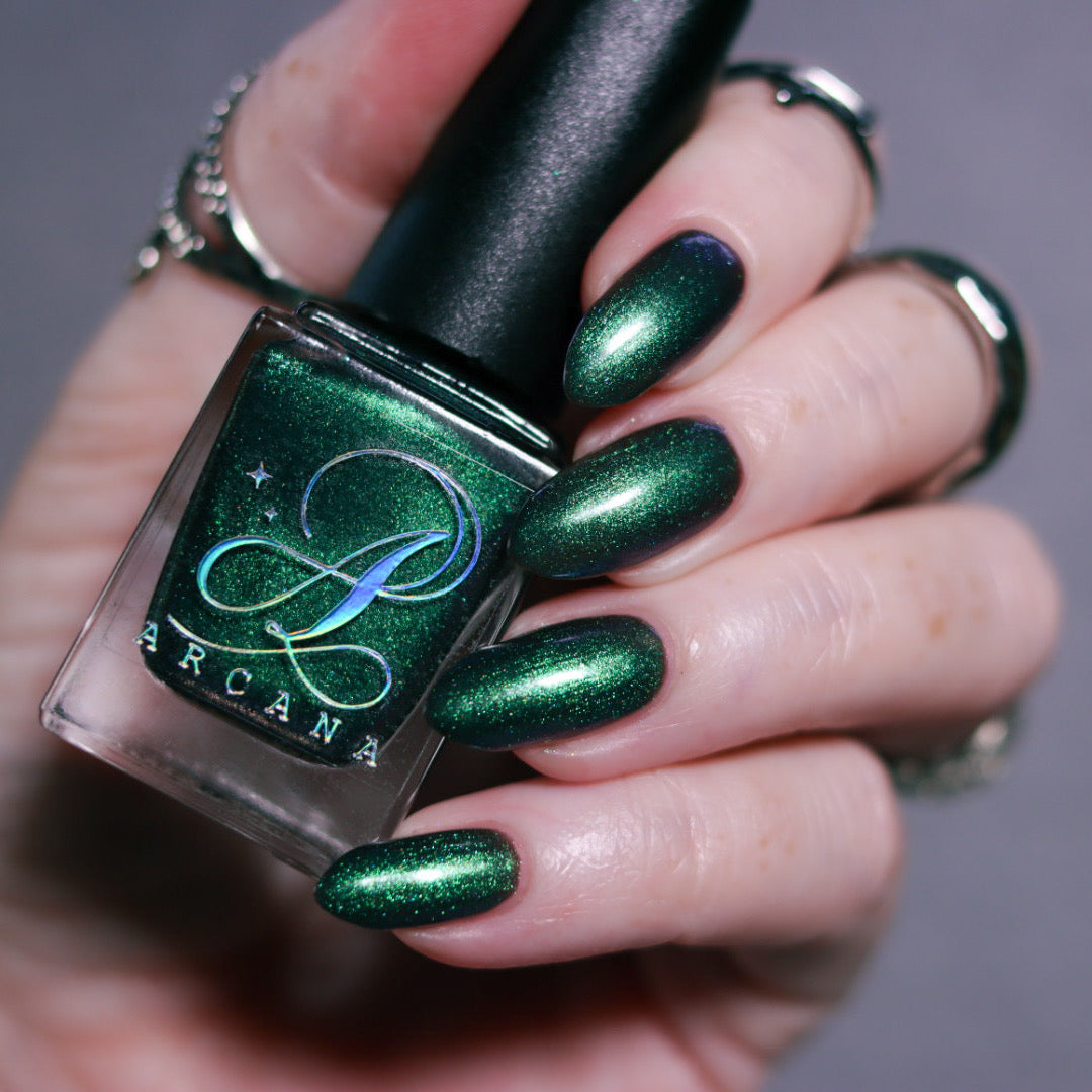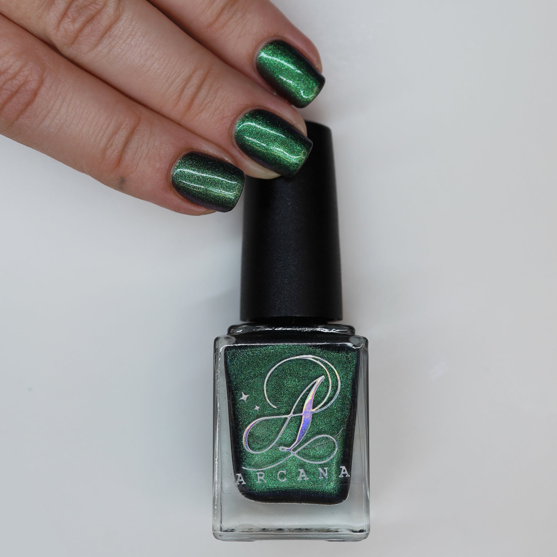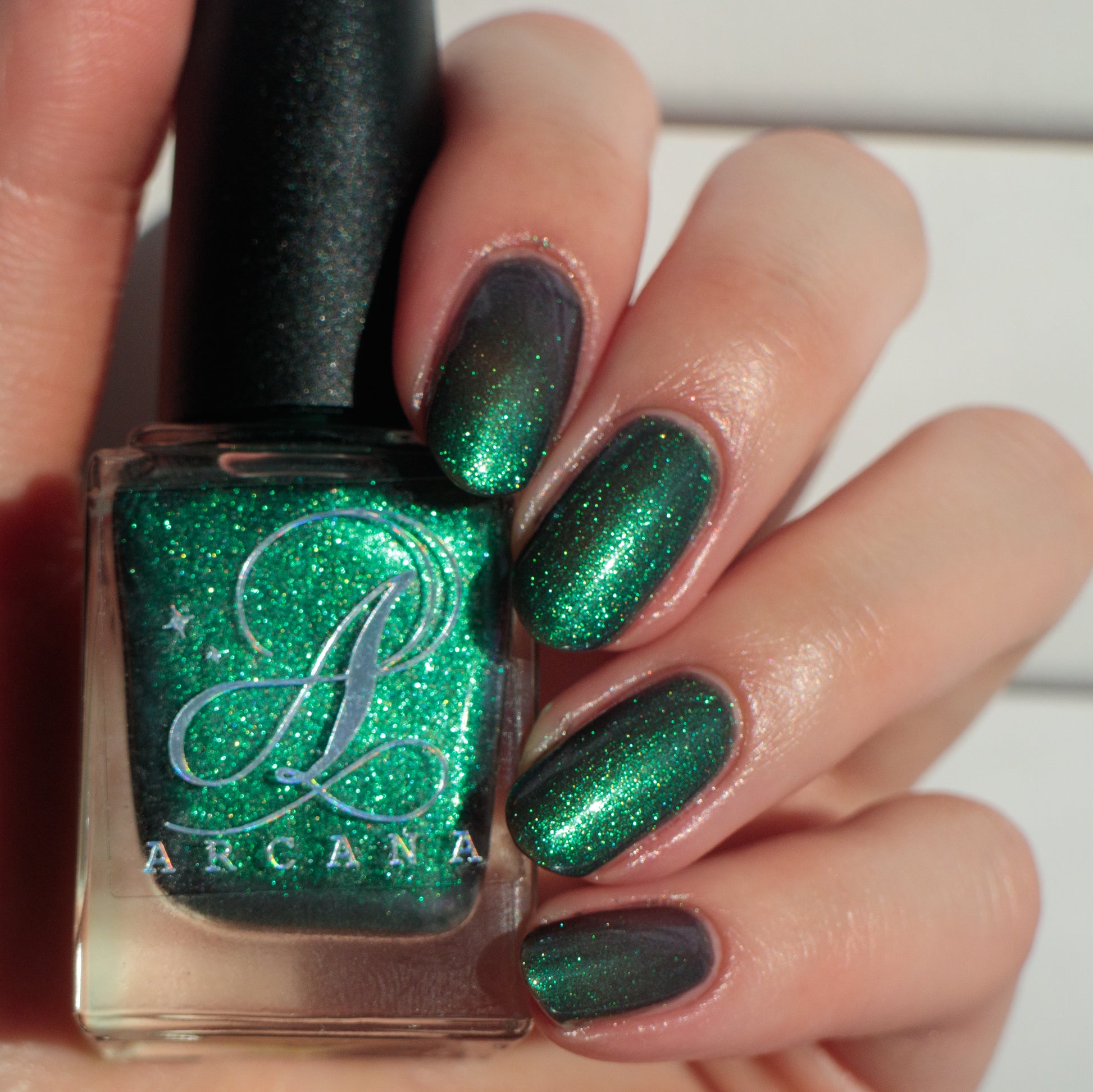 Into the Abyss is inspired by the depths of the ocean (and also the black and green nudibranch!) This polish has a smoky black base with strong larger particle green shimmer that shifts to purple at sharp angles.