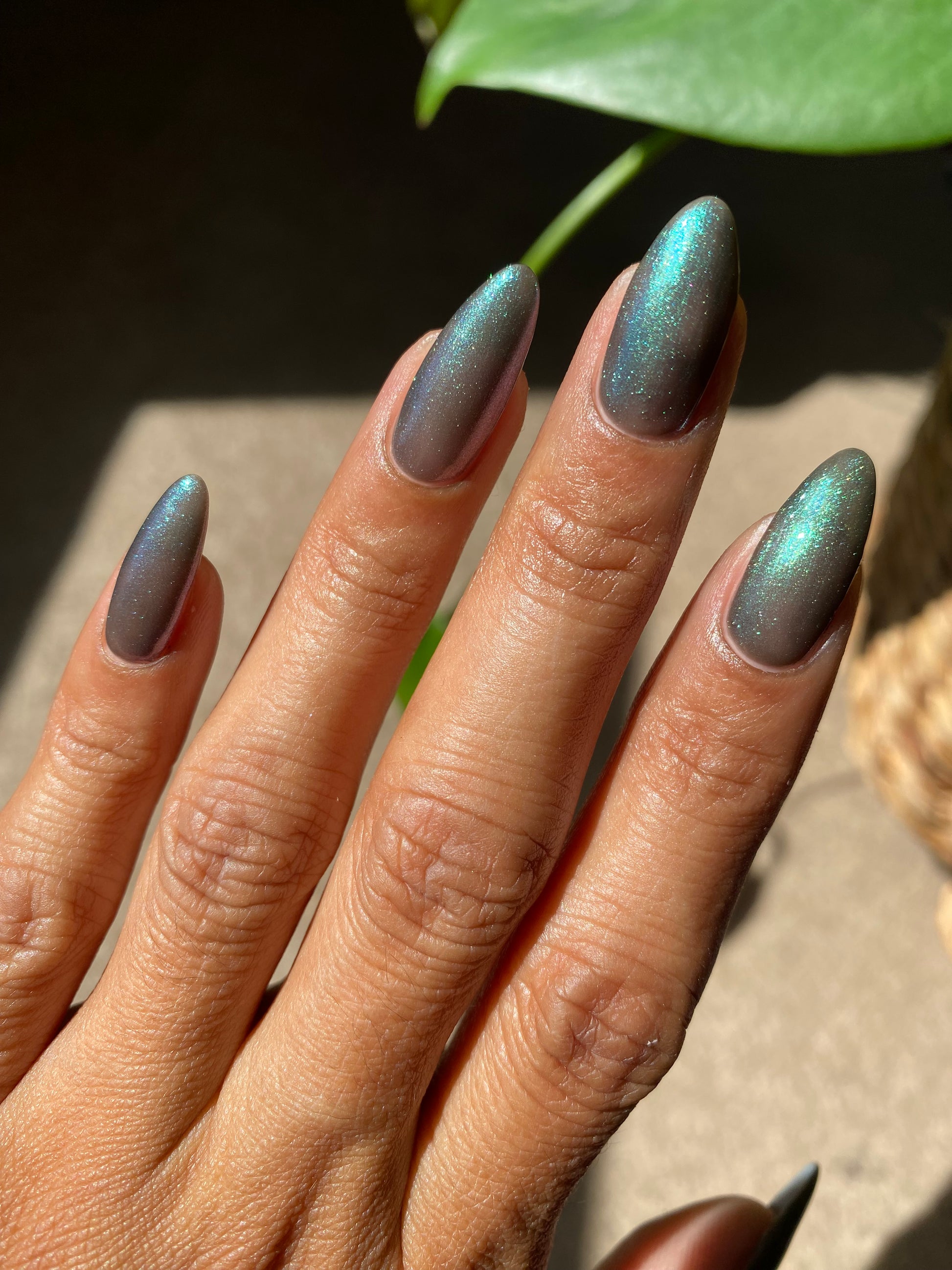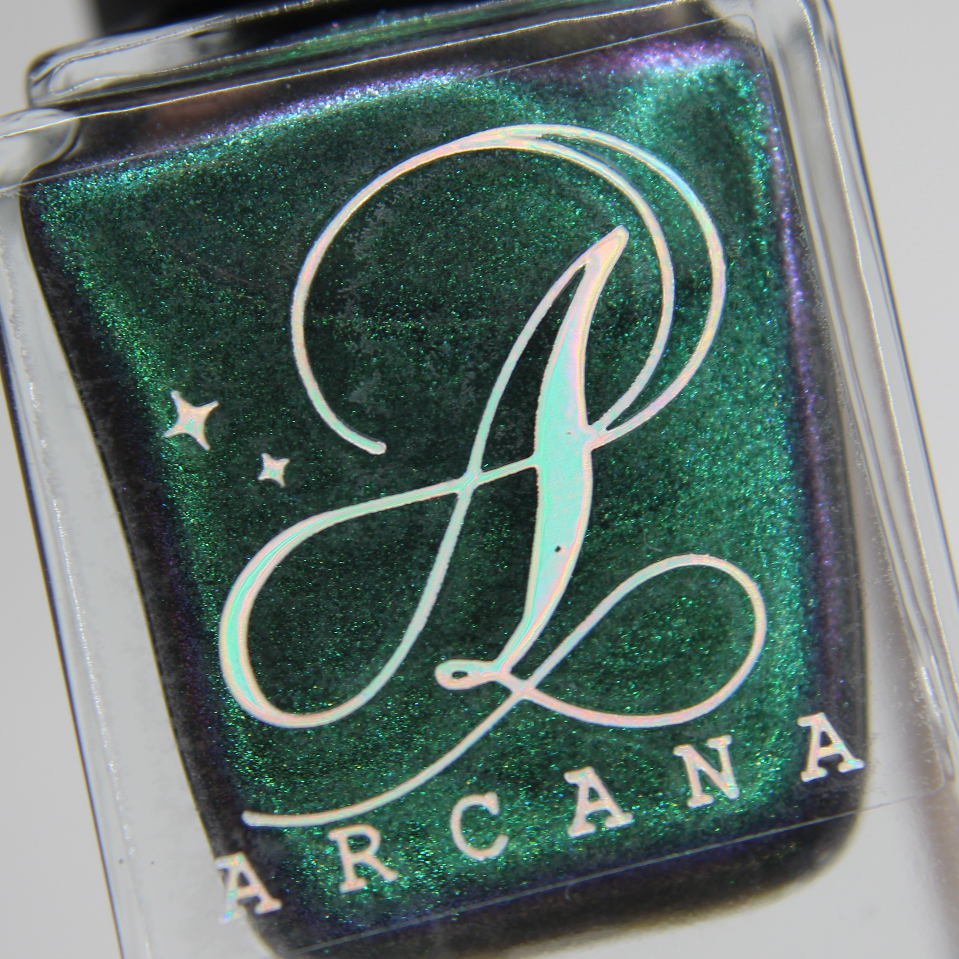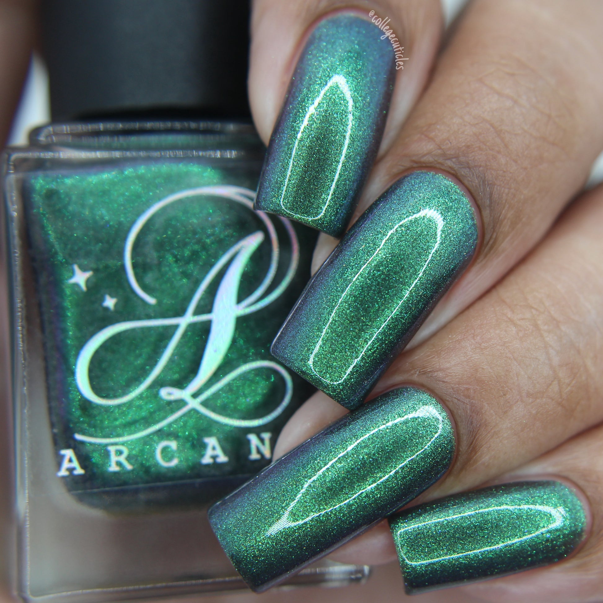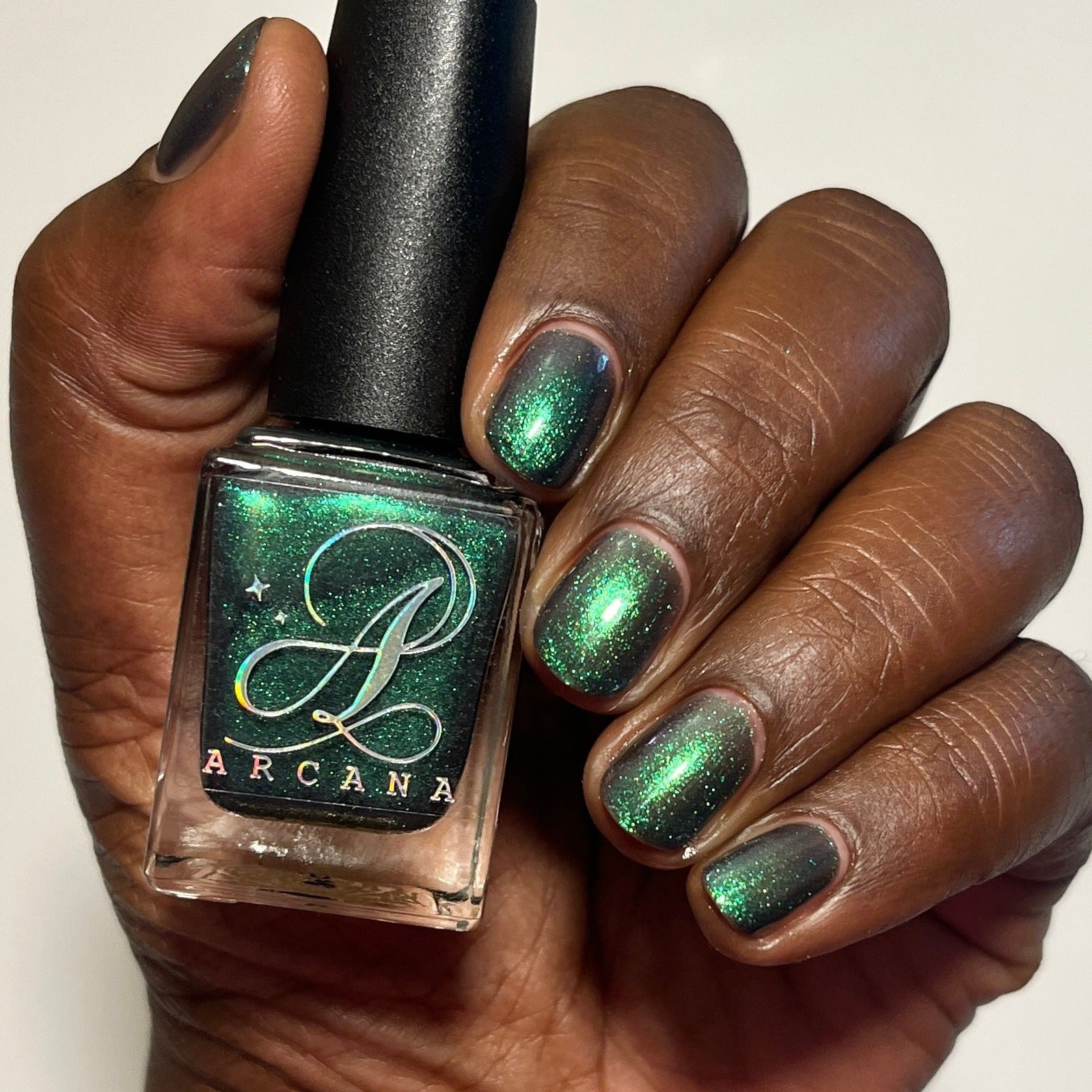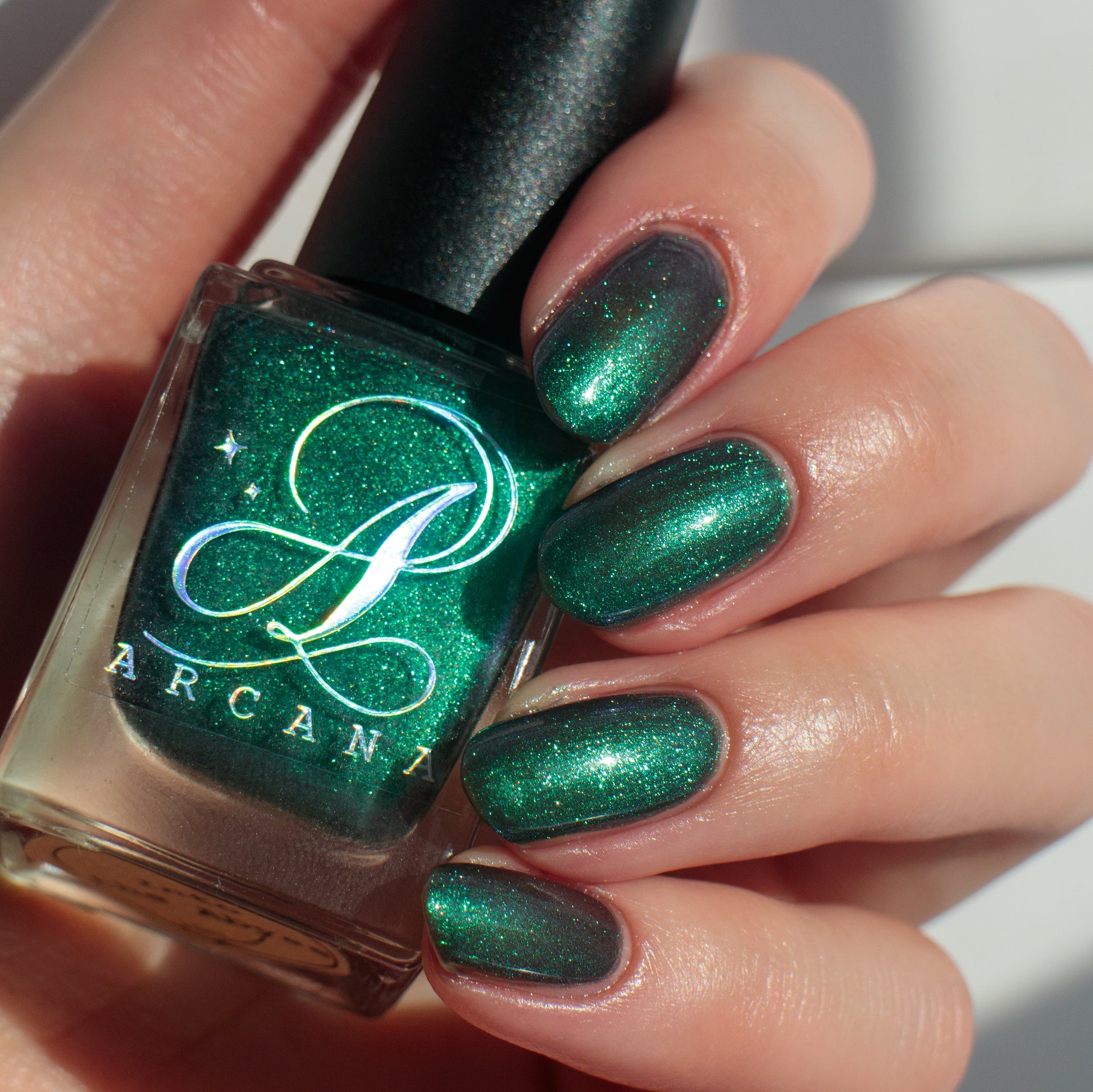 Into the Abyss is inspired by the depths of the ocean (and also the black and green nudibranch!) This polish has a smoky black base with strong larger particle green shimmer that shifts to purple at sharp angles.