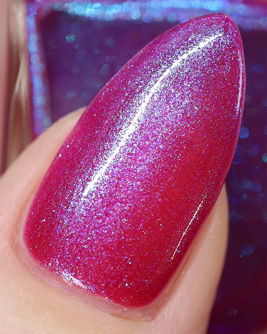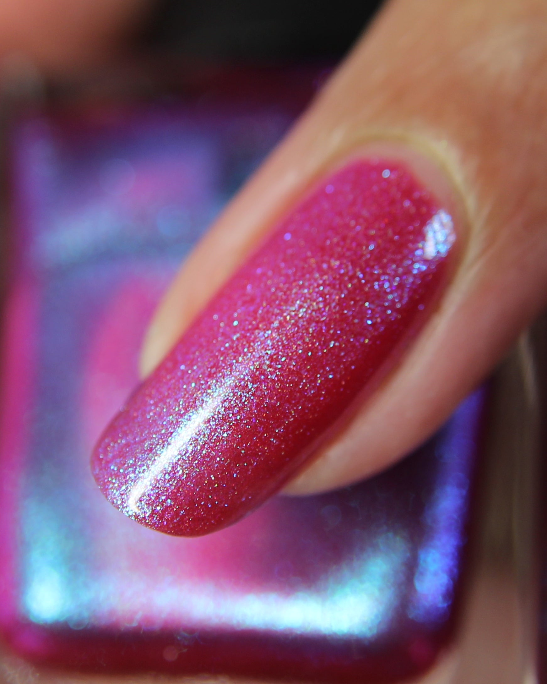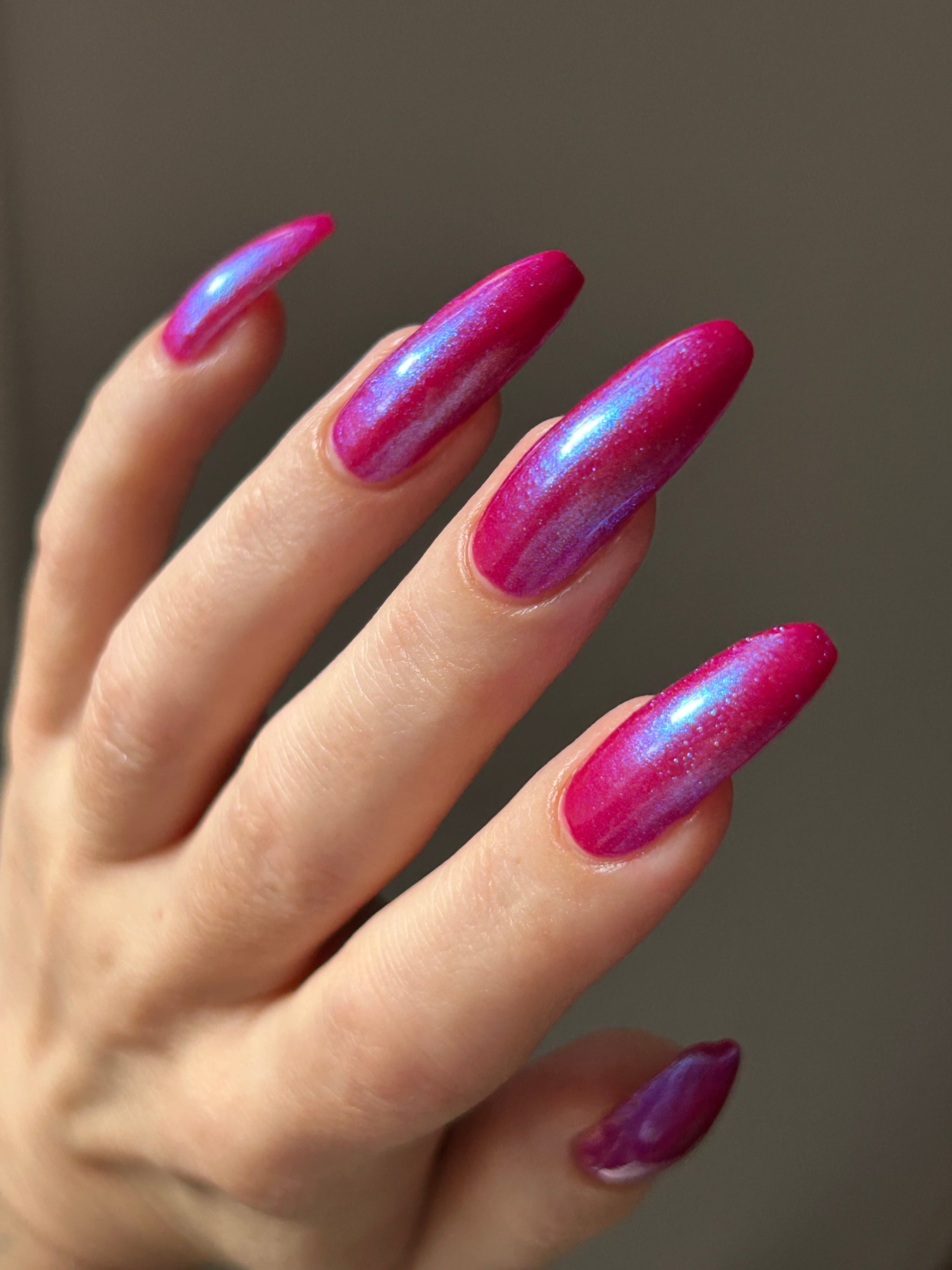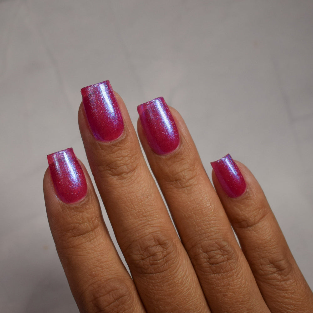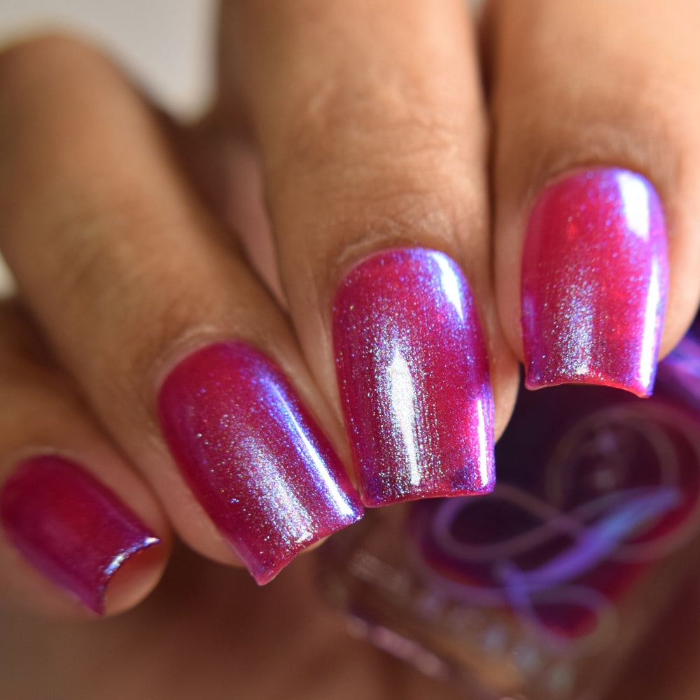 This polish is a sheer magenta base with different blue to purple shimmers.