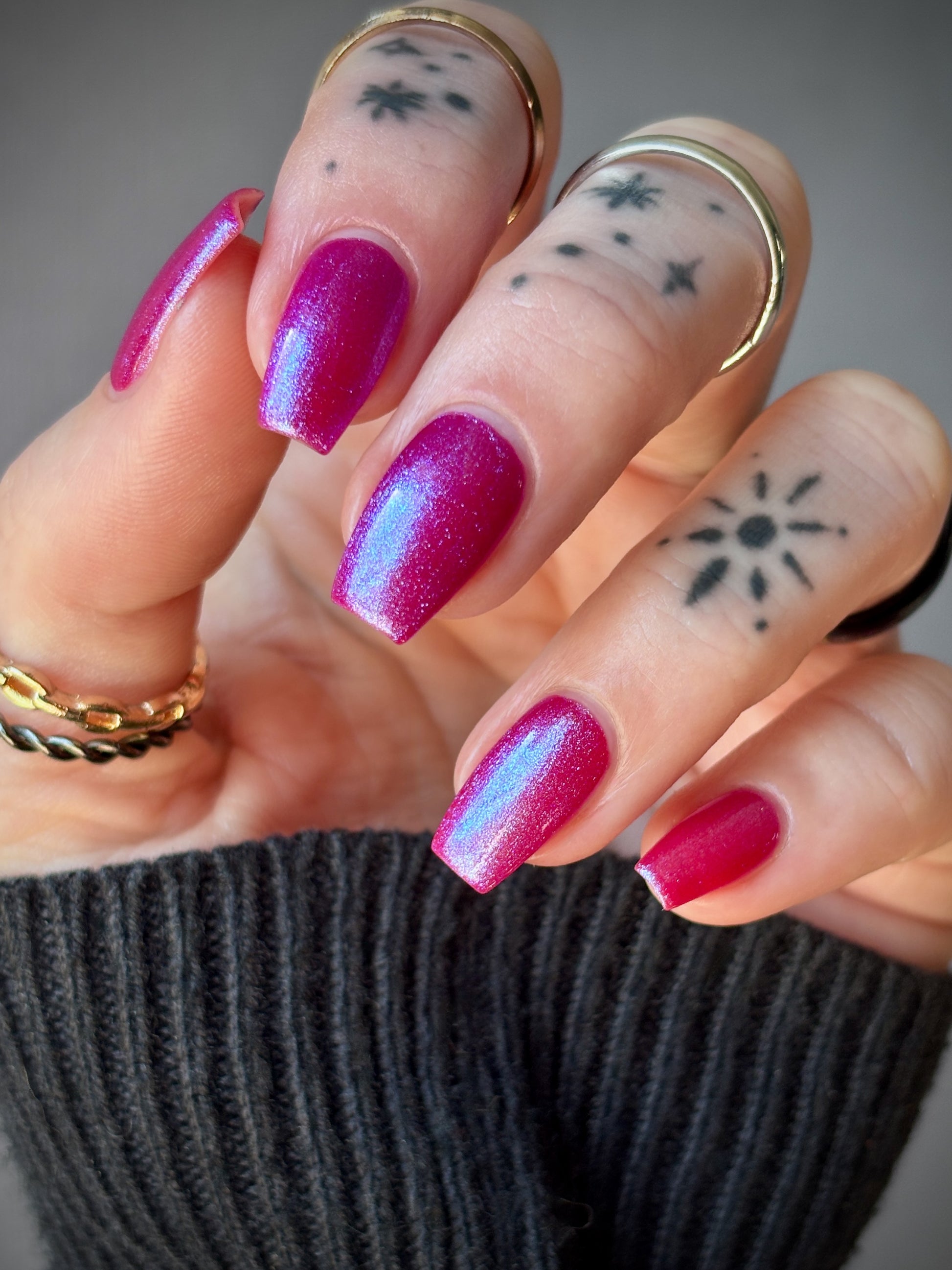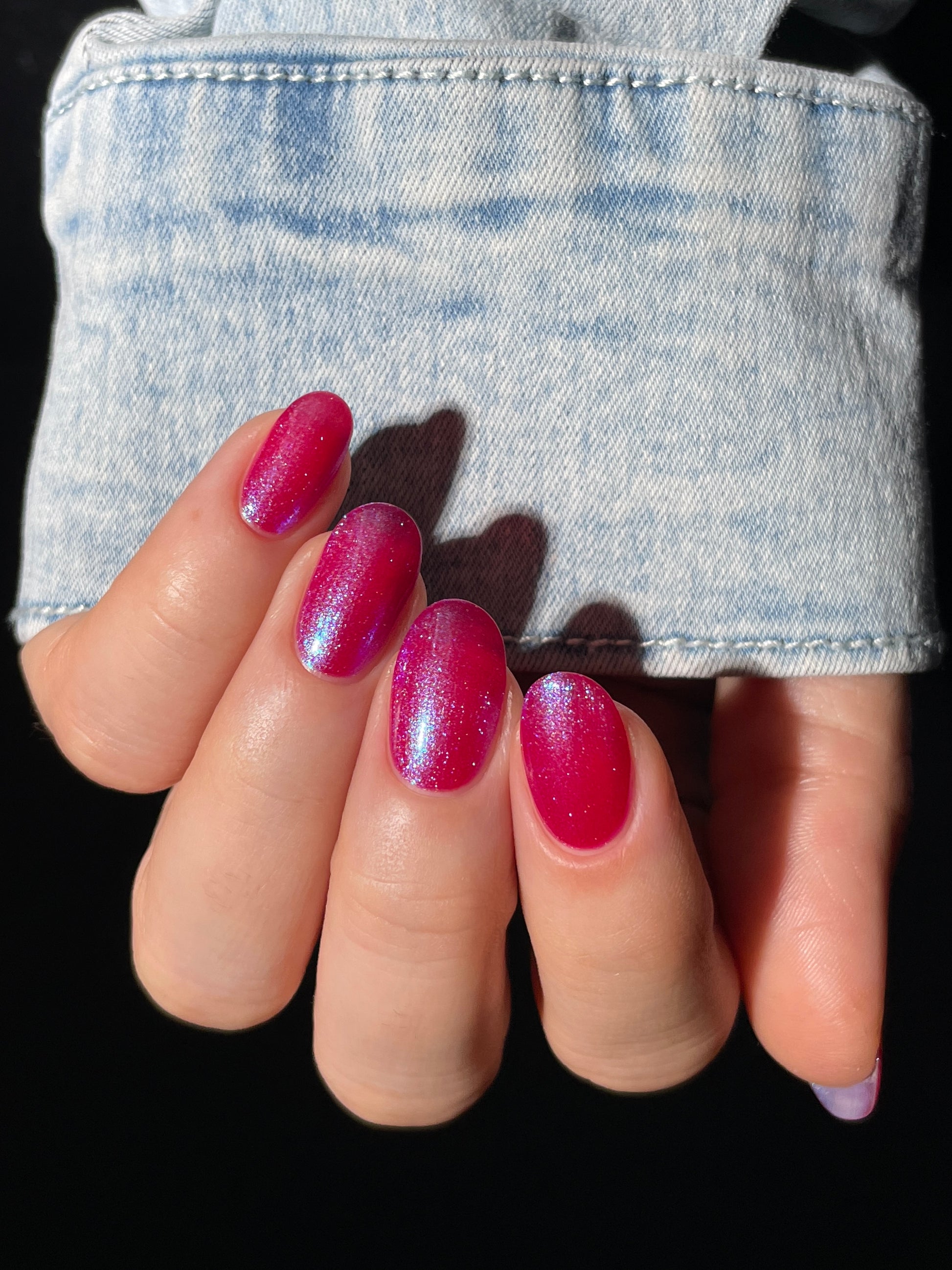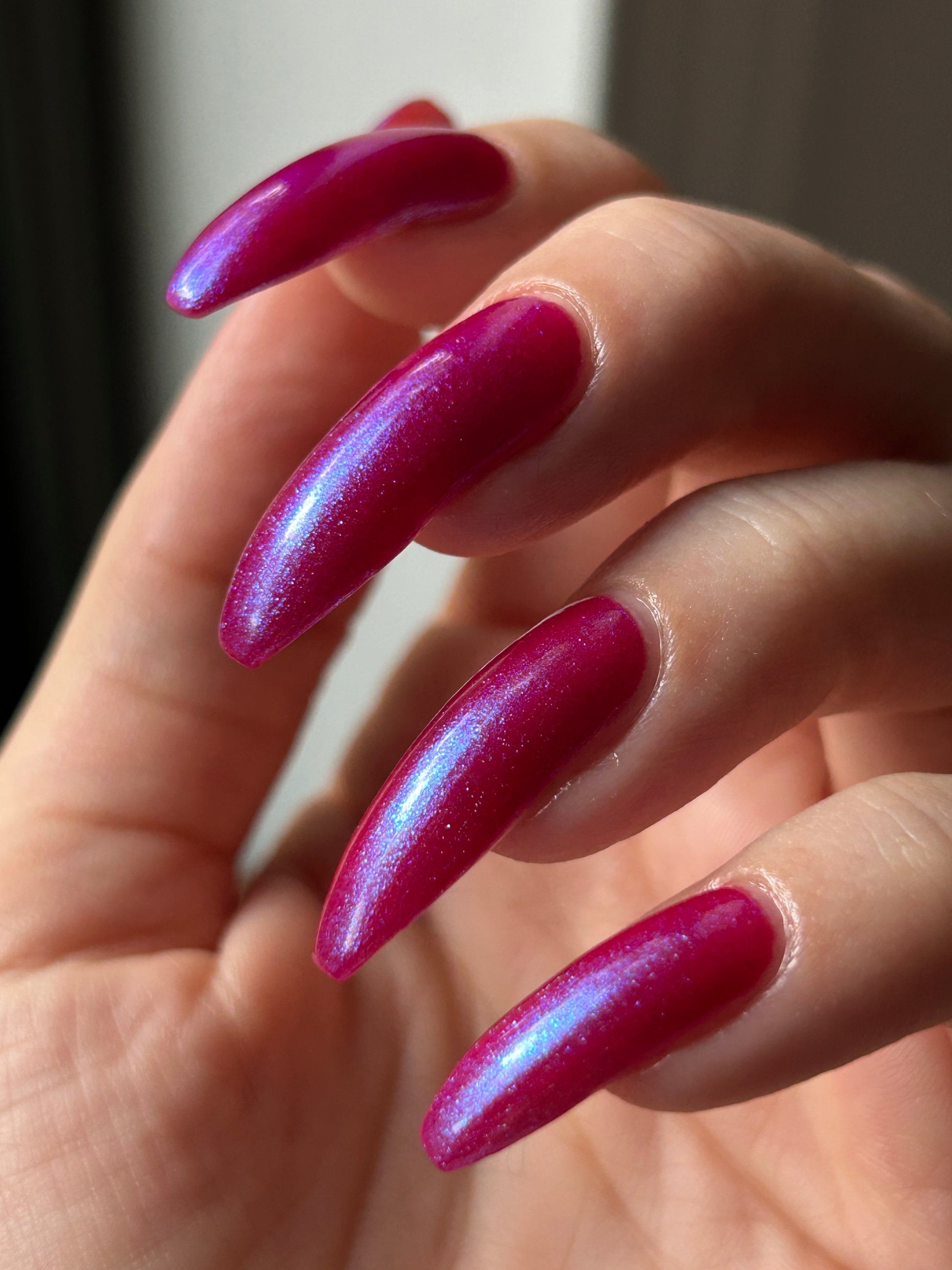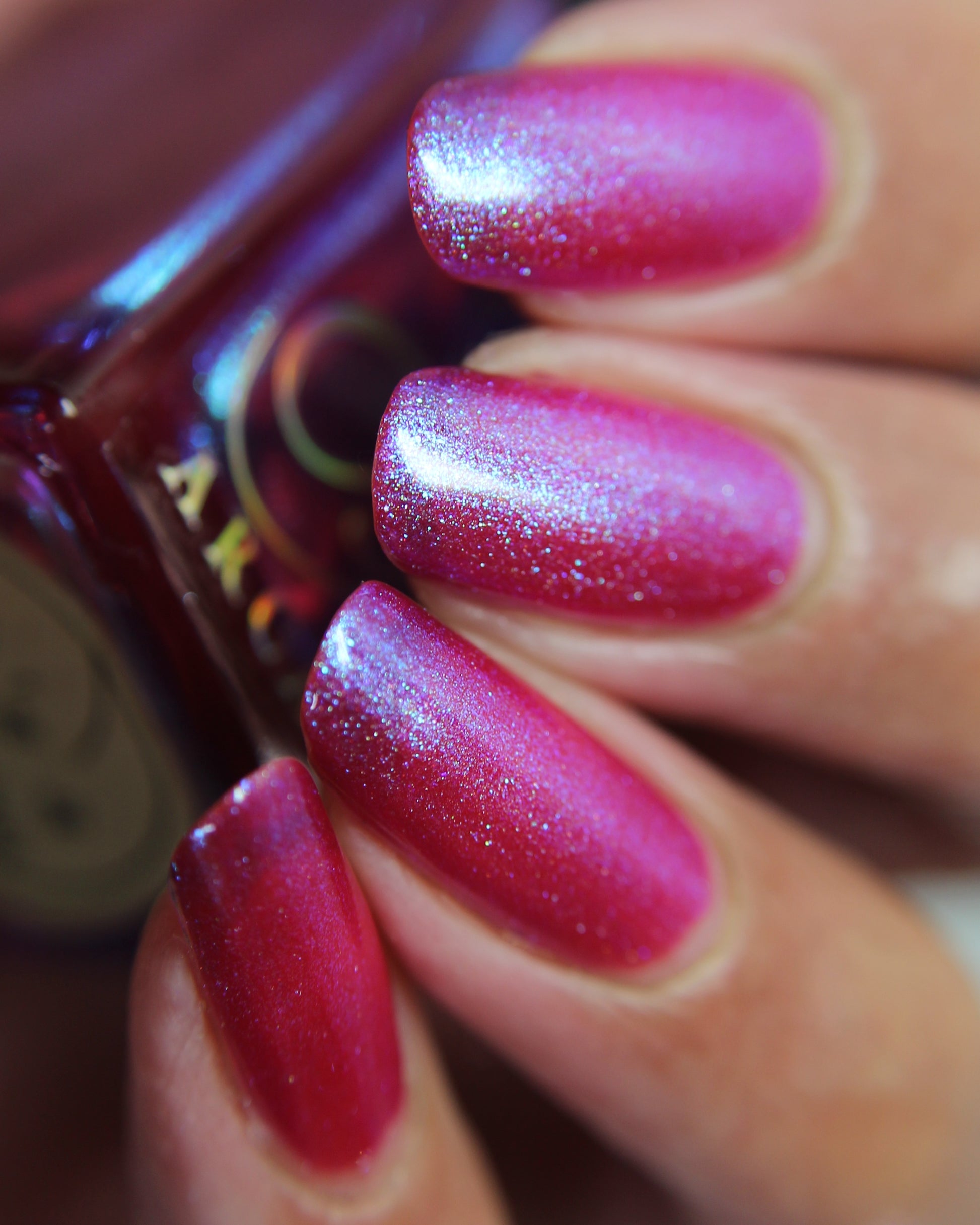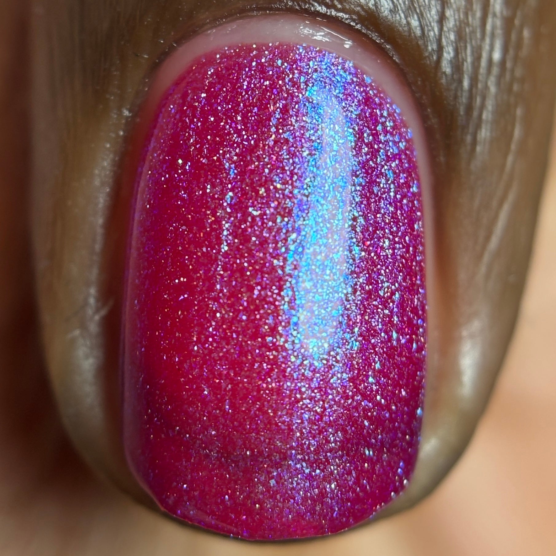 This polish is a sheer magenta base with different blue to purple shimmers.