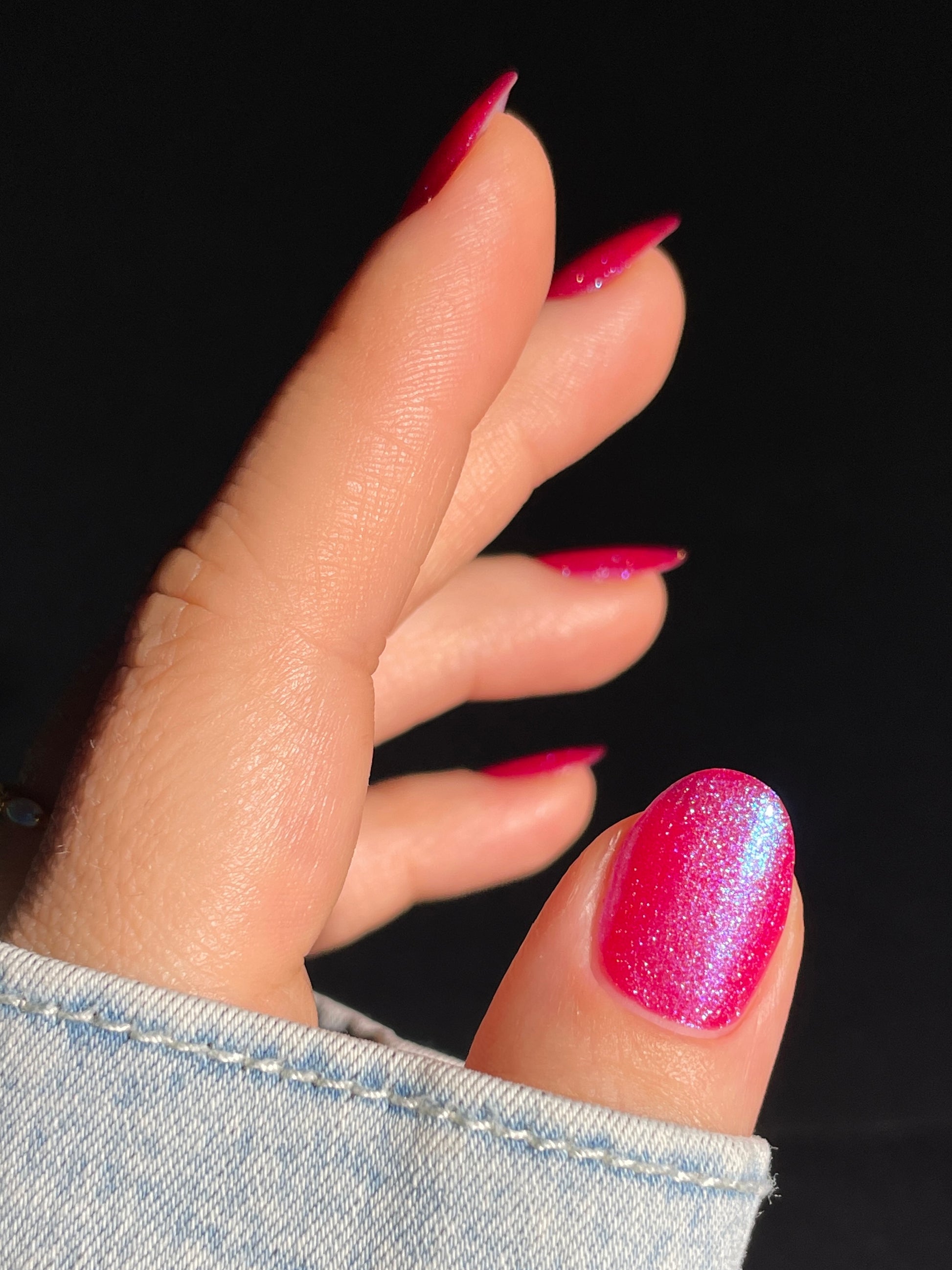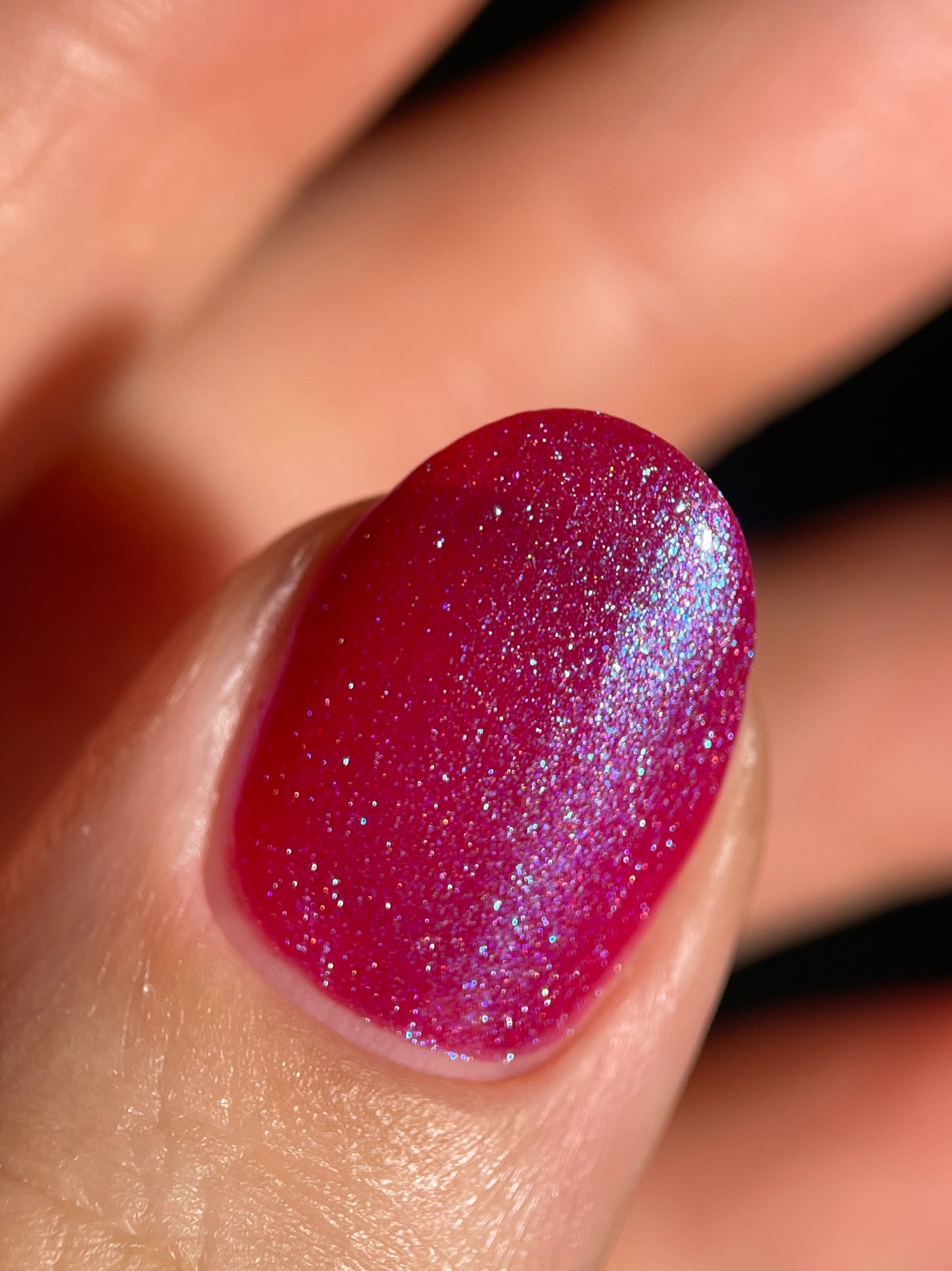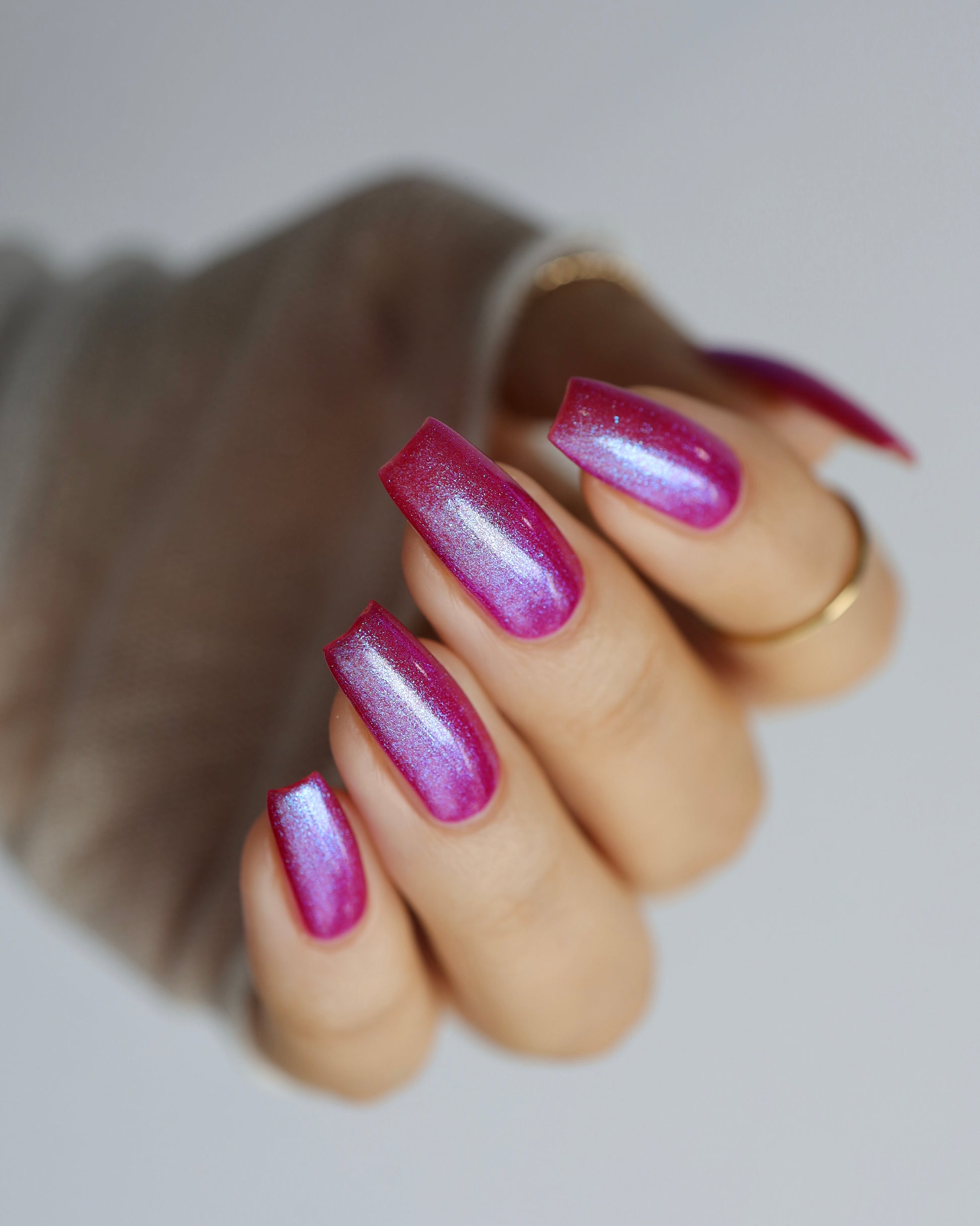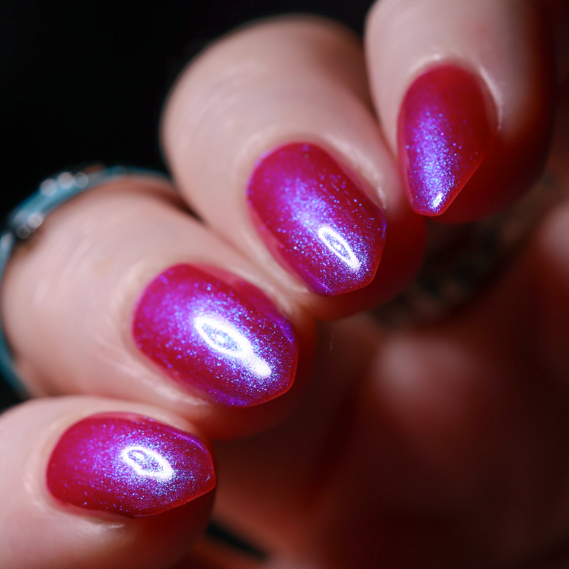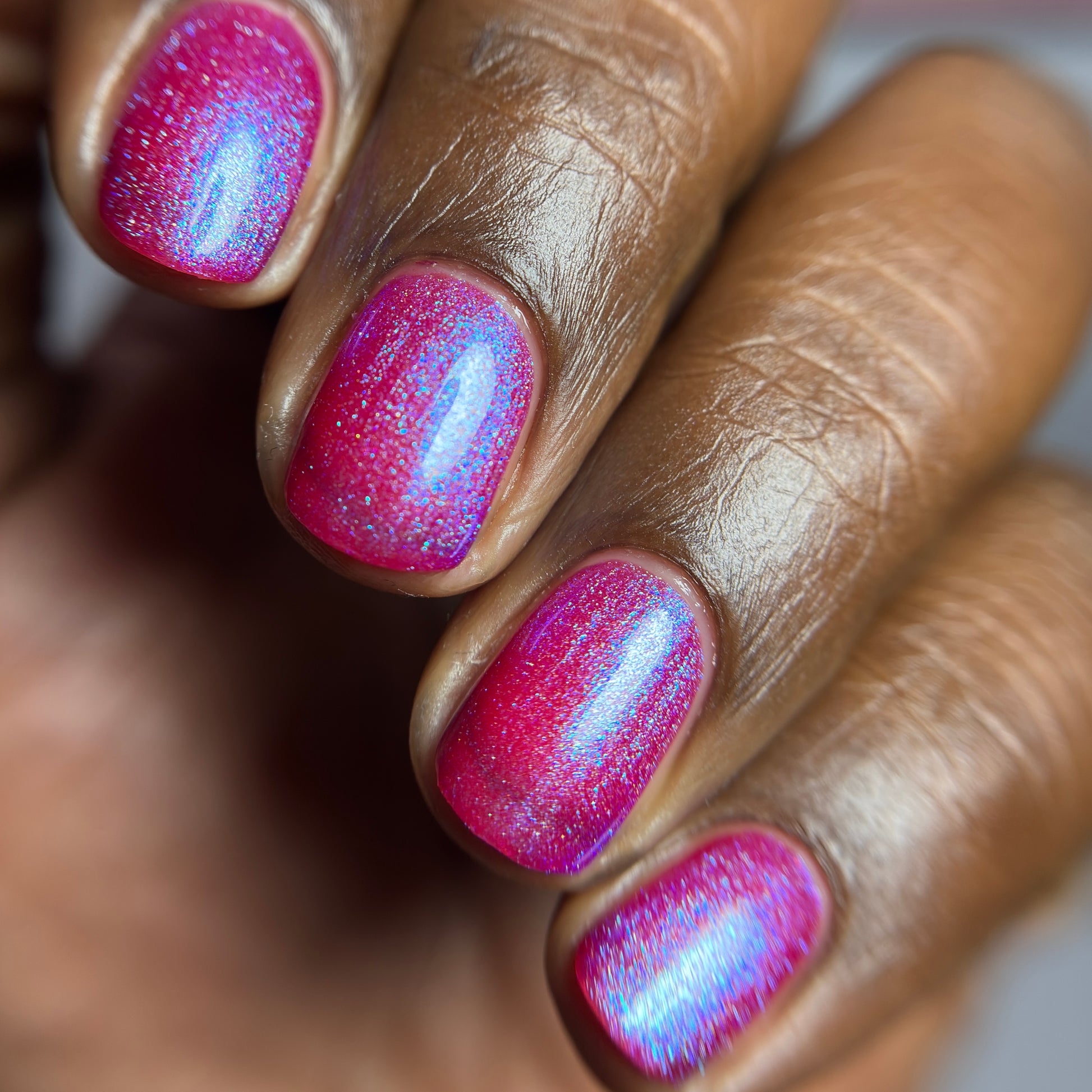 This polish is a sheer magenta base with different blue to purple shimmers.