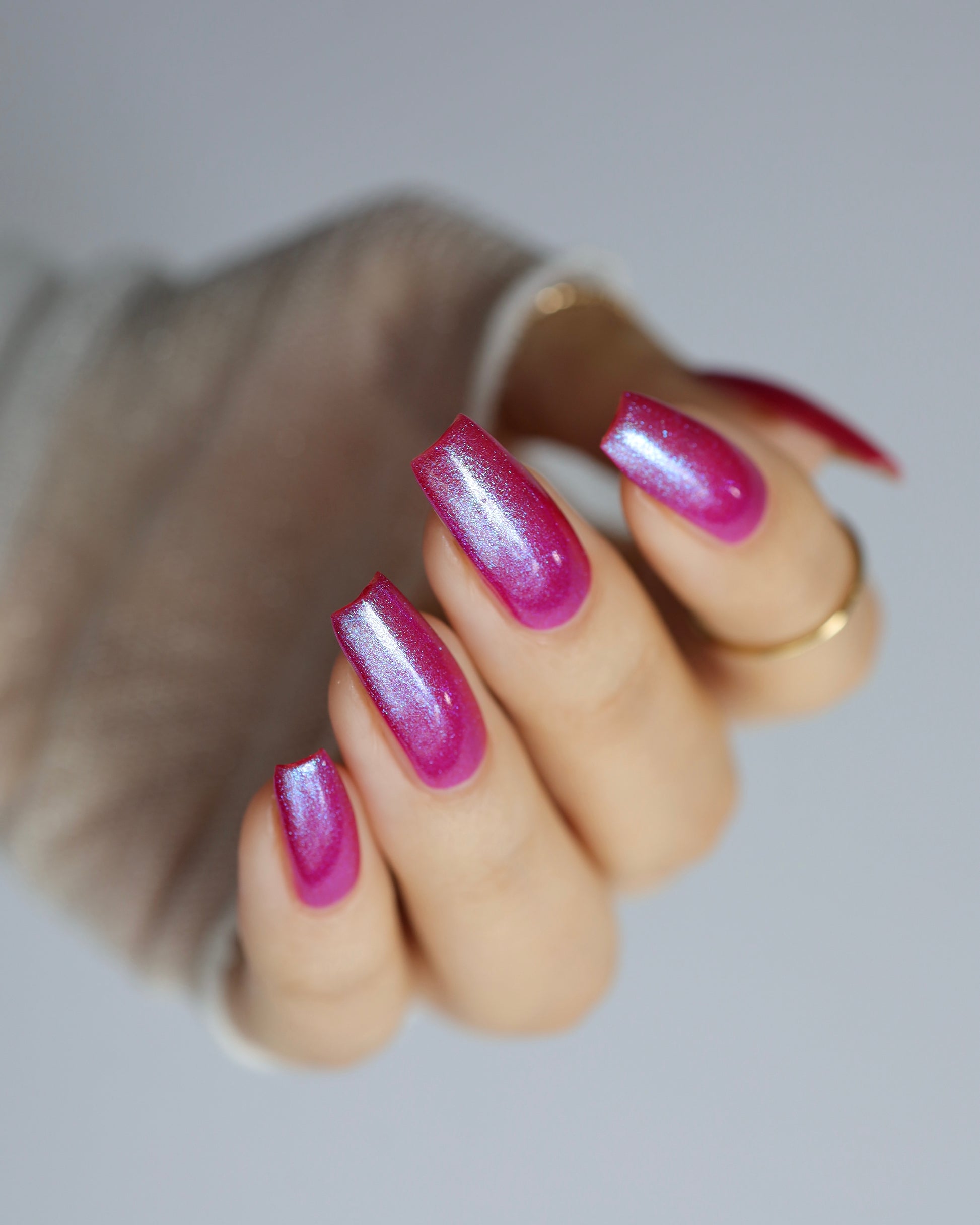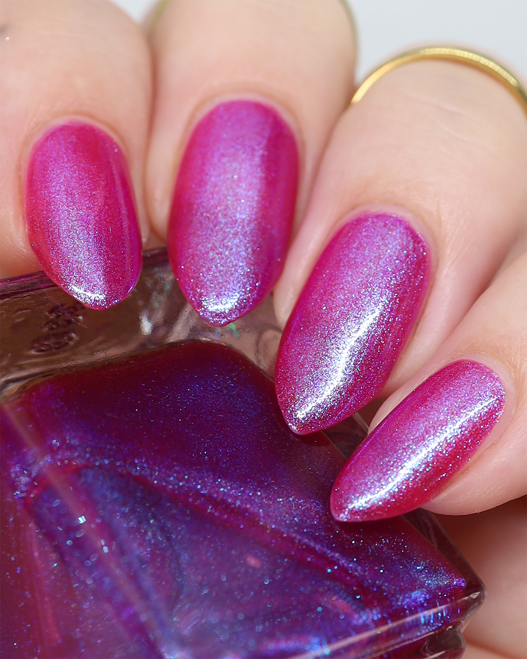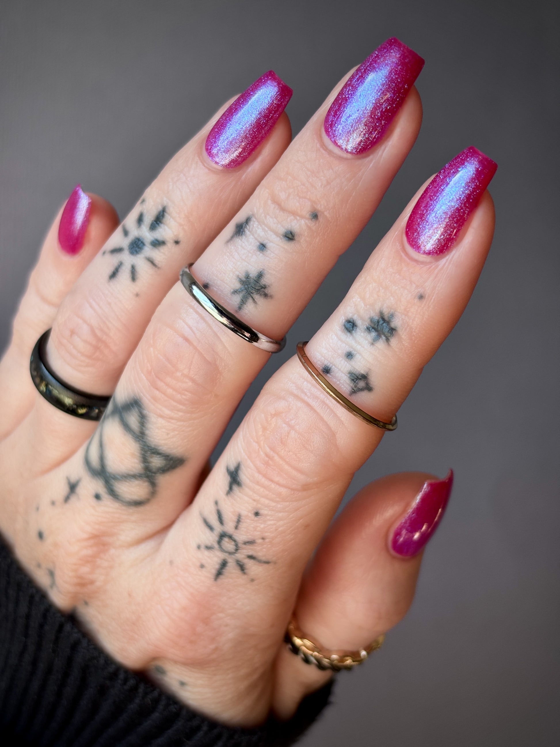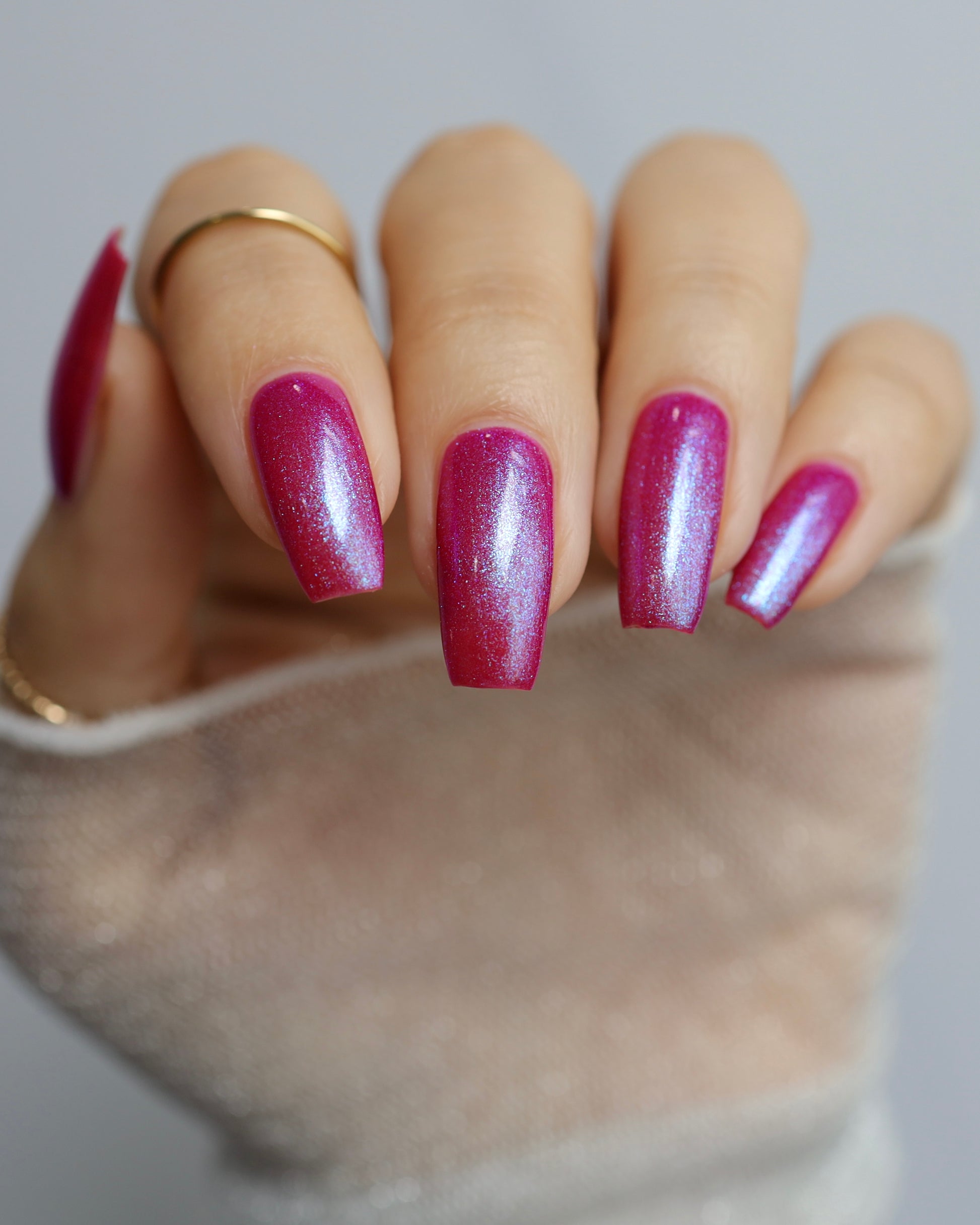 This polish is a sheer magenta base with different blue to purple shimmers.
