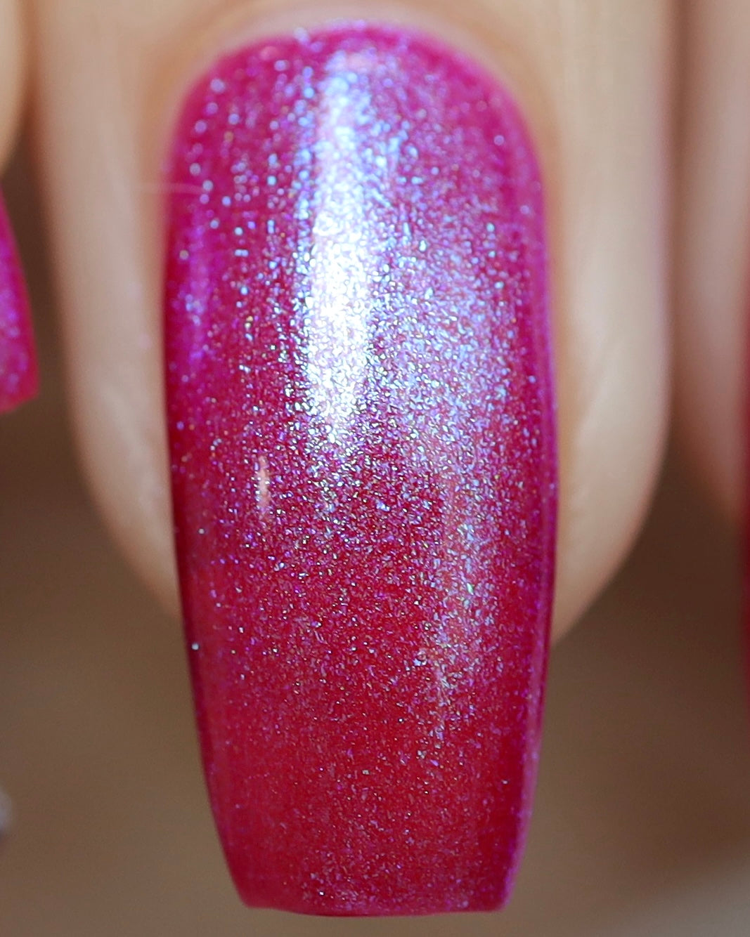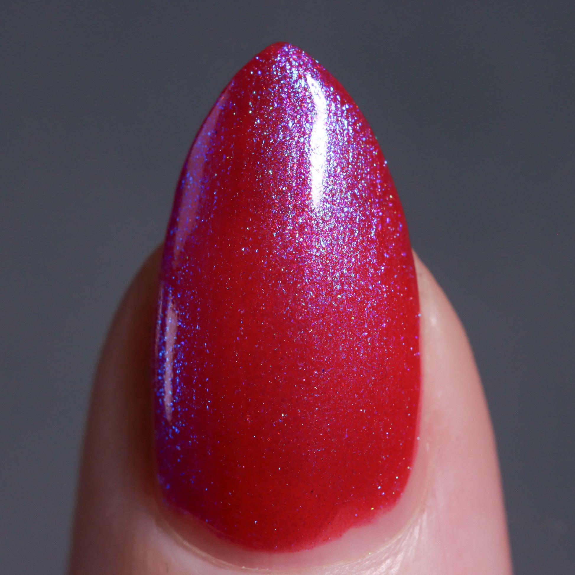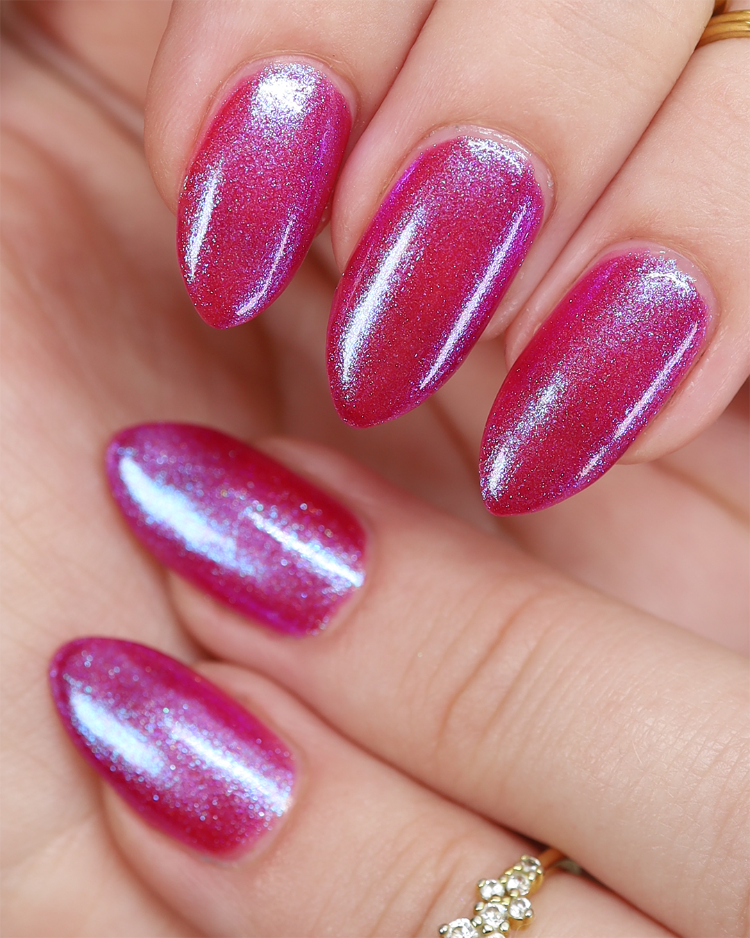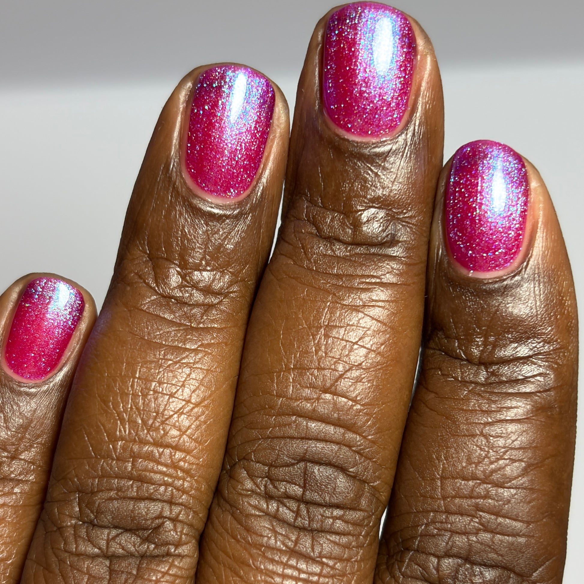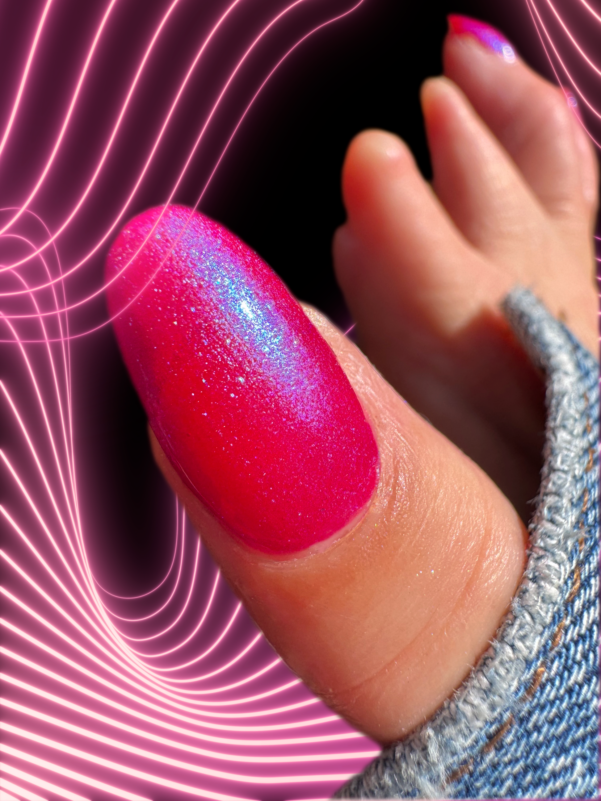 This polish is a sheer magenta base with different blue to purple shimmers.