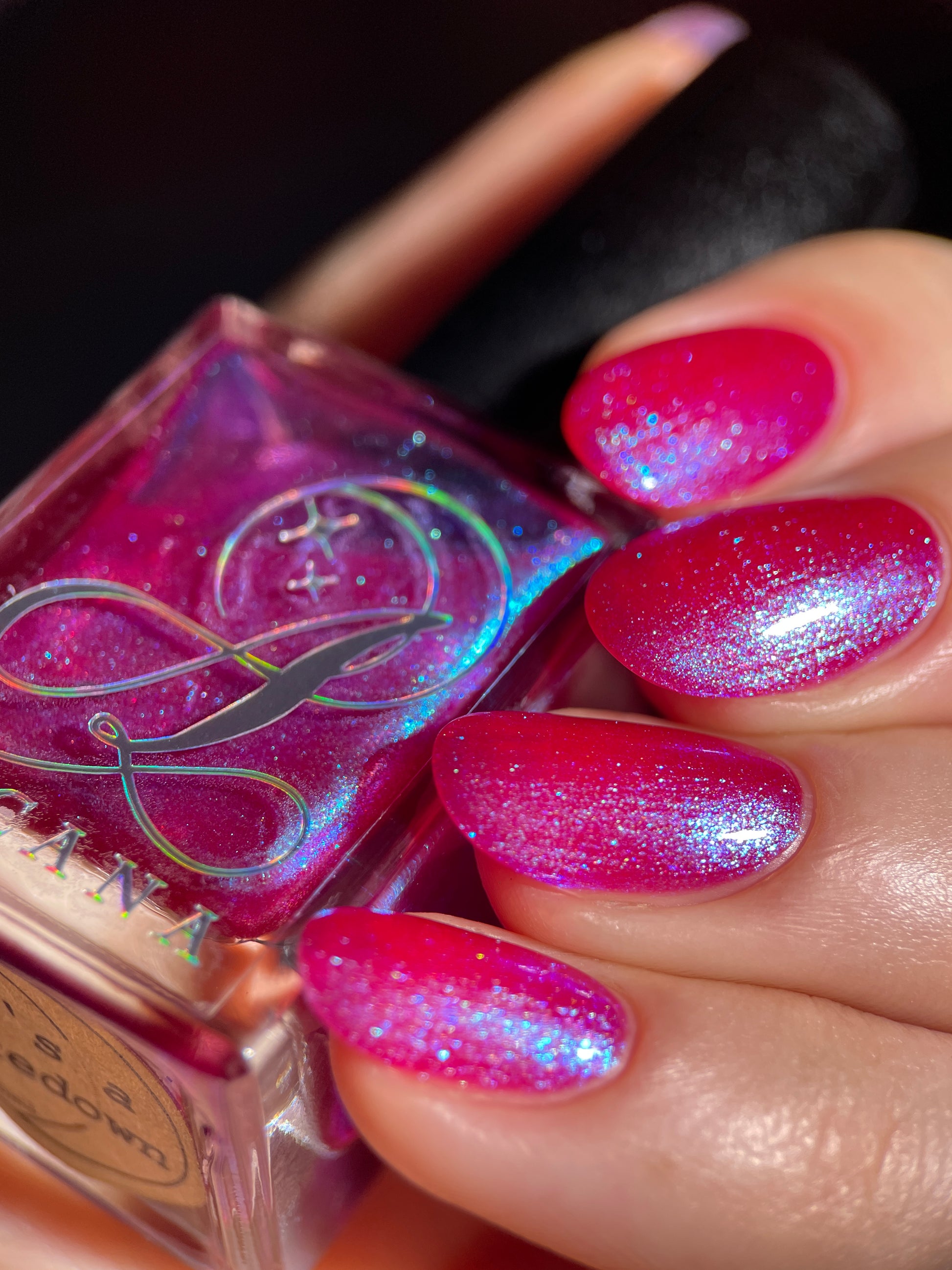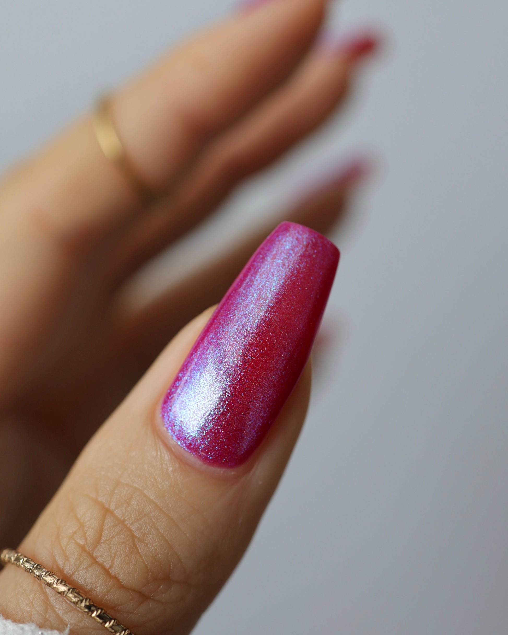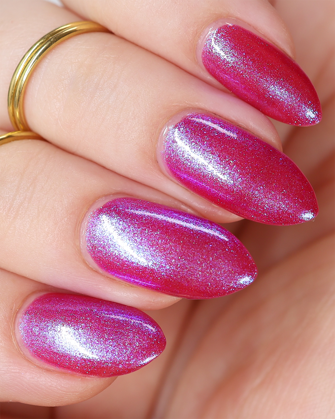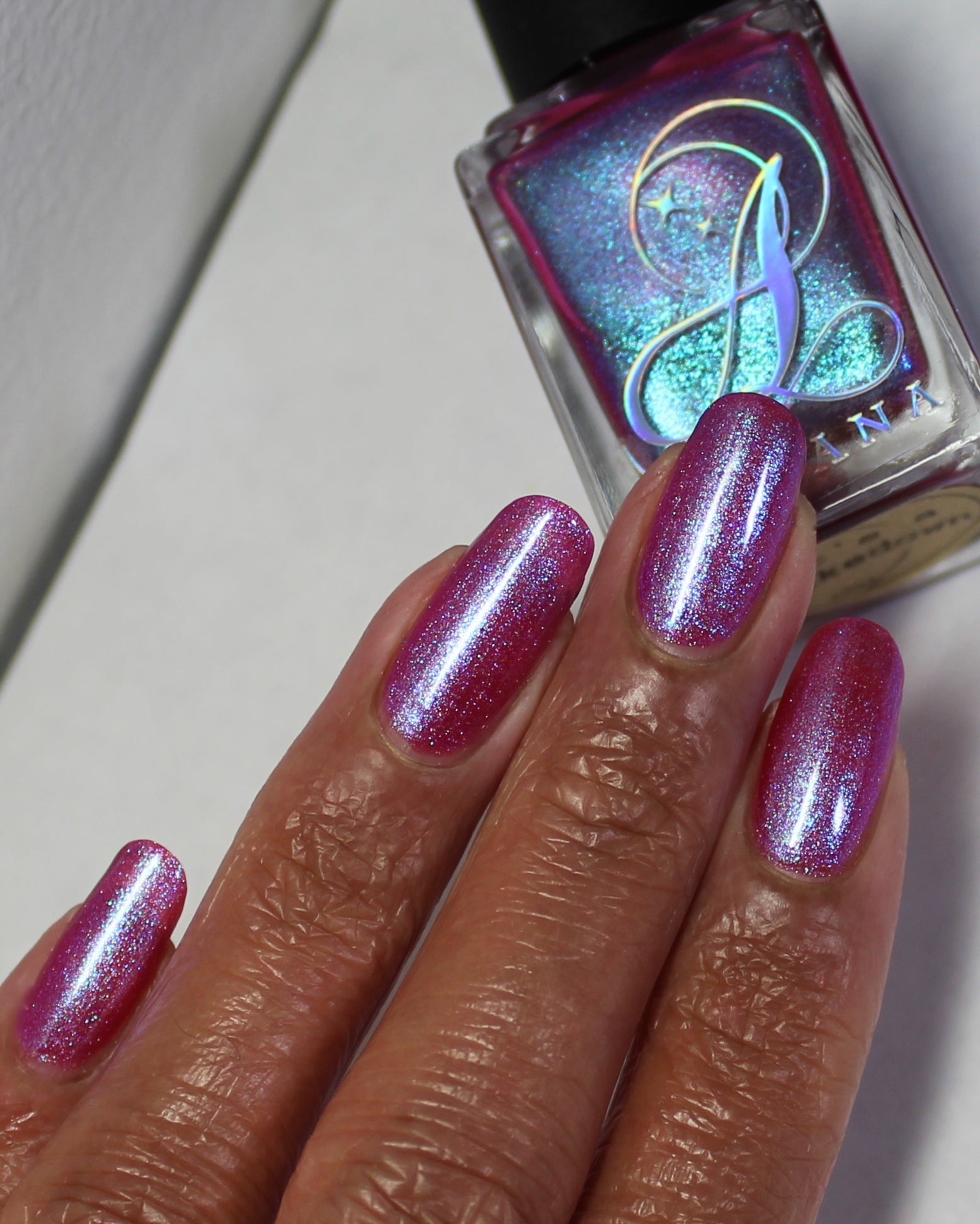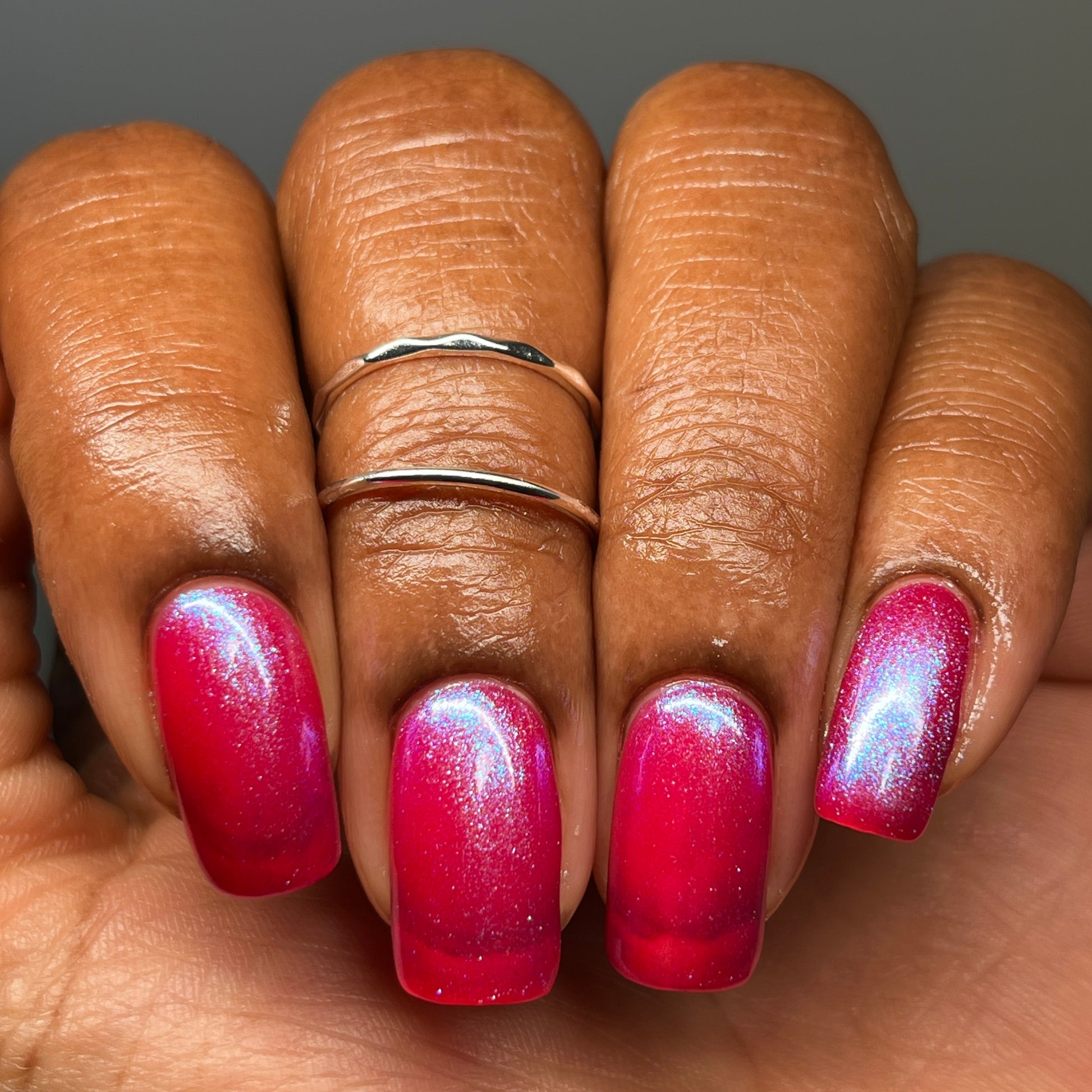 This polish is a sheer magenta base with different blue to purple shimmers.