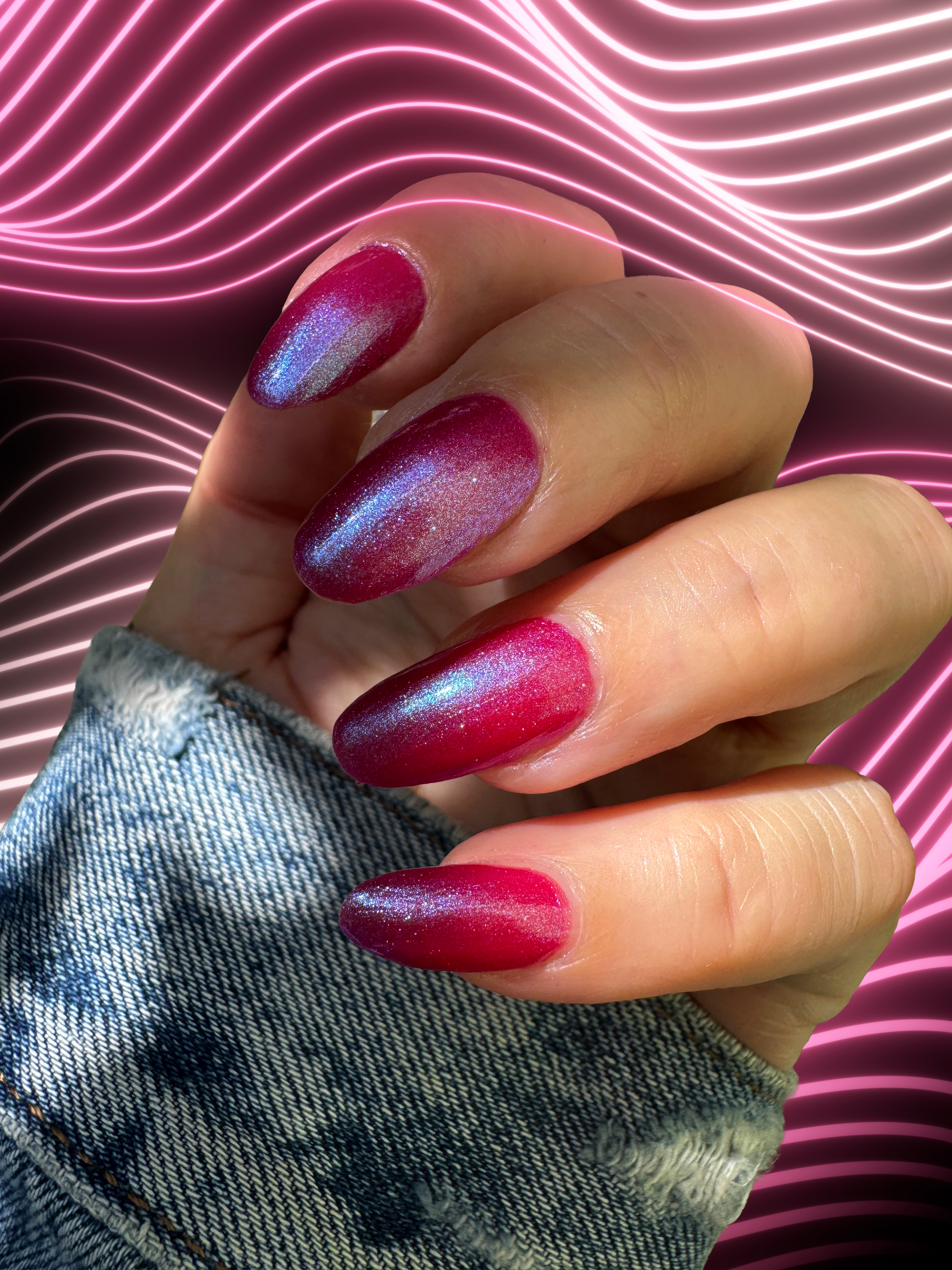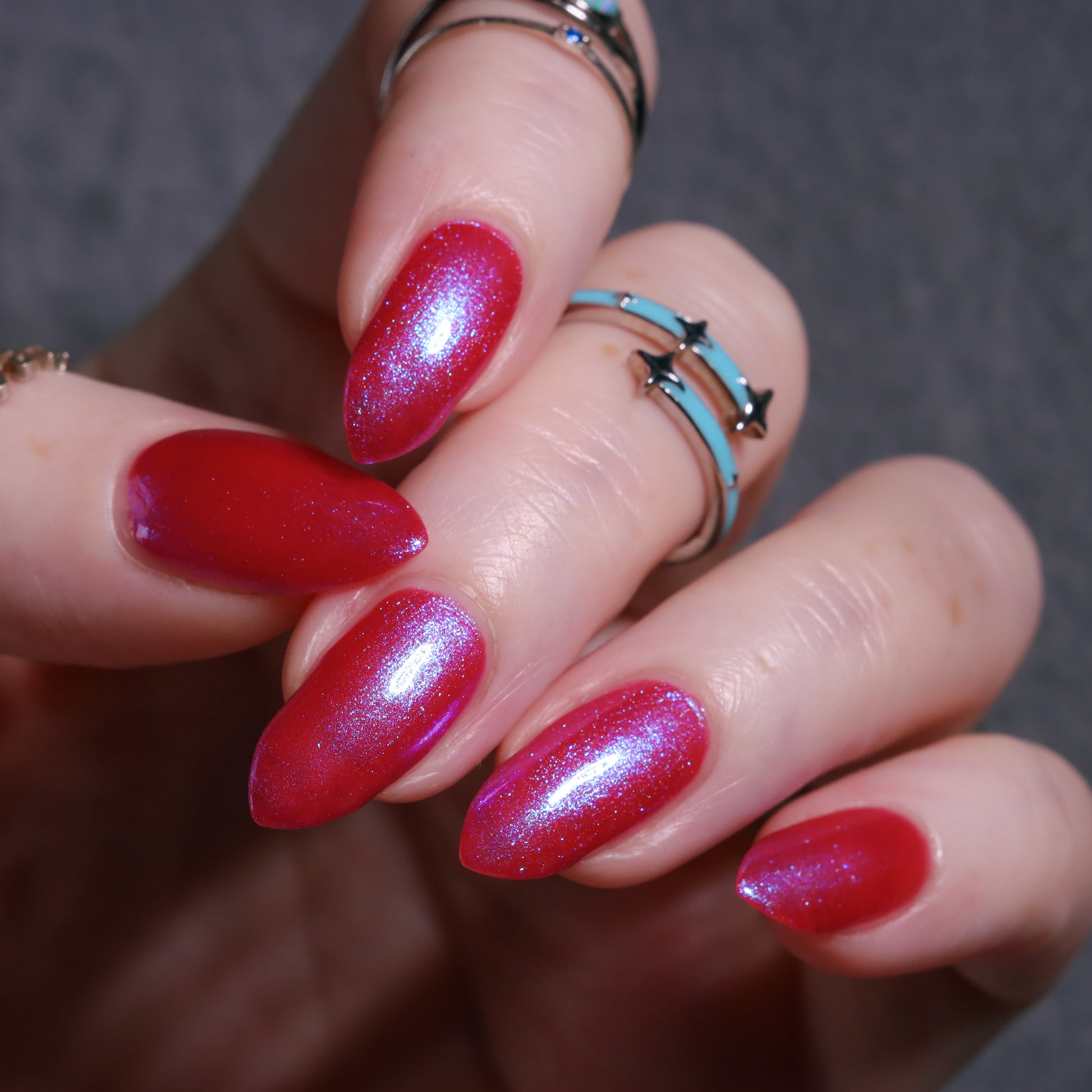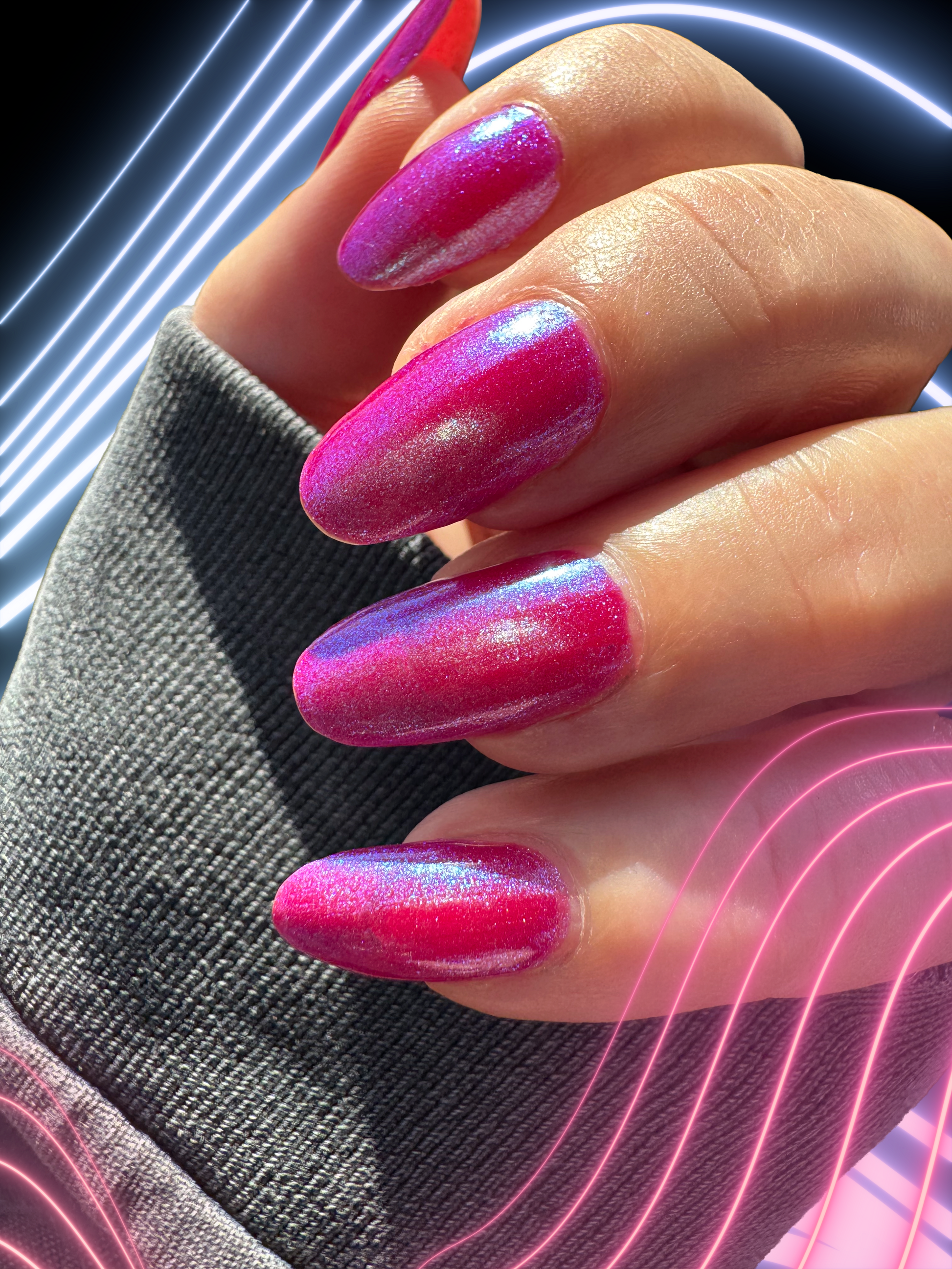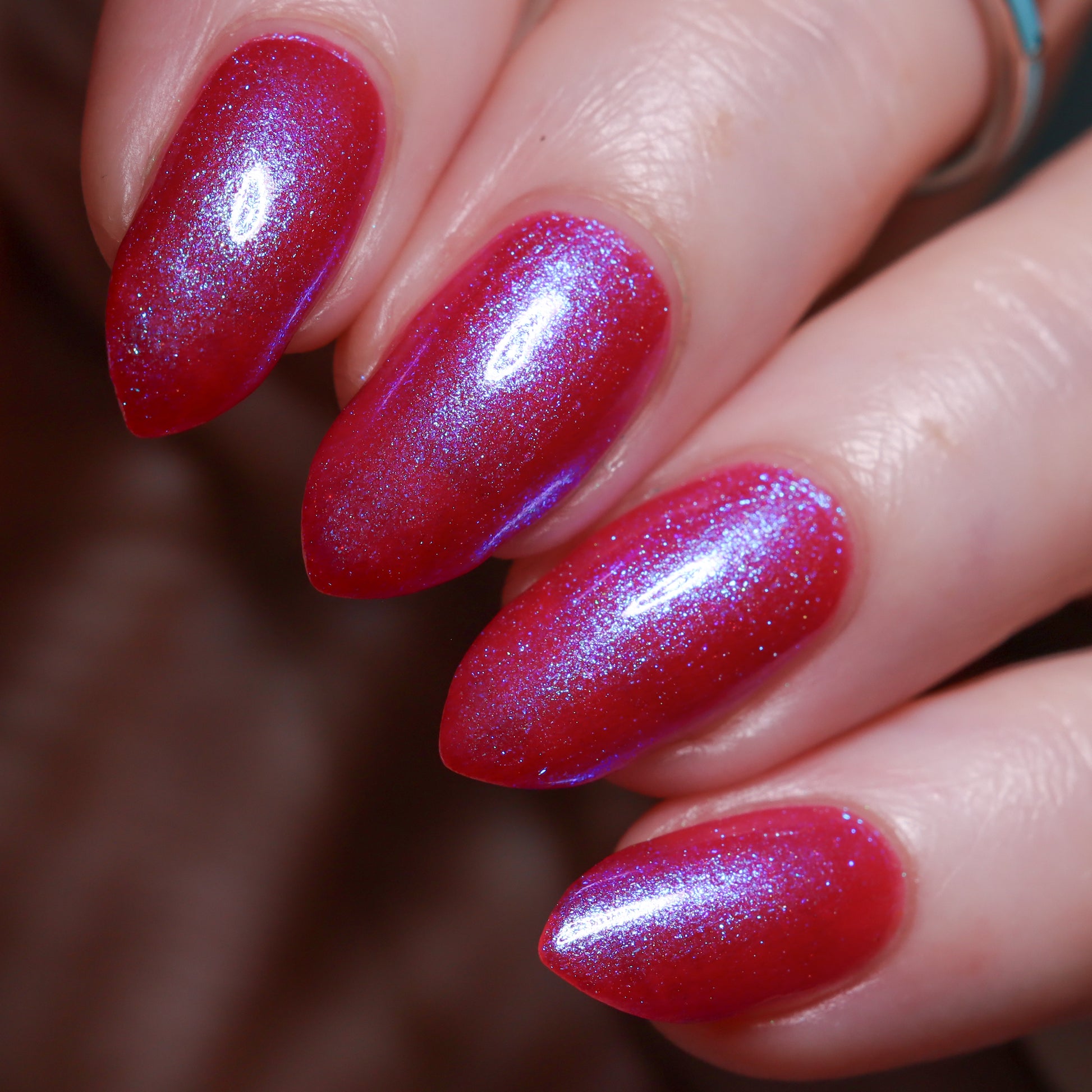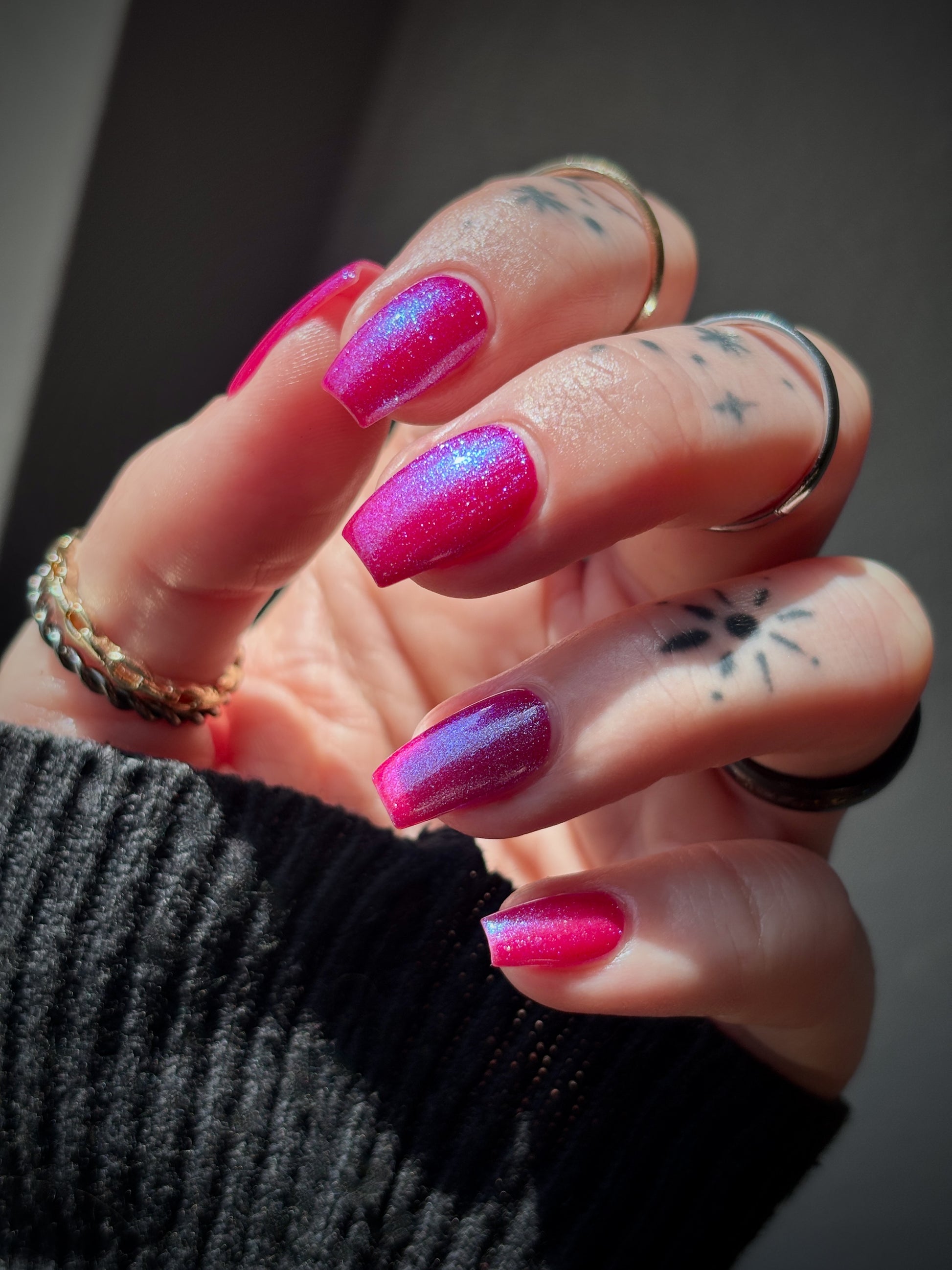 This polish is a sheer magenta base with different blue to purple shimmers.