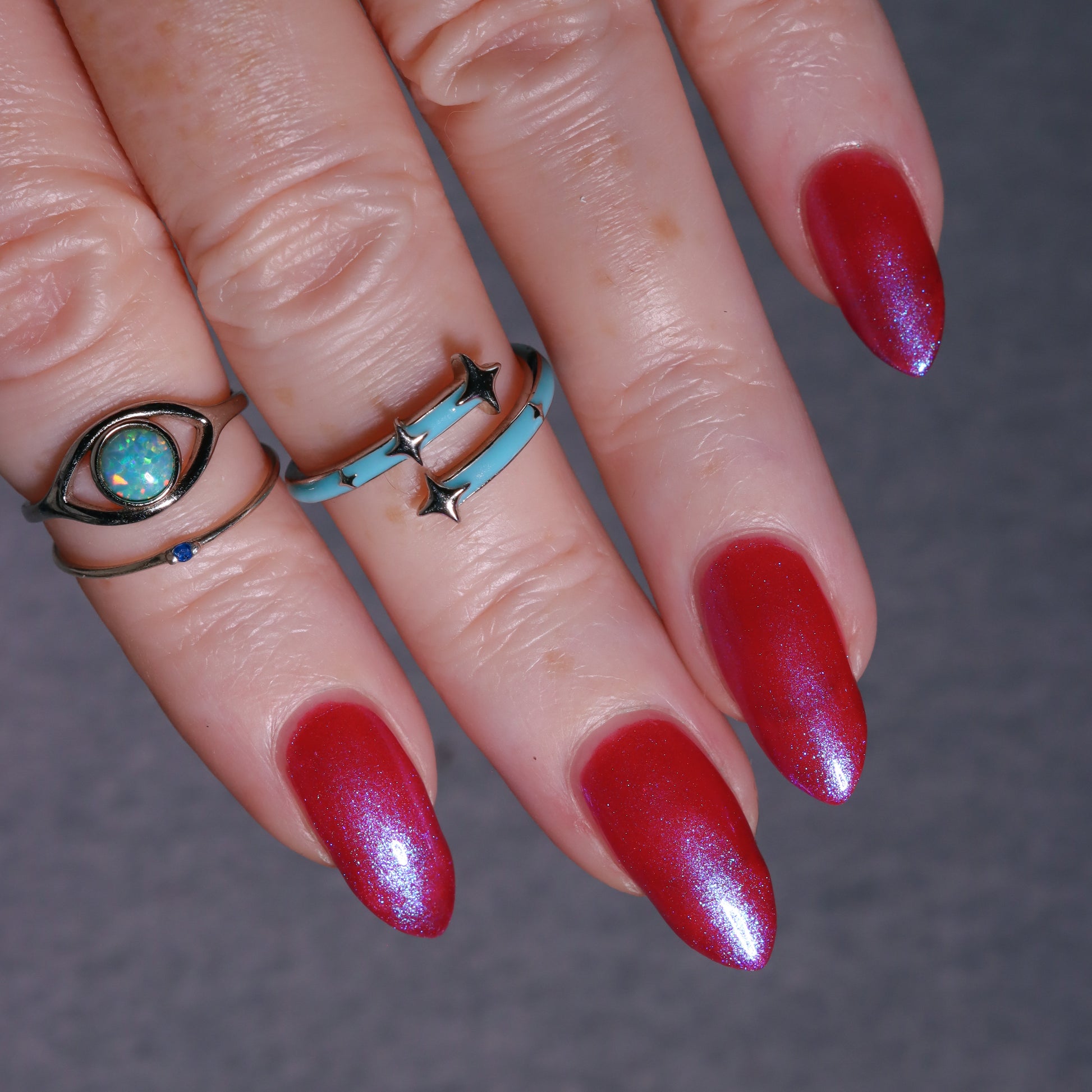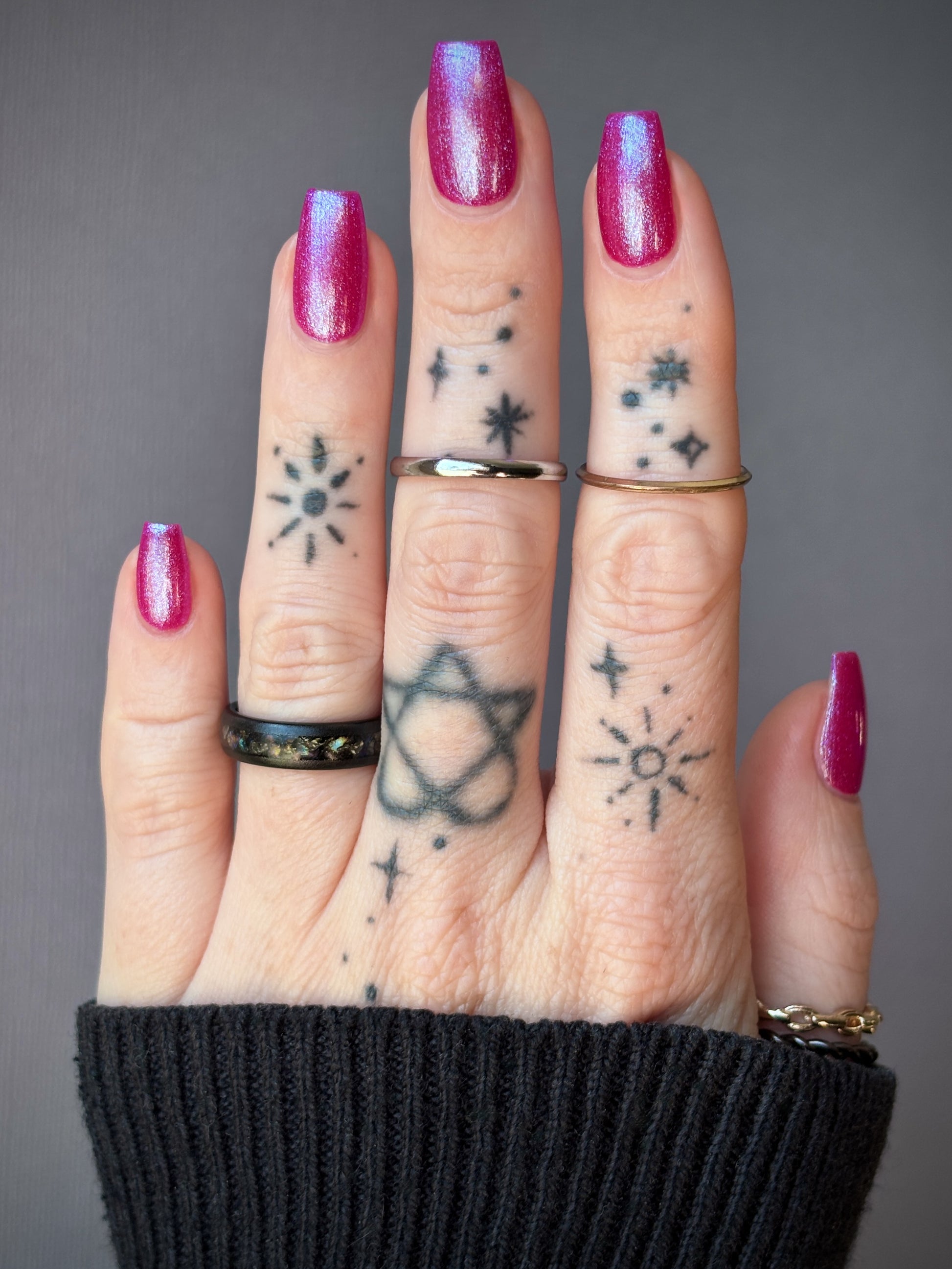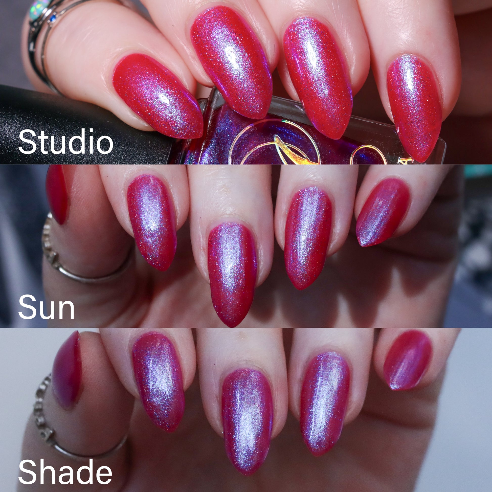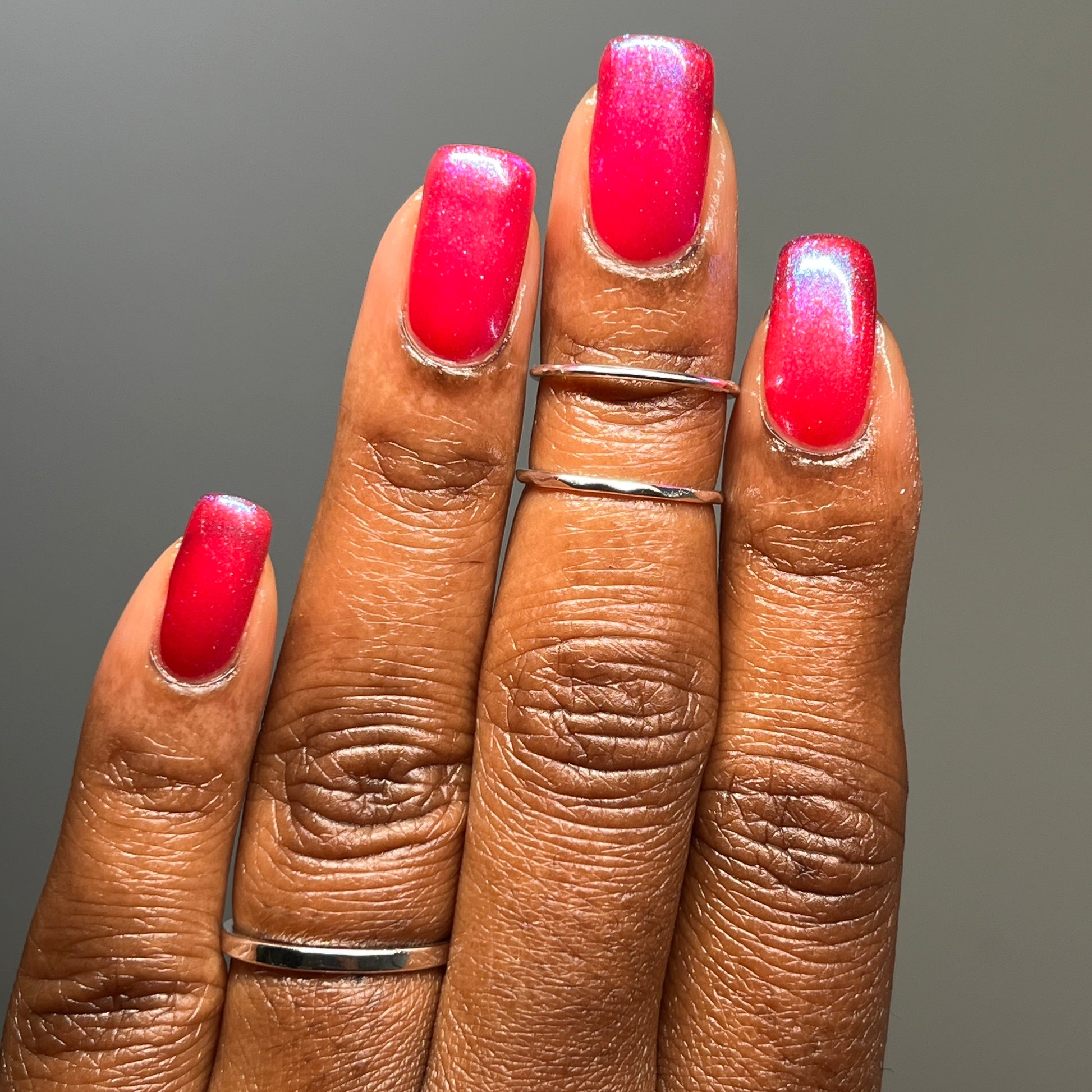 This polish is a sheer magenta base with different blue to purple shimmers.