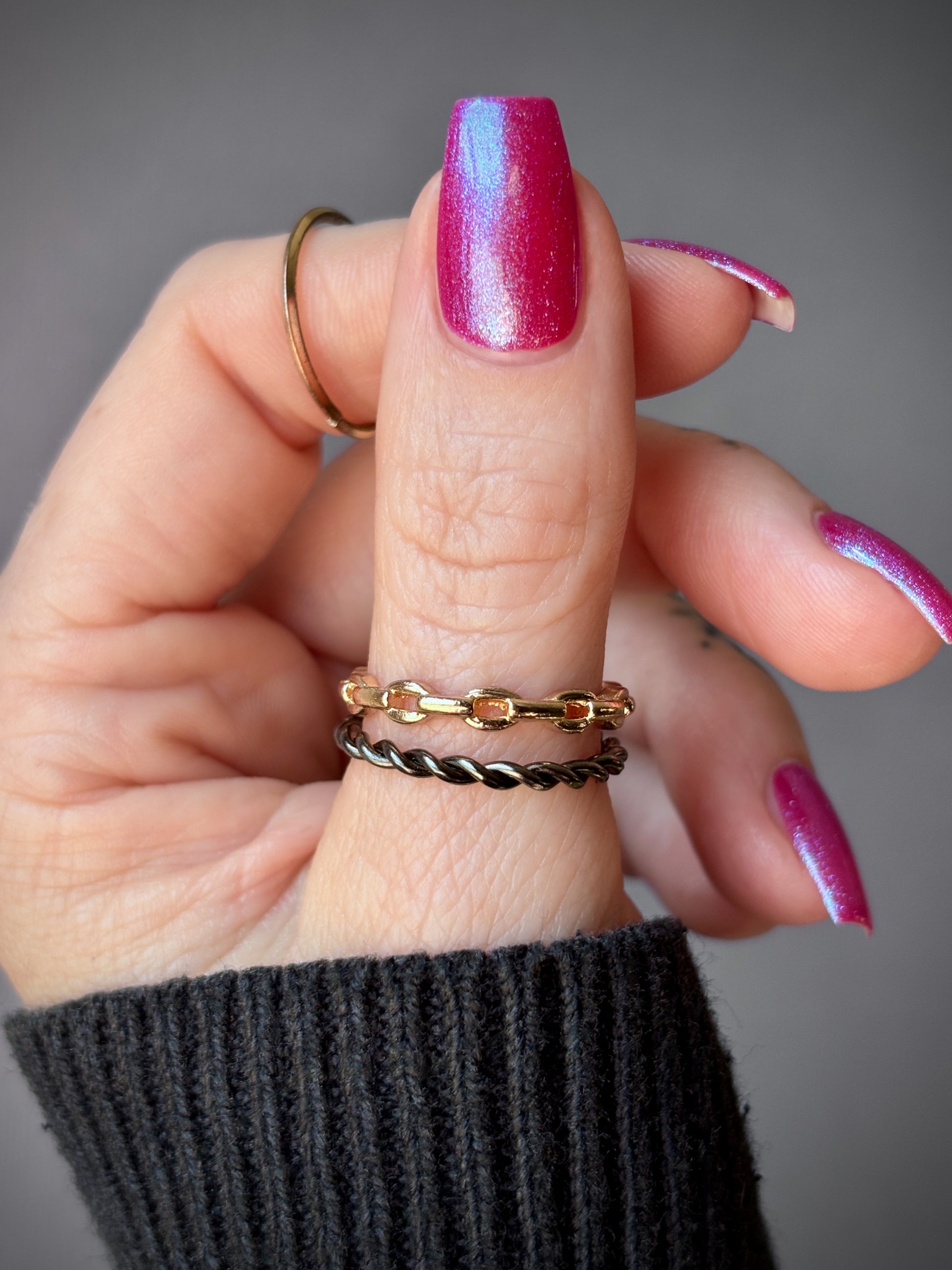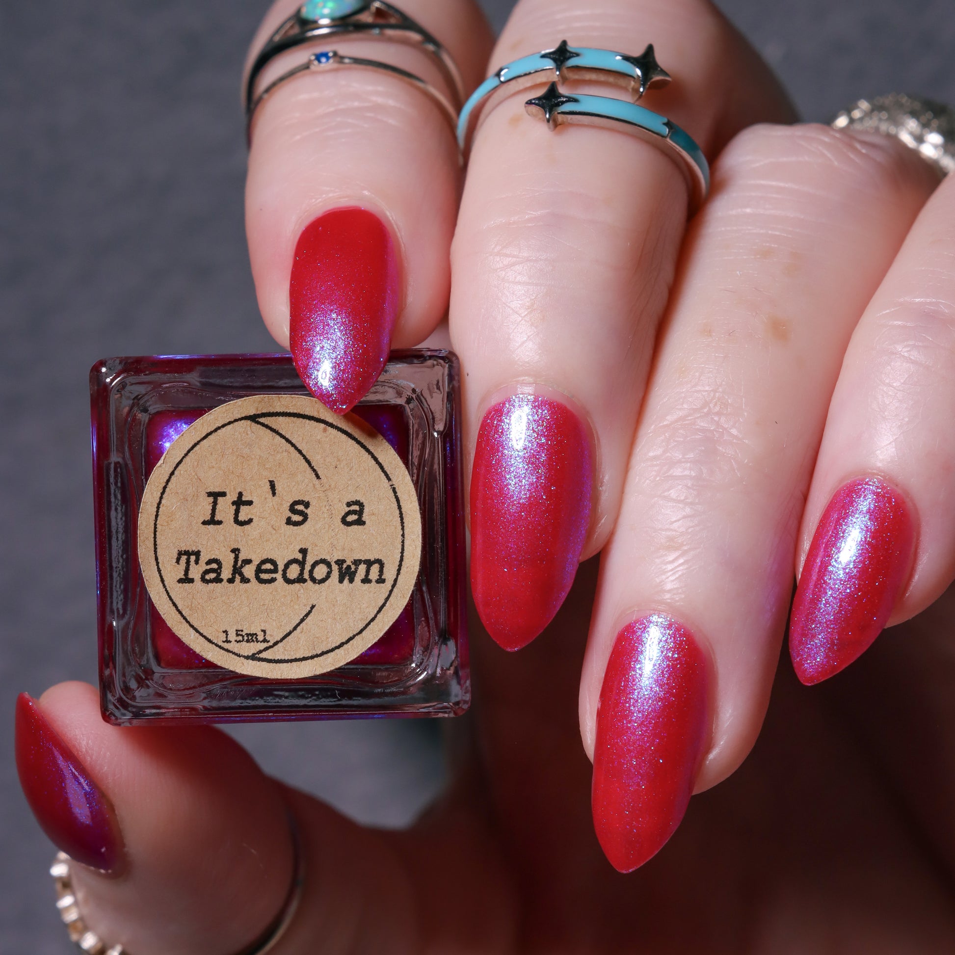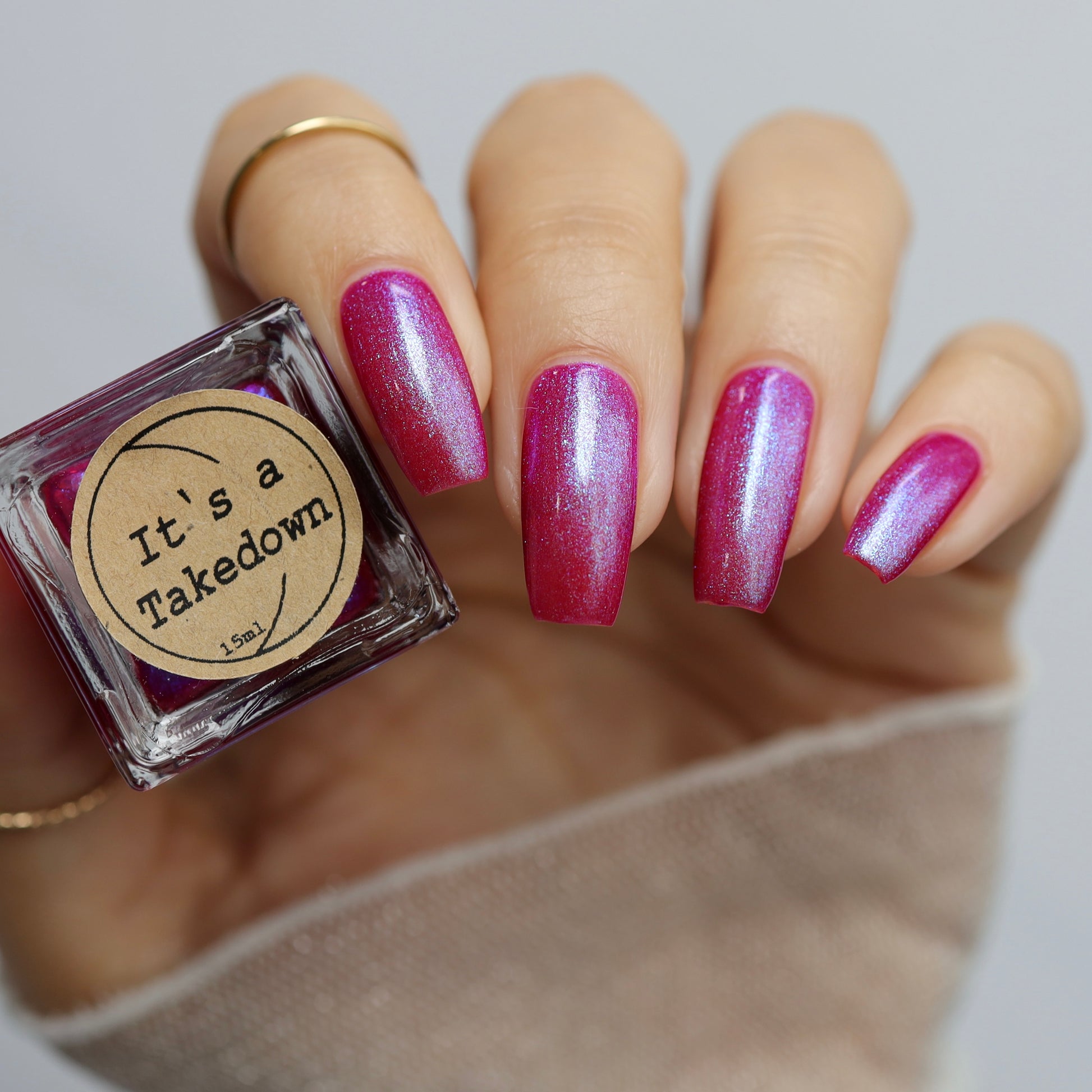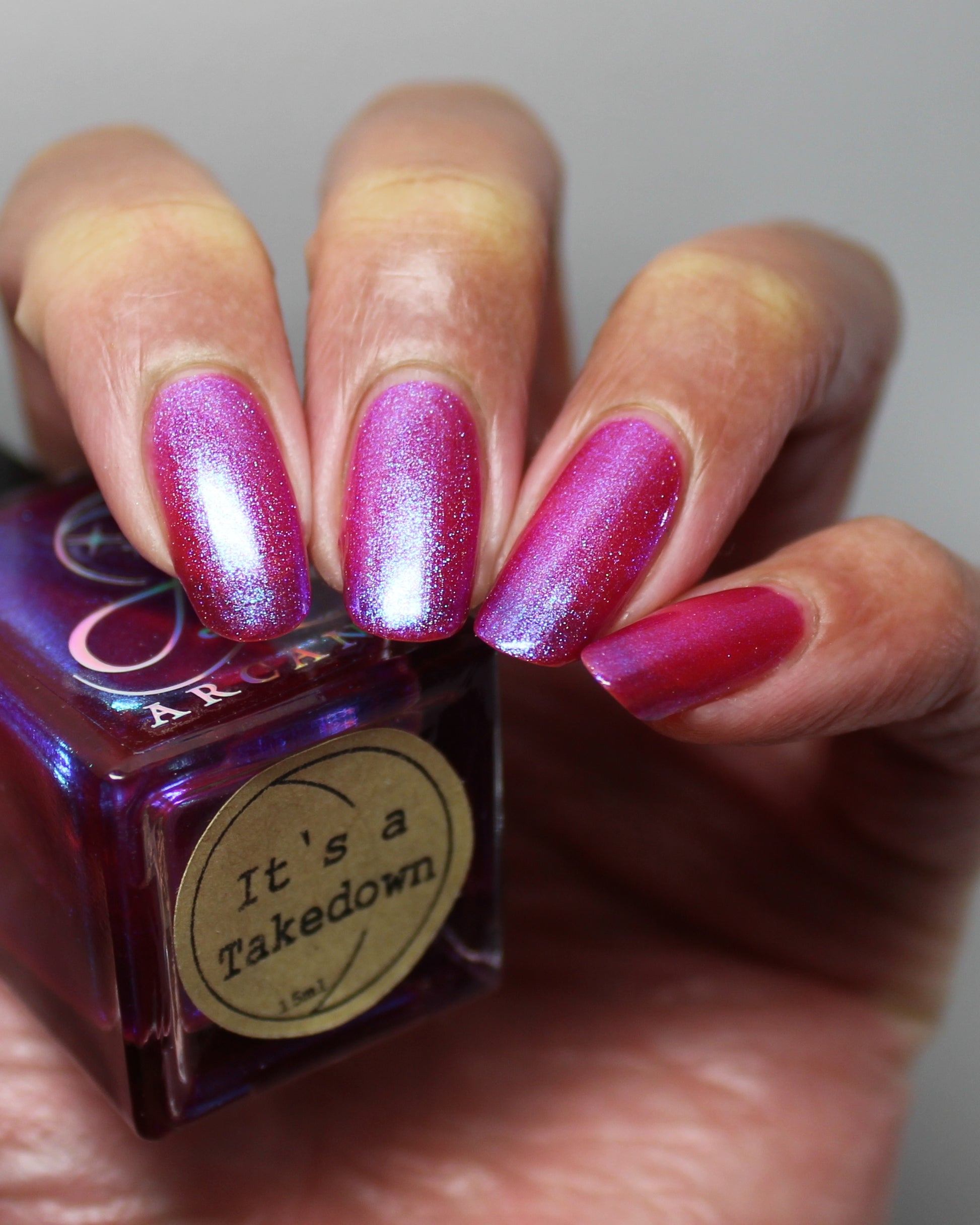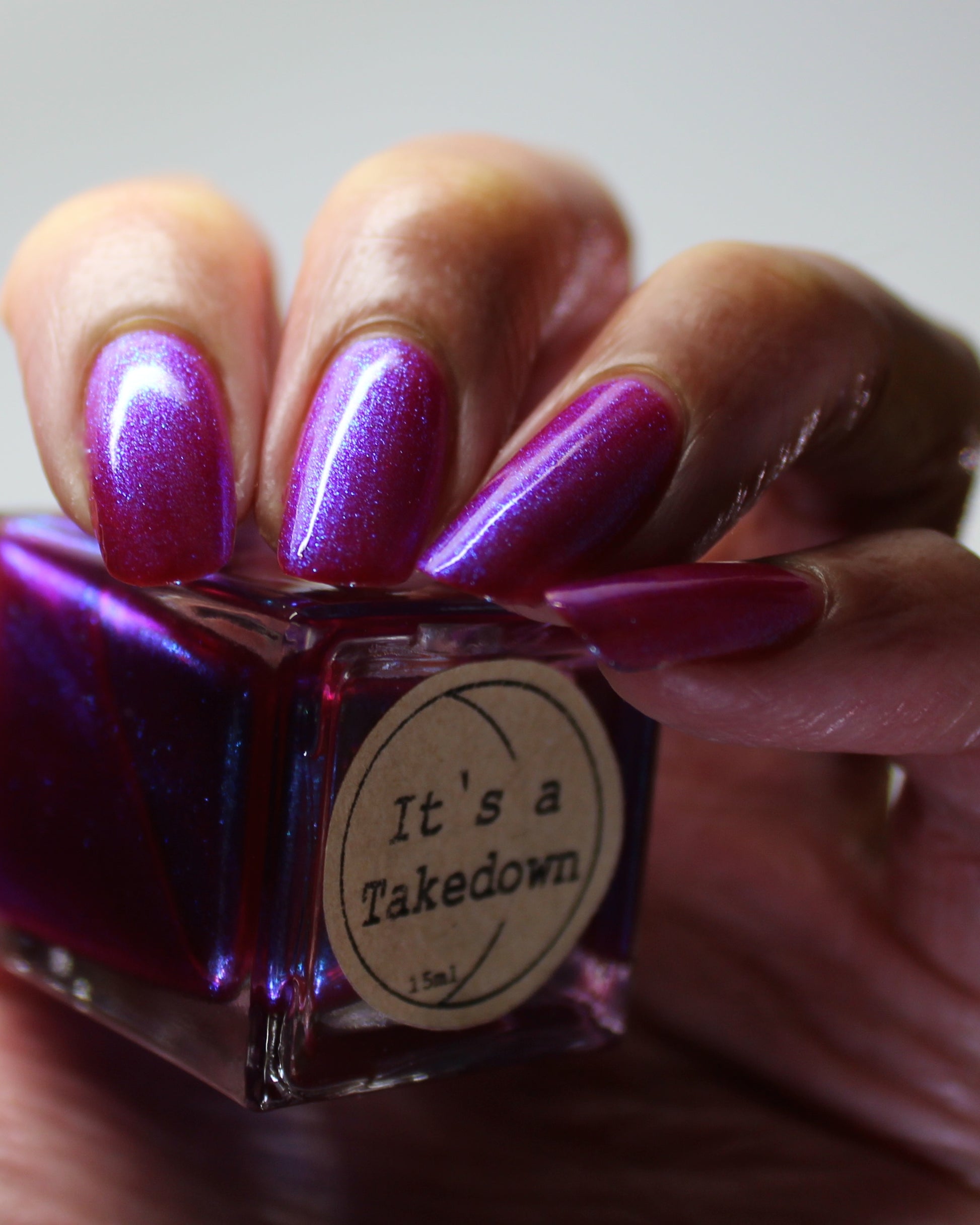 This polish is a sheer magenta base with different blue to purple shimmers.
