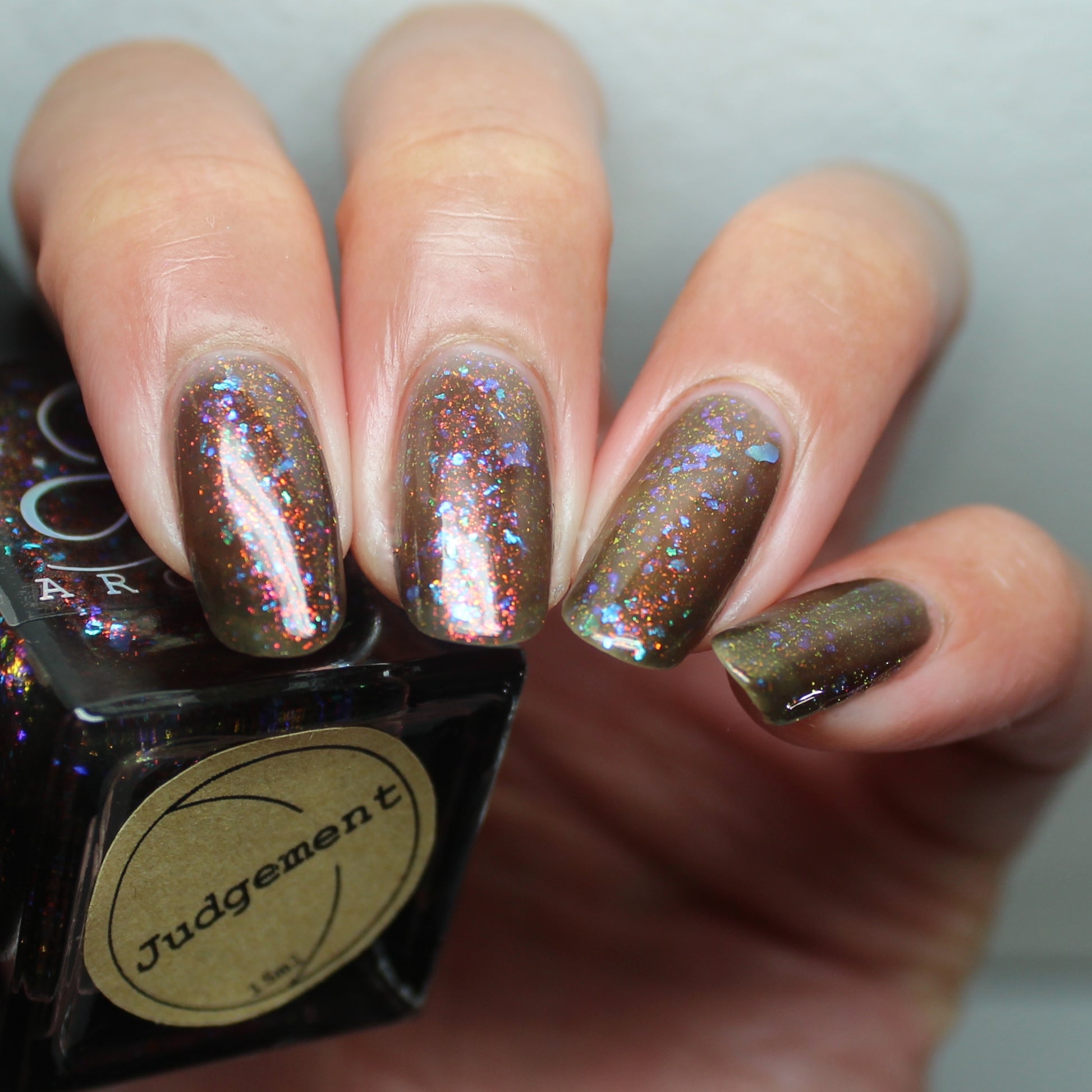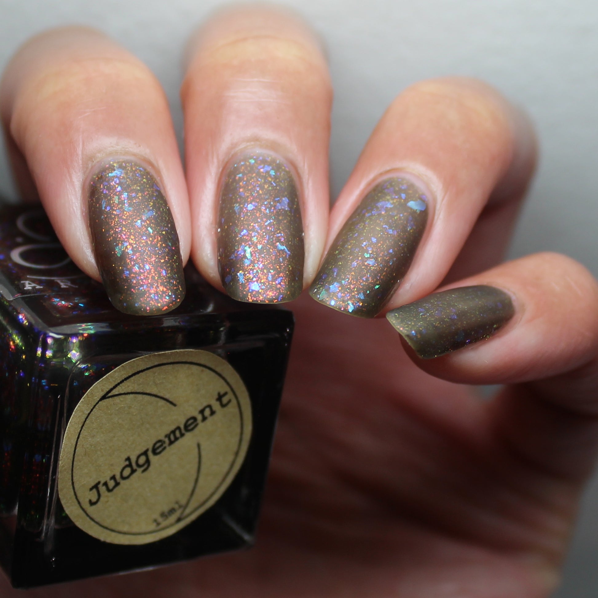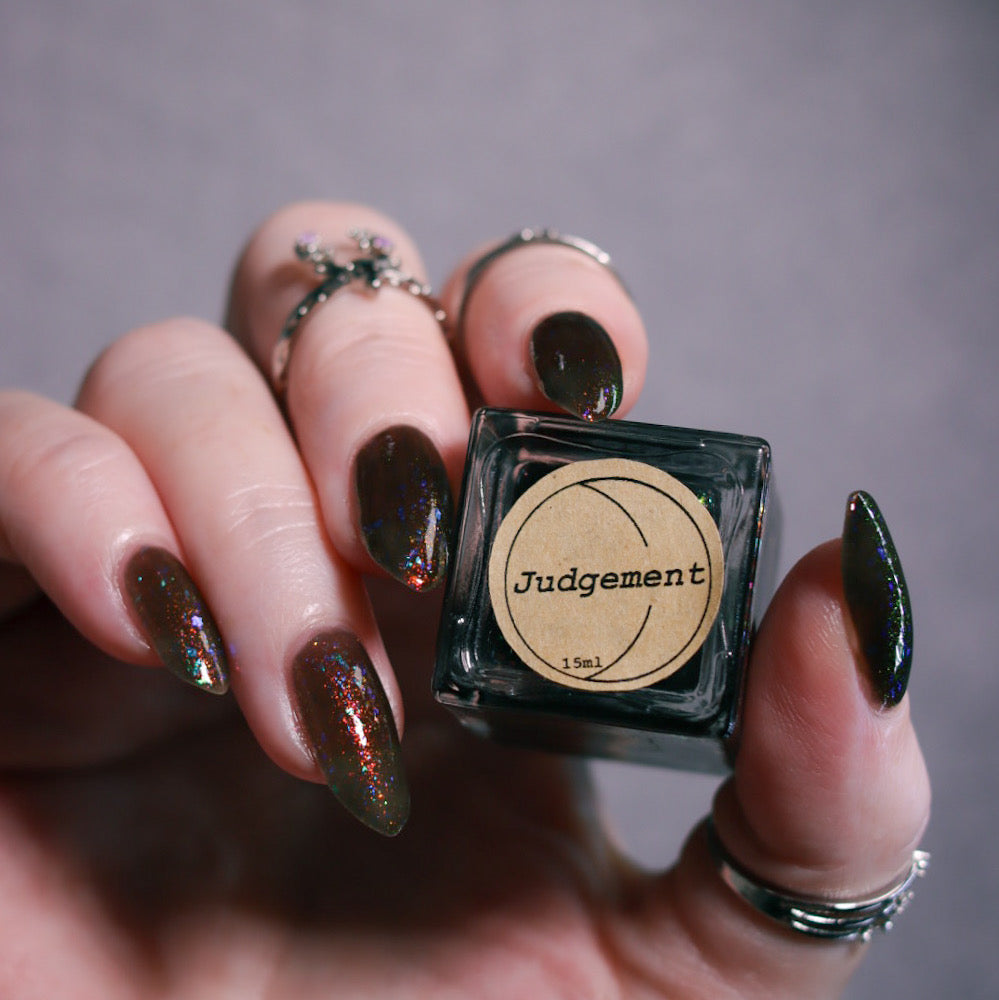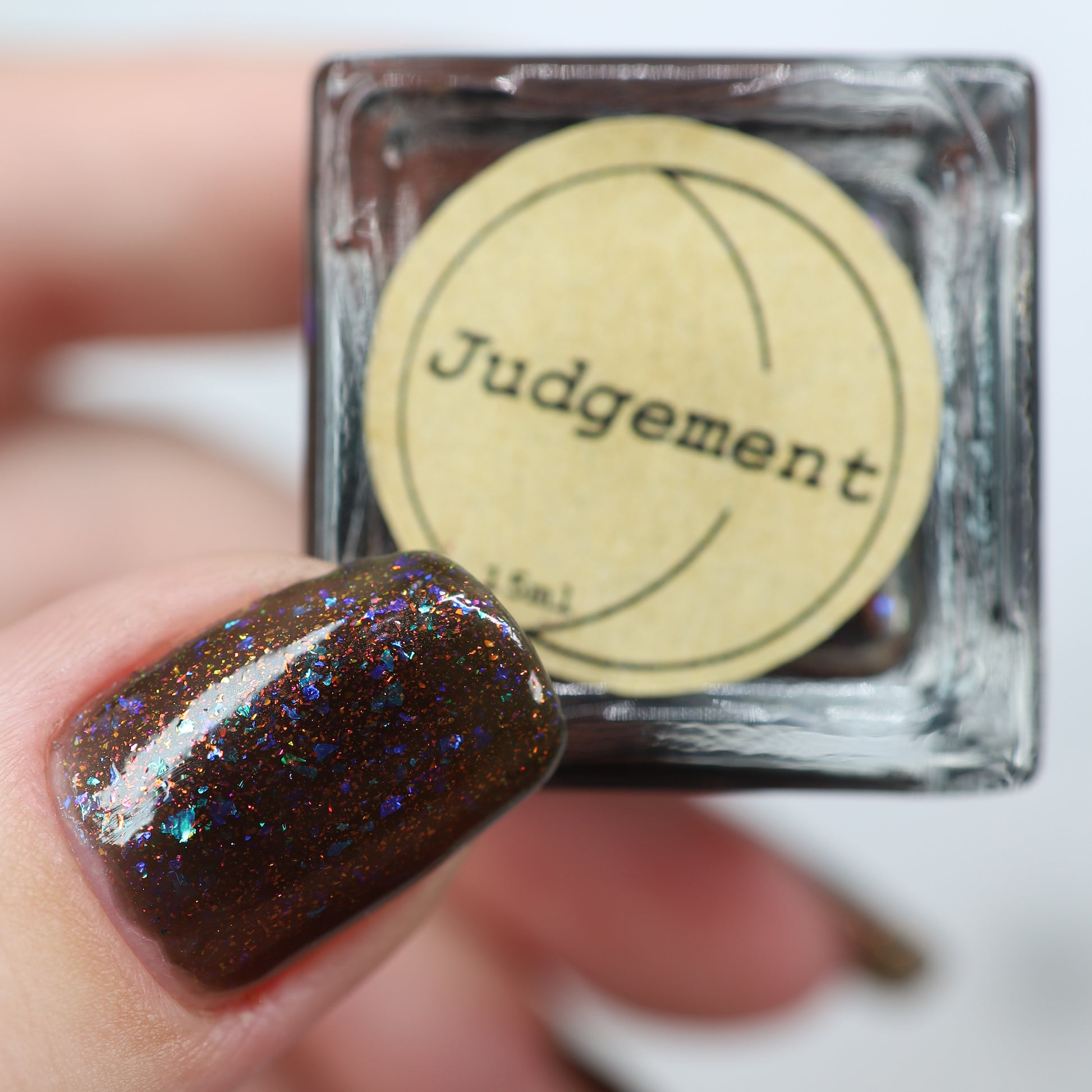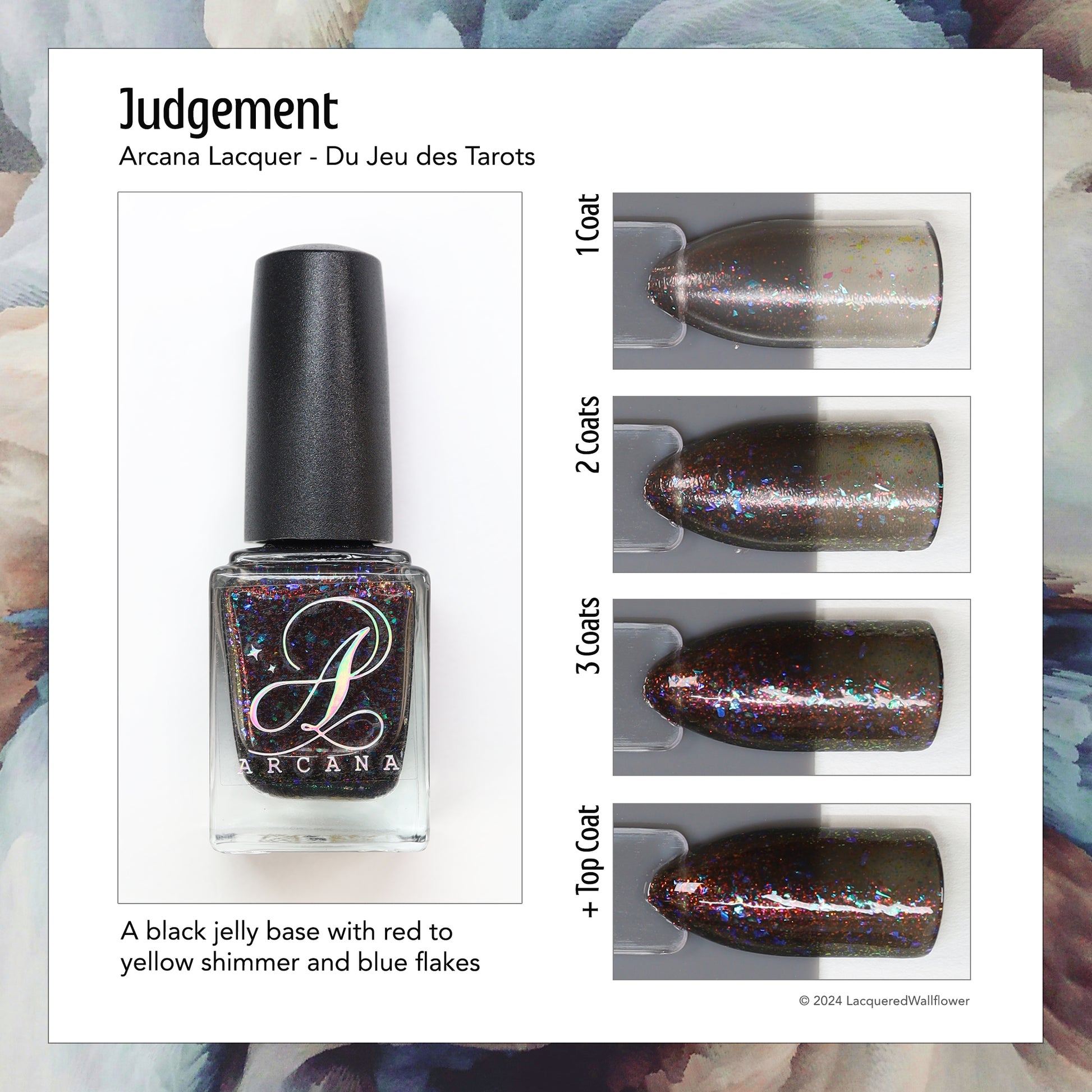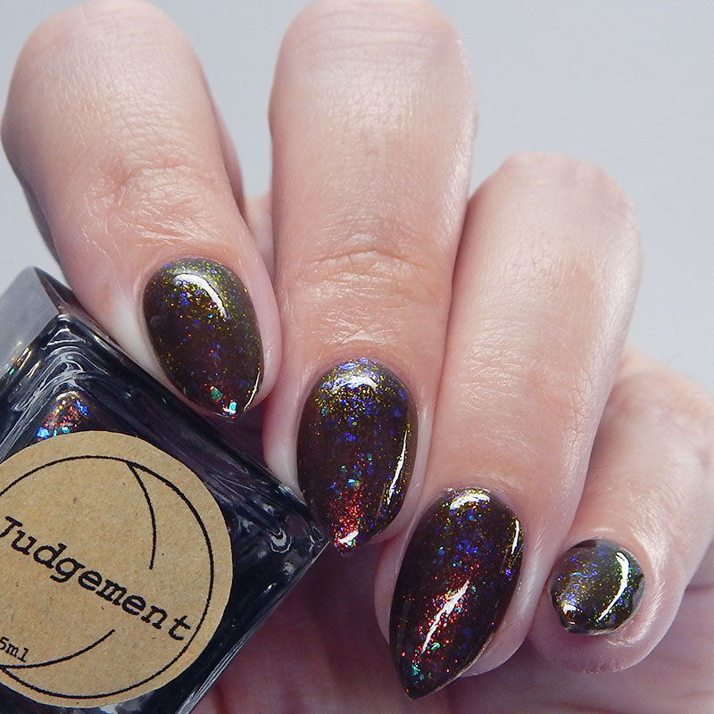 Judgement is a black base with red to yellow shimmer and blue flakes.