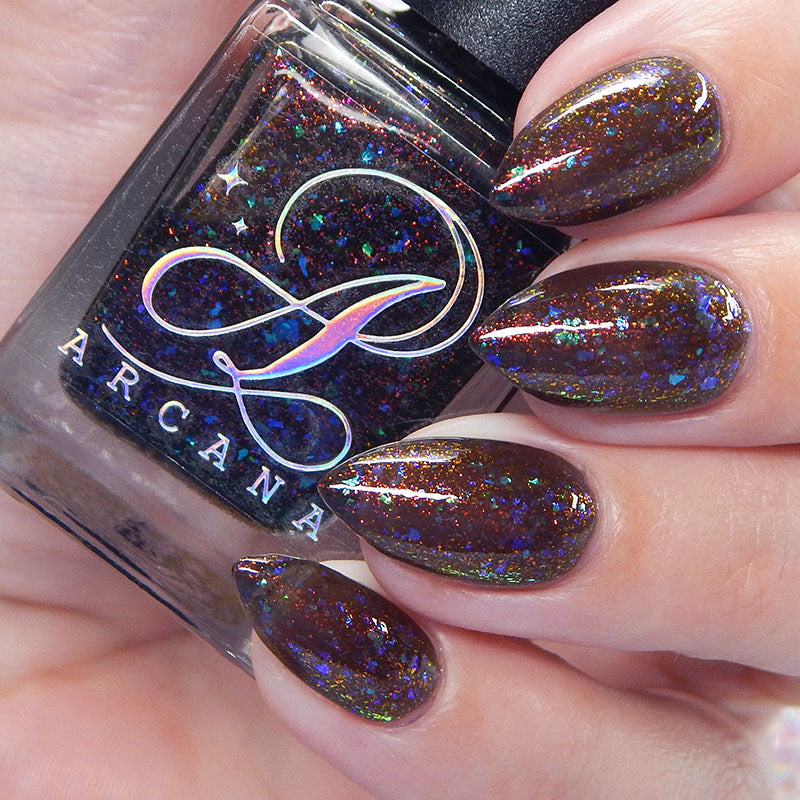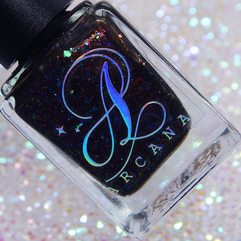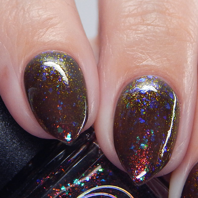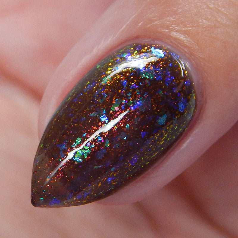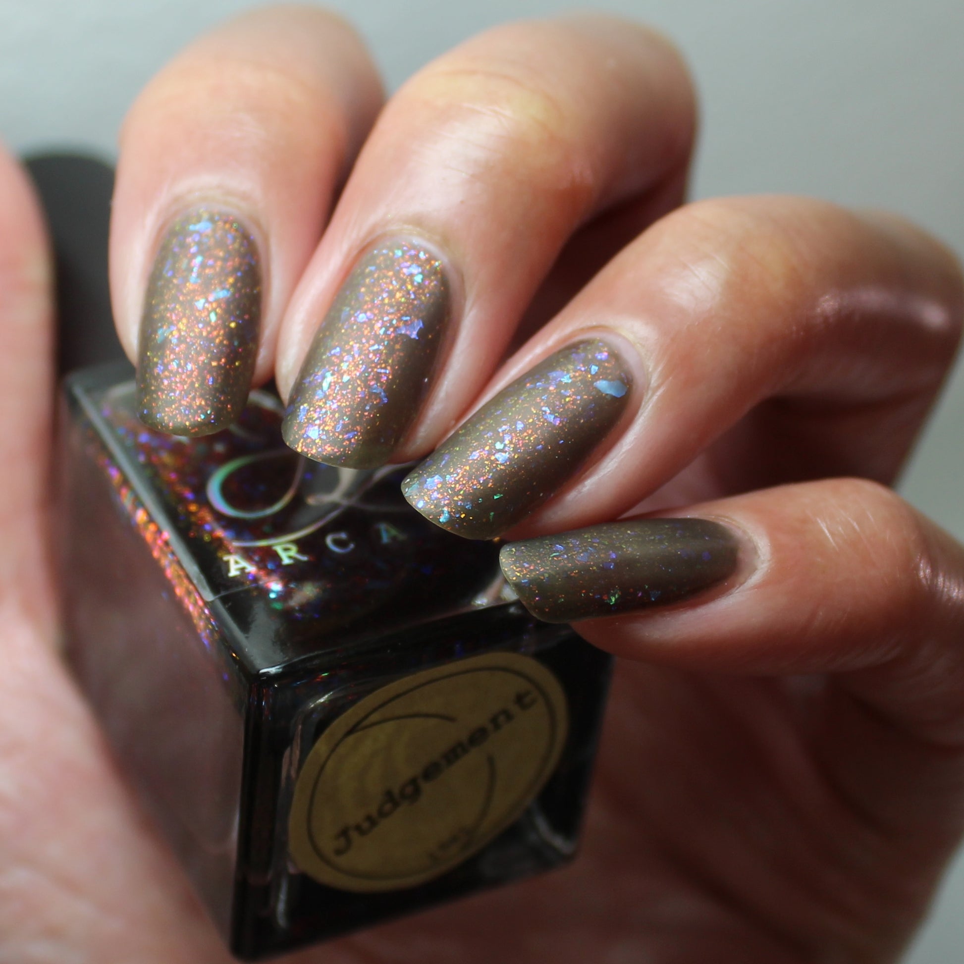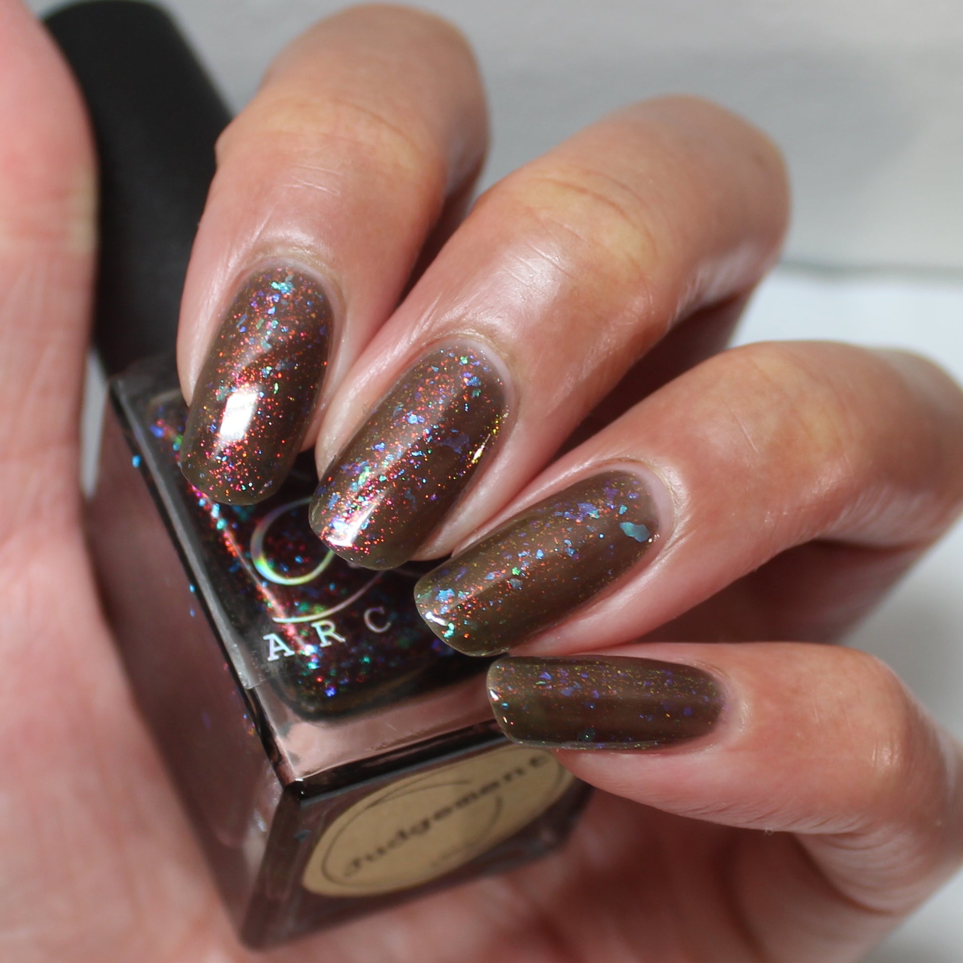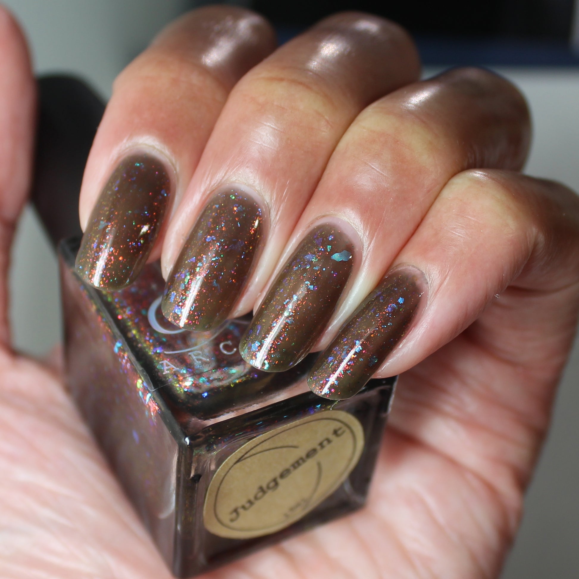 Judgement is a black base with red to yellow shimmer and blue flakes.