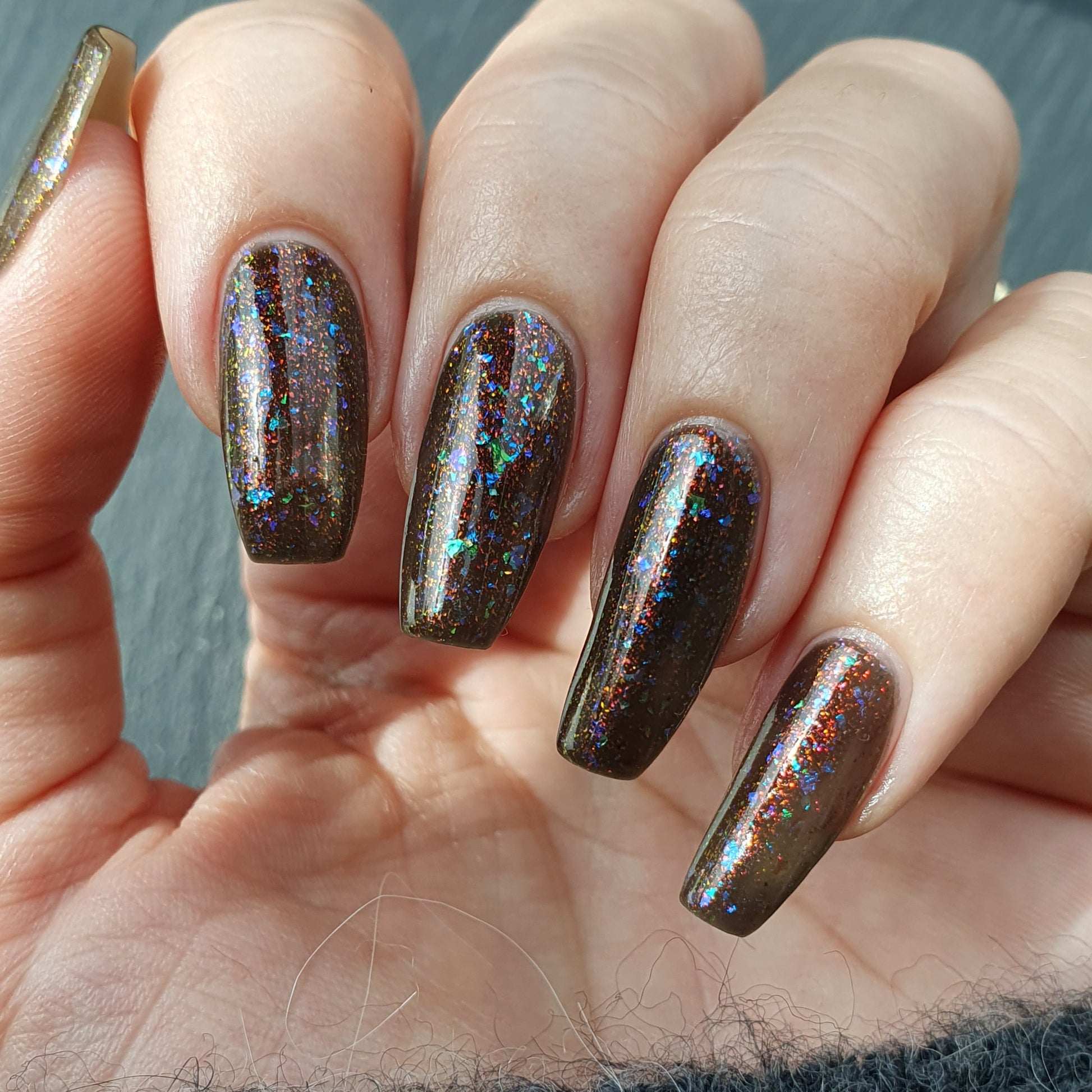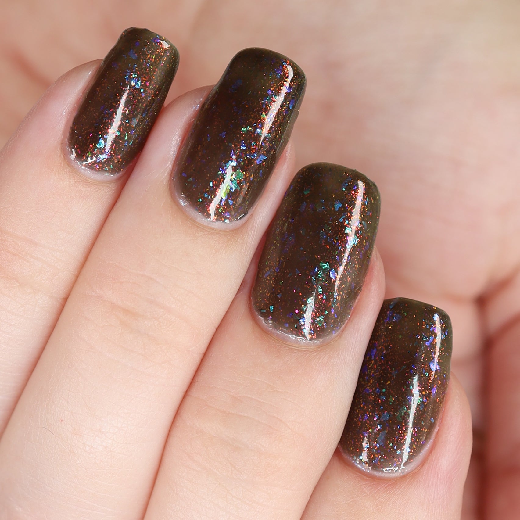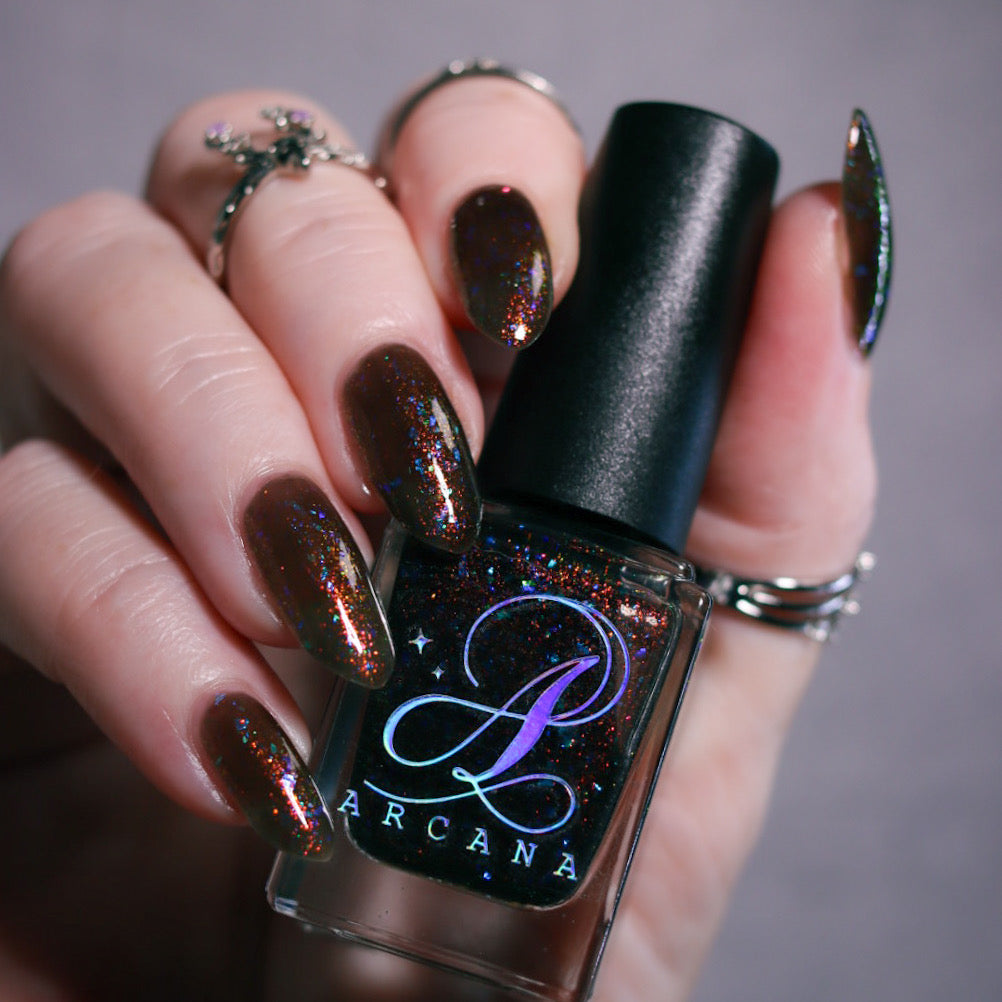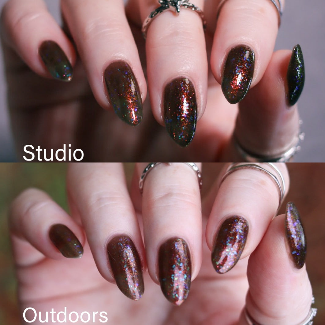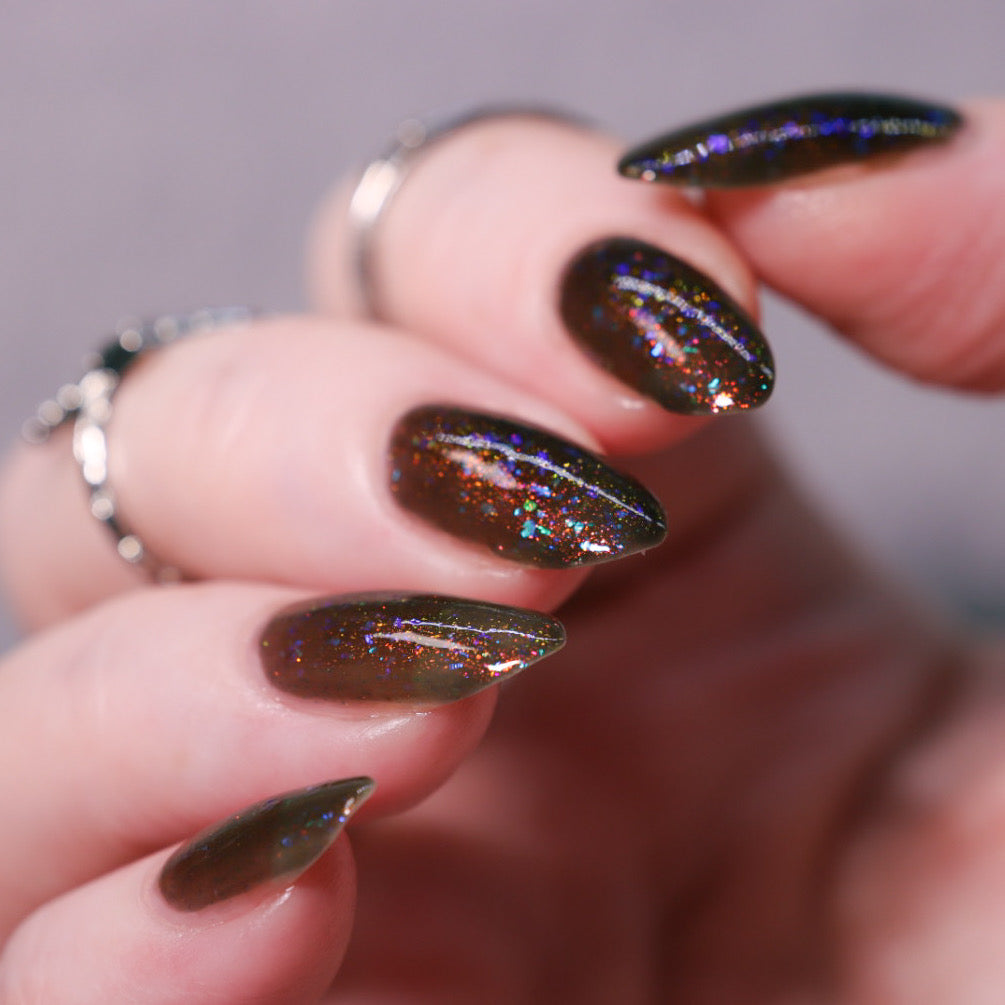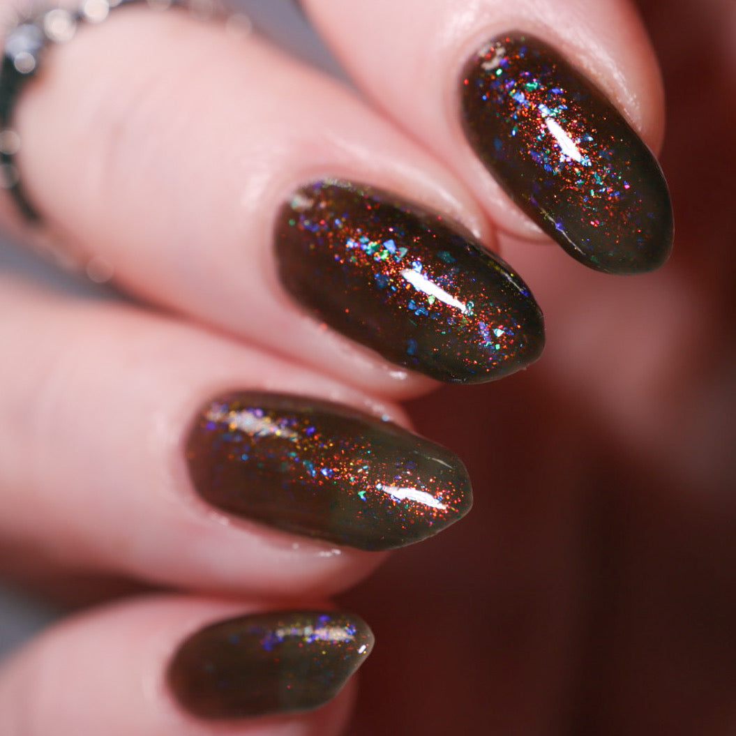 Judgement is a black base with red to yellow shimmer and blue flakes.