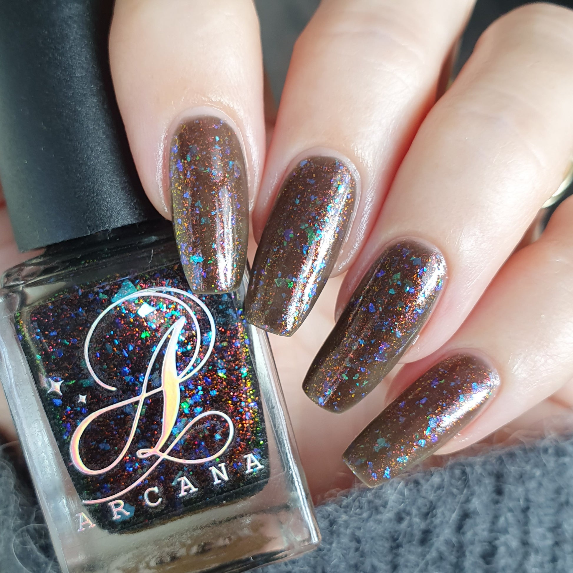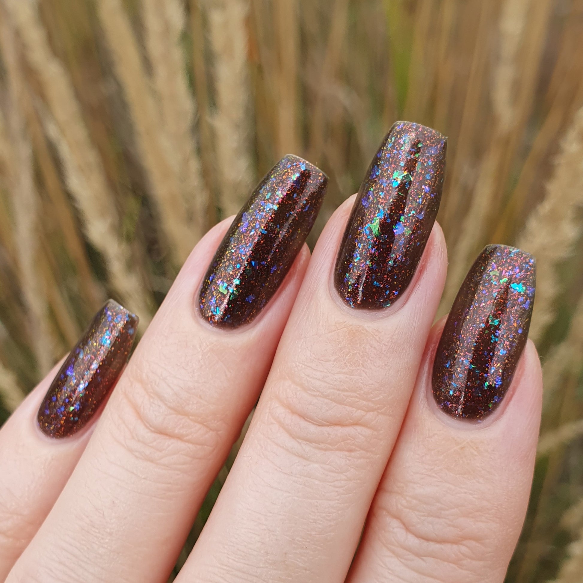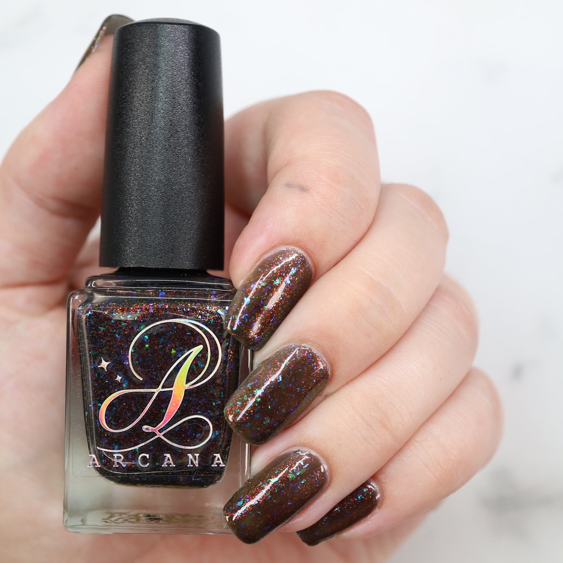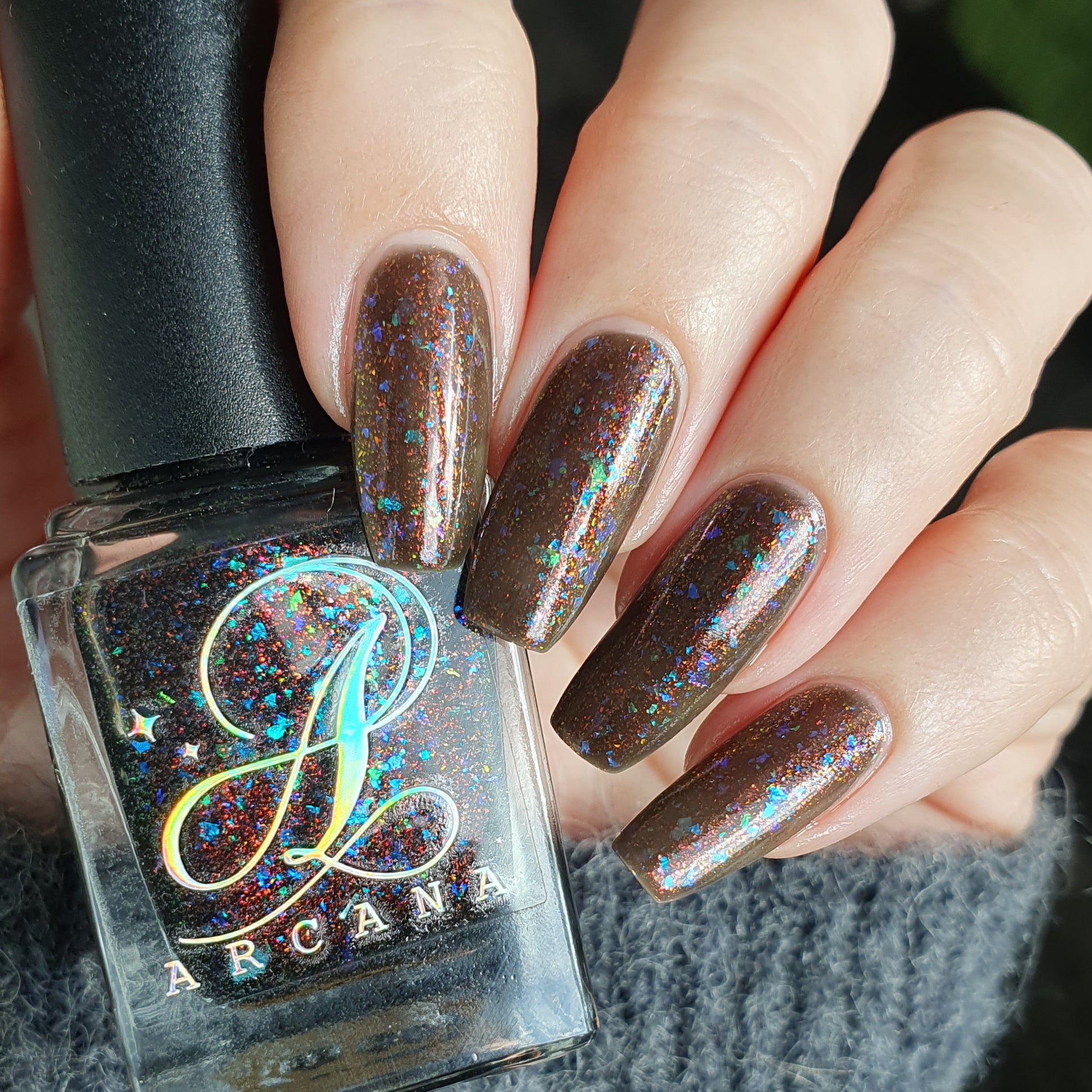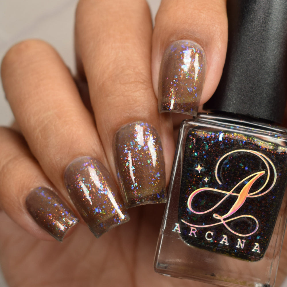Judgement is a black base with red to yellow shimmer and blue flakes.