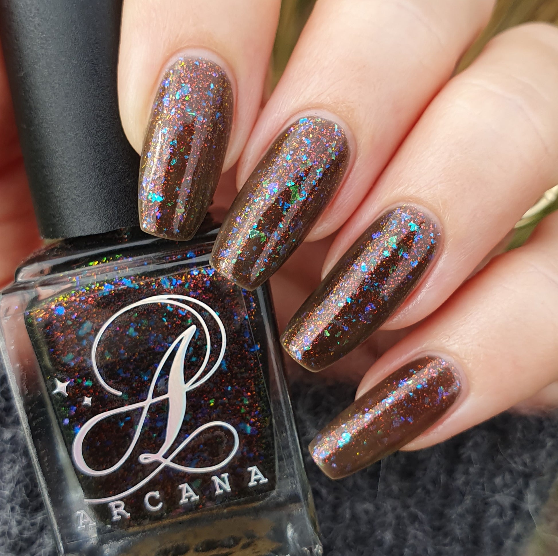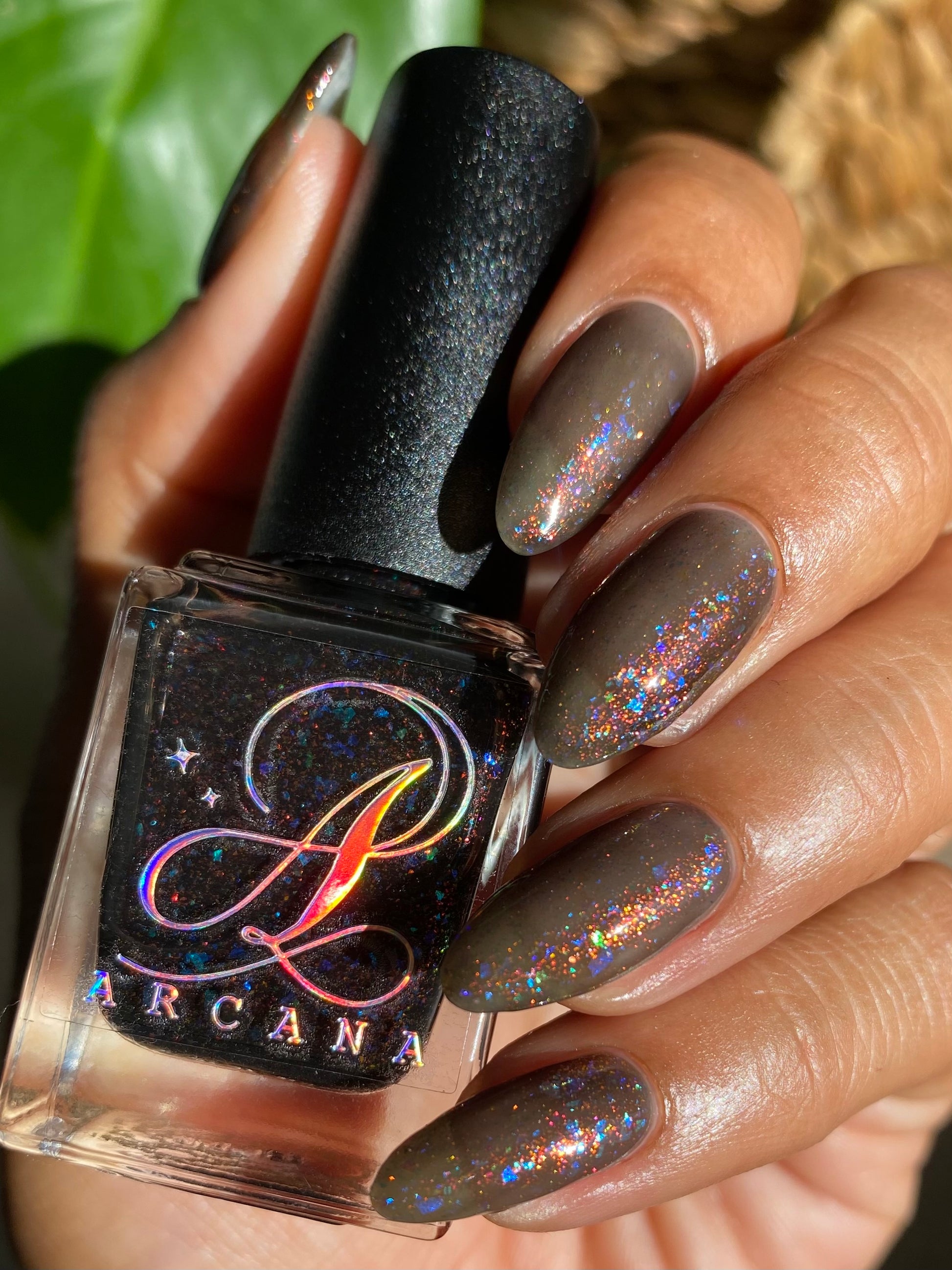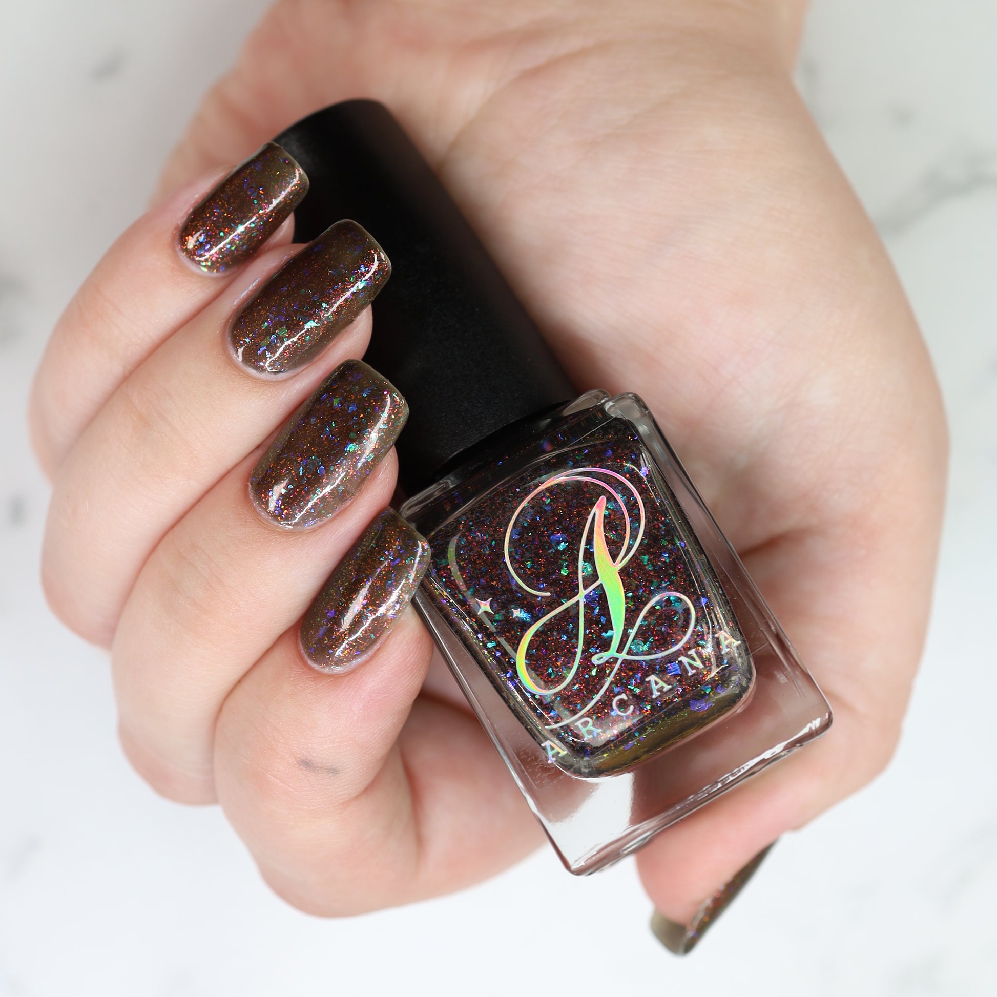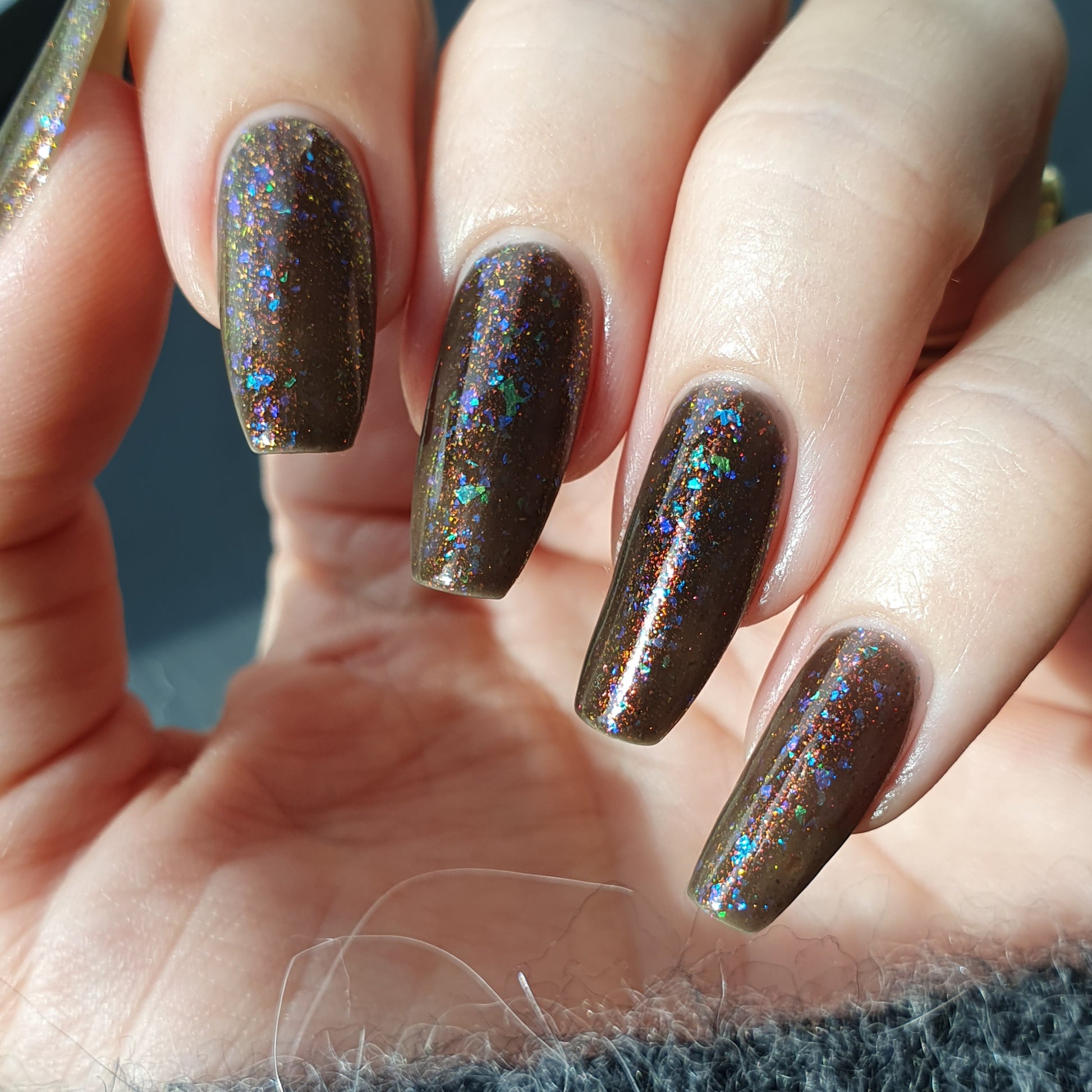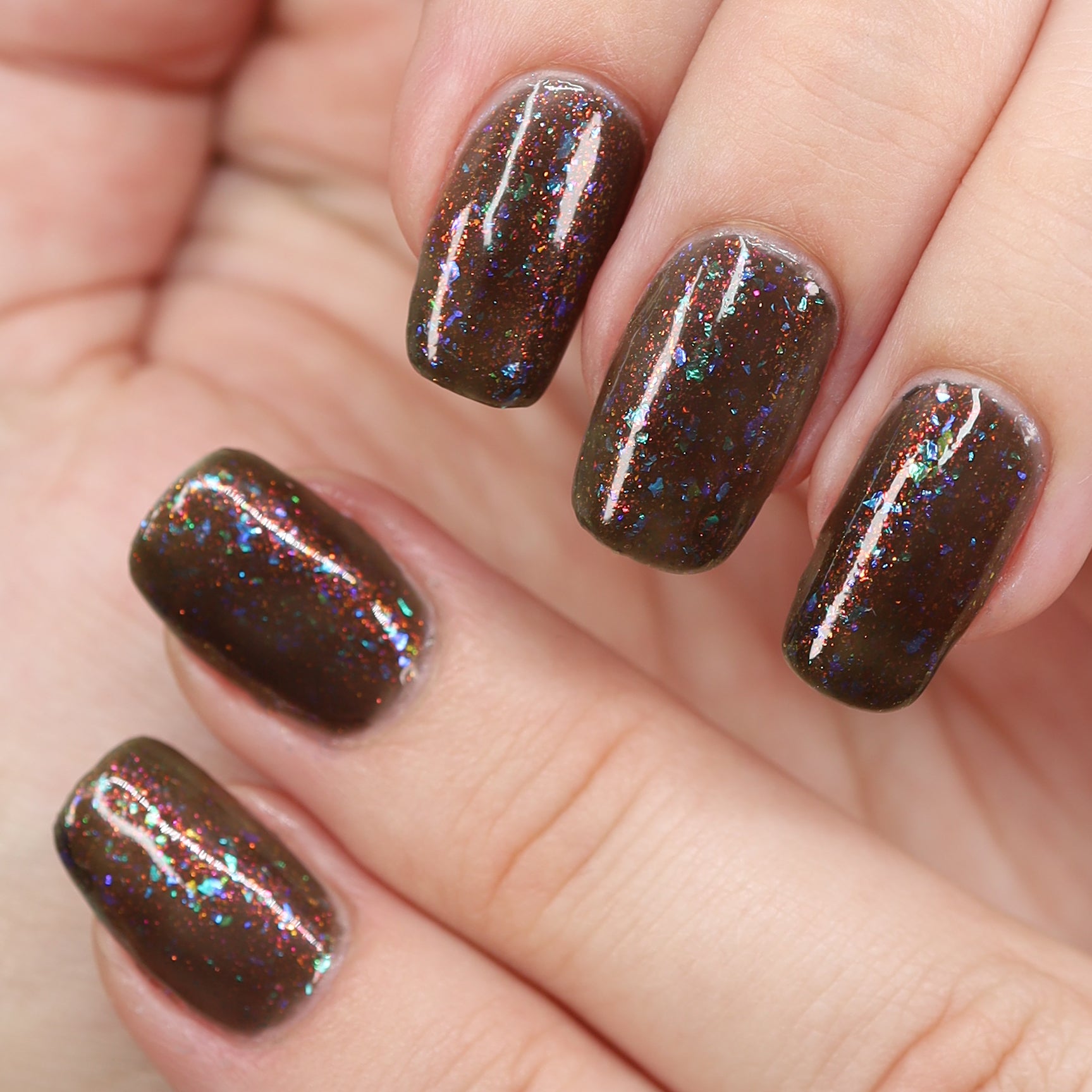Judgement is a black base with red to yellow shimmer and blue flakes.