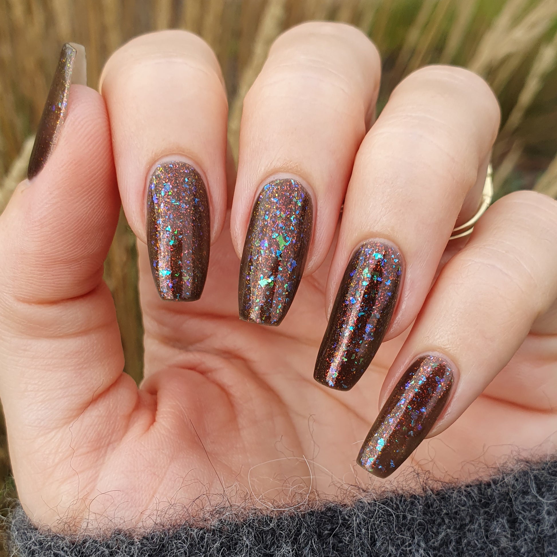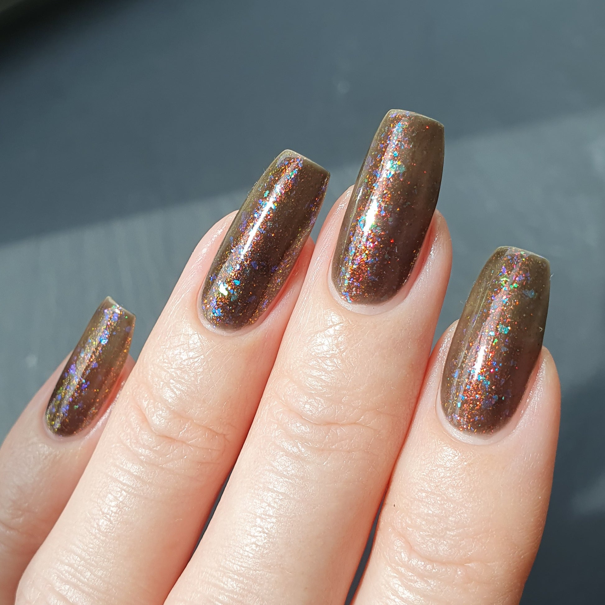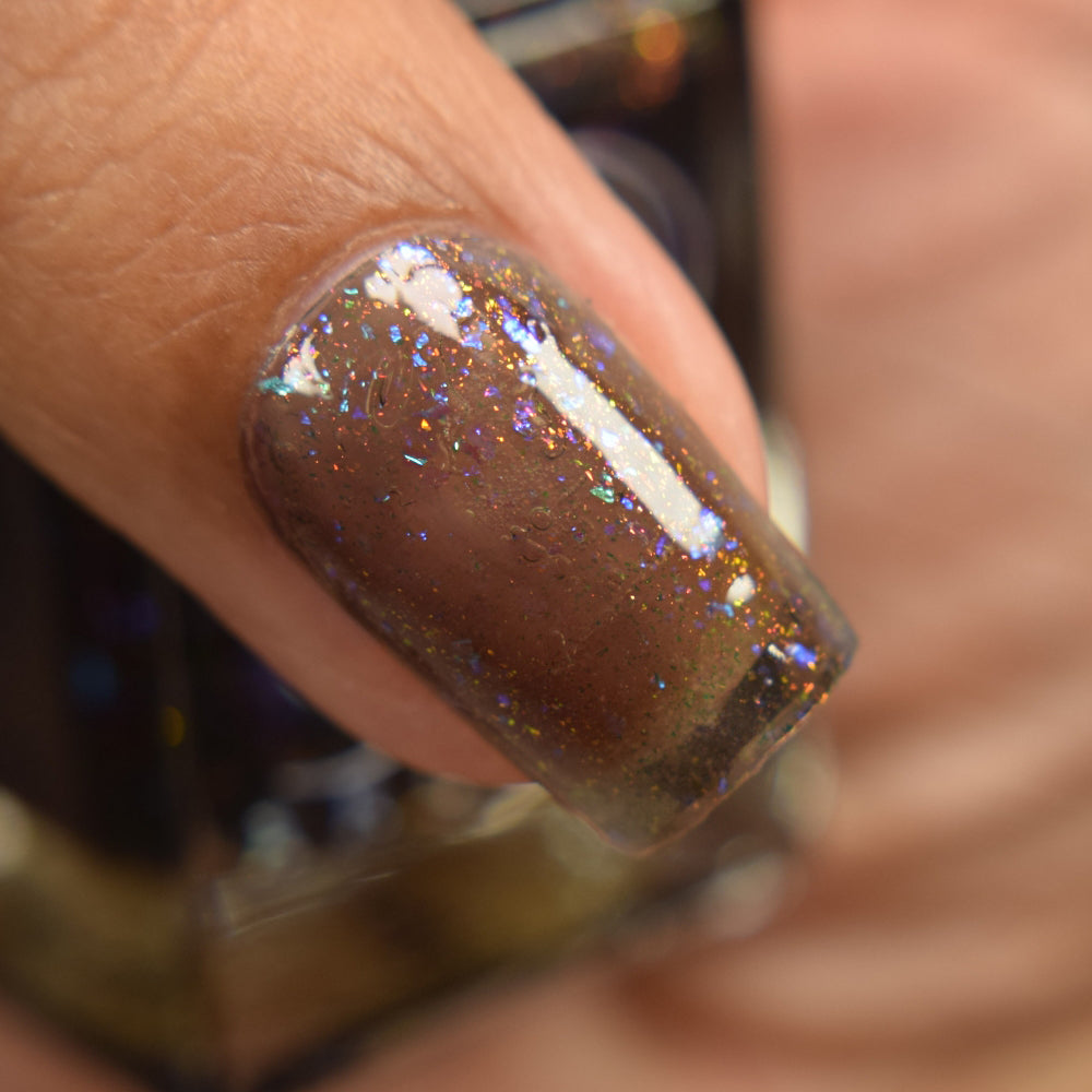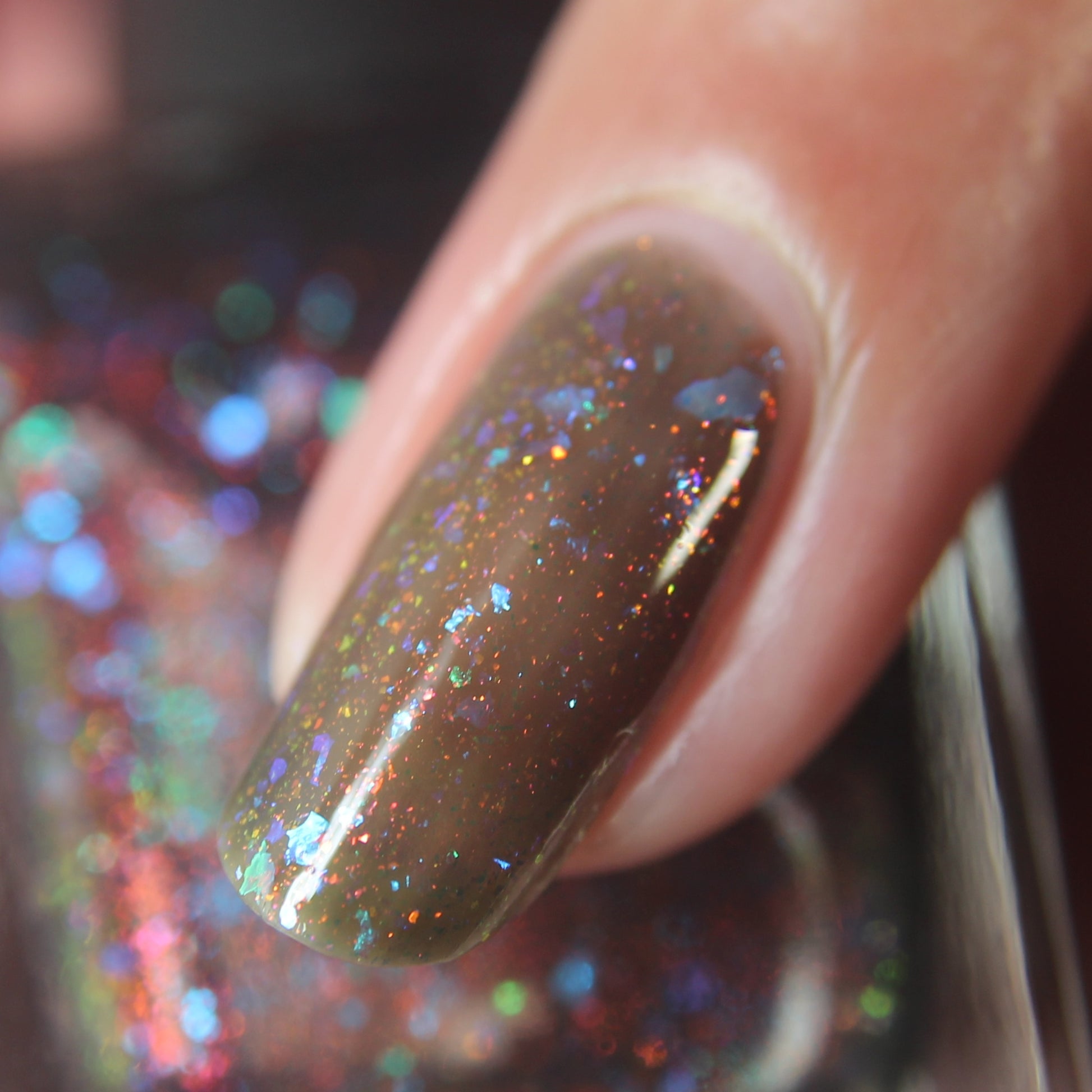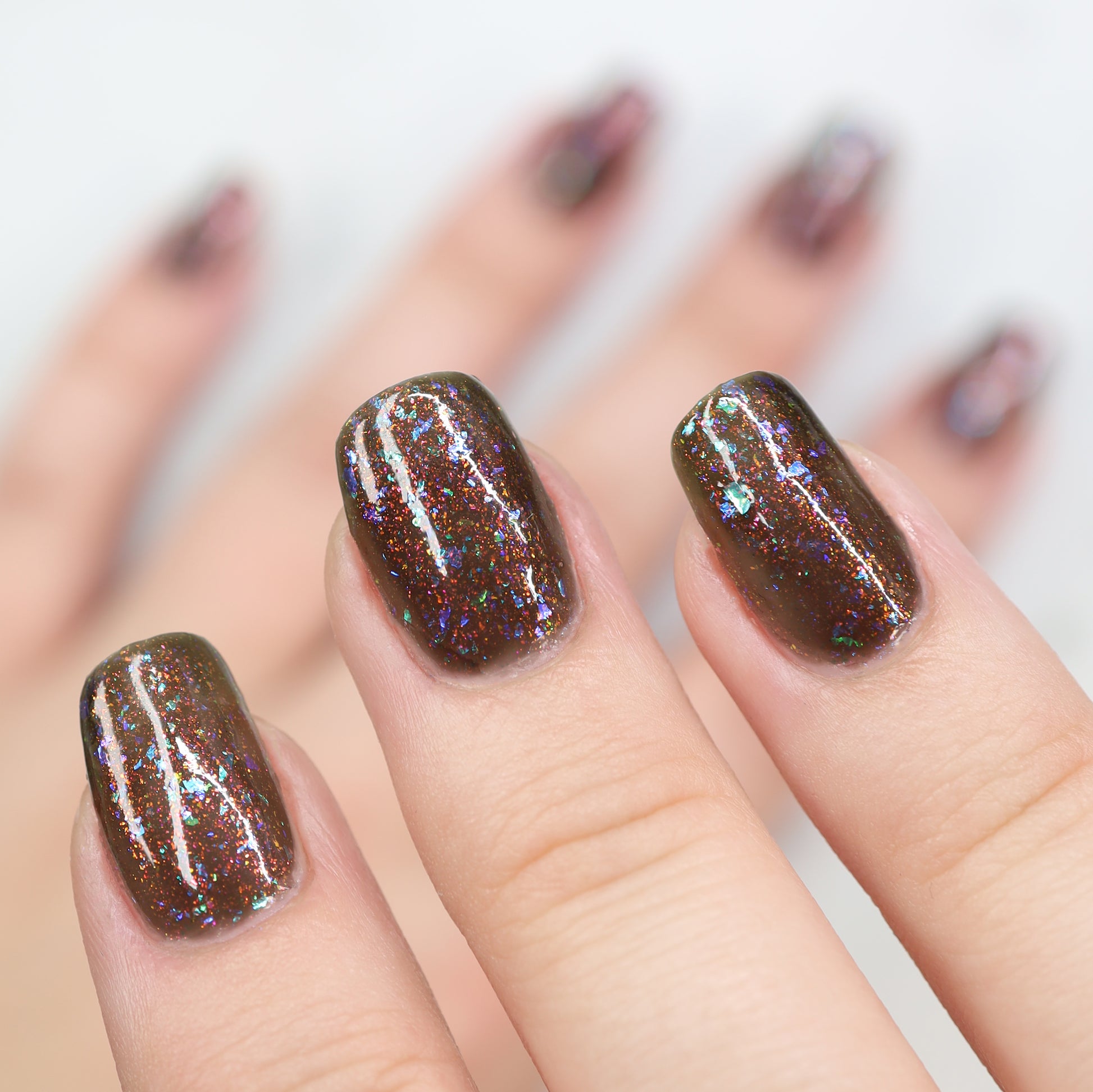 Judgement is a black base with red to yellow shimmer and blue flakes.