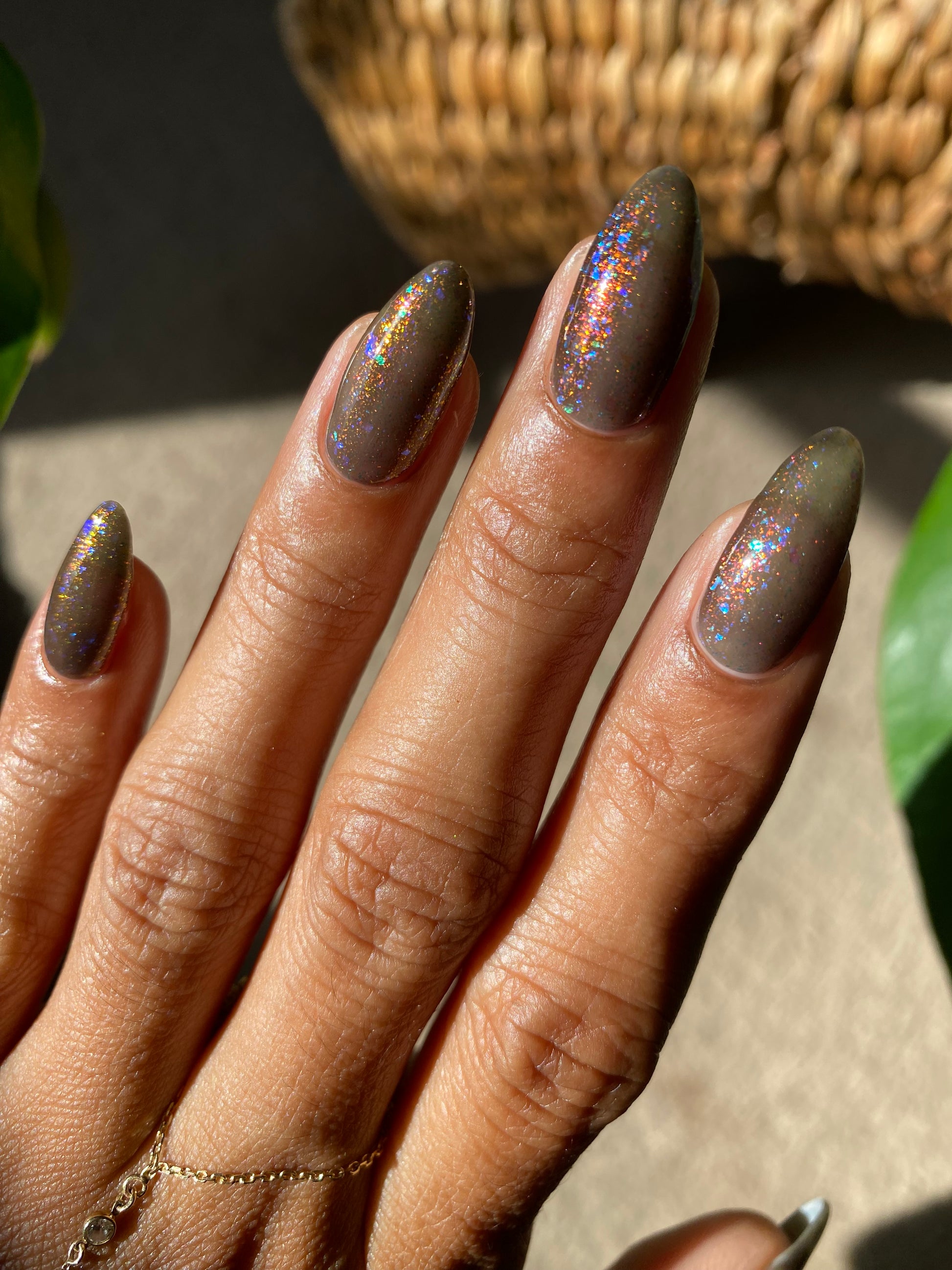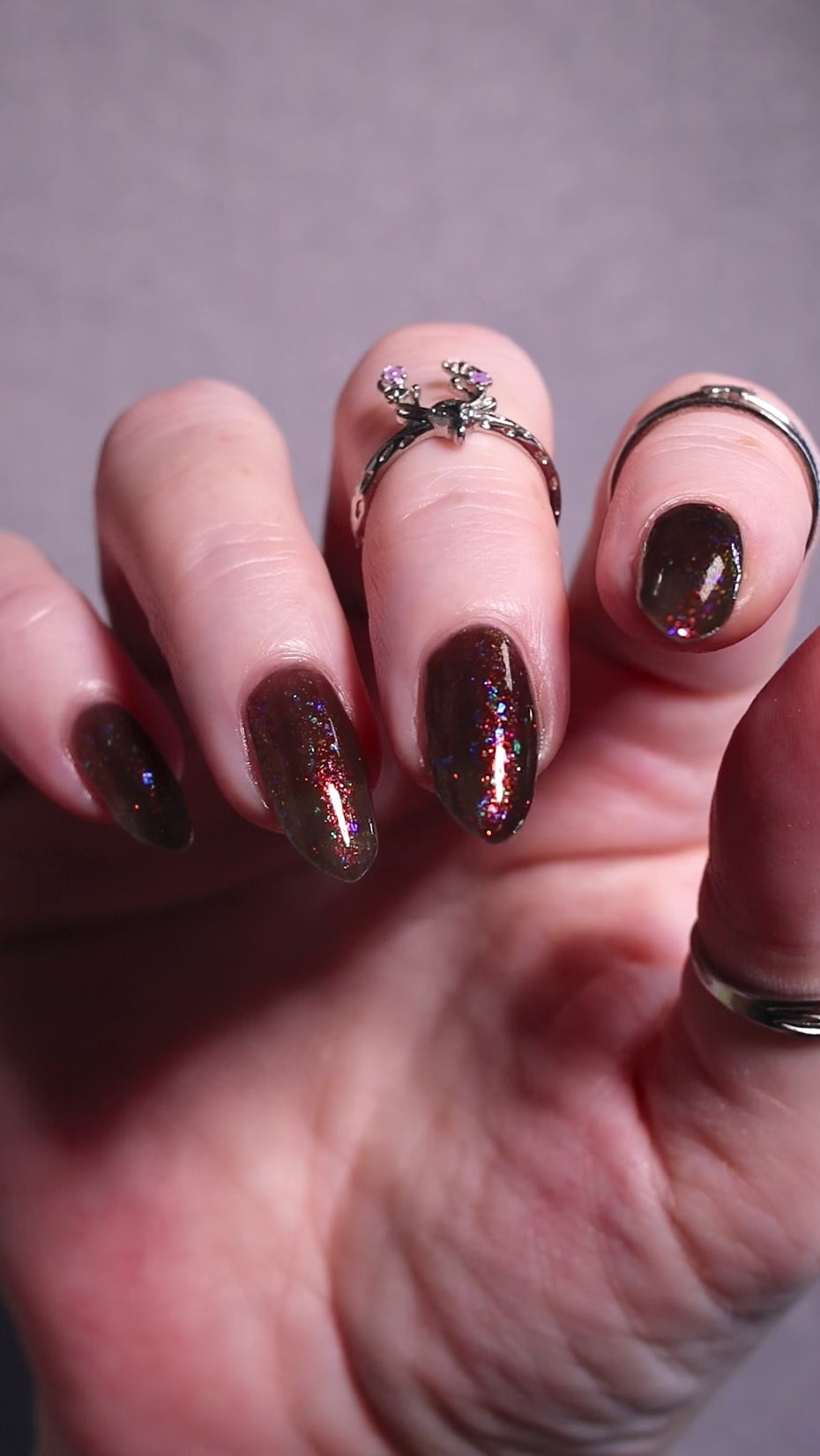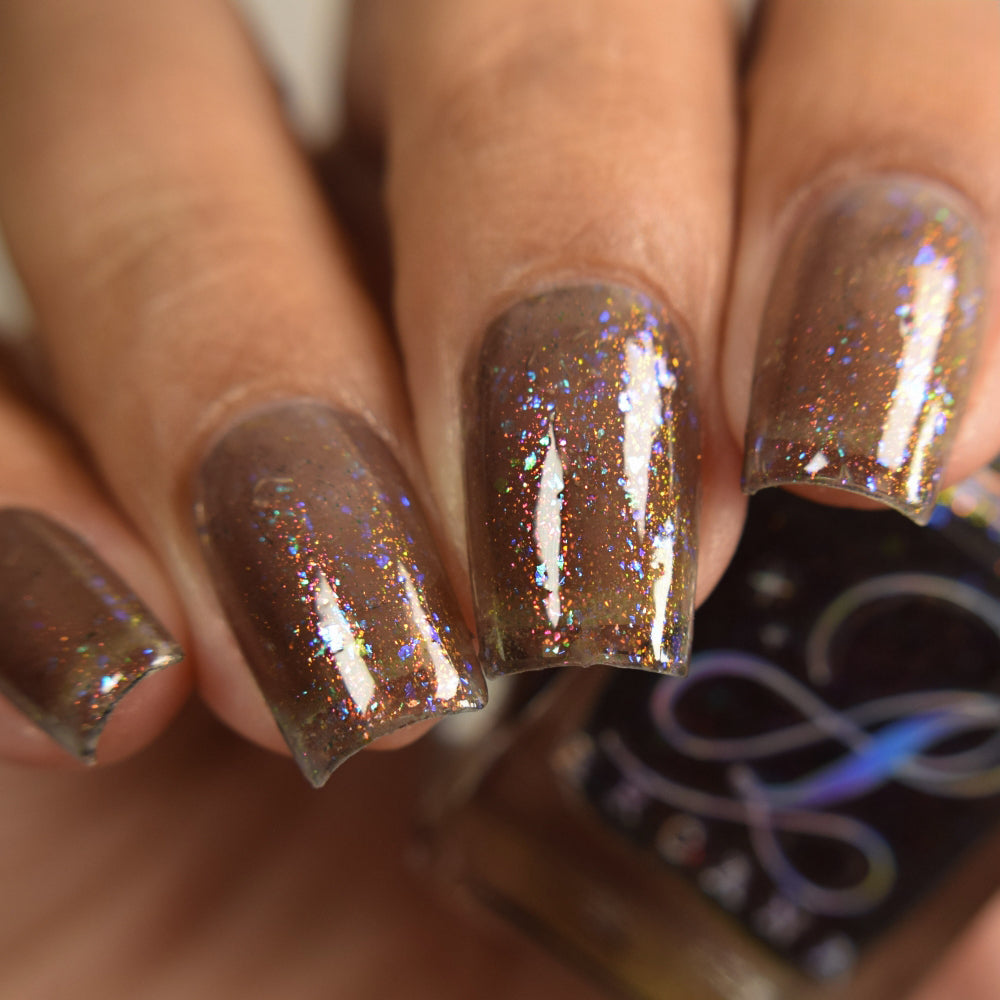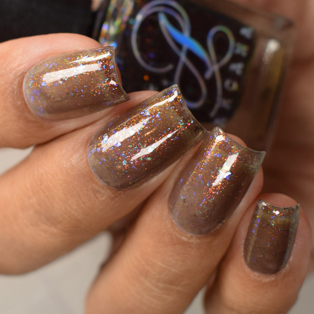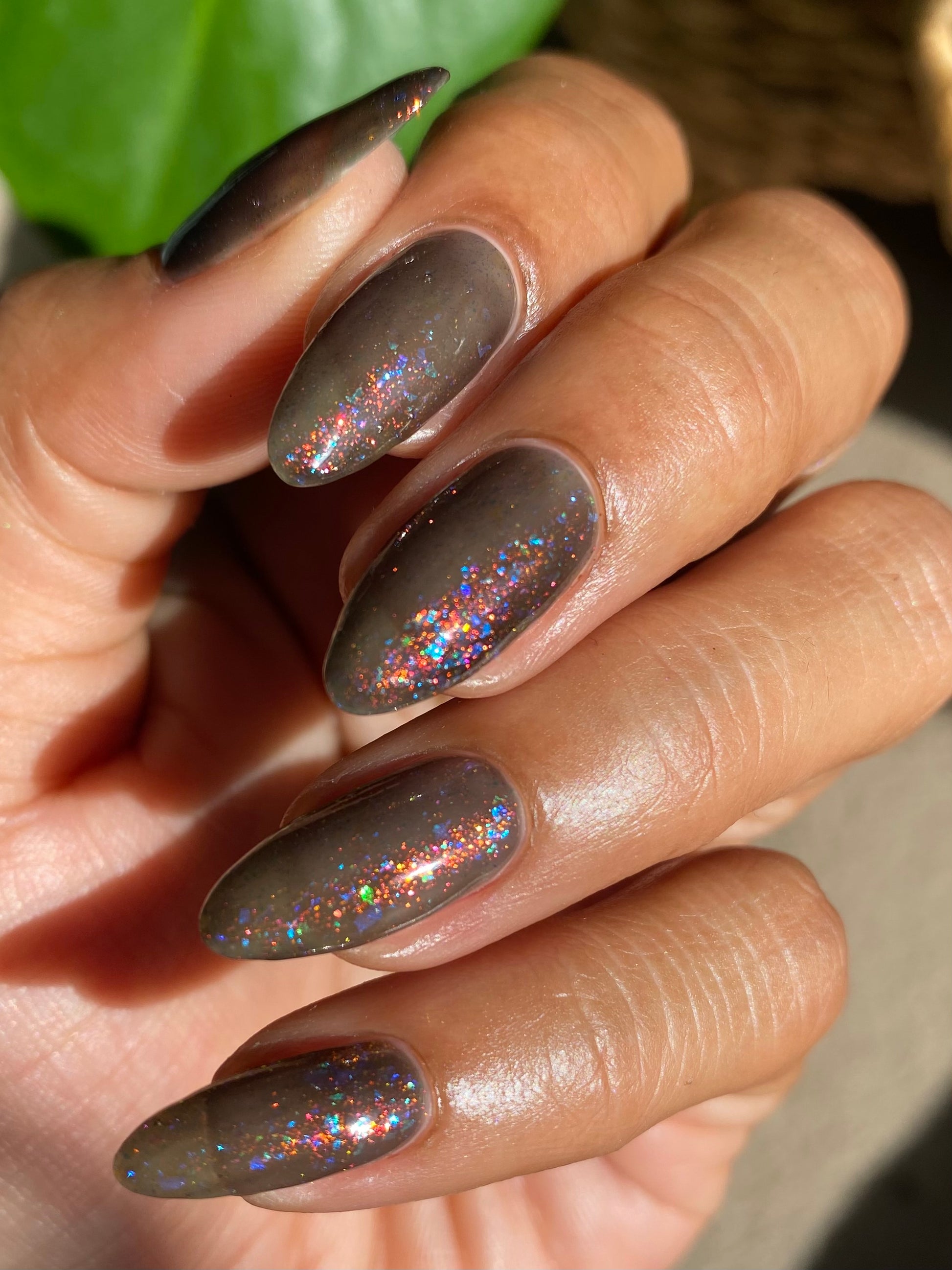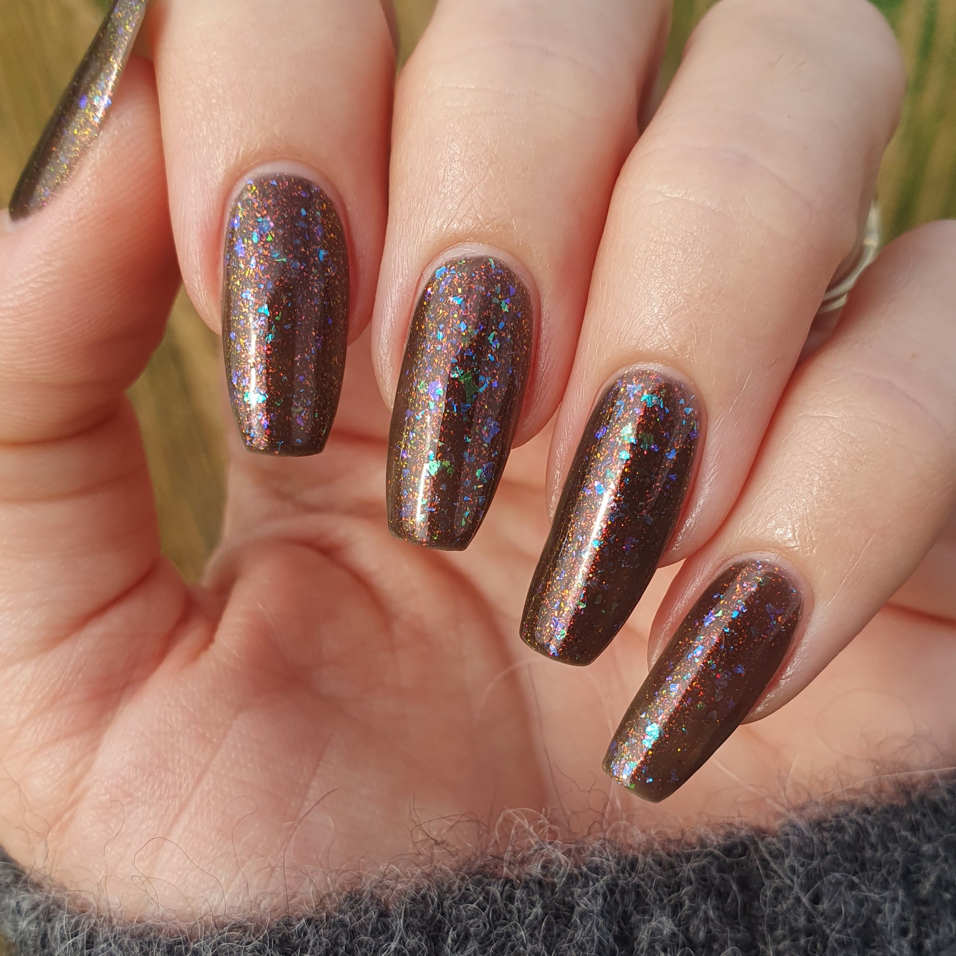 Judgement is a black base with red to yellow shimmer and blue flakes.