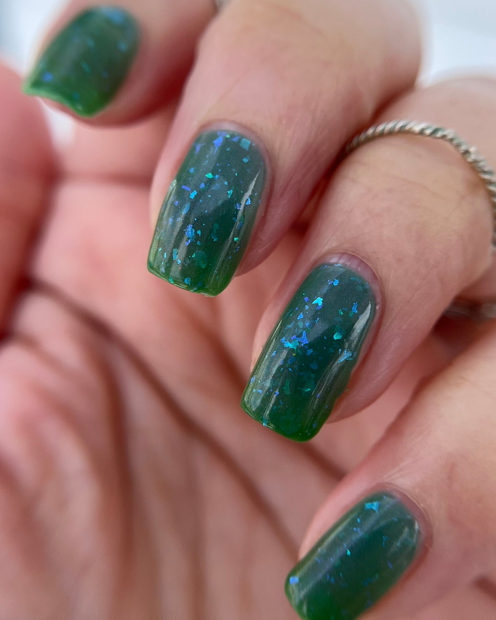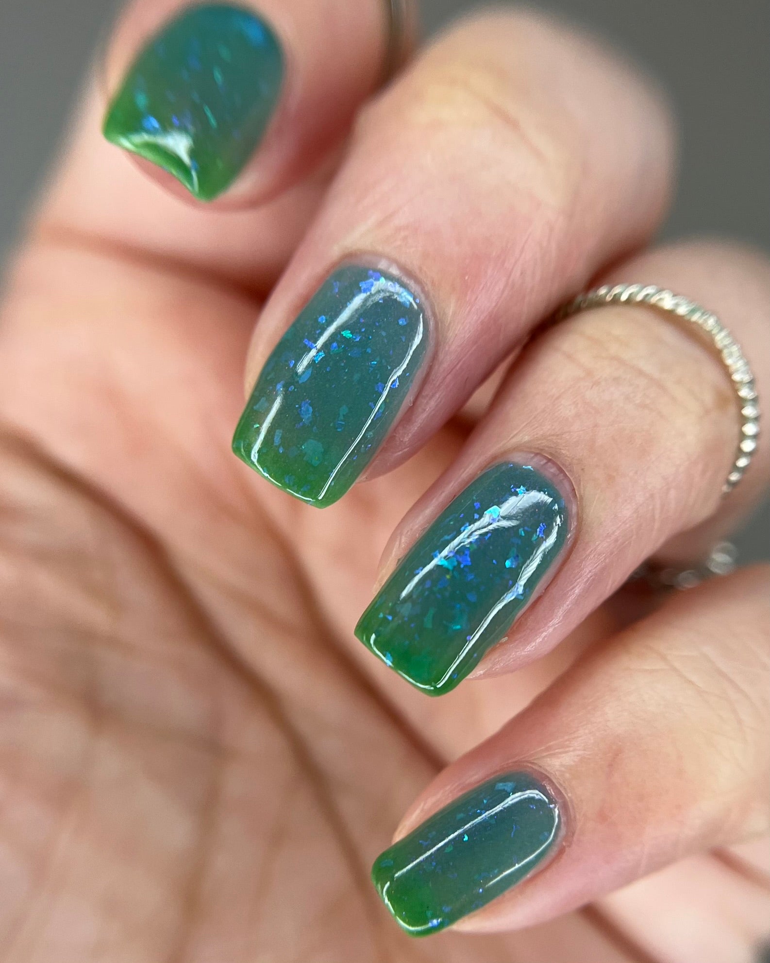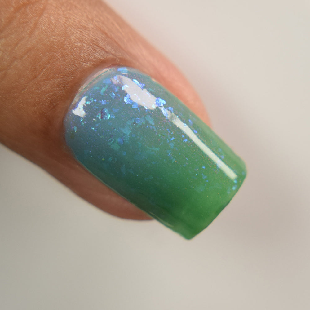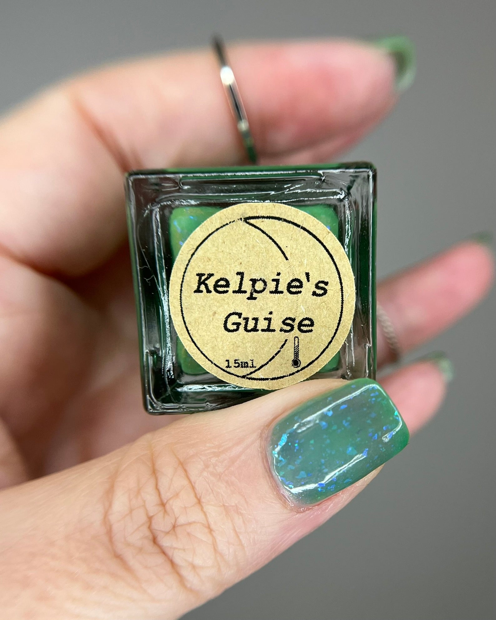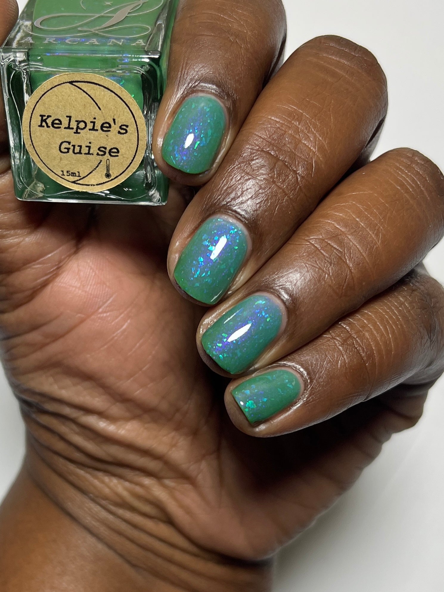 Kelpie's Guise is a thermal polish that goes from blue (warm) to spring green (cold) with purple shimmer and green/blue flakes. The thermal transition on this polish is subtle - giving a lovely blue to green gradient effect!