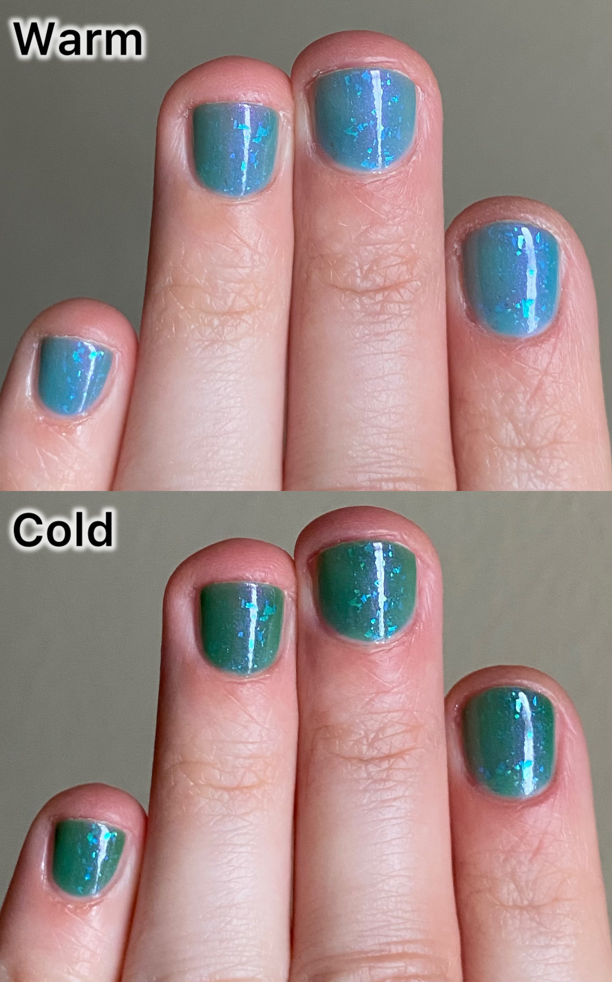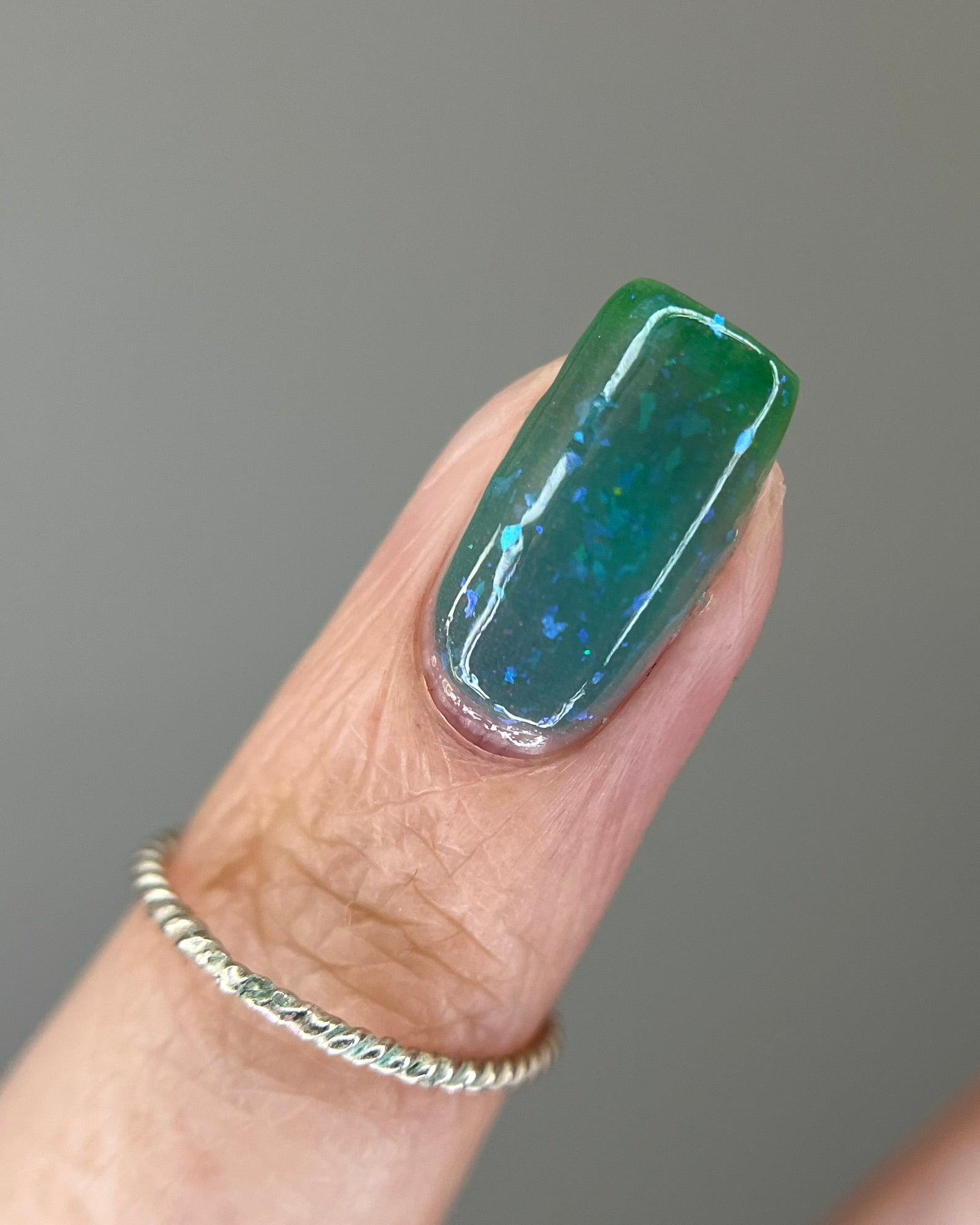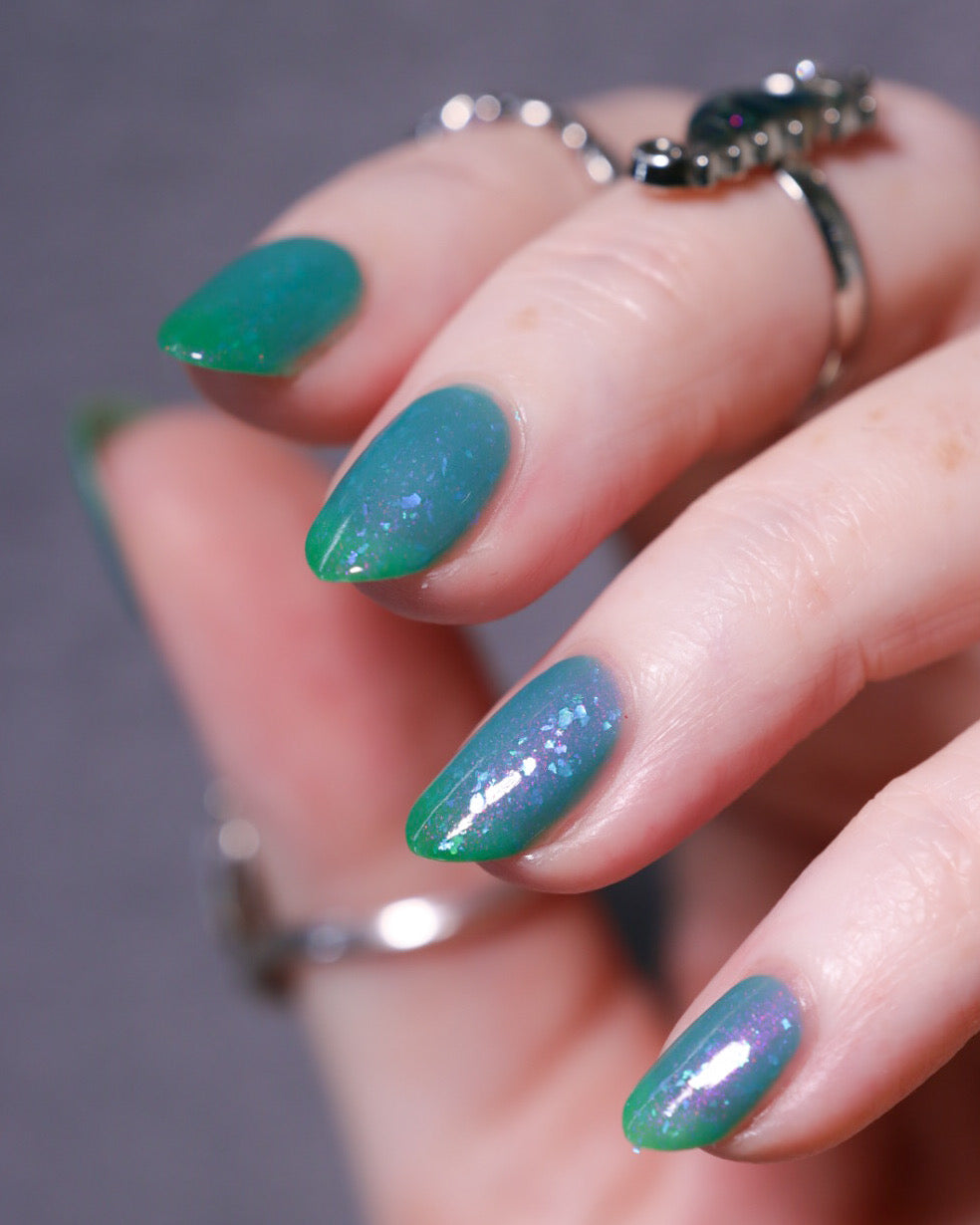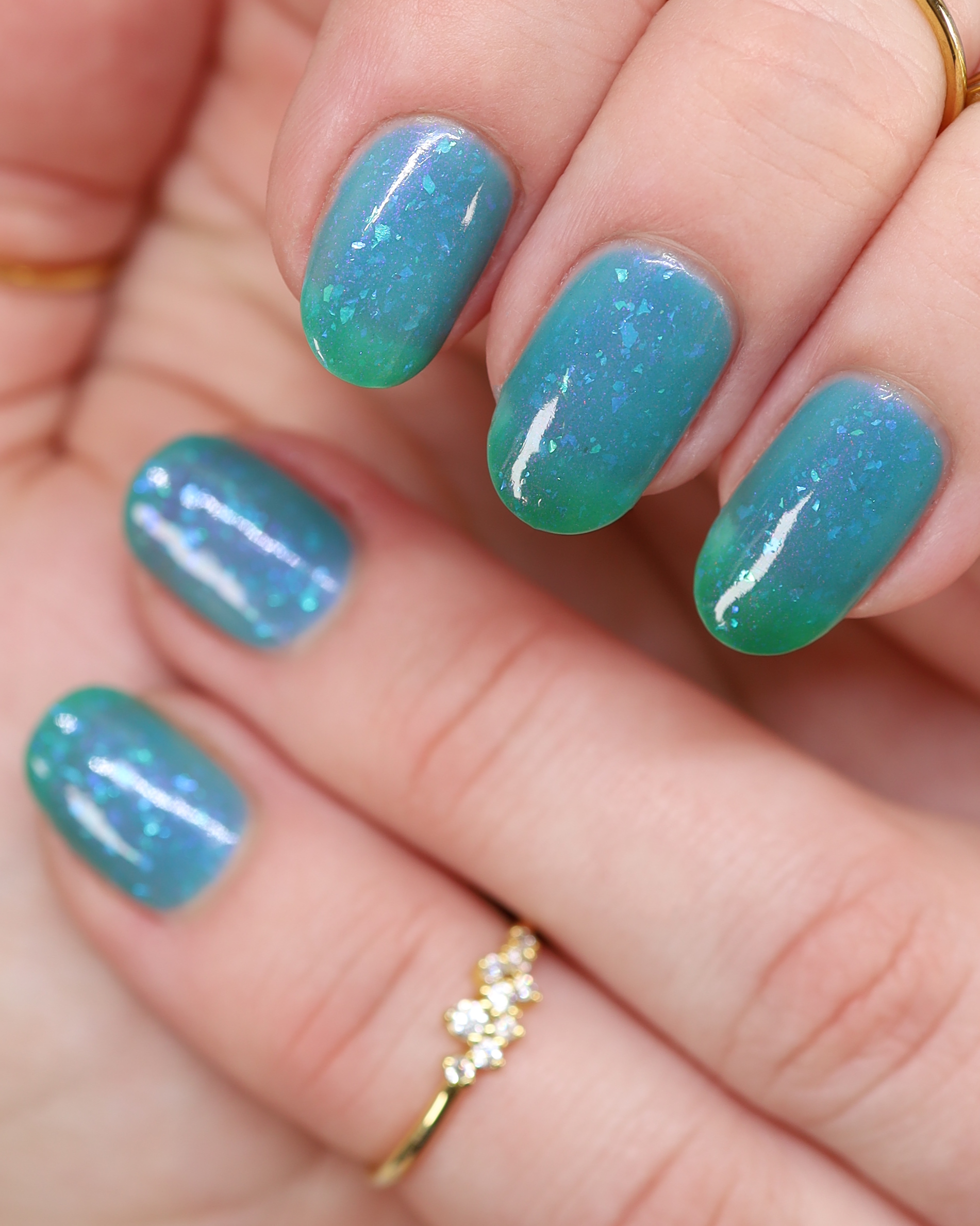 Kelpie's Guise is a thermal polish that goes from blue (warm) to spring green (cold) with purple shimmer and green/blue flakes. The thermal transition on this polish is subtle - giving a lovely blue to green gradient effect!