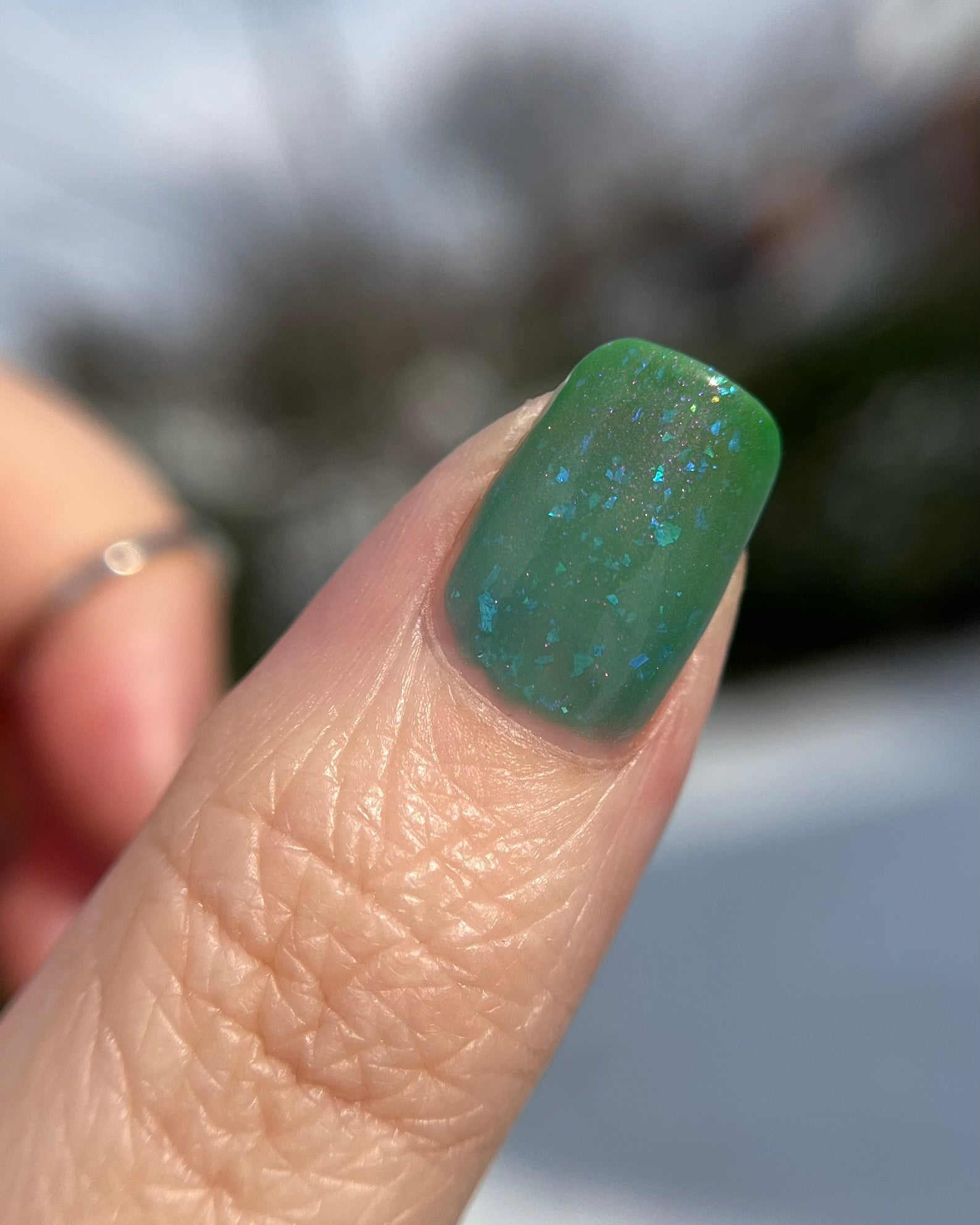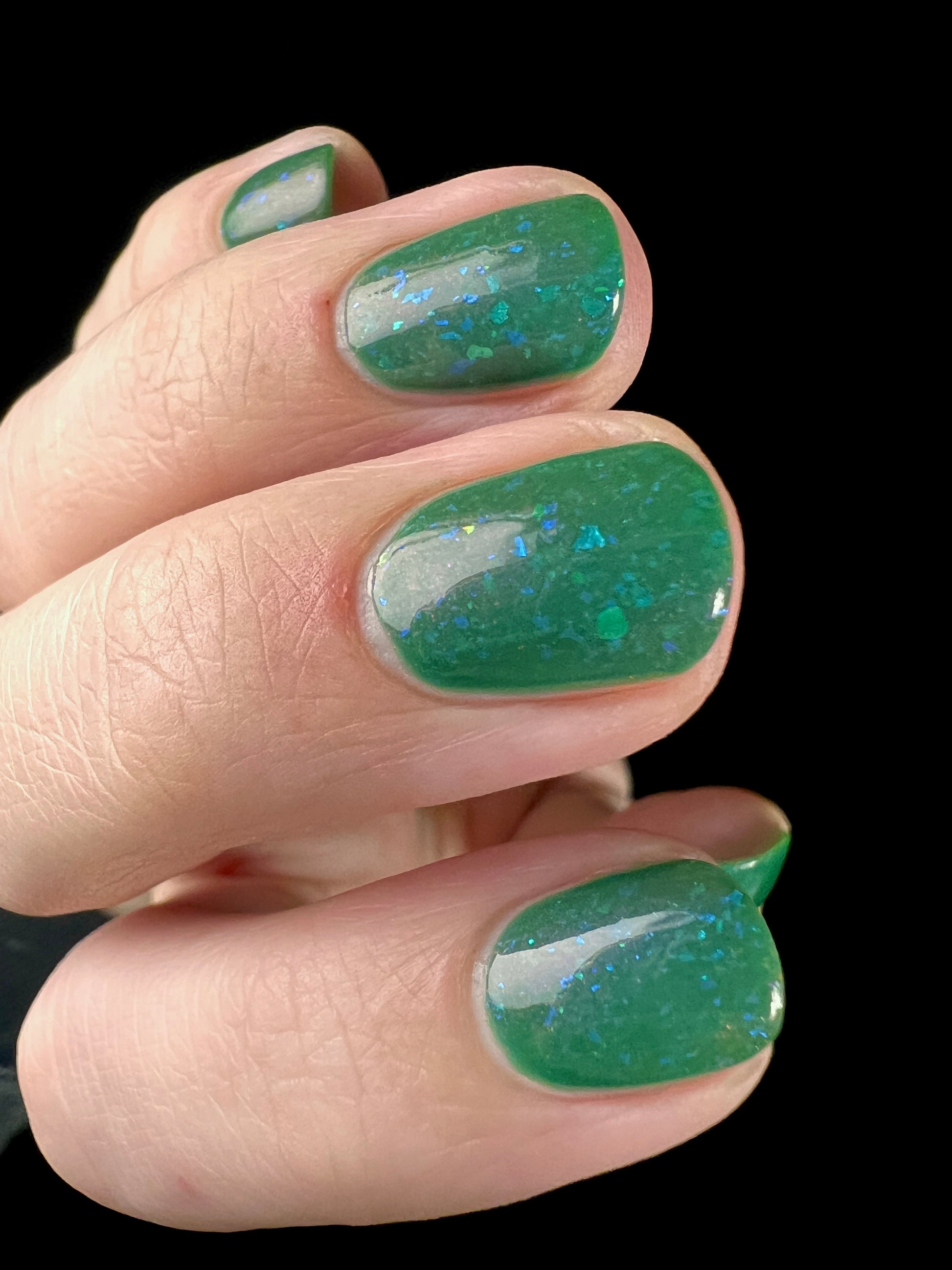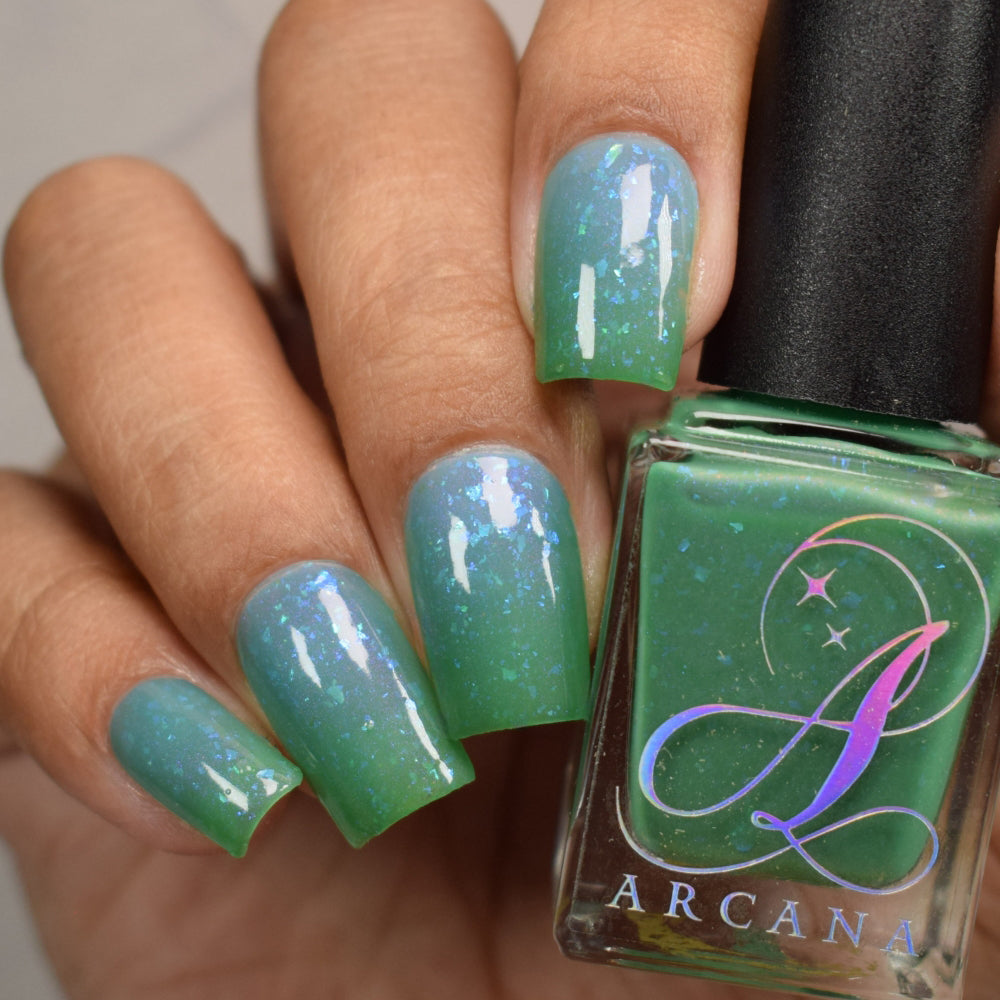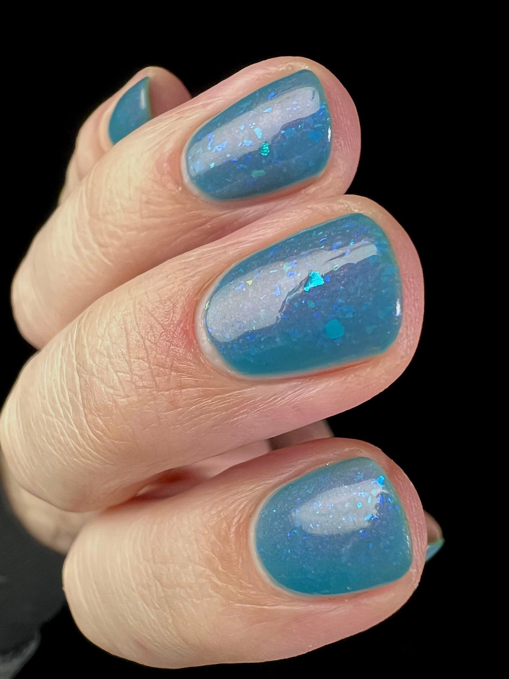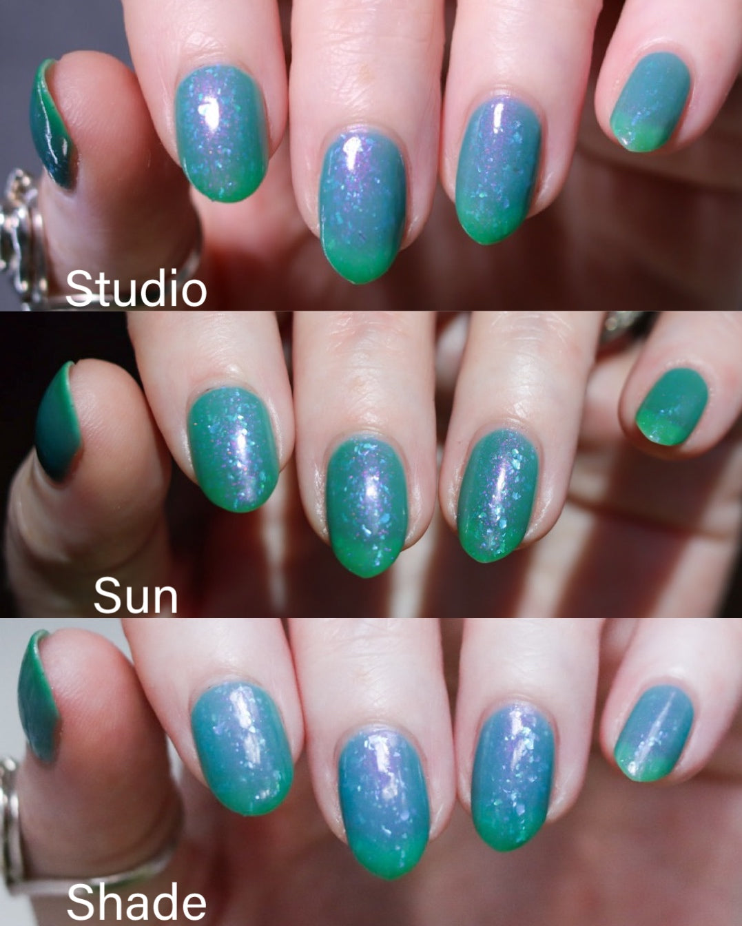 Kelpie's Guise is a thermal polish that goes from blue (warm) to spring green (cold) with purple shimmer and green/blue flakes. The thermal transition on this polish is subtle - giving a lovely blue to green gradient effect!