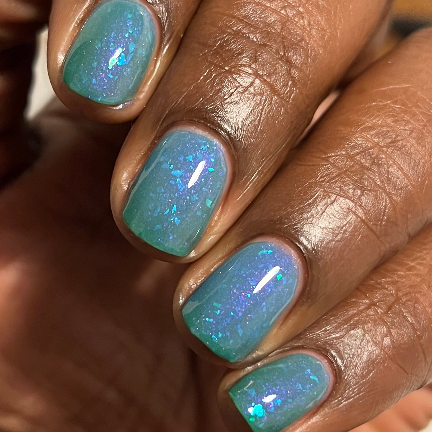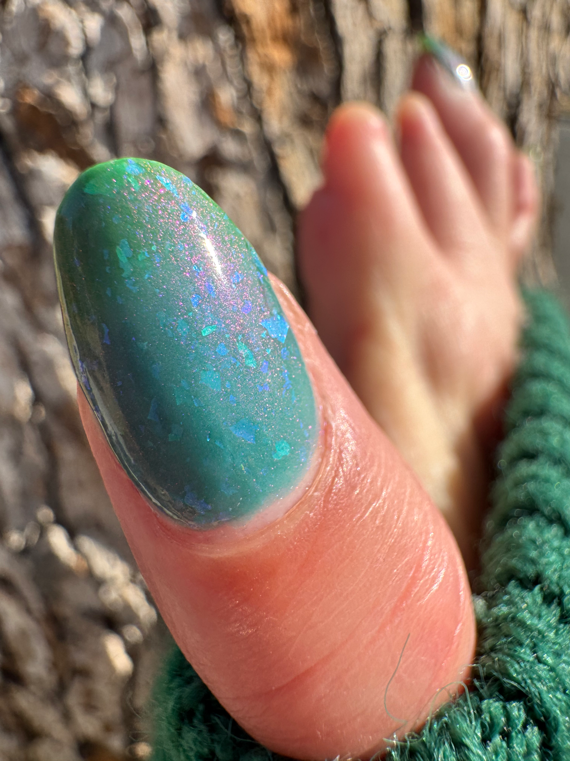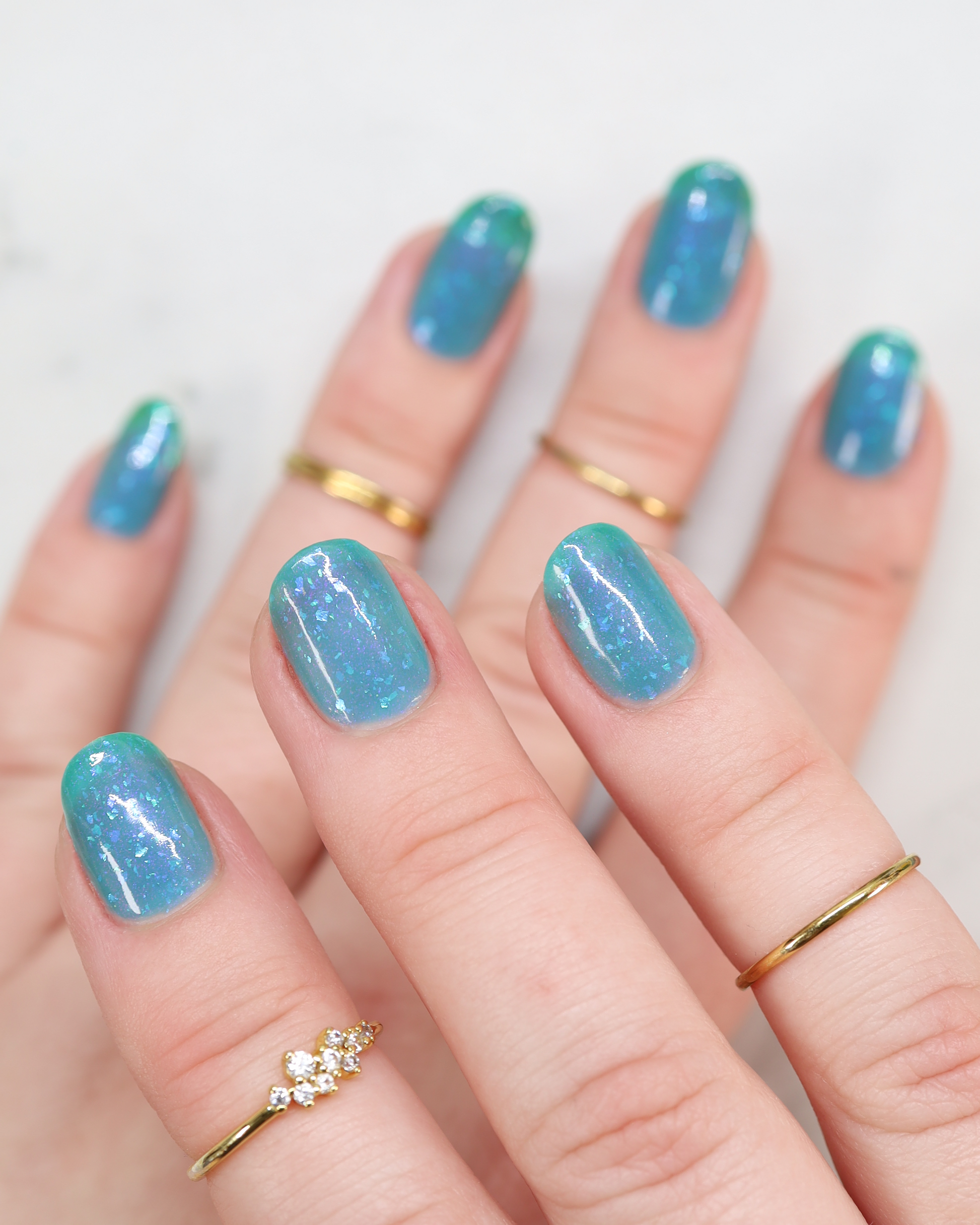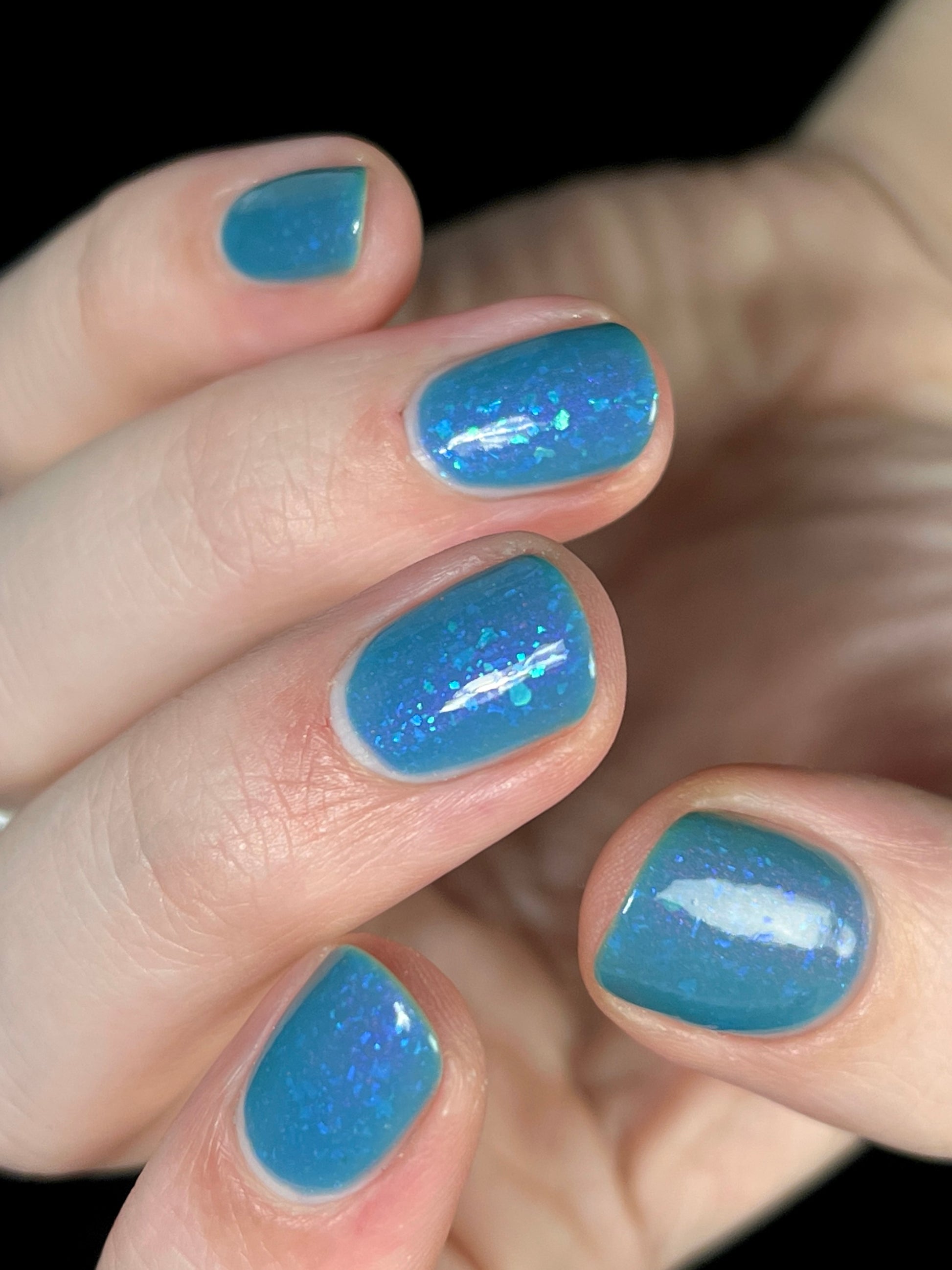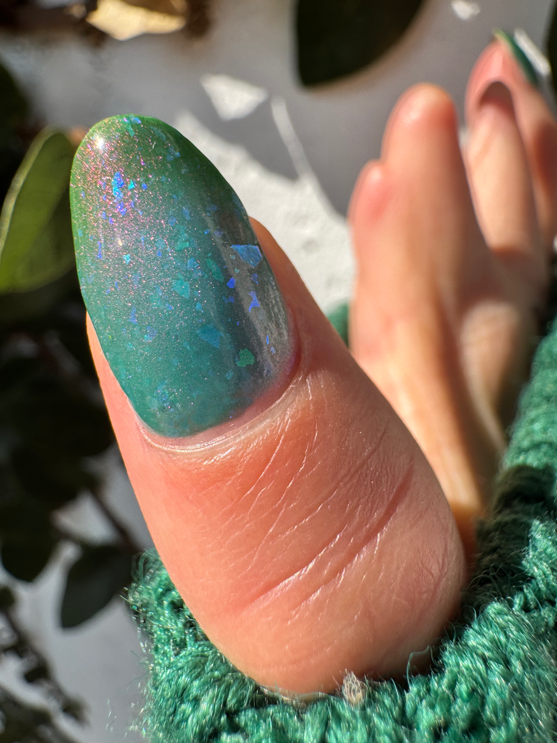 Kelpie's Guise is a thermal polish that goes from blue (warm) to spring green (cold) with purple shimmer and green/blue flakes. The thermal transition on this polish is subtle - giving a lovely blue to green gradient effect!