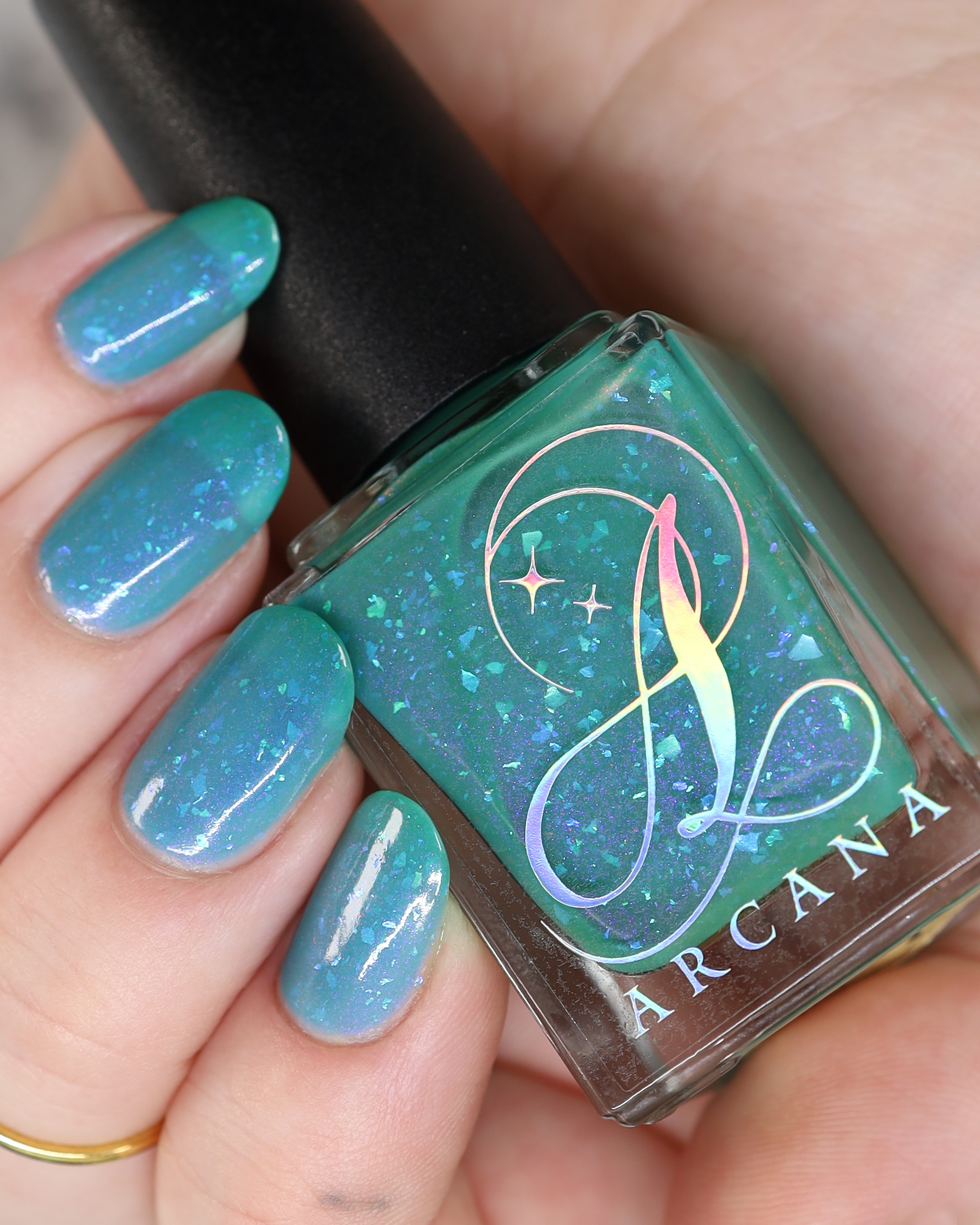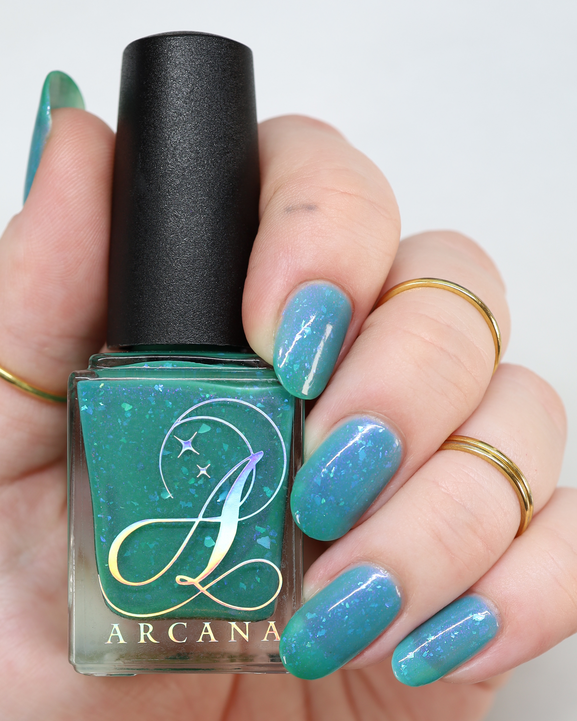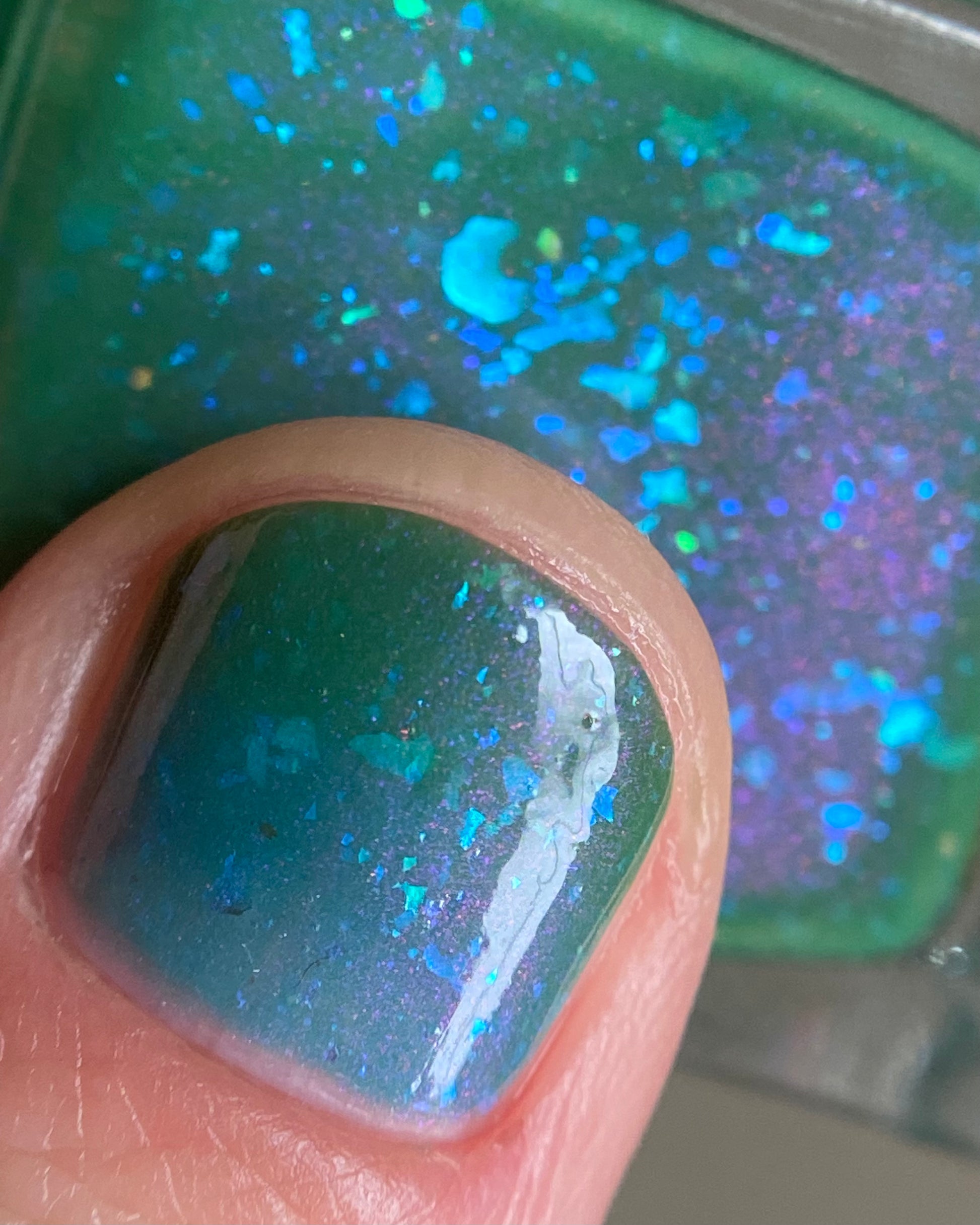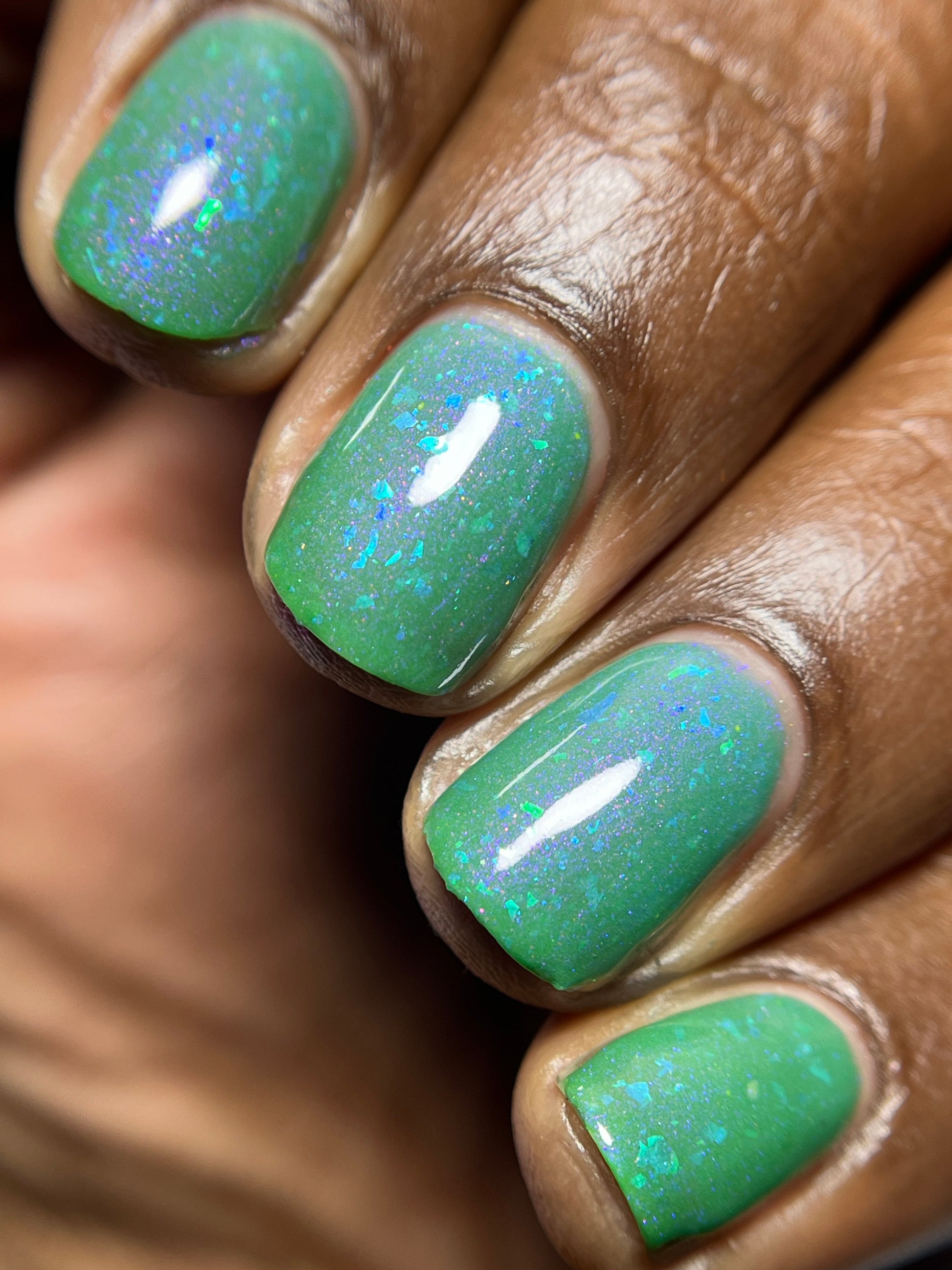 Kelpie's Guise is a thermal polish that goes from blue (warm) to spring green (cold) with purple shimmer and green/blue flakes. The thermal transition on this polish is subtle - giving a lovely blue to green gradient effect!