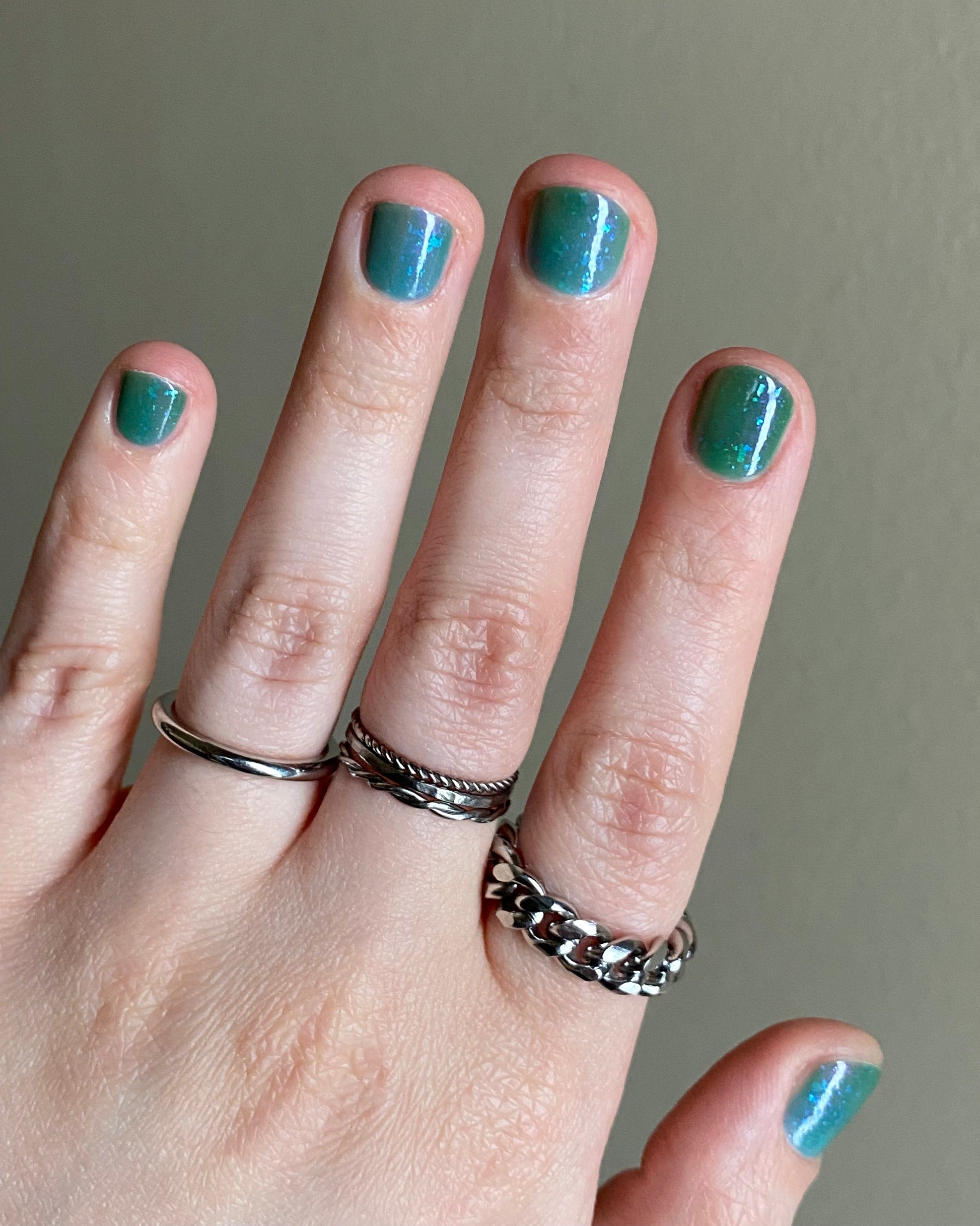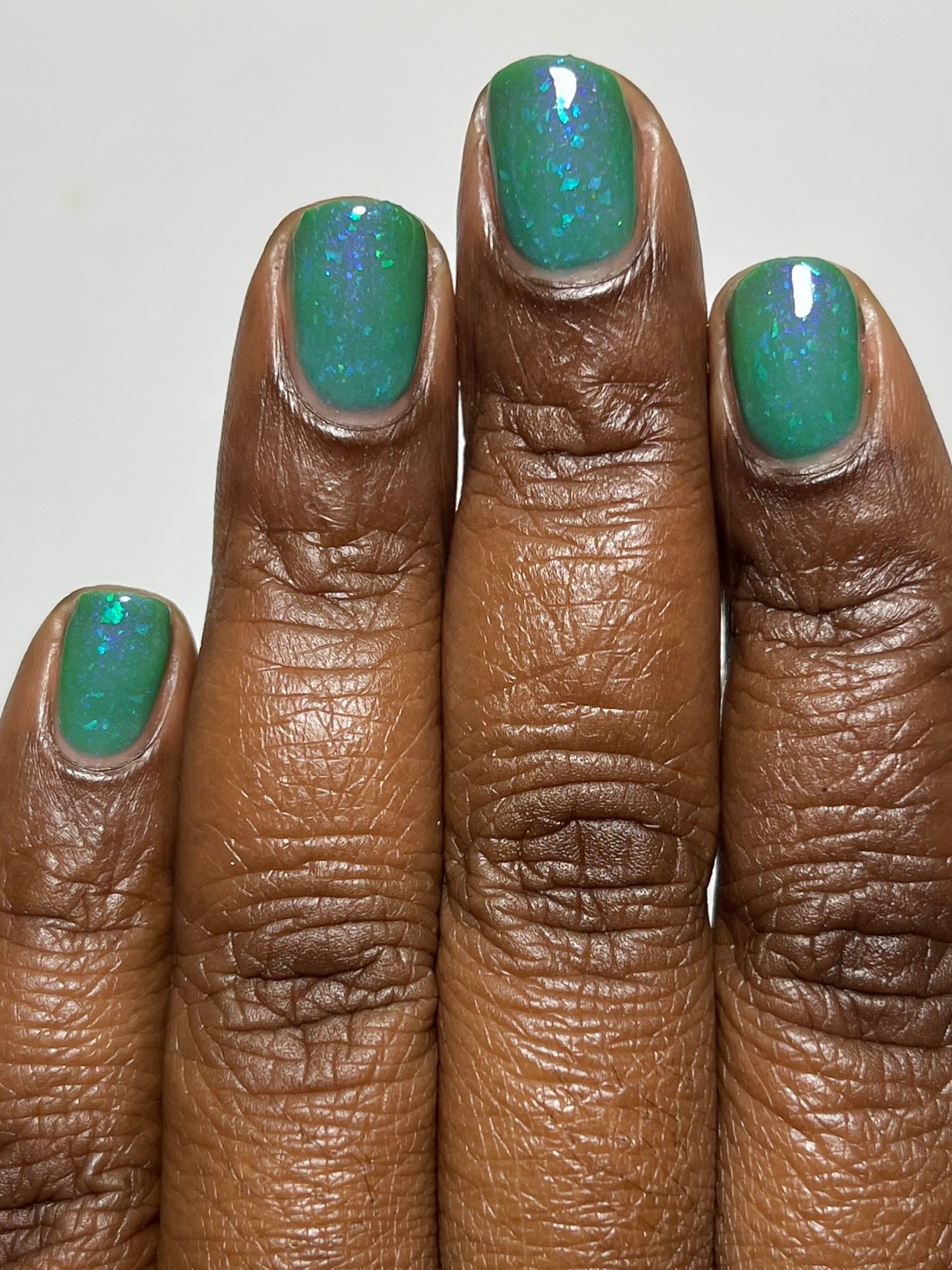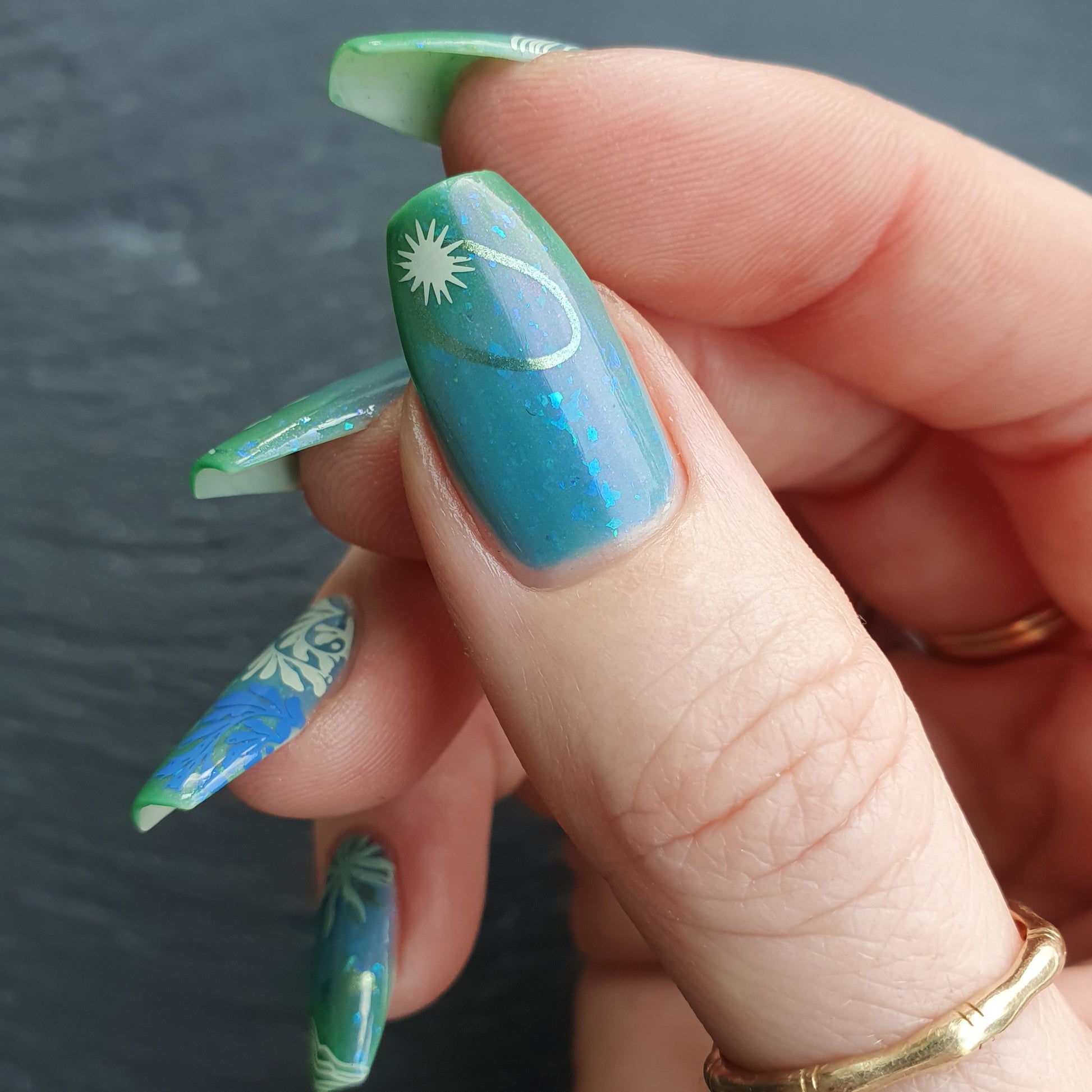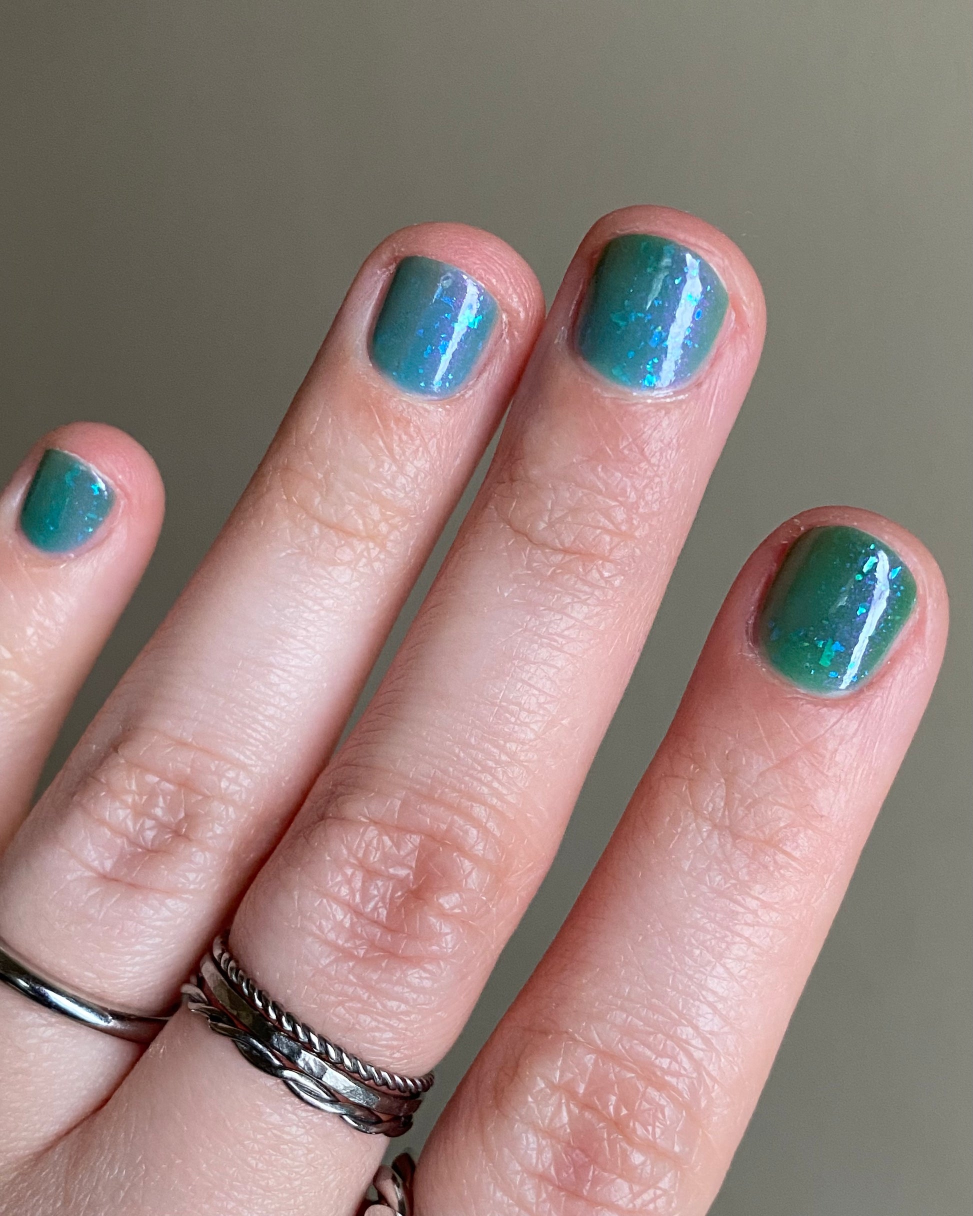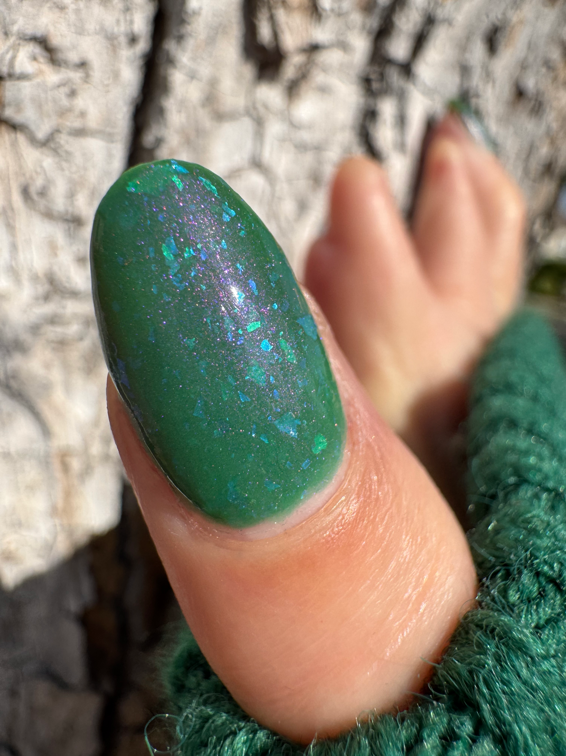 Kelpie's Guise is a thermal polish that goes from blue (warm) to spring green (cold) with purple shimmer and green/blue flakes. The thermal transition on this polish is subtle - giving a lovely blue to green gradient effect!