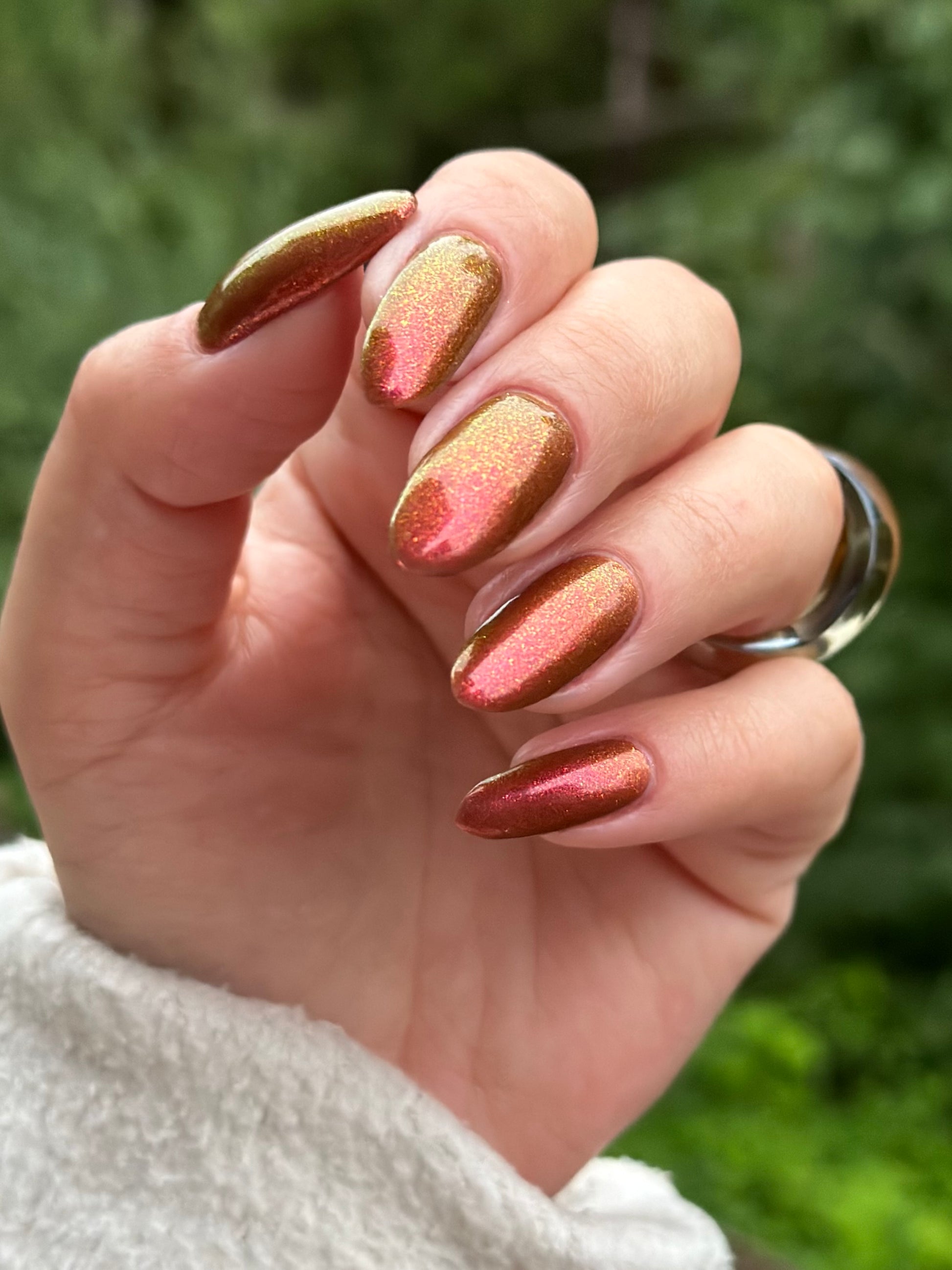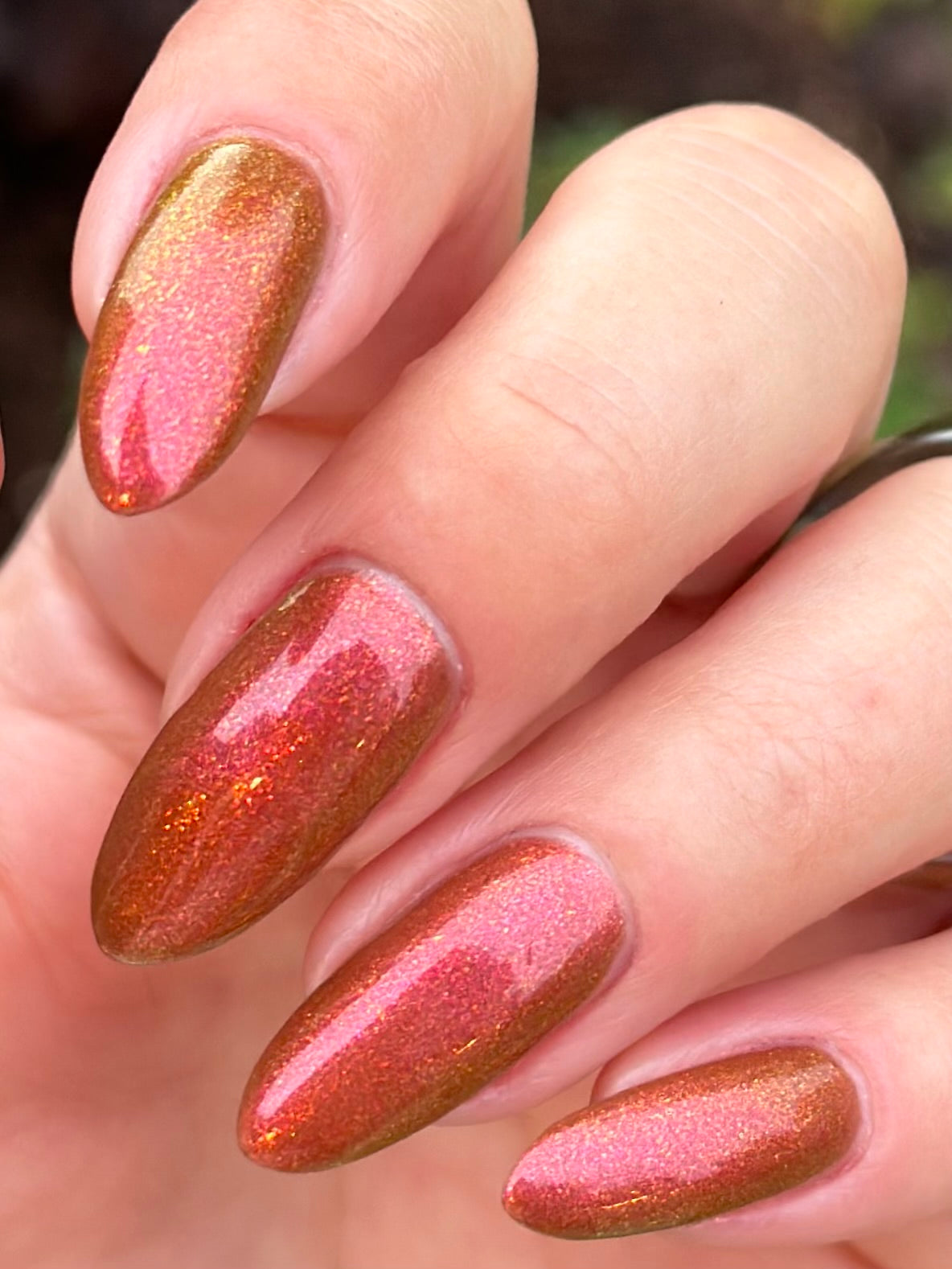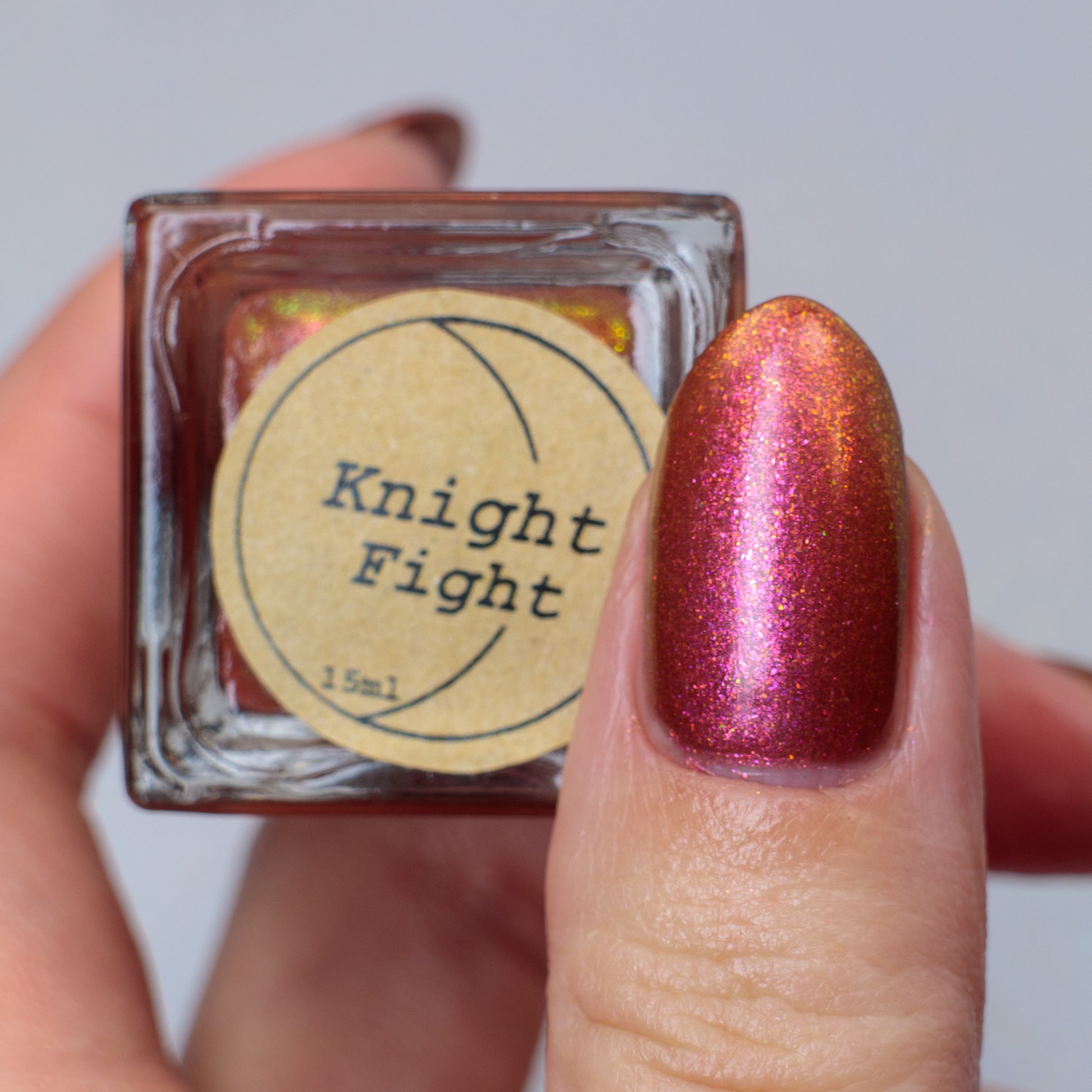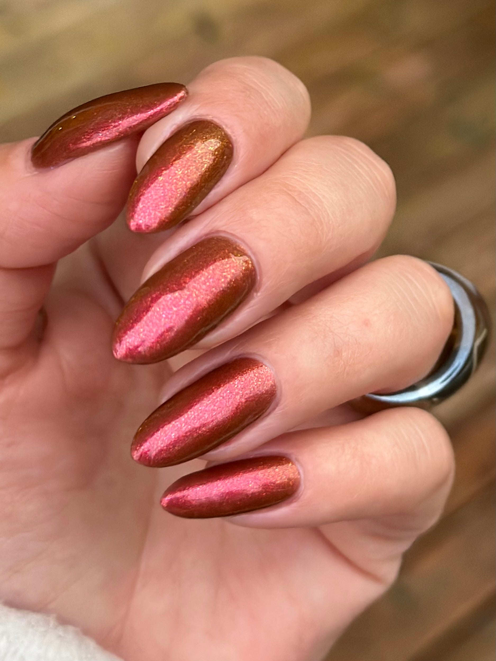 Knight Fight has a sheer brown base with pink-orange-yellow large particle shimmer.
