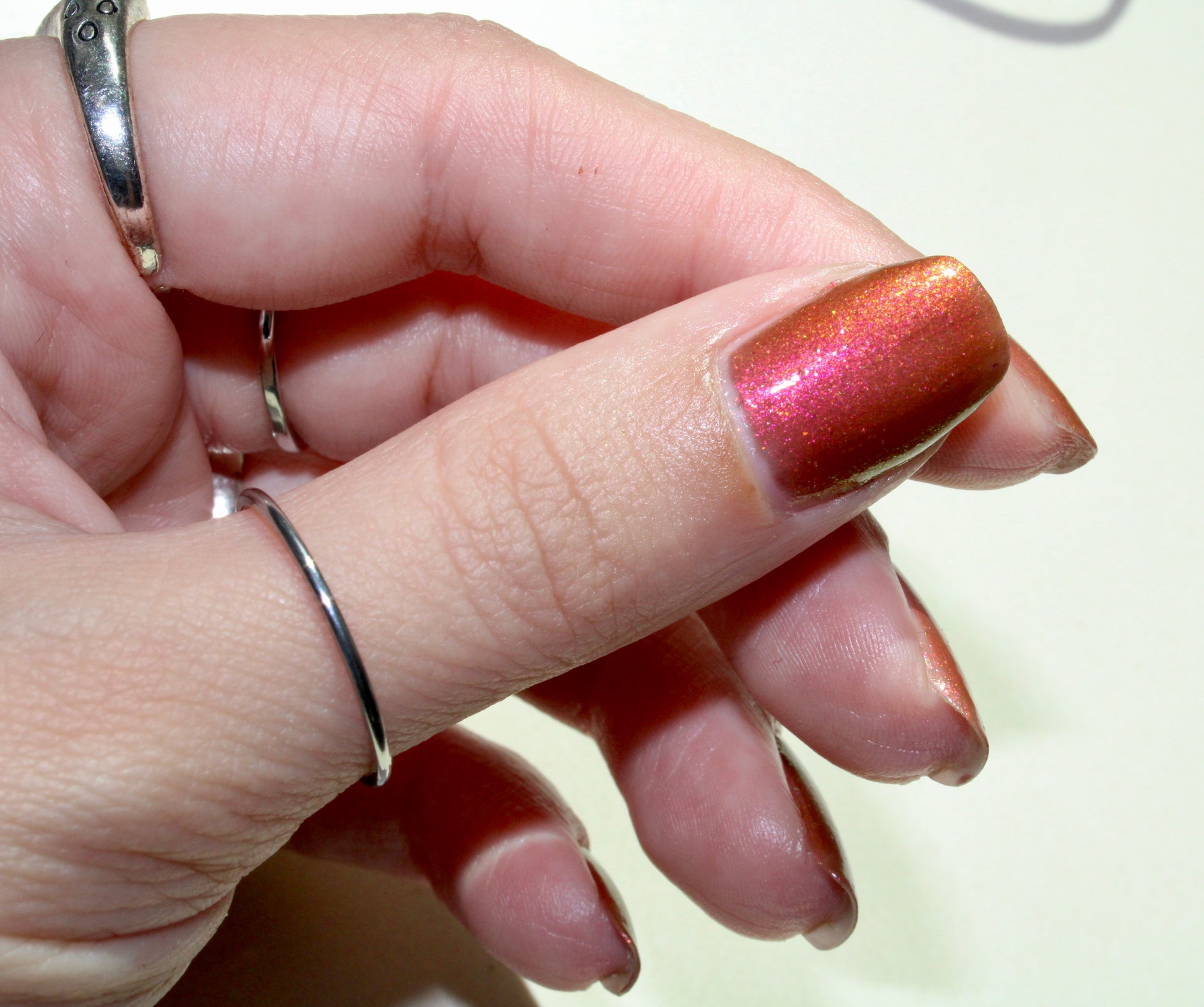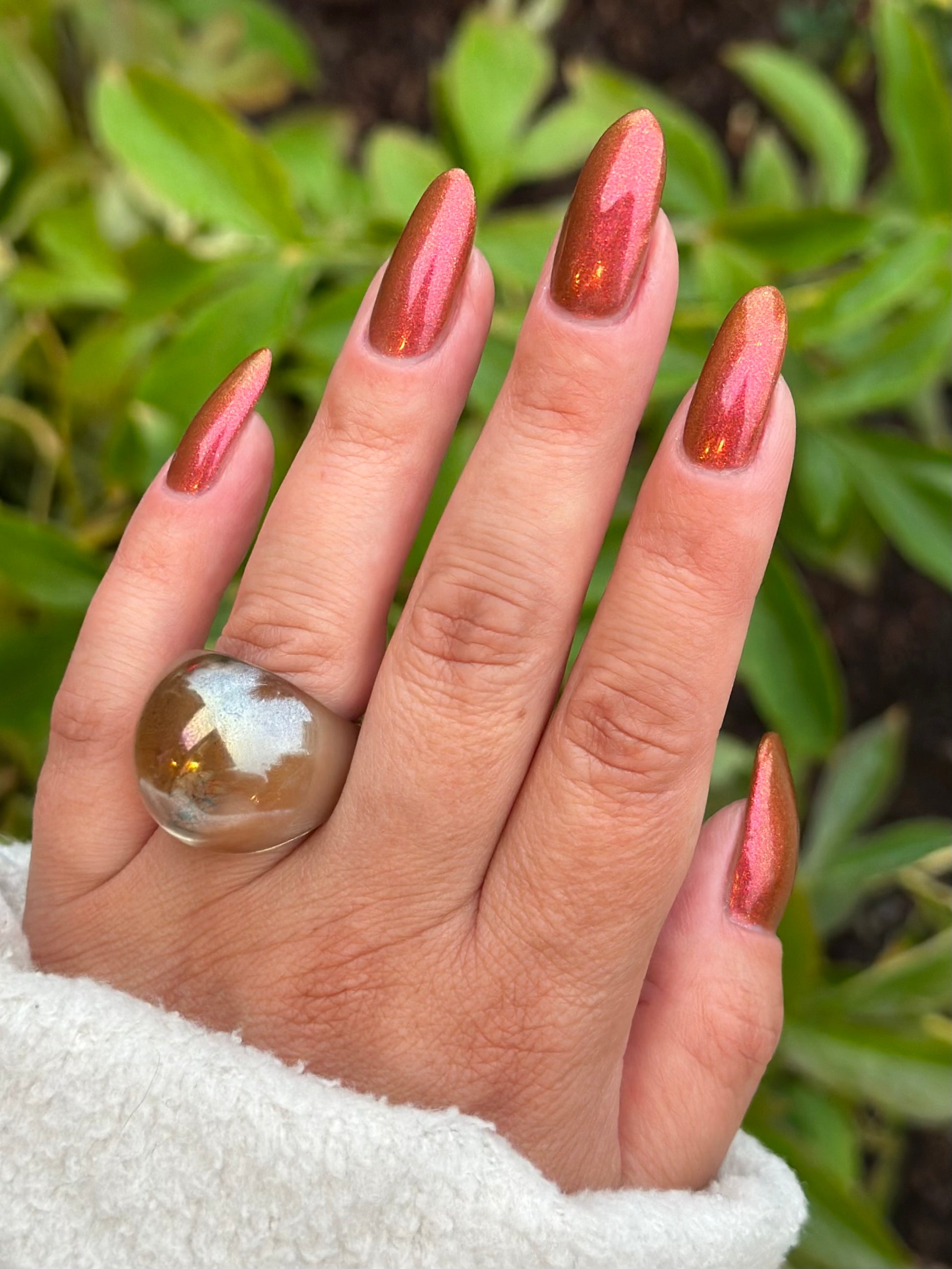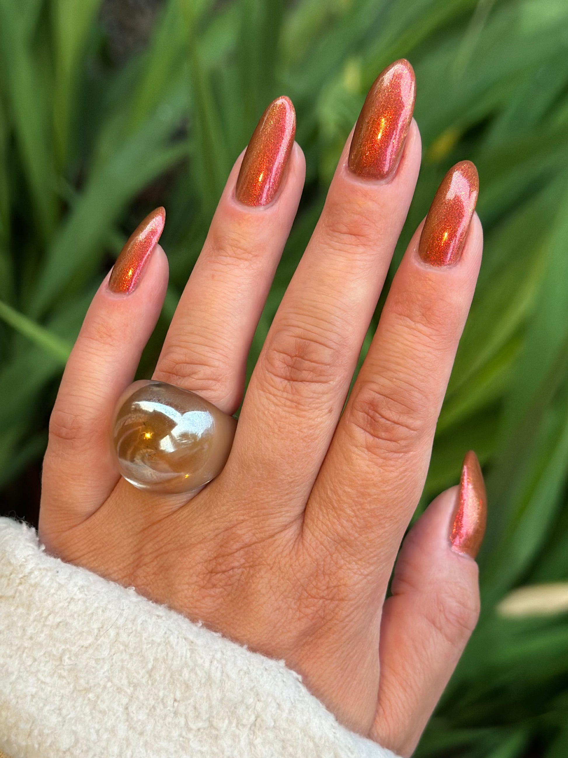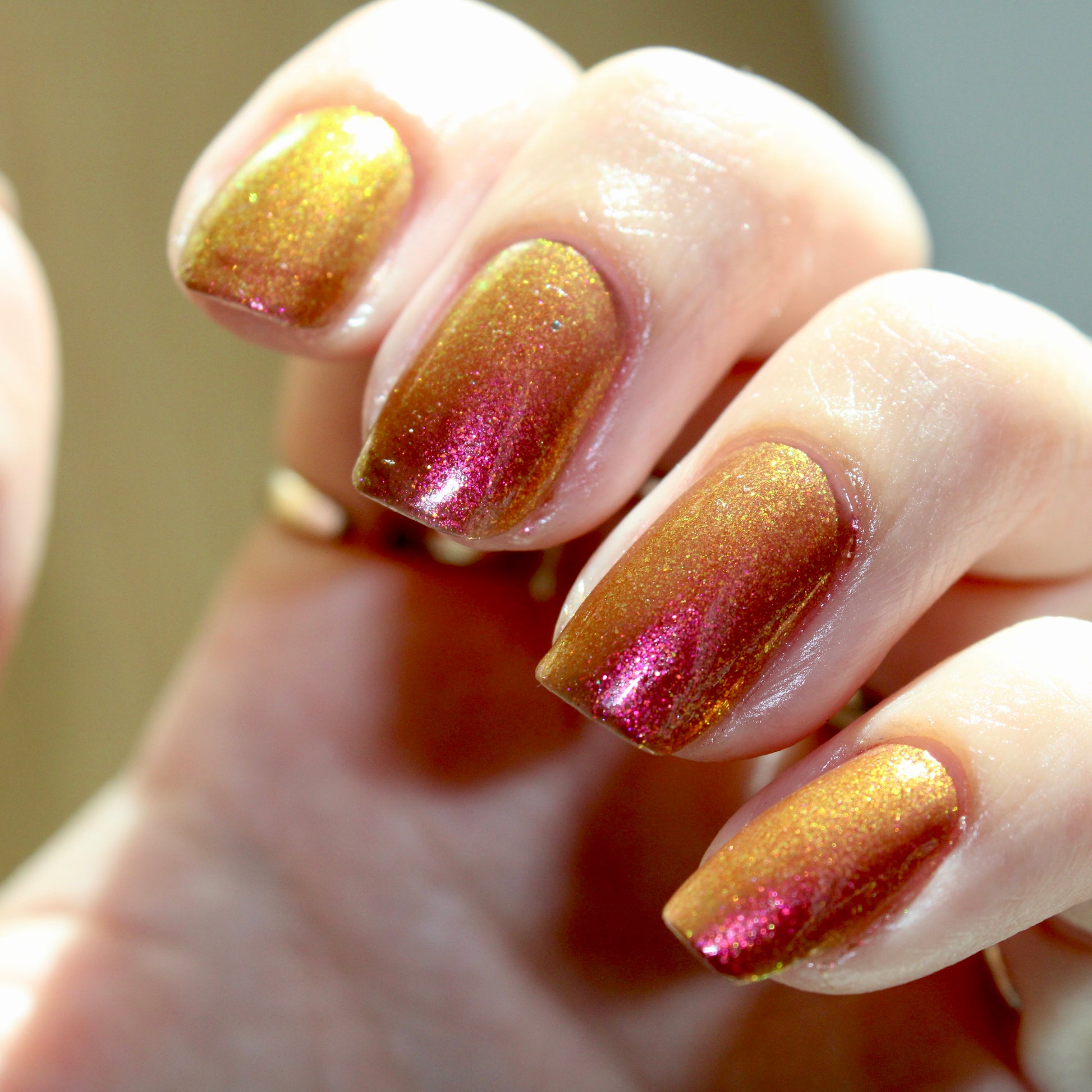 Knight Fight has a sheer brown base with pink-orange-yellow large particle shimmer.