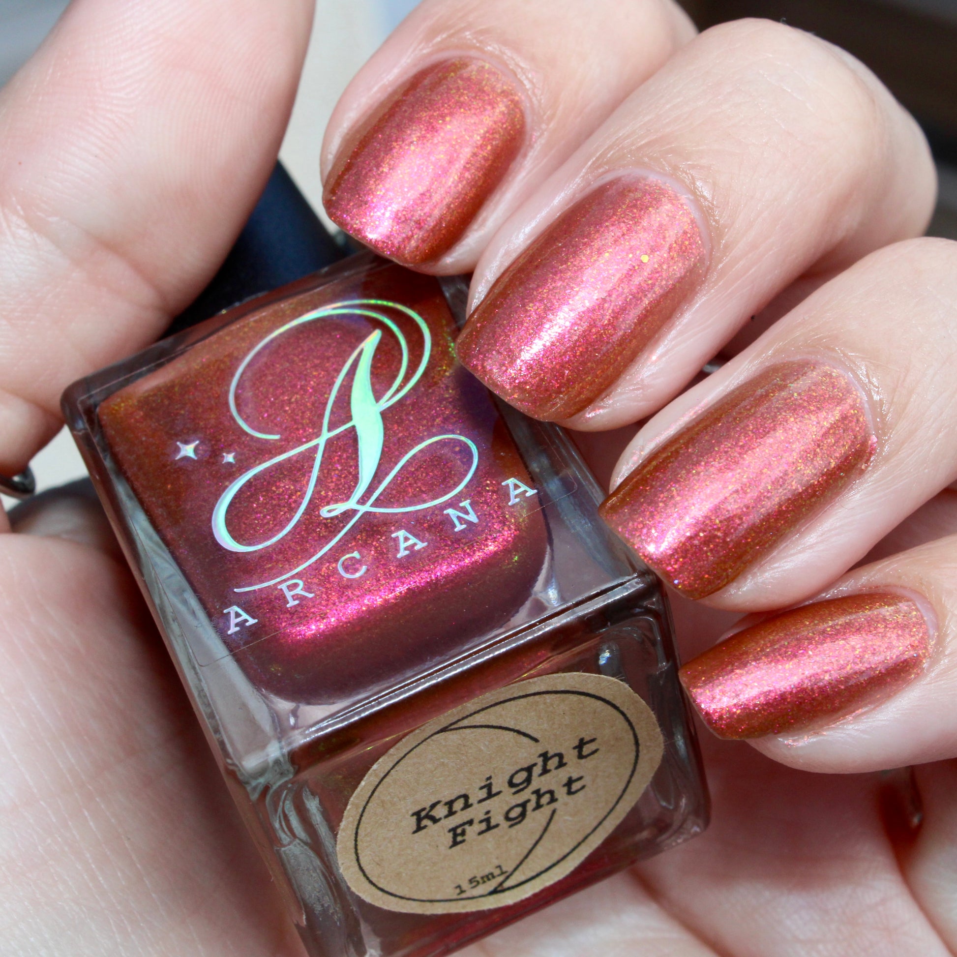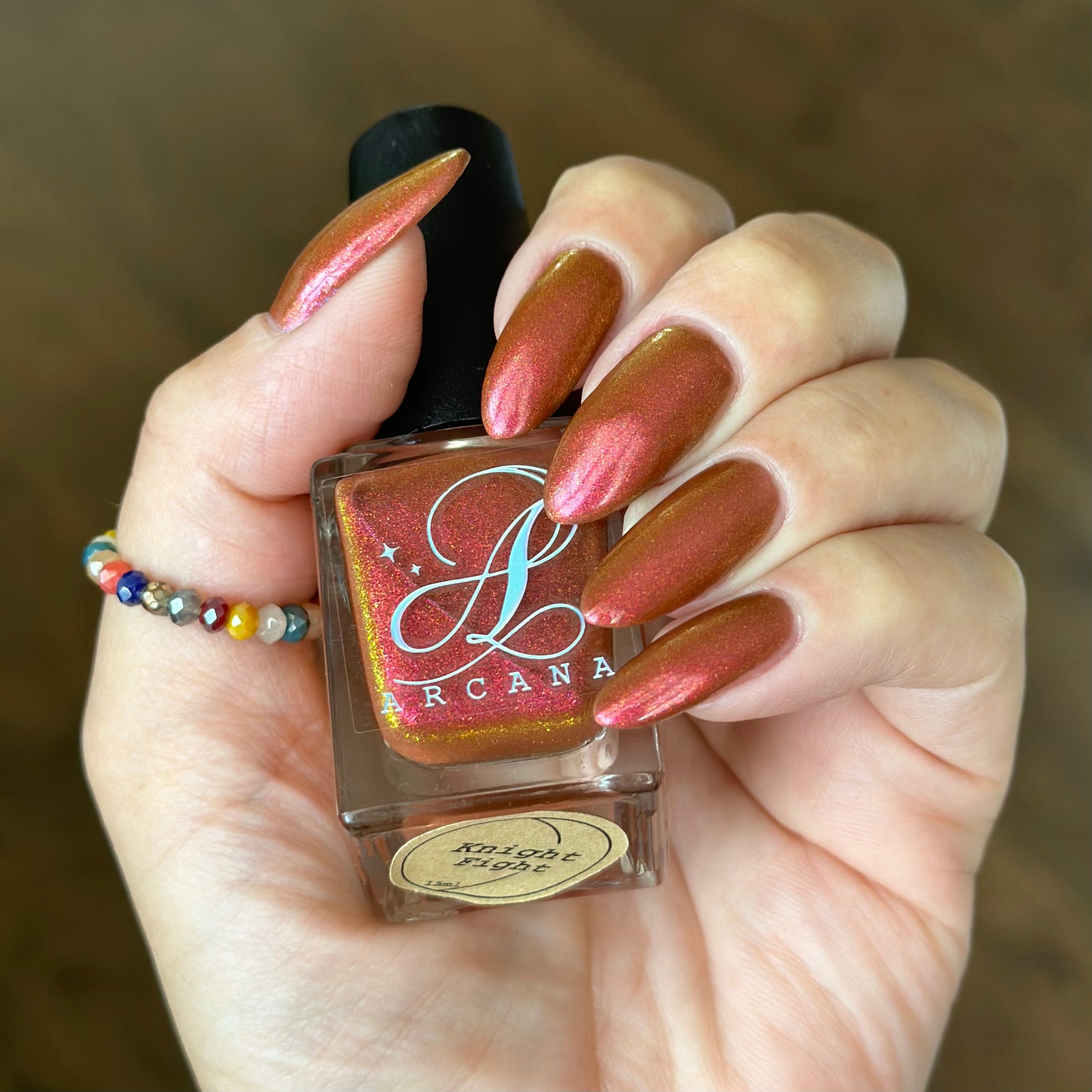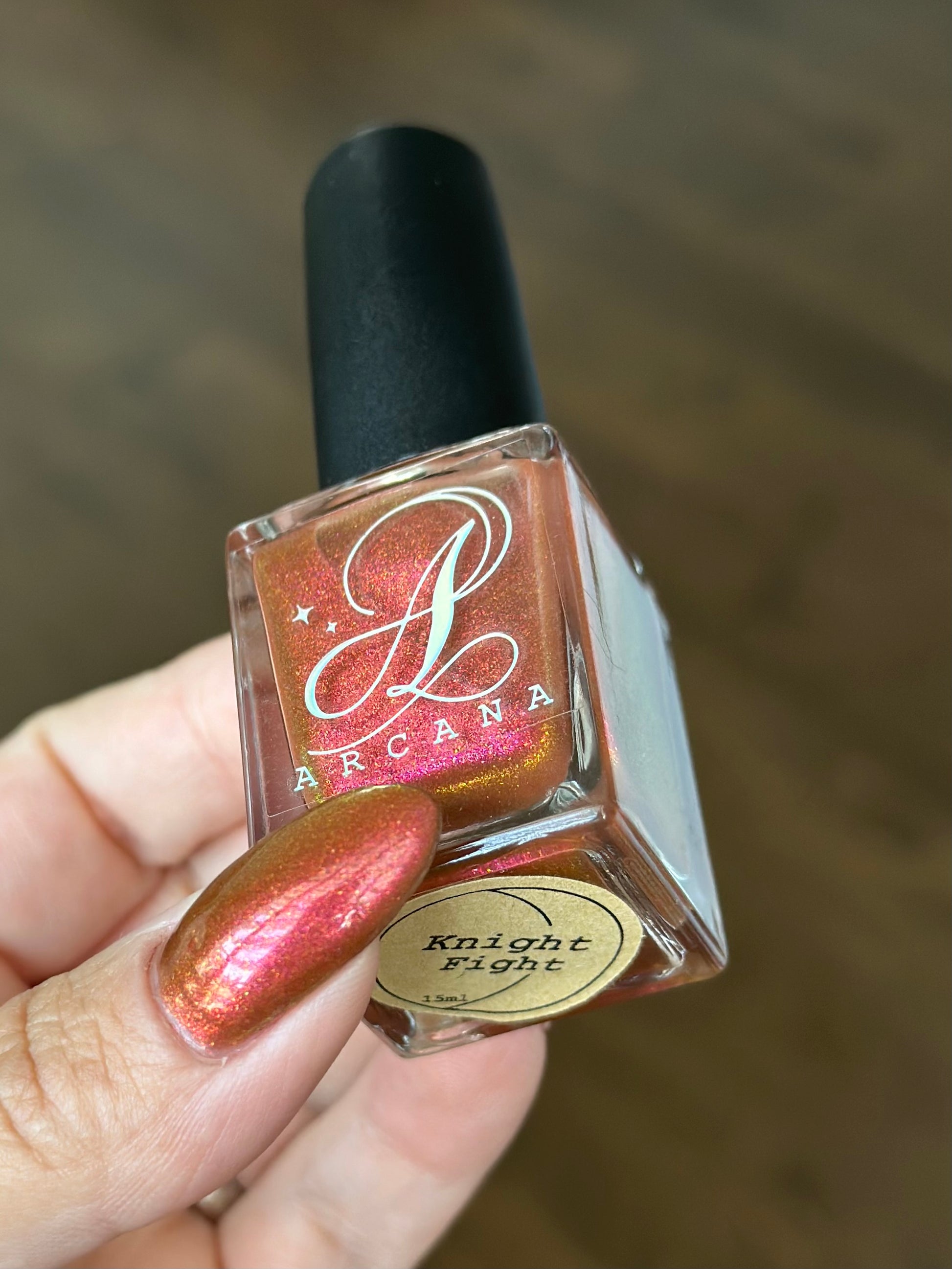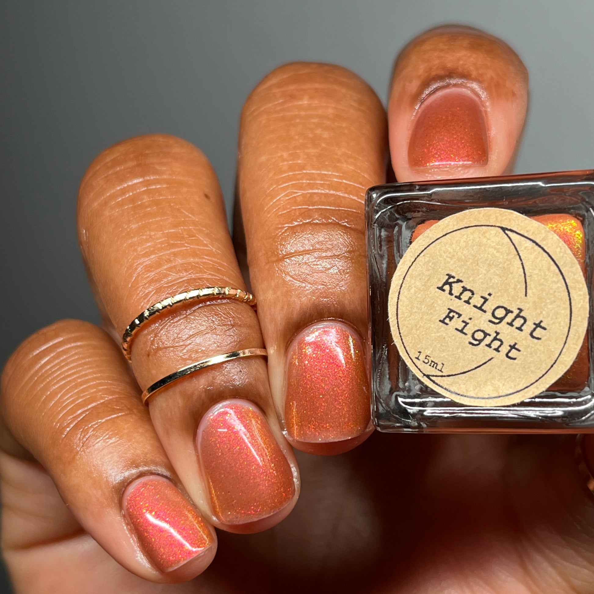 Shown in a variety of lighting - both direct and indirect, indoor and outdoor. Knight Fight is created with both a yellow shimmer and a pink shimmer - giving the base a bit more of an orange tone than true brown. It can look more red in certain lightings and more orange in others.