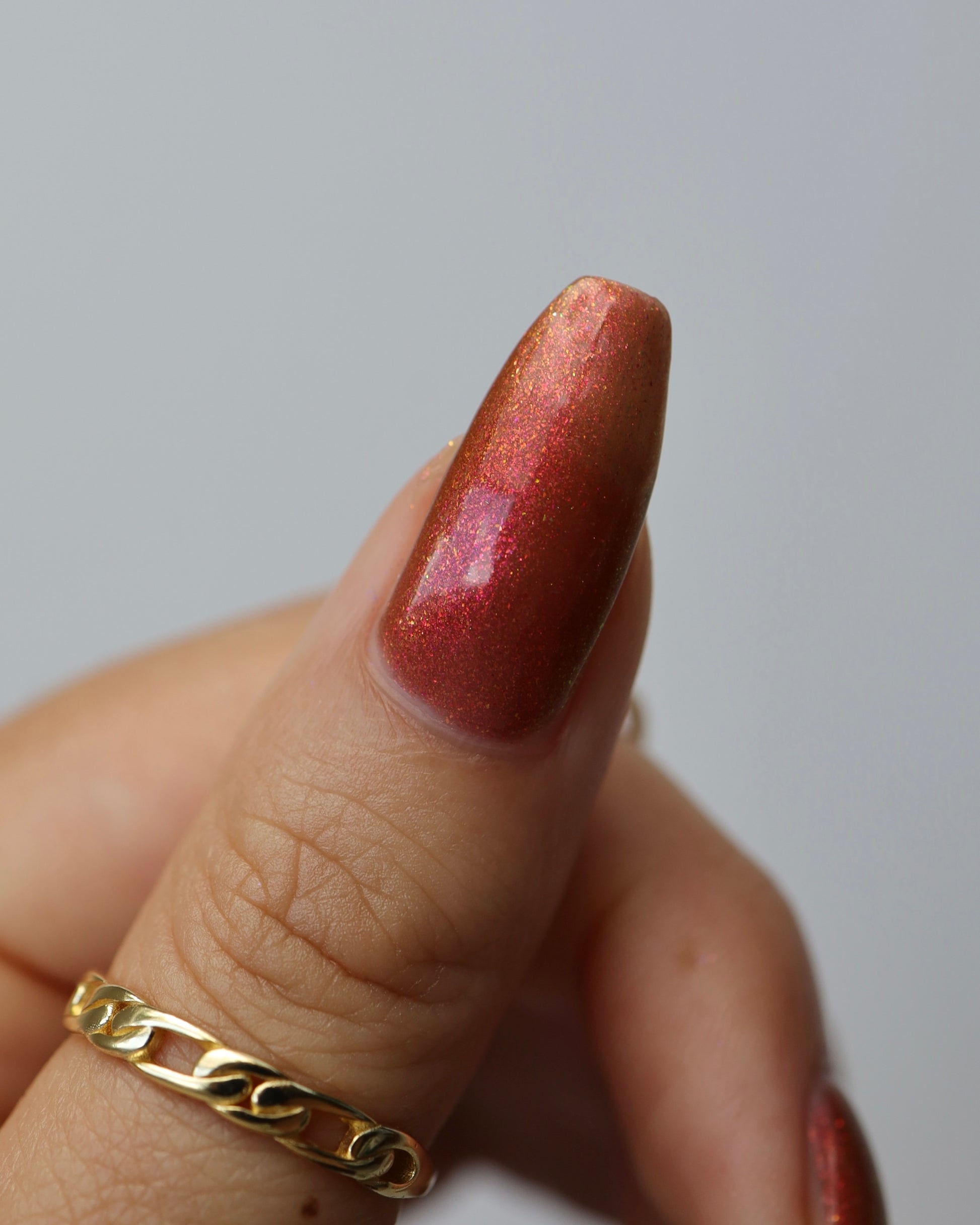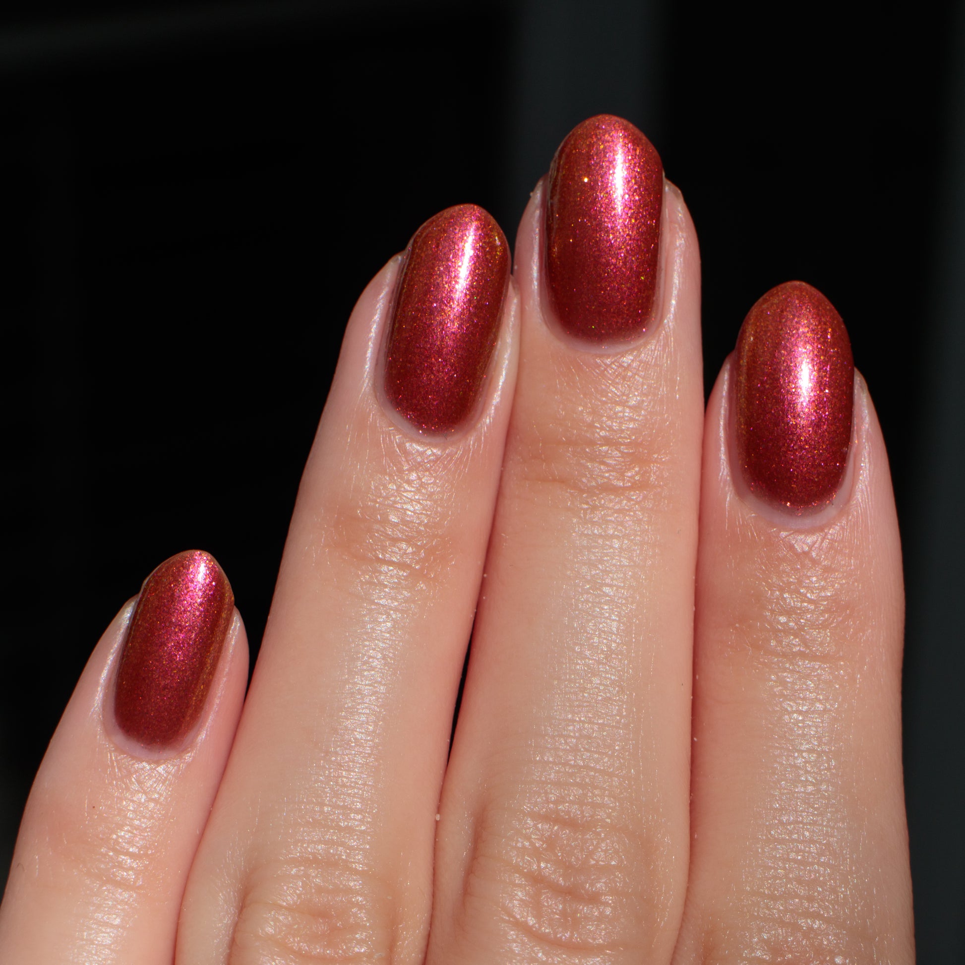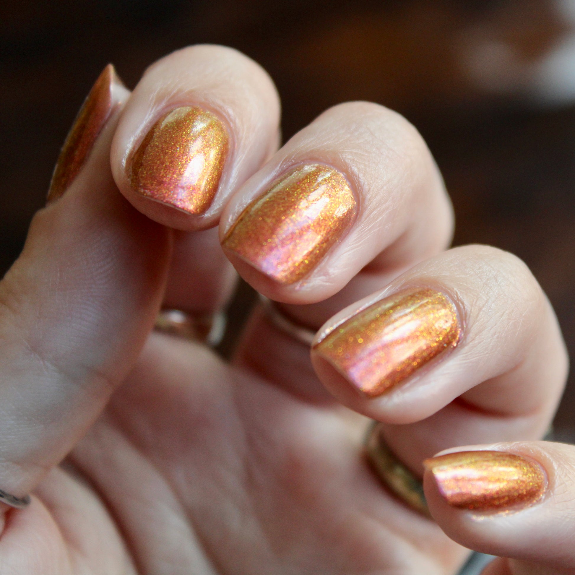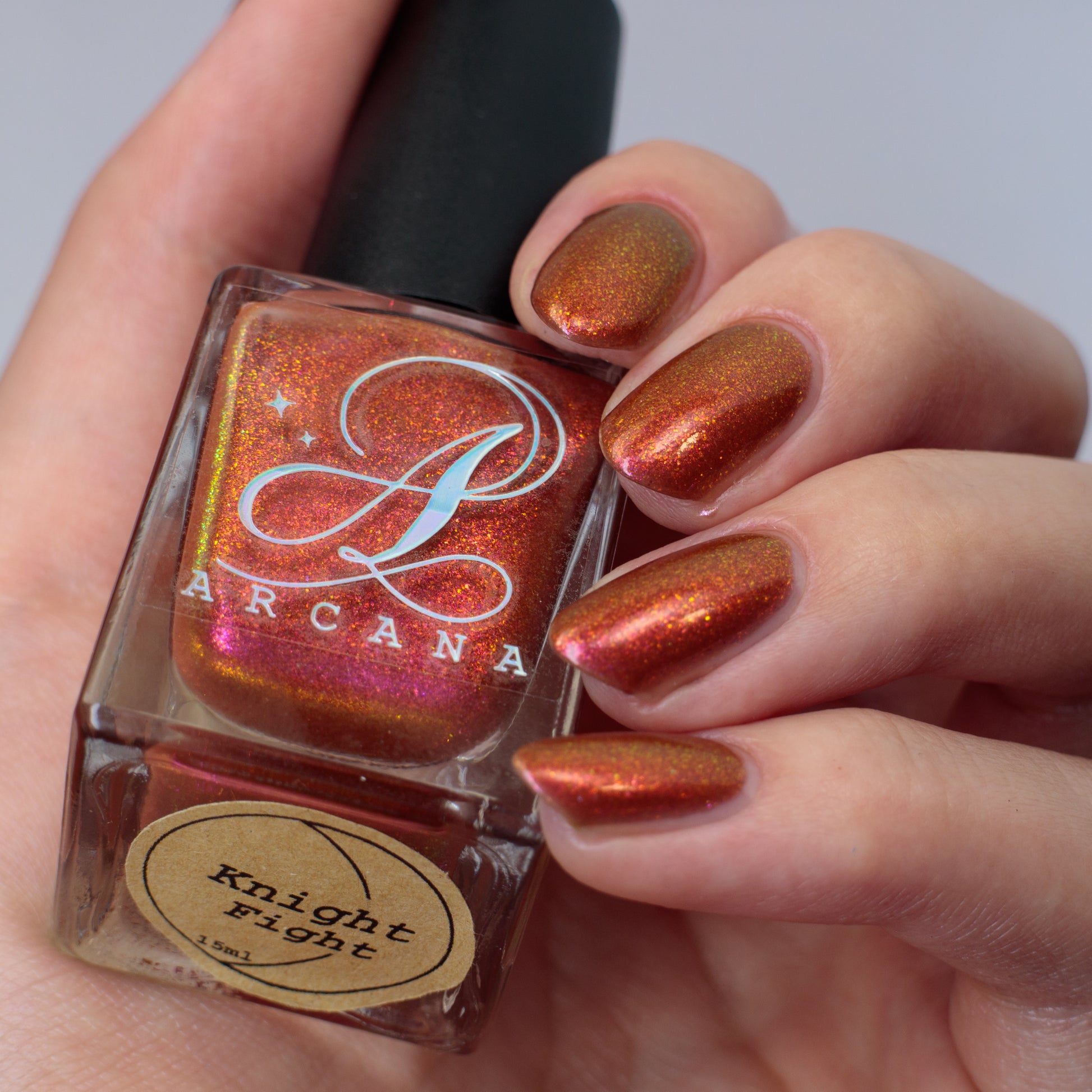 Shown in a variety of lighting - both direct and indirect, indoor and outdoor. Knight Fight is created with both a yellow shimmer and a pink shimmer - giving the base a bit more of an orange tone than true brown. It can look more red in certain lightings and more orange in others.