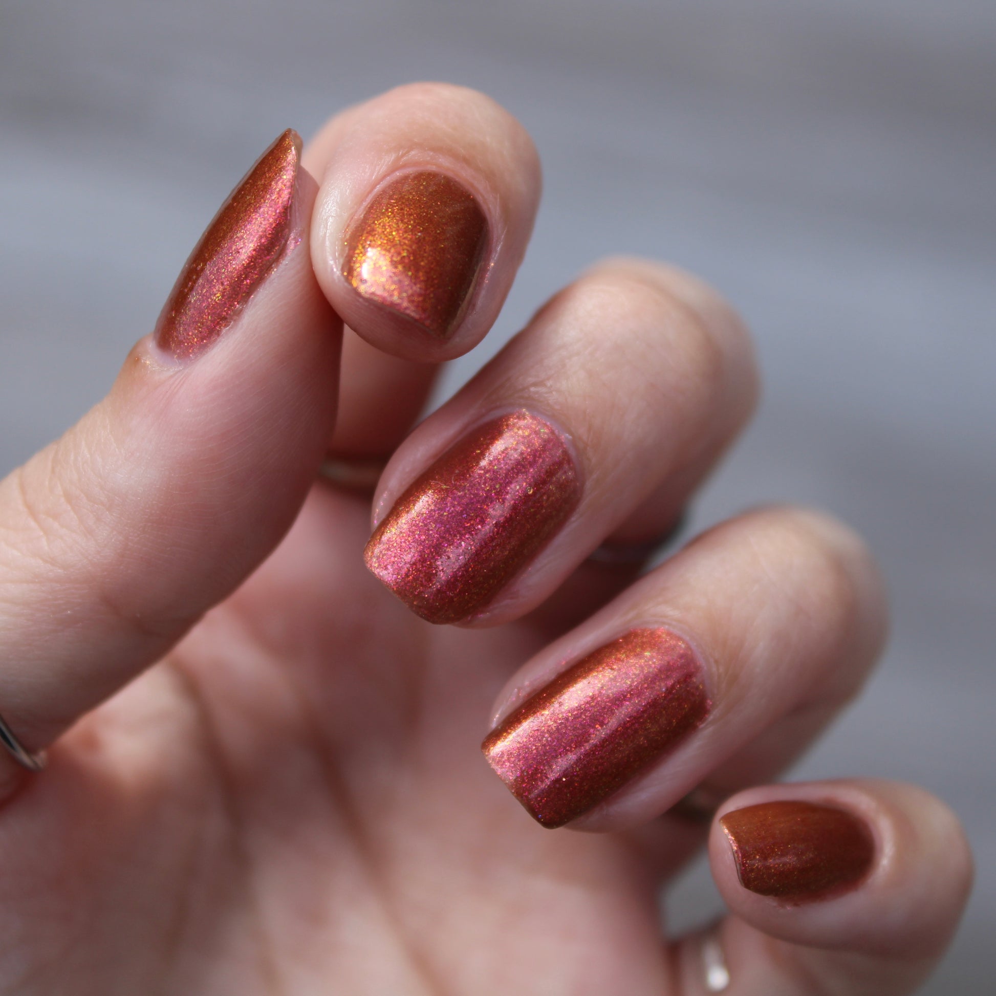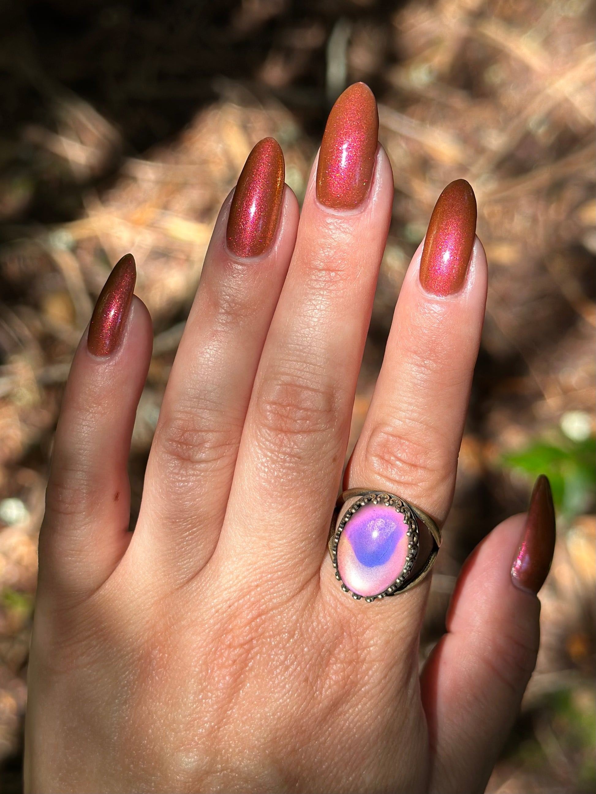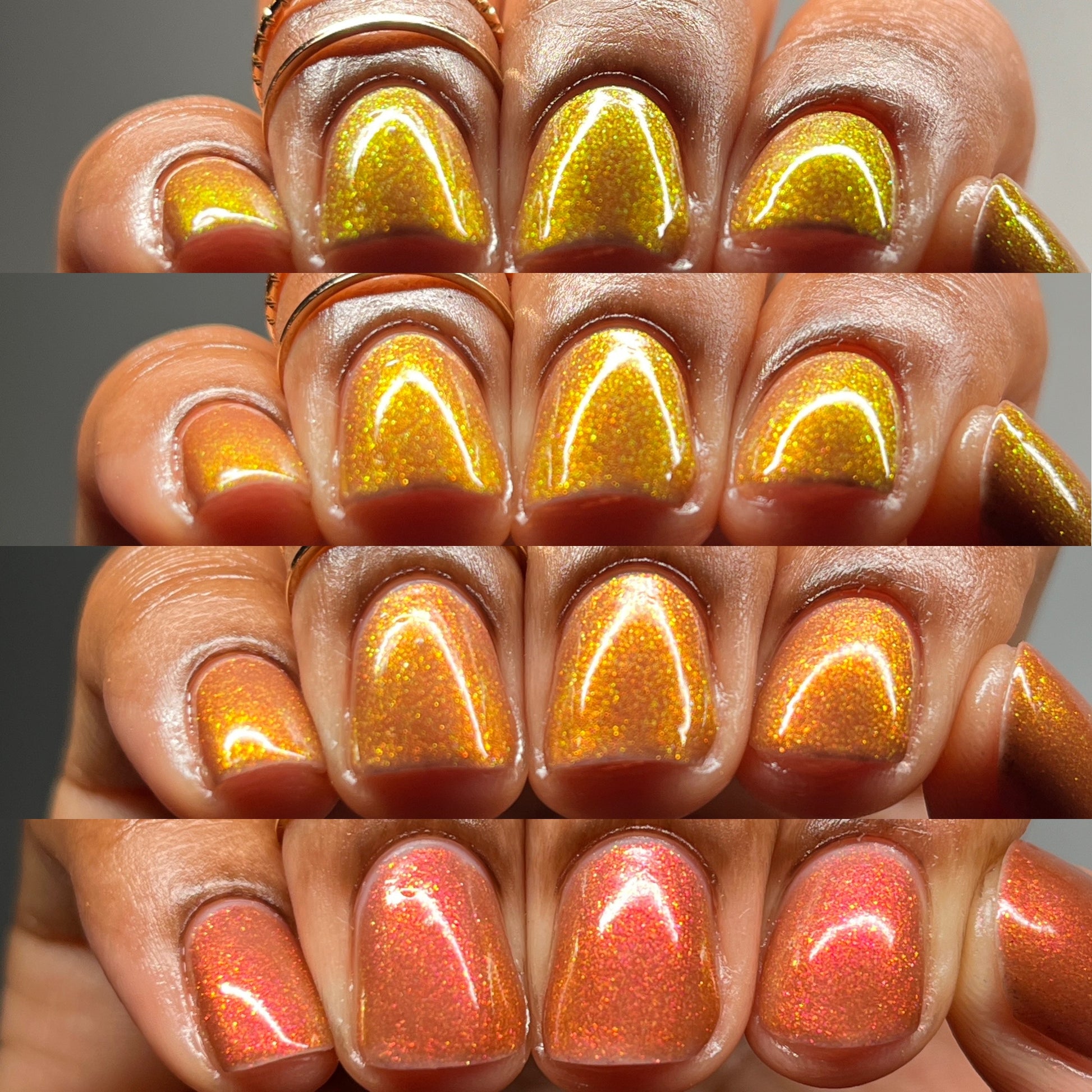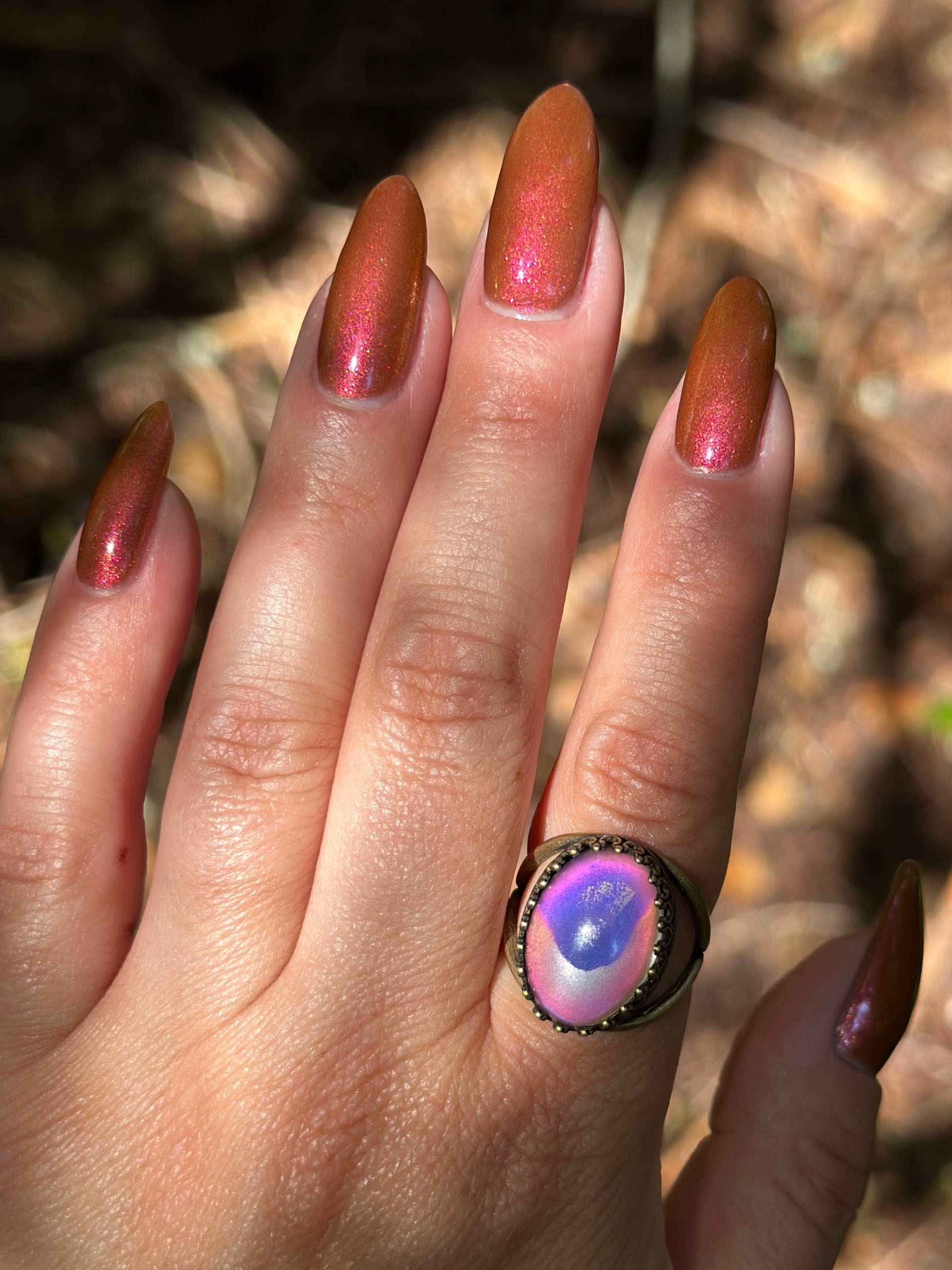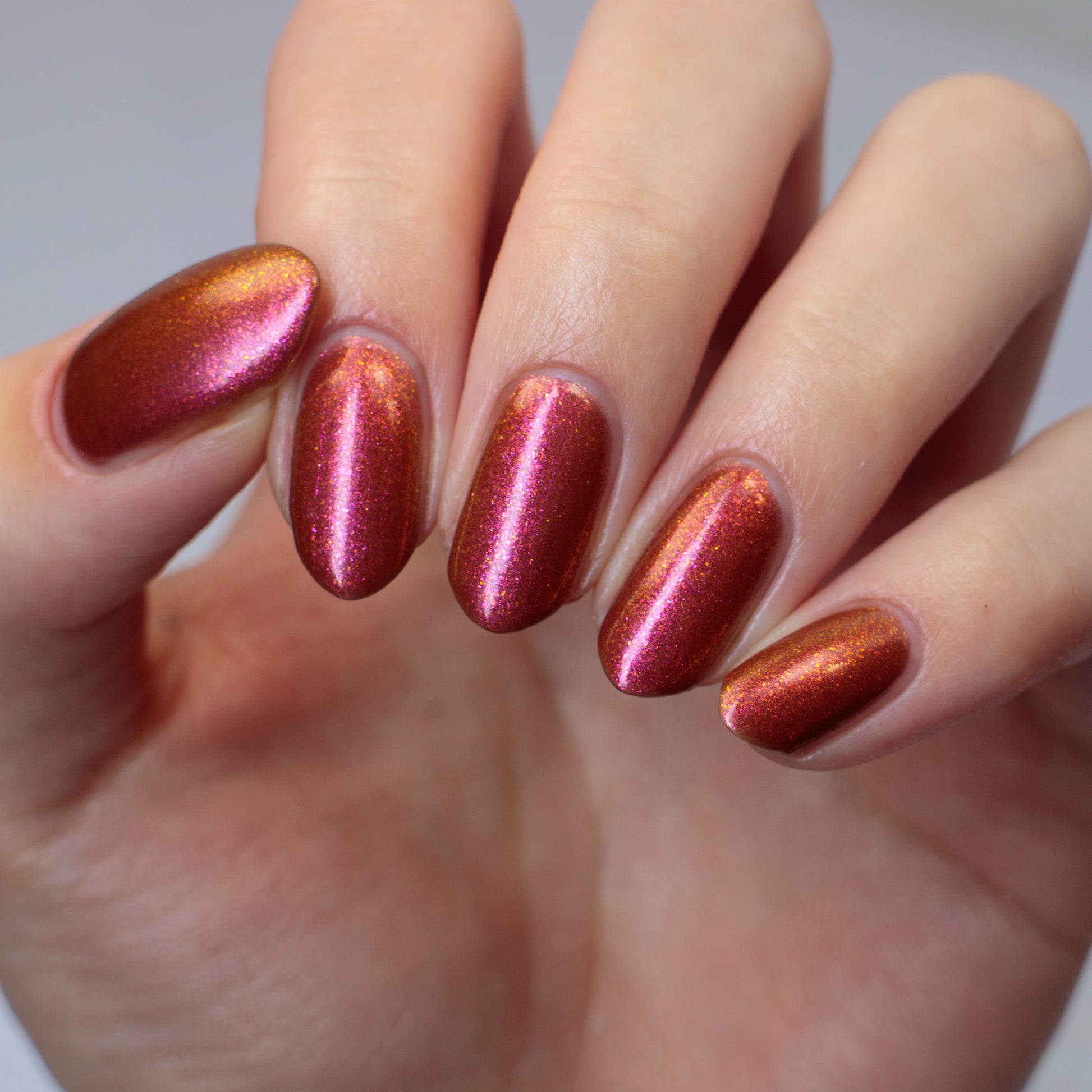 Shown in a variety of lighting - both direct and indirect, indoor and outdoor. Knight Fight is created with both a yellow shimmer and a pink shimmer - giving the base a bit more of an orange tone than true brown. It can look more red in certain lightings and more orange in others.