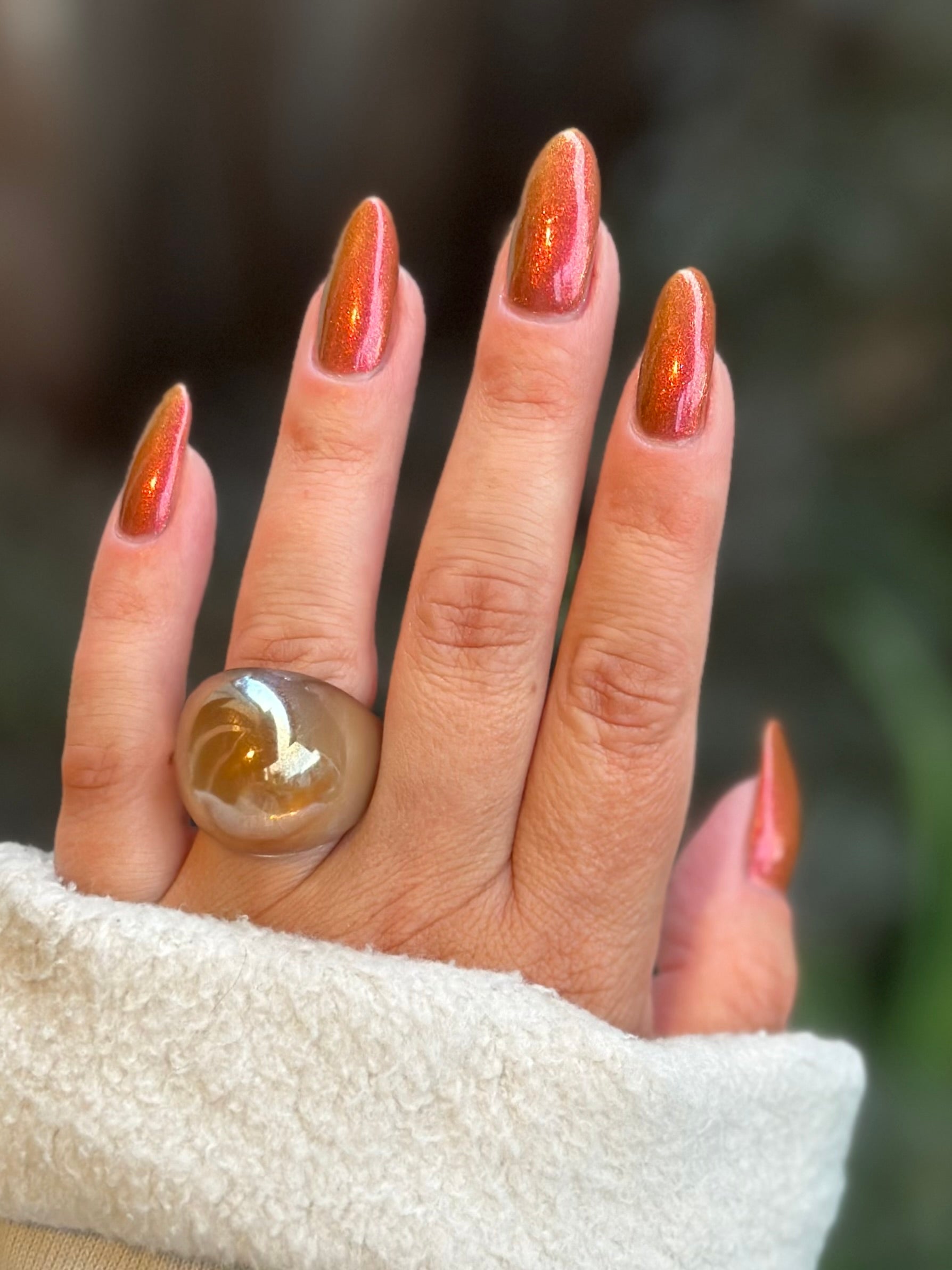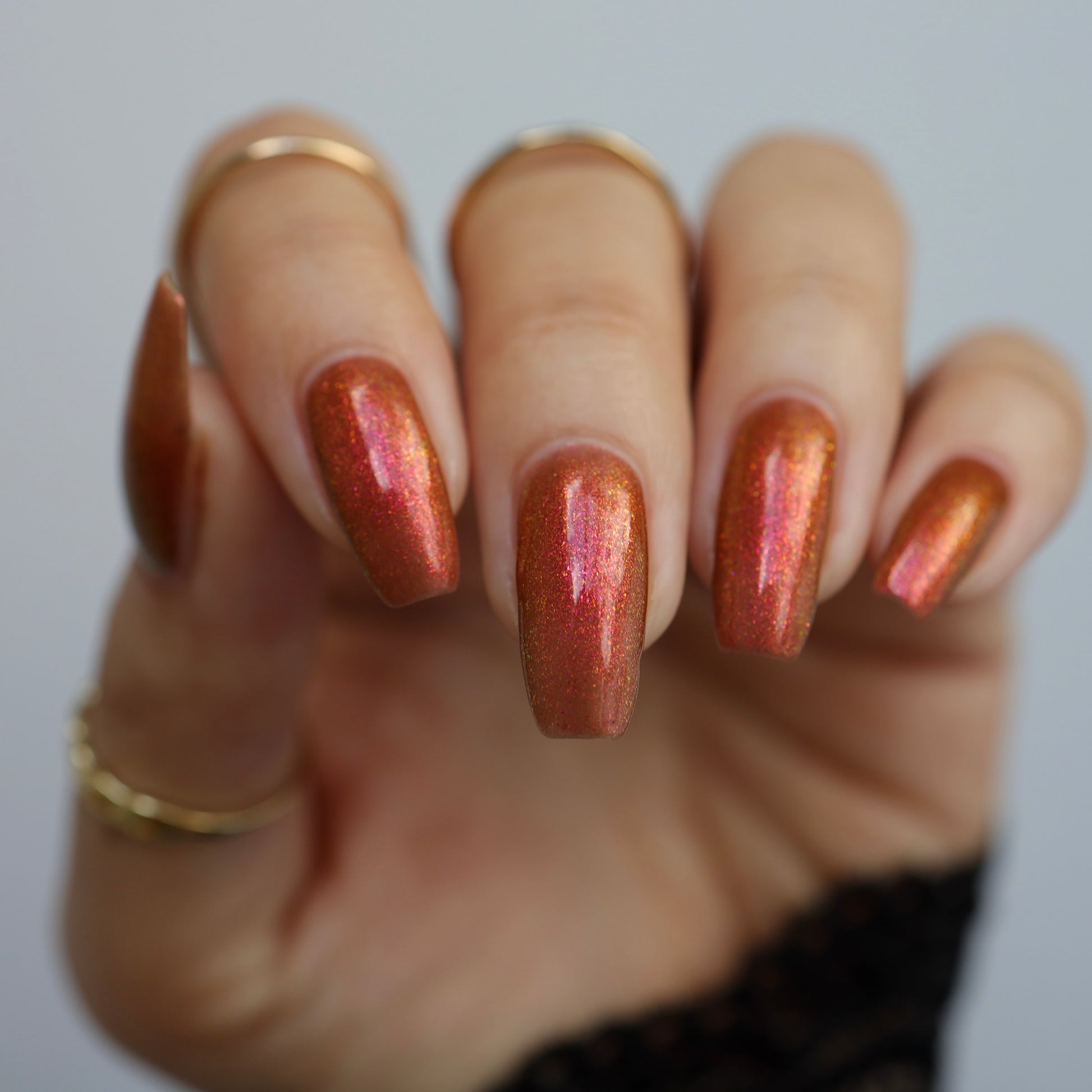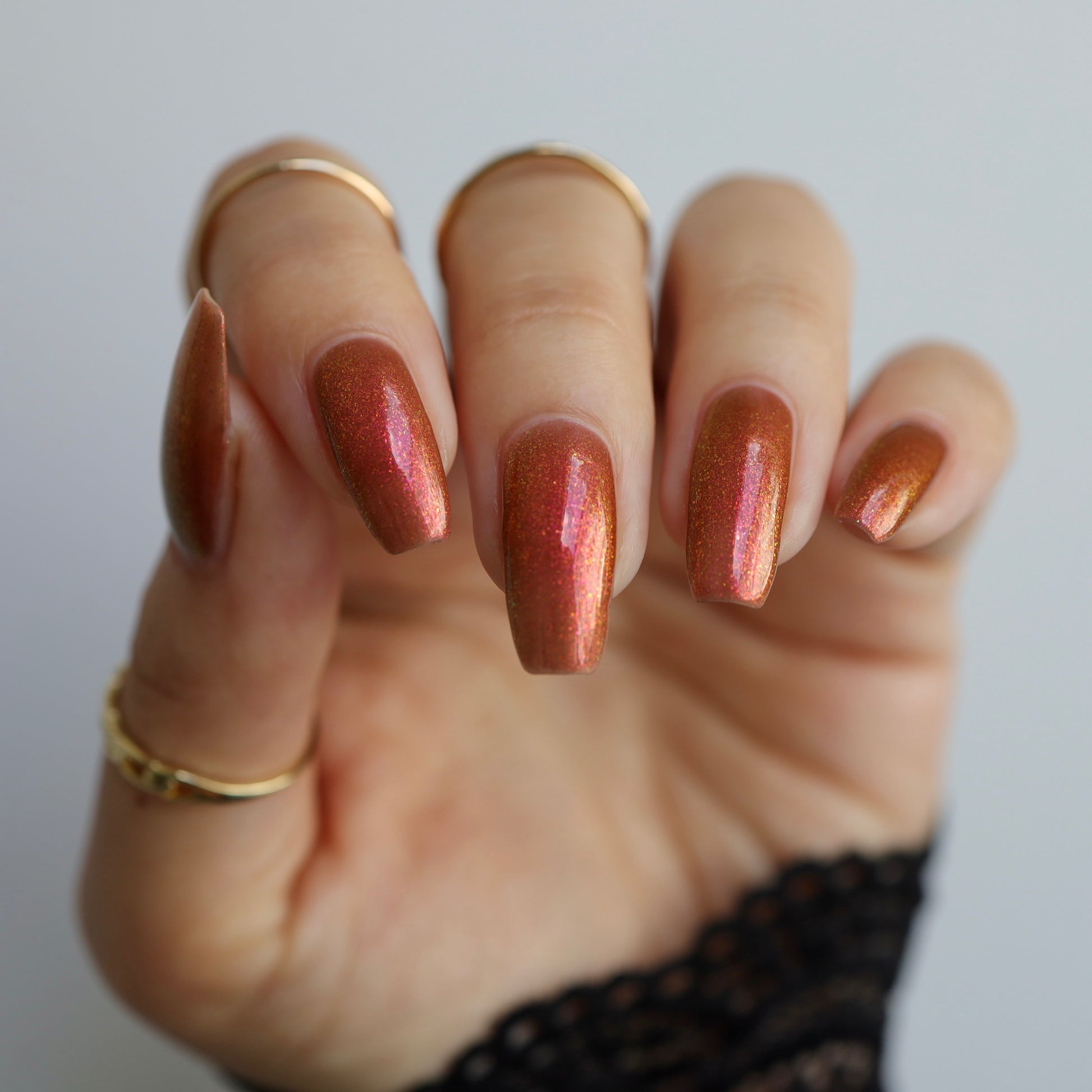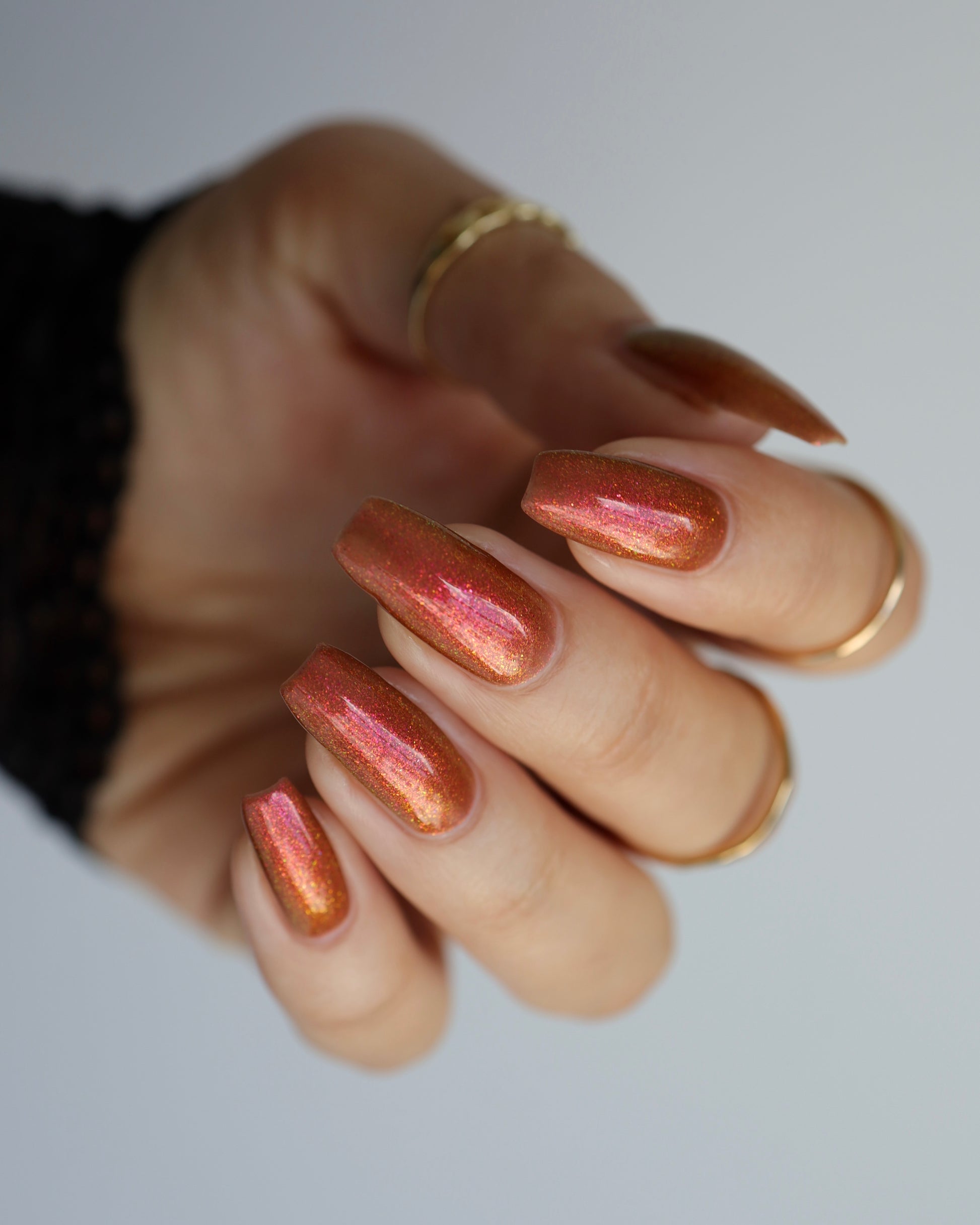 Shown in a variety of lighting - both direct and indirect, indoor and outdoor. Knight Fight is created with both a yellow shimmer and a pink shimmer - giving the base a bit more of an orange tone than true brown. It can look more red in certain lightings and more orange in others.