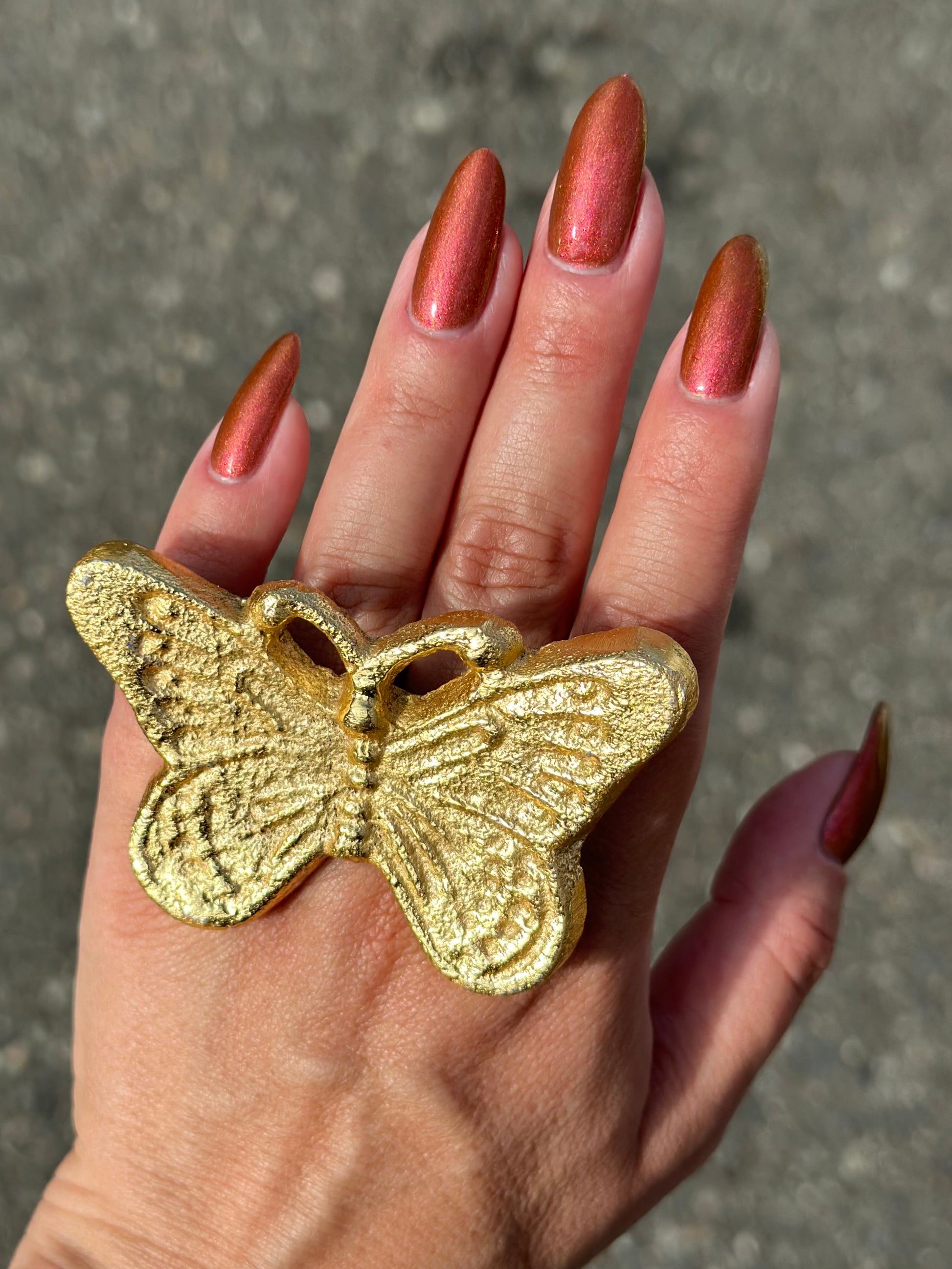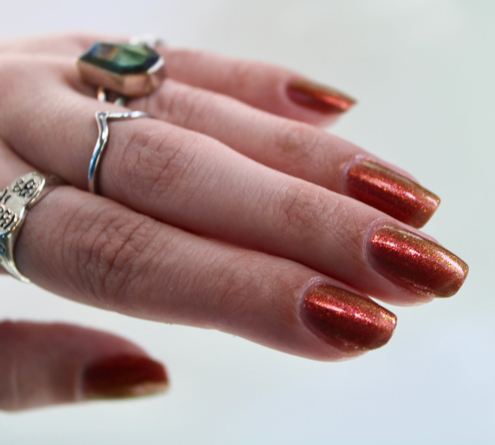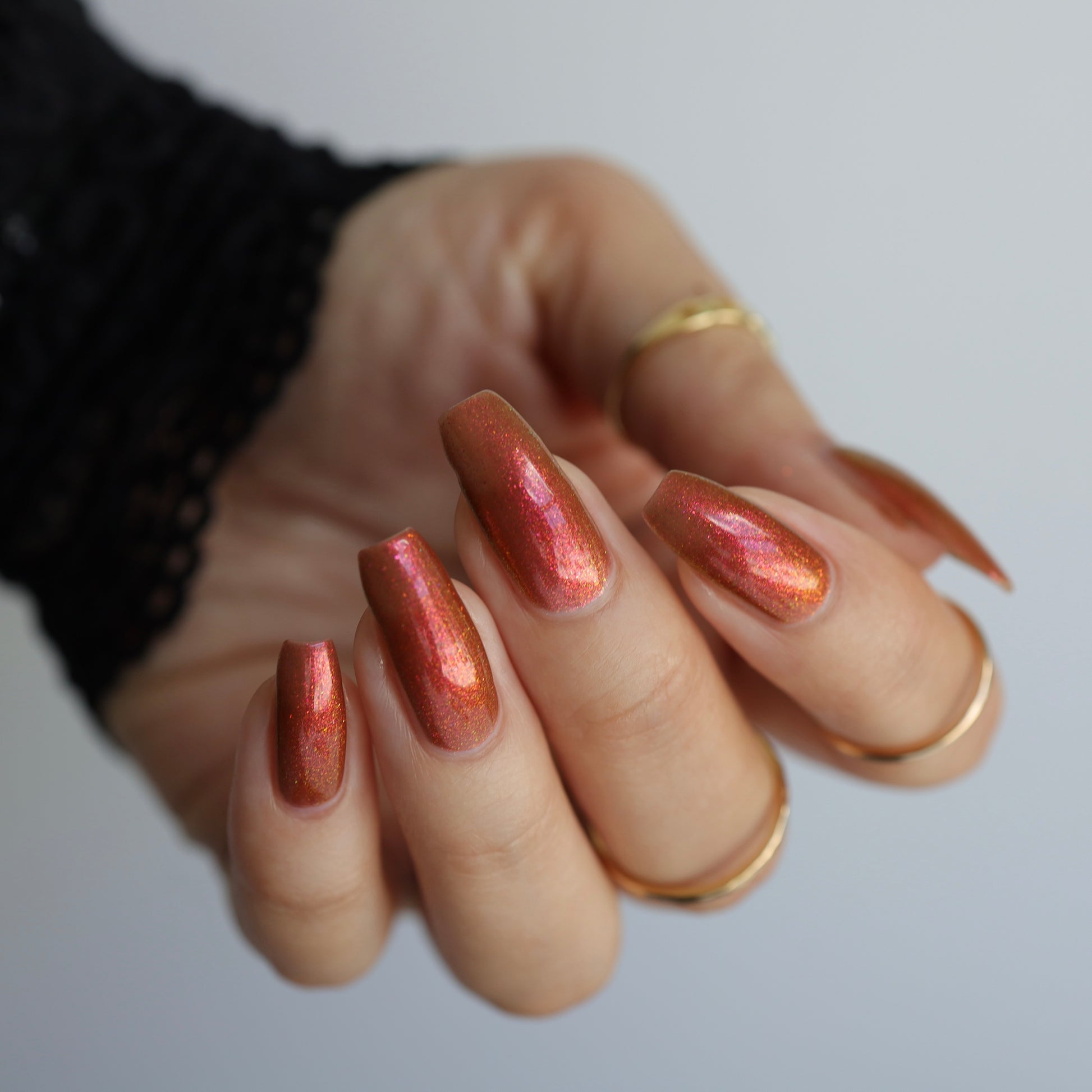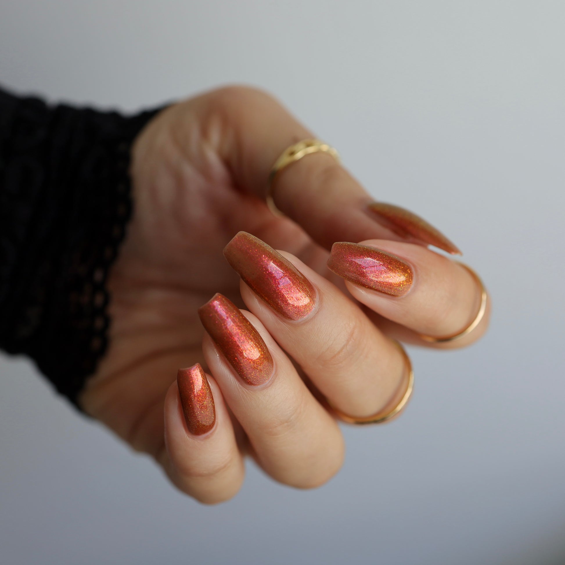 Shown in a variety of lighting - both direct and indirect, indoor and outdoor. Knight Fight is created with both a yellow shimmer and a pink shimmer - giving the base a bit more of an orange tone than true brown. It can look more red in certain lightings and more orange in others.