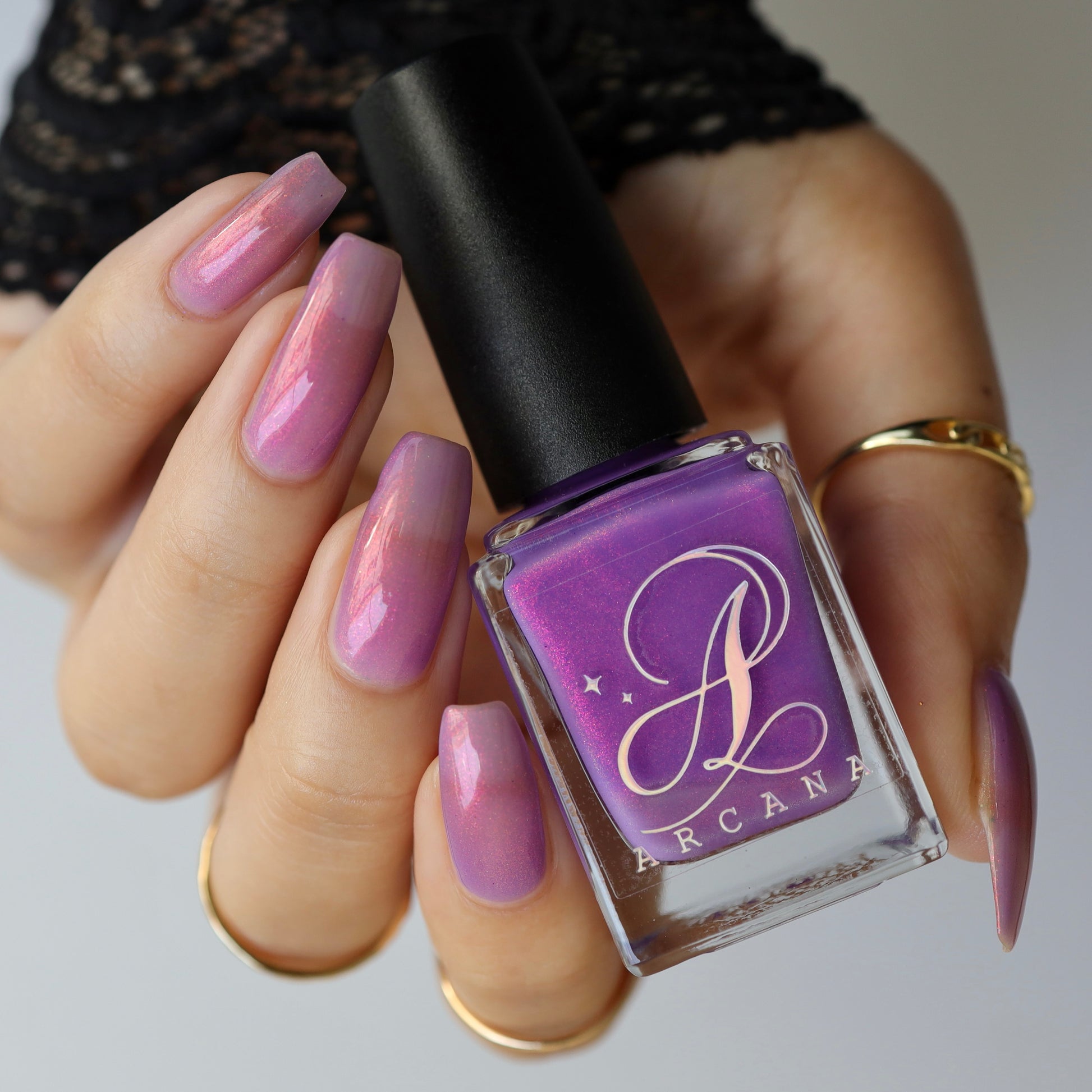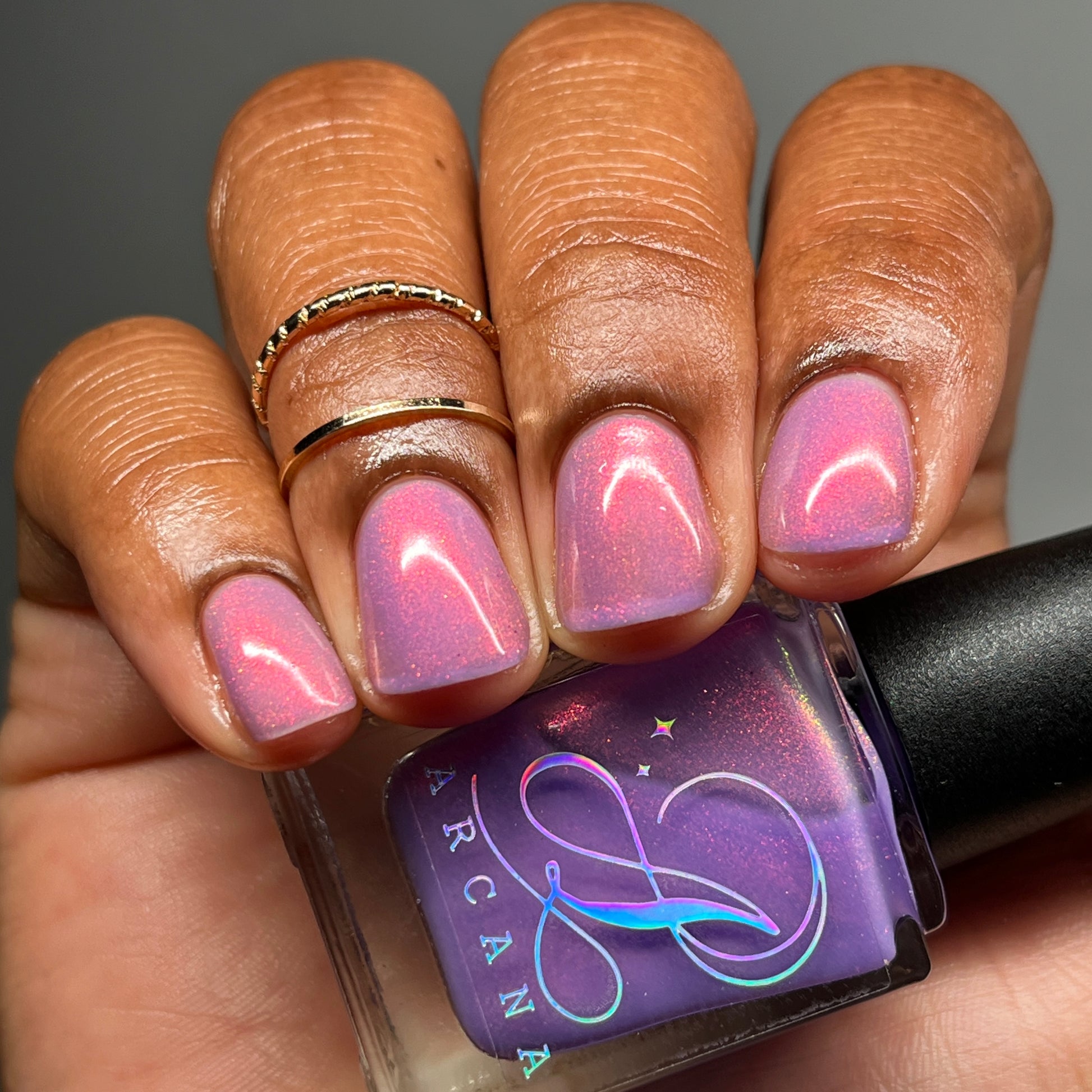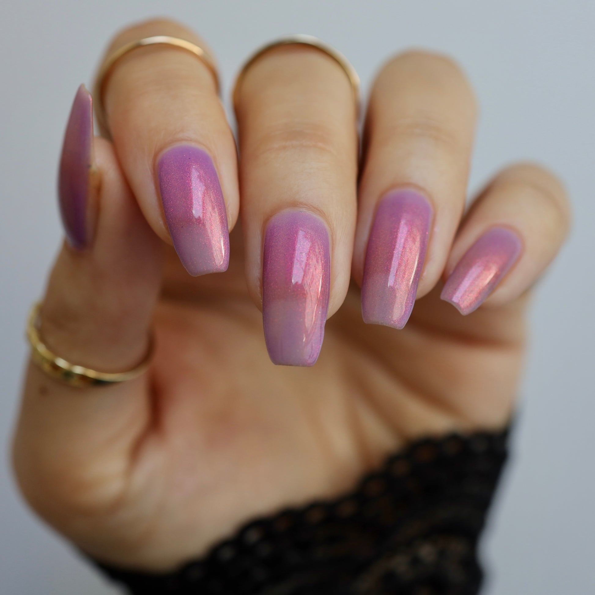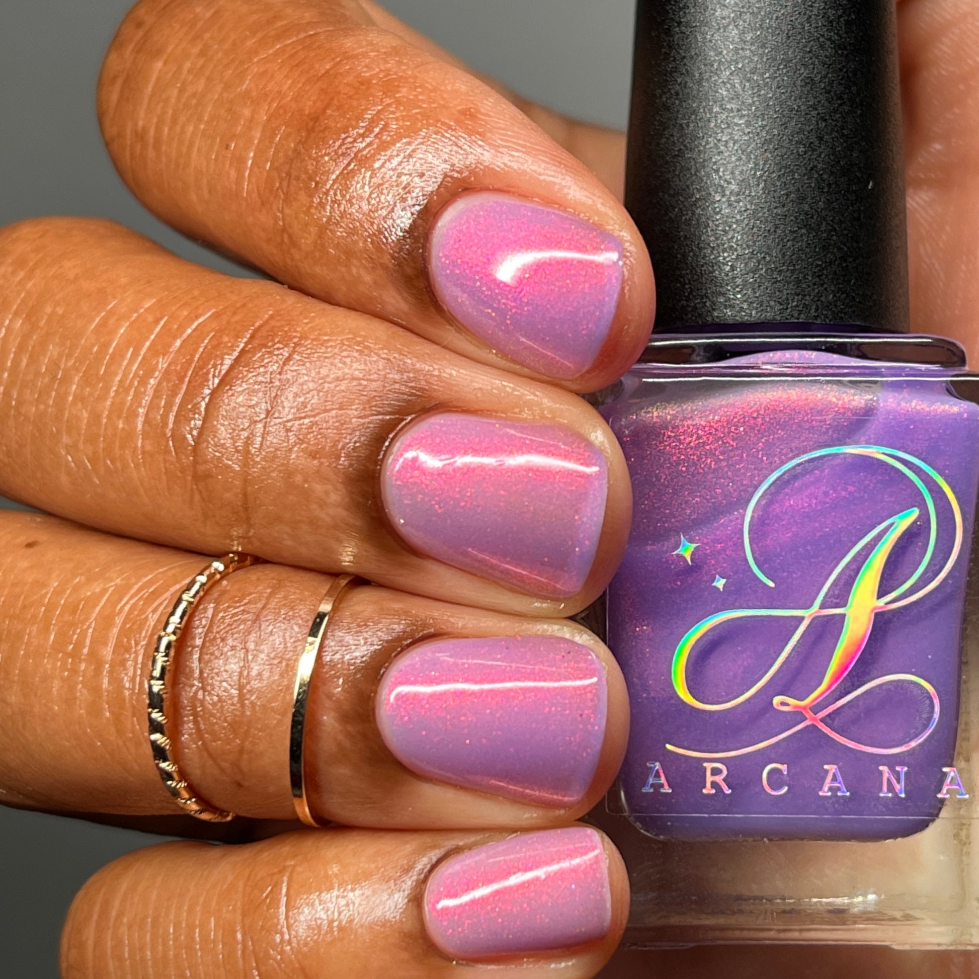 Shown in direct and indirect indoor and outdoor lighting. Direct lighting shows more of the cool toned lavender base with a strong pink shimmer. Indirect lighting will blend the two elements together to create a more pink leaning lavender color with some extra pink sparkles.