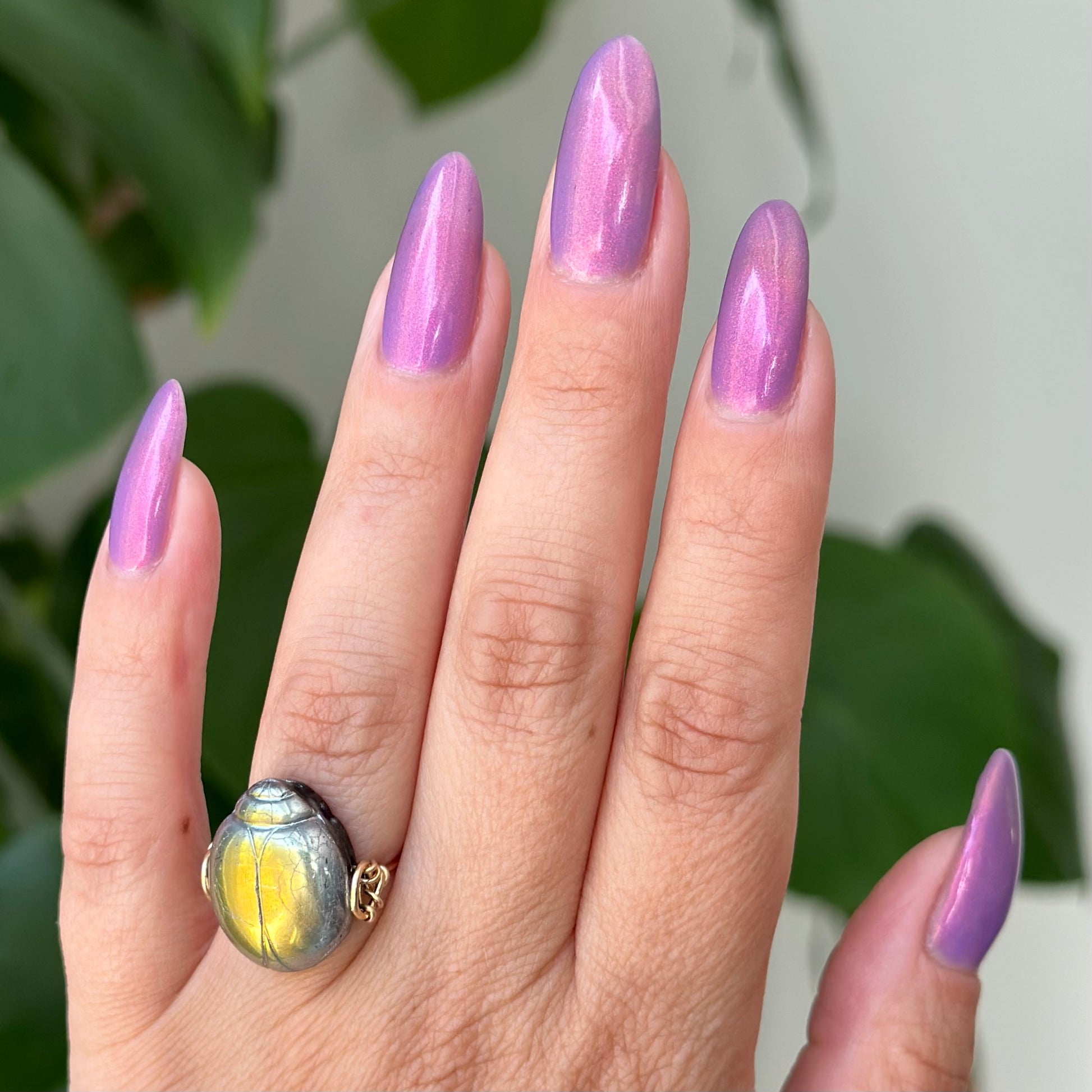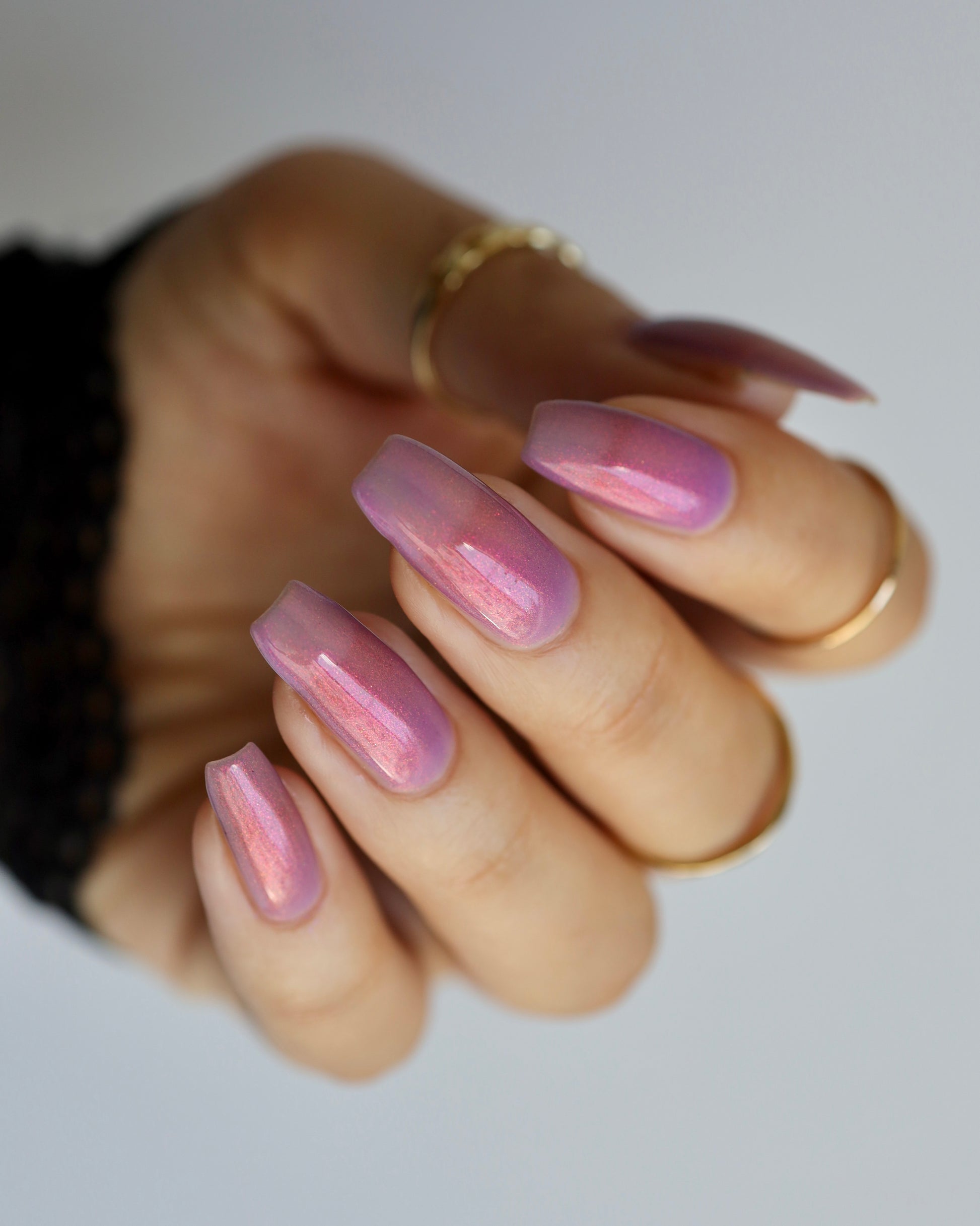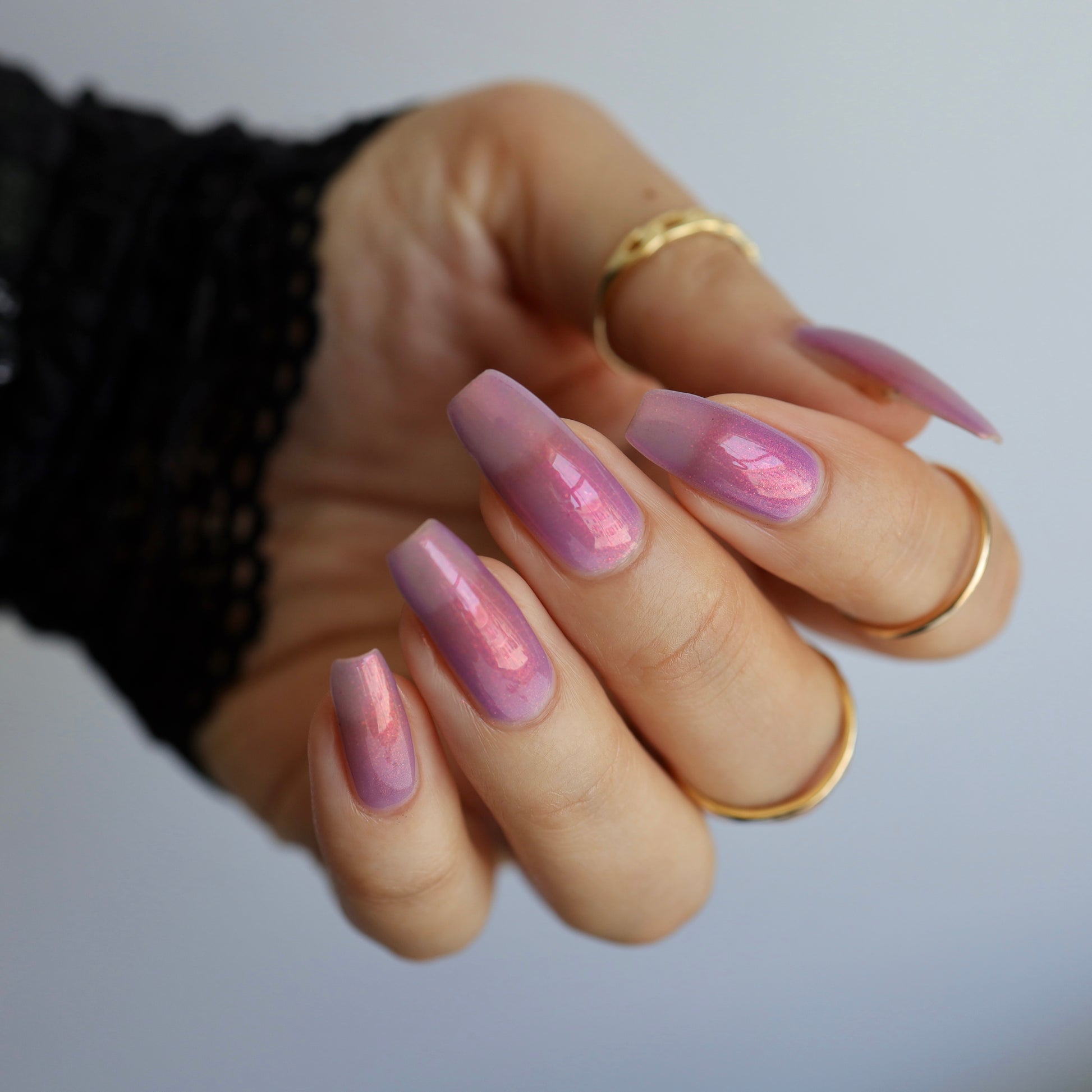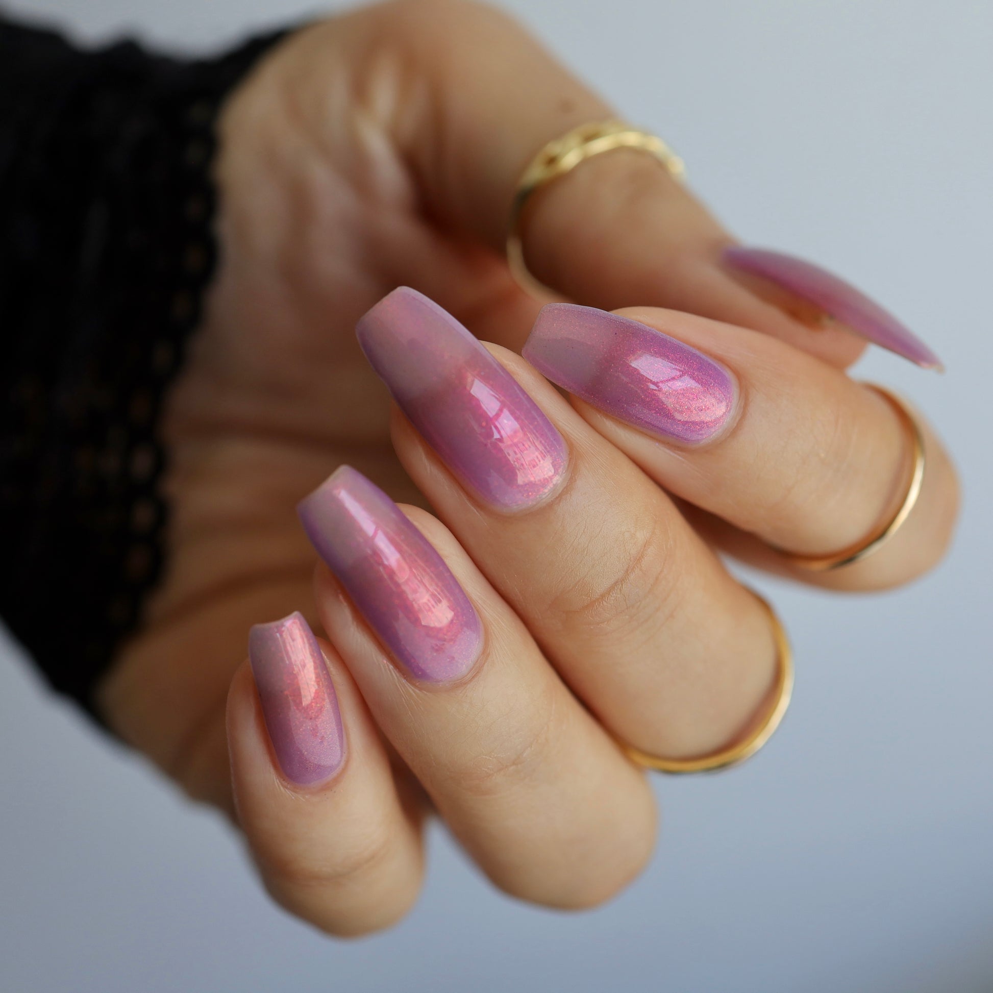 Shown in direct and indirect indoor and outdoor lighting. Direct lighting shows more of the cool toned lavender base with a strong pink shimmer. Indirect lighting will blend the two elements together to create a more pink leaning lavender color with some extra pink sparkles.