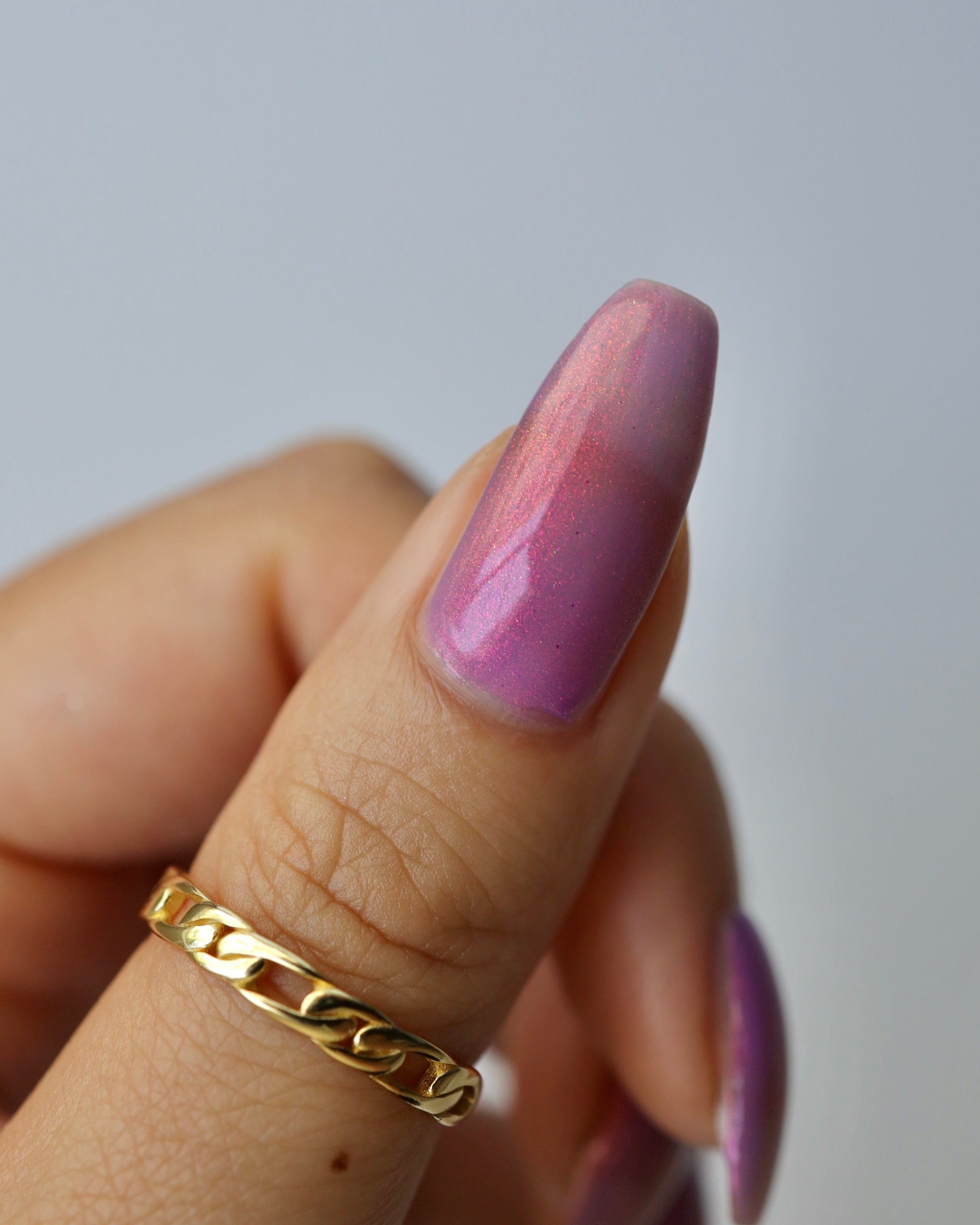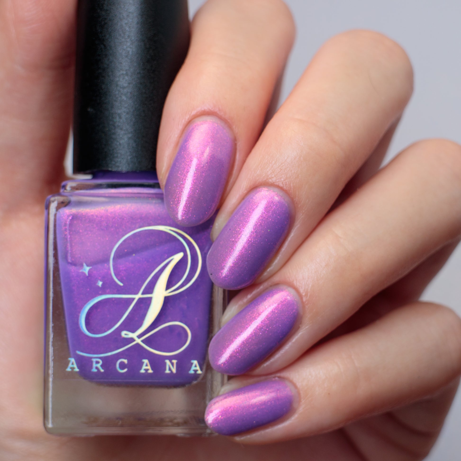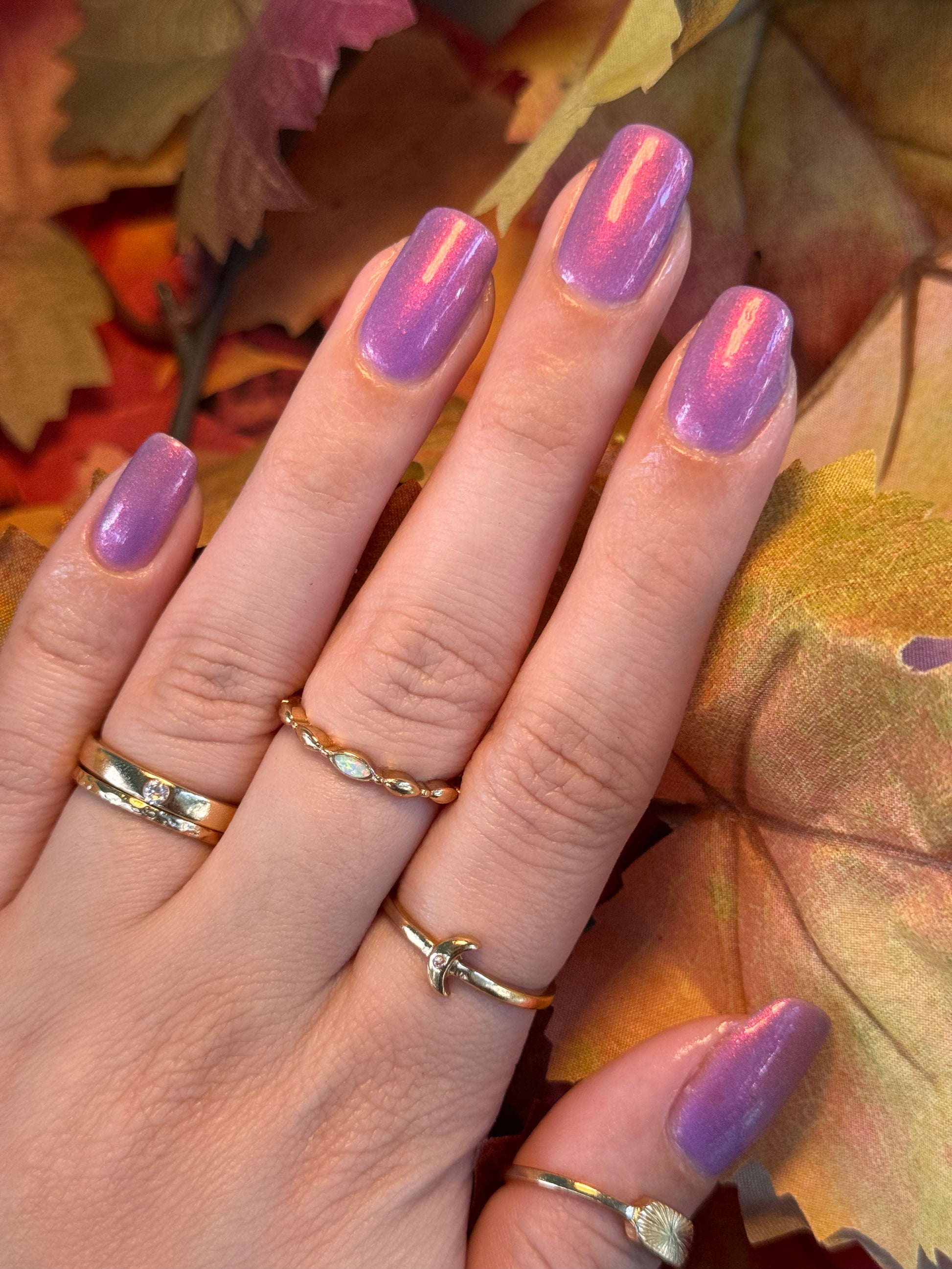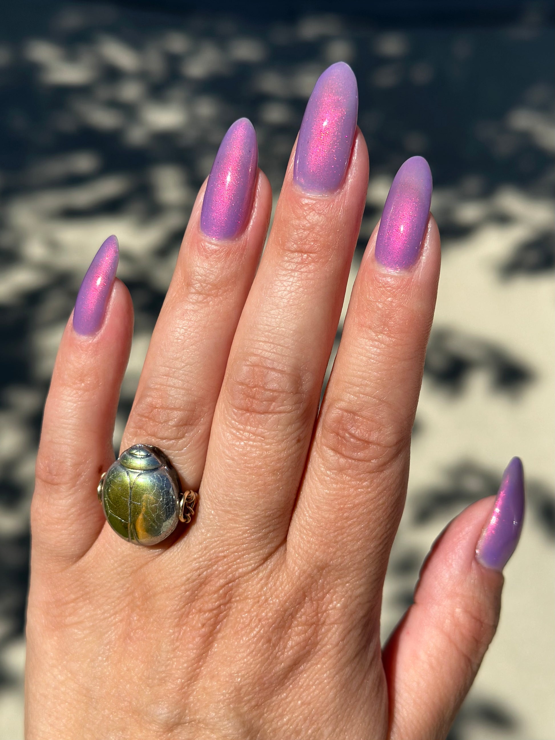 Shown in direct and indirect indoor and outdoor lighting. Direct lighting shows more of the cool toned lavender base with a strong pink shimmer. Indirect lighting will blend the two elements together to create a more pink leaning lavender color with some extra pink sparkles.