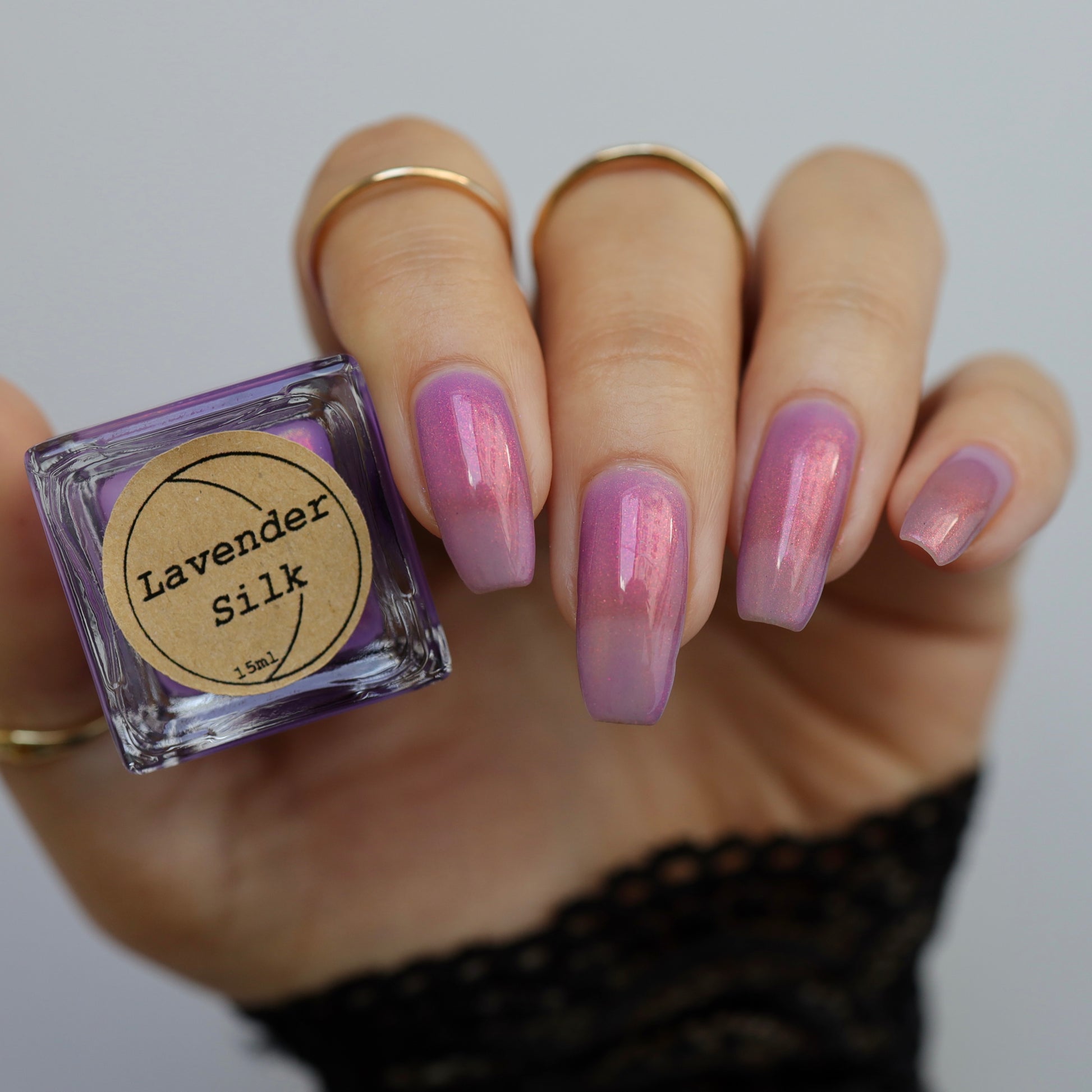 Lavender Silk is a blue-leaning lavender crelly base with pink aurora shimmer!