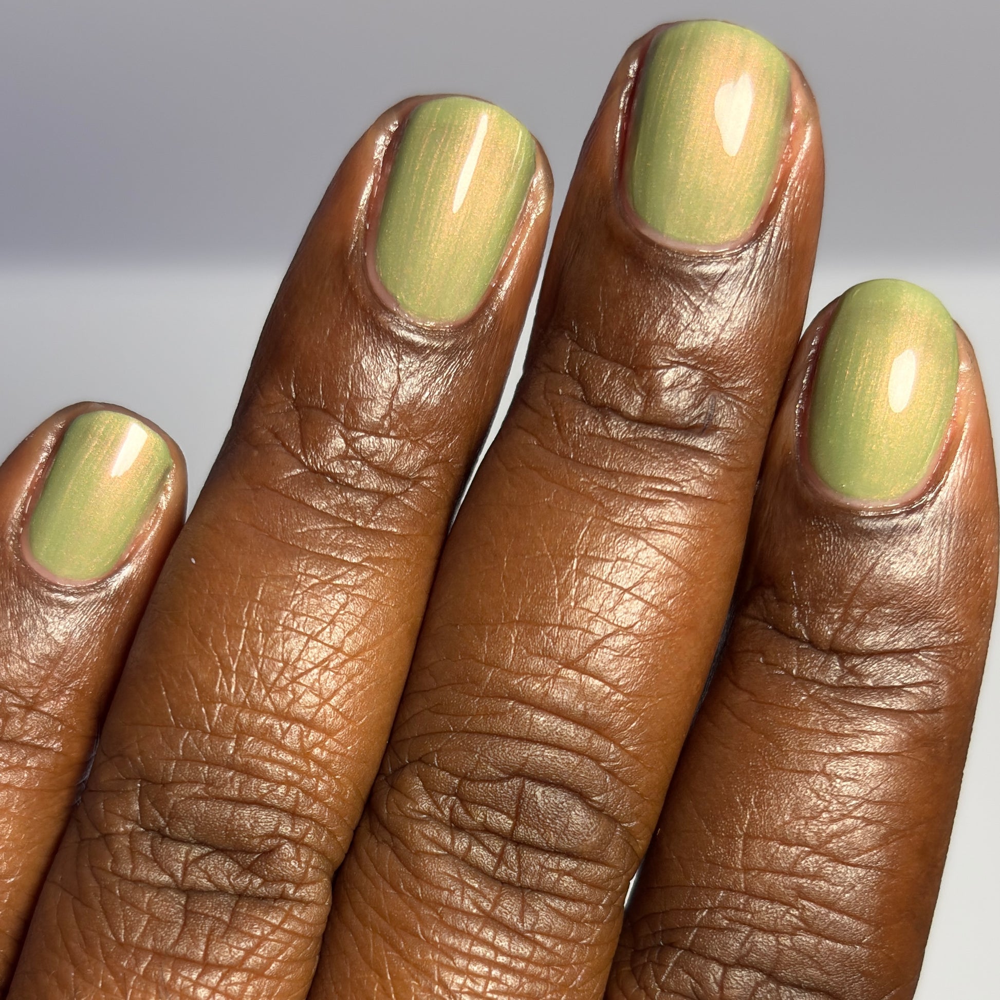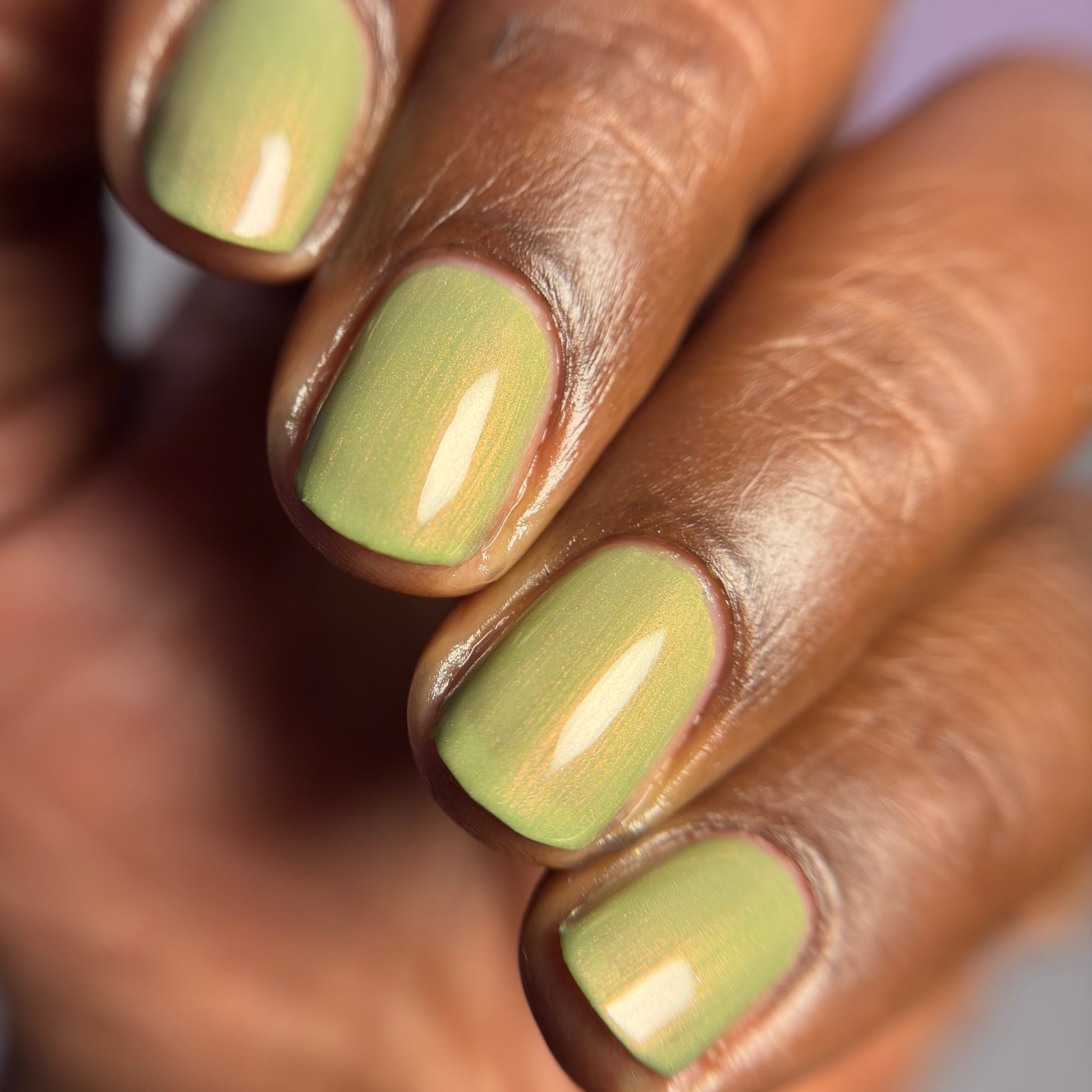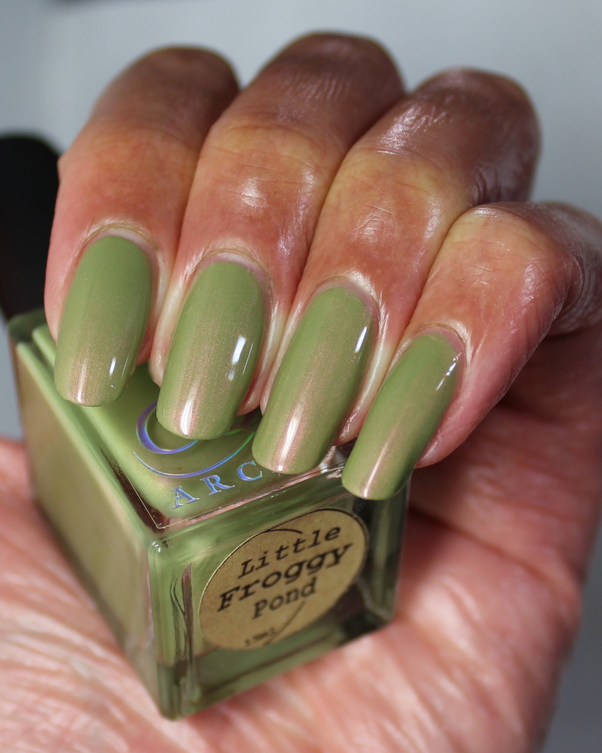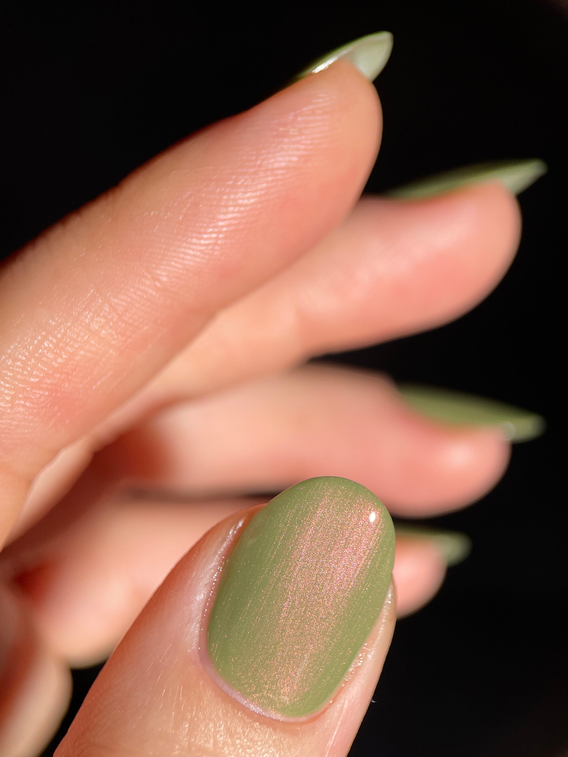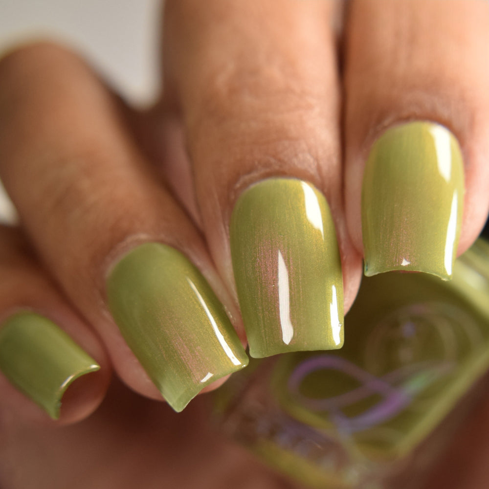Little Froggy Pond has a pea green crelly base with a pink to orange pearlescent shimmer.
