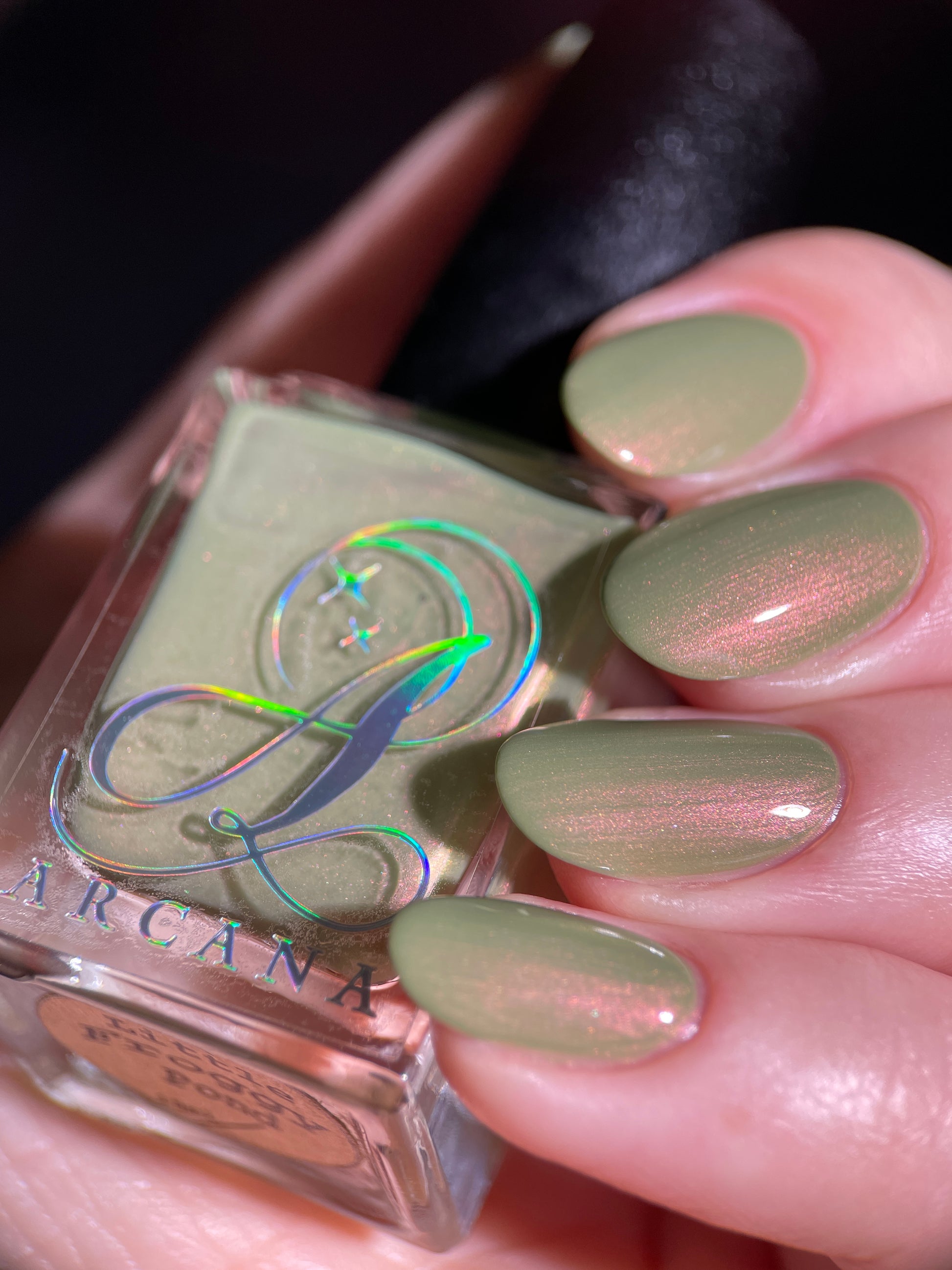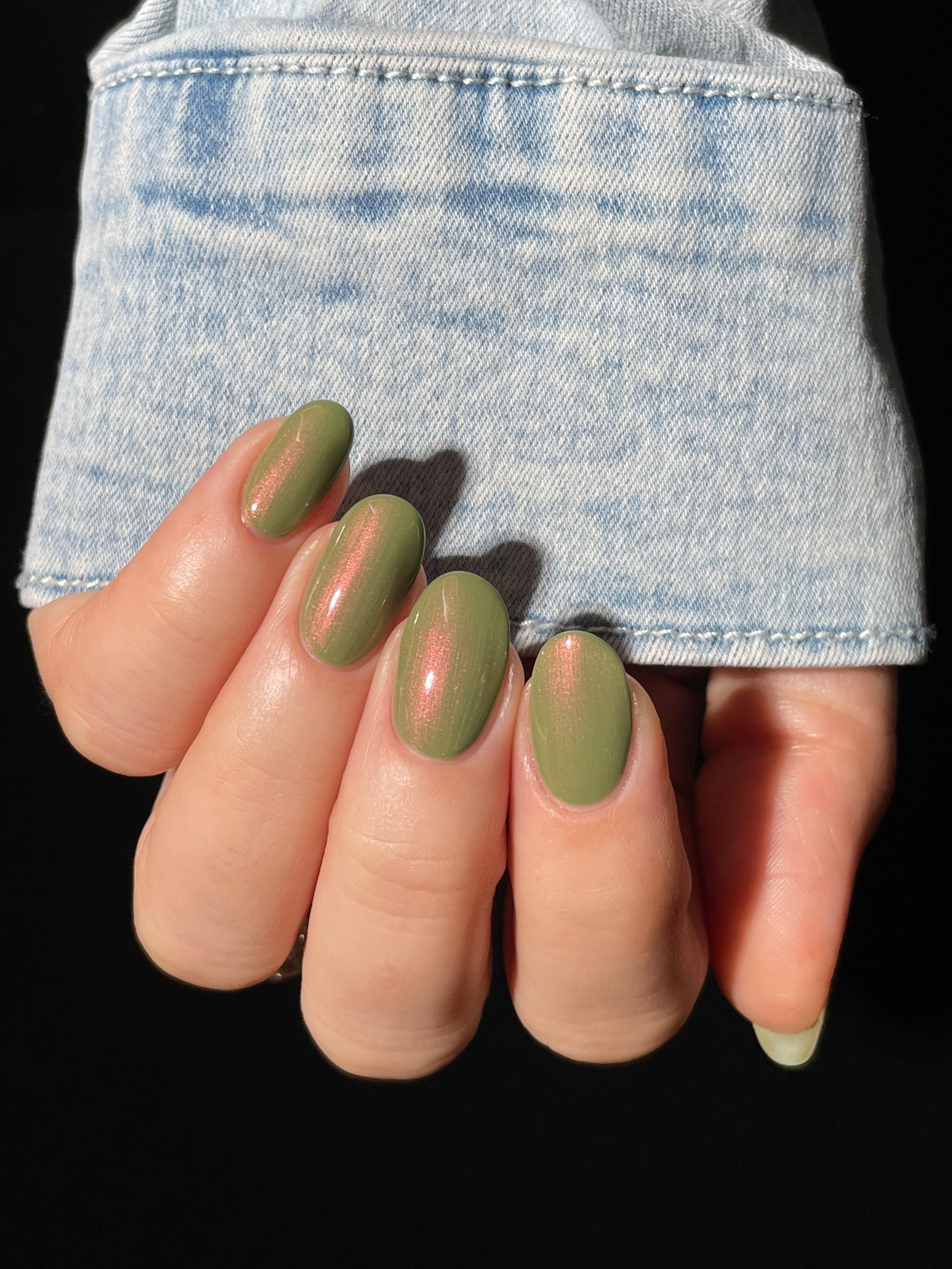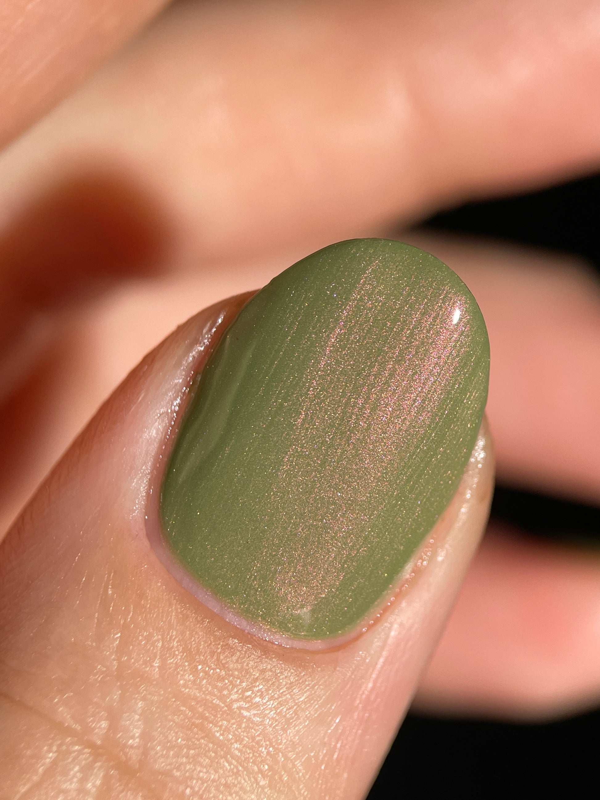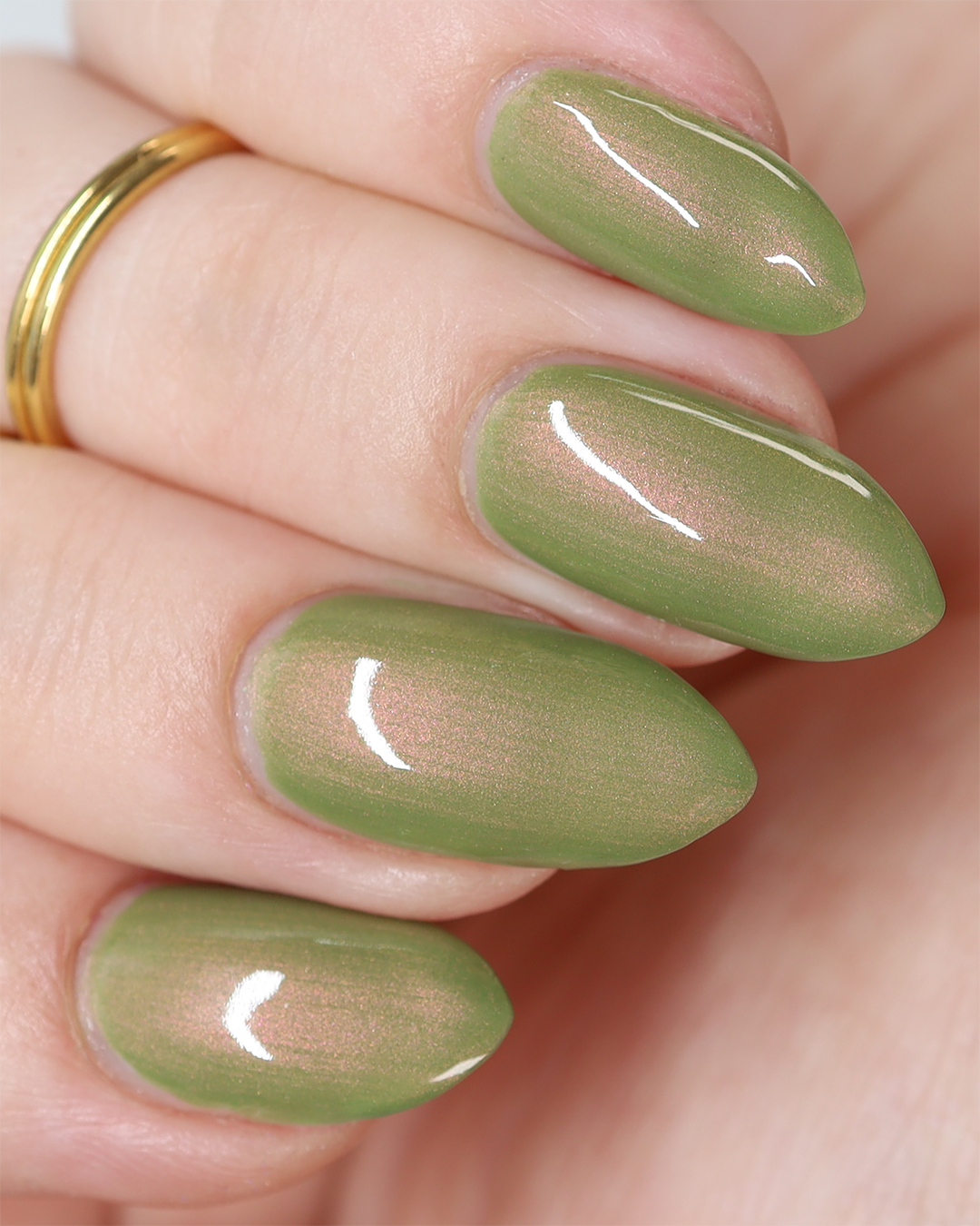 Little Froggy Pond has a pea green crelly base with a pink to orange pearlescent shimmer.