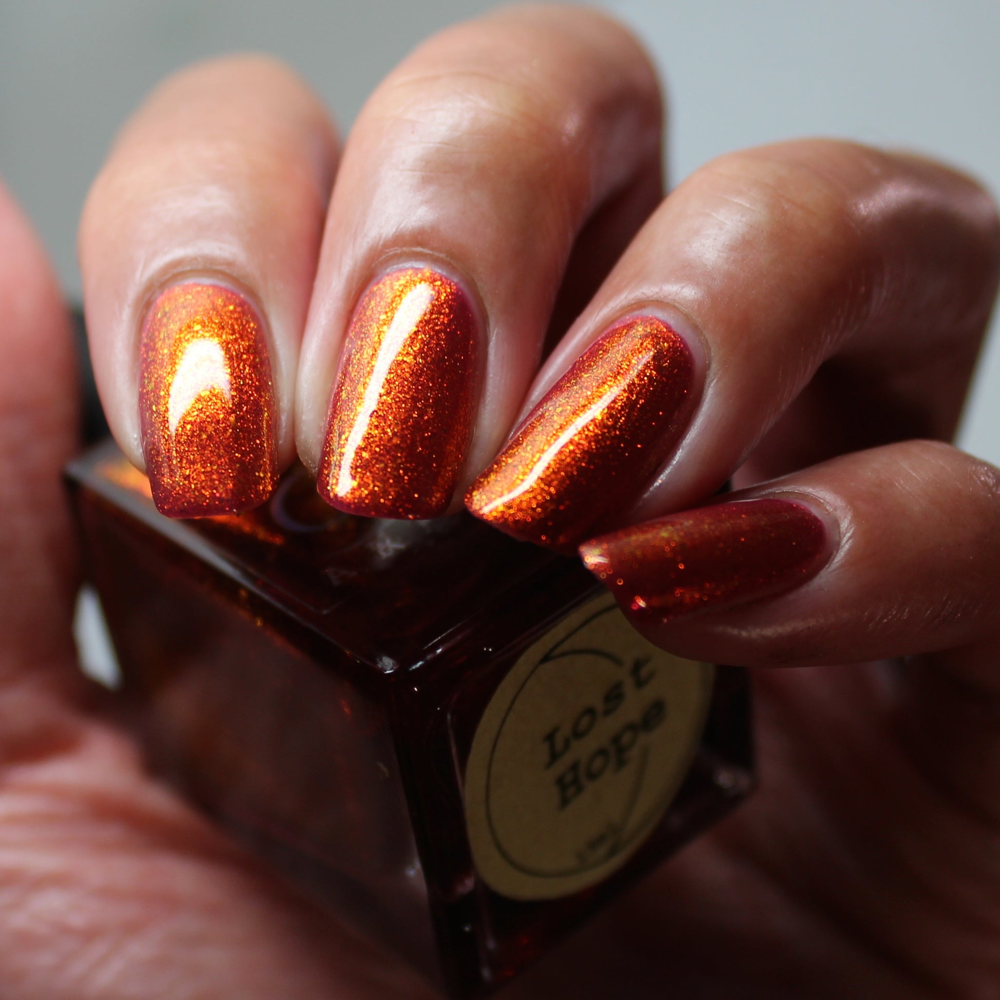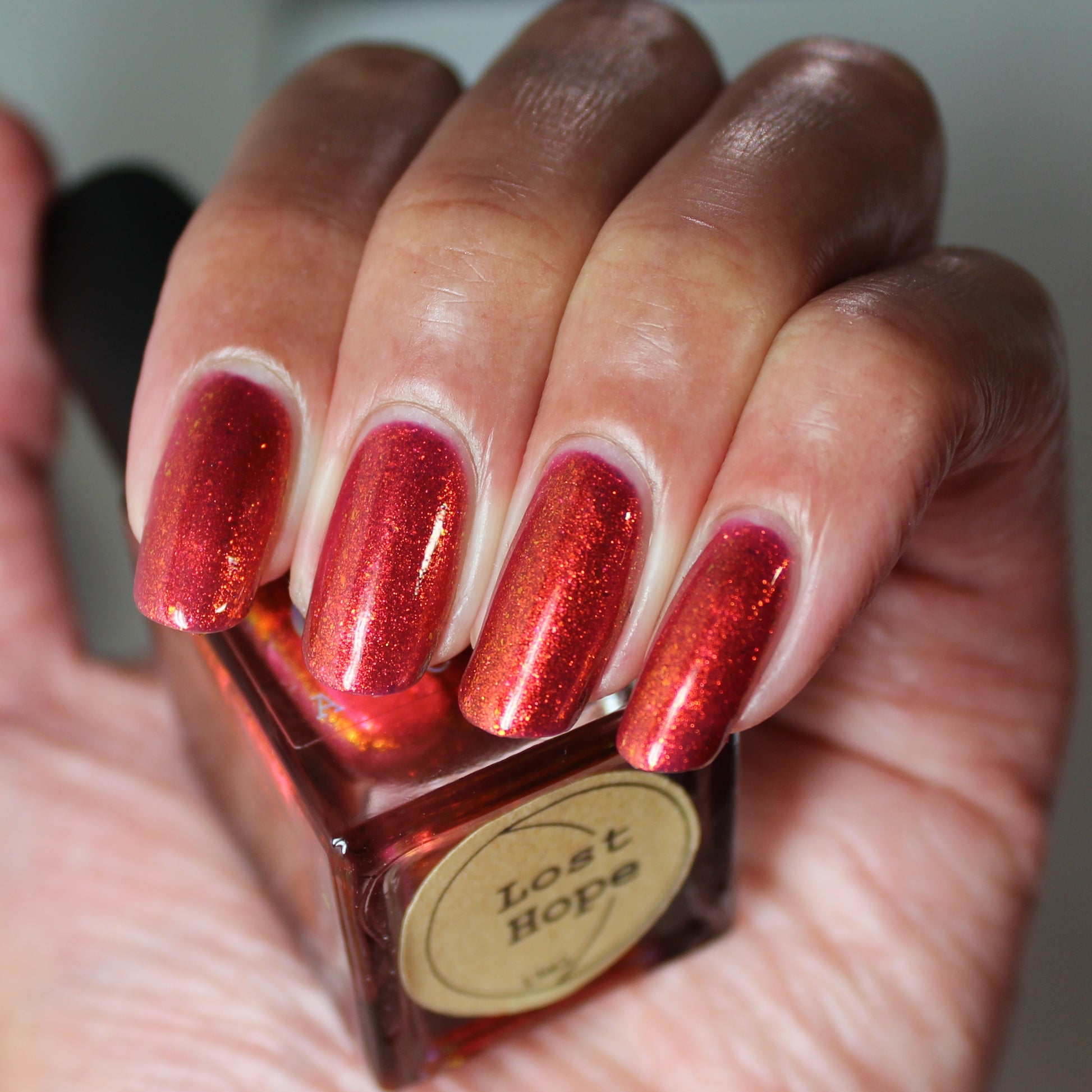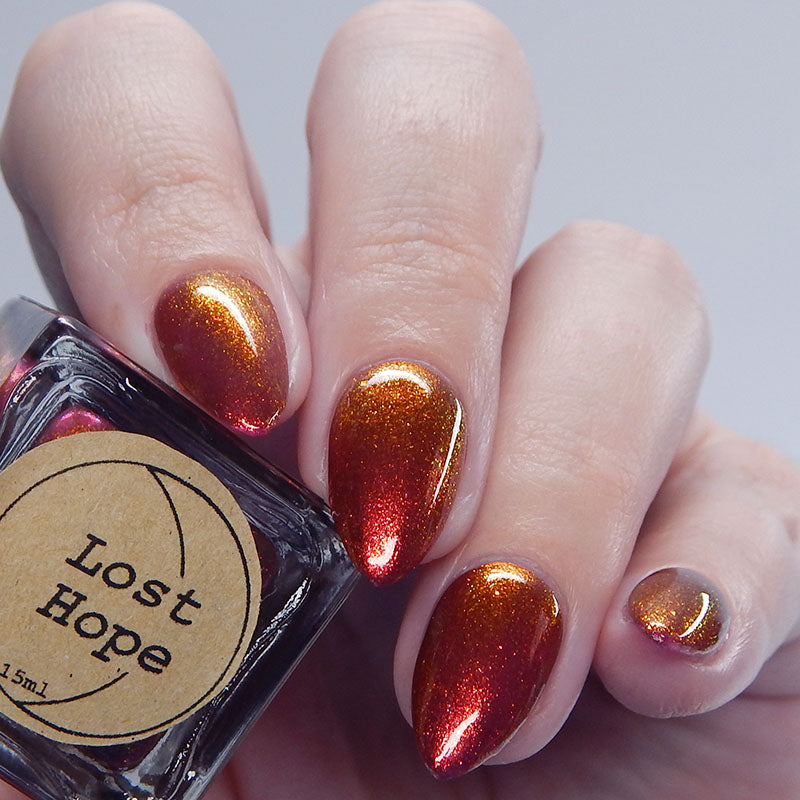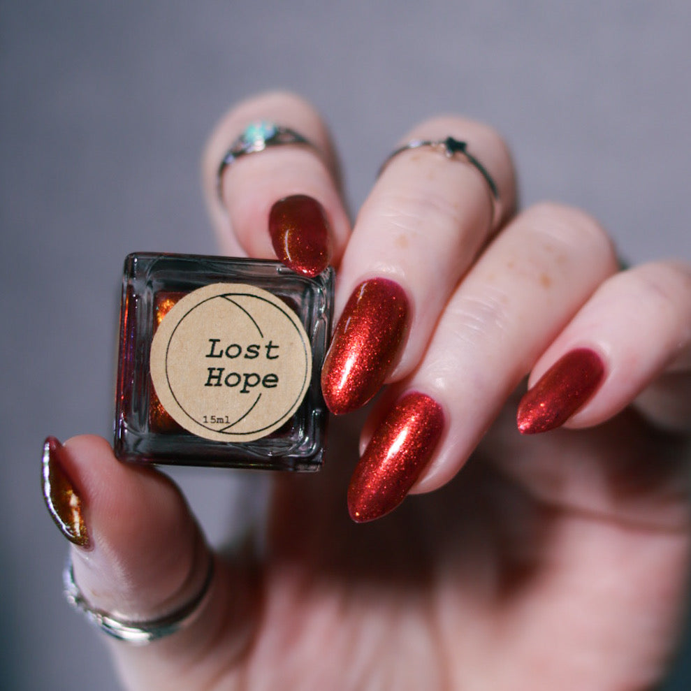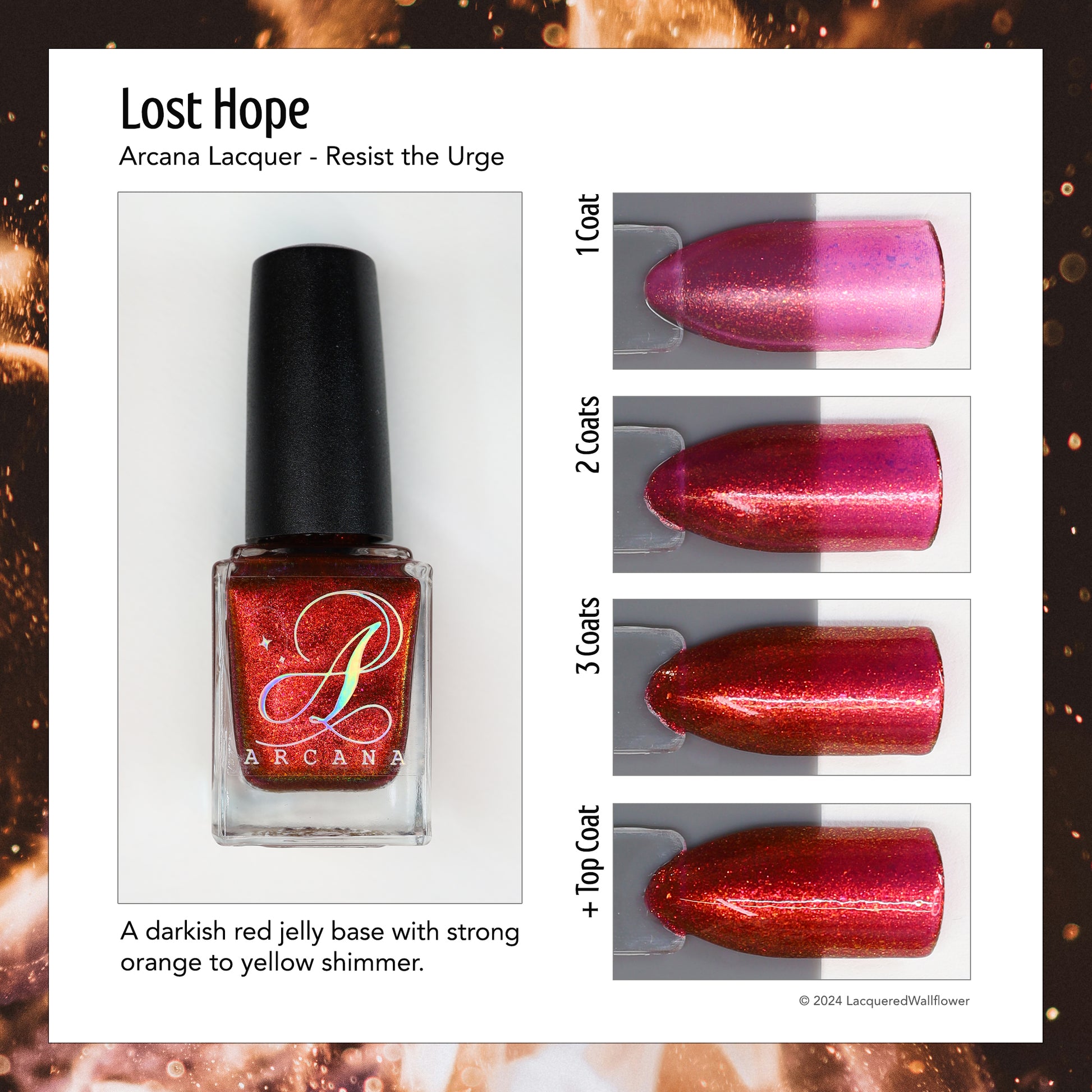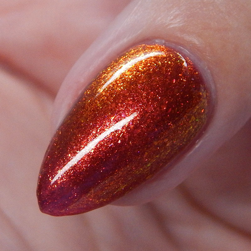 Lost Hope is a darkish red jelly base with strong orange to yellow shimmer.