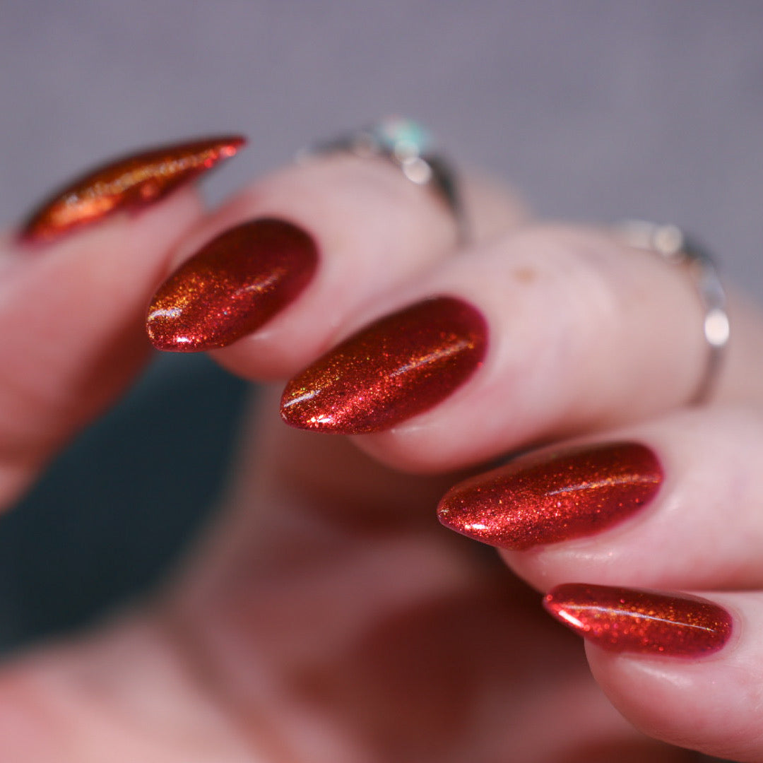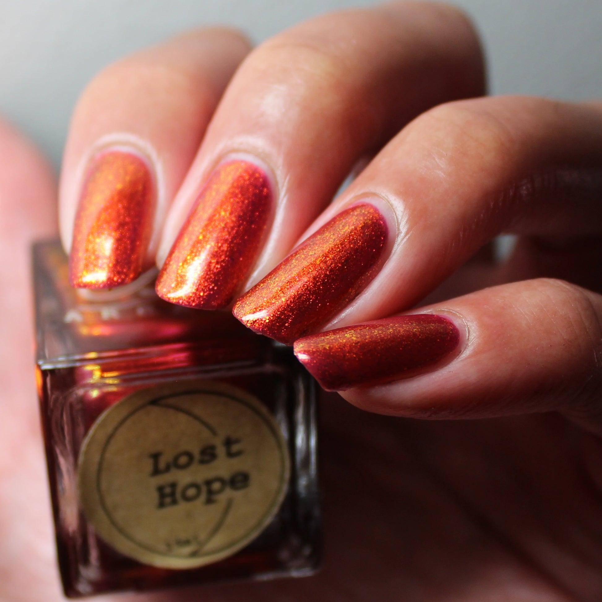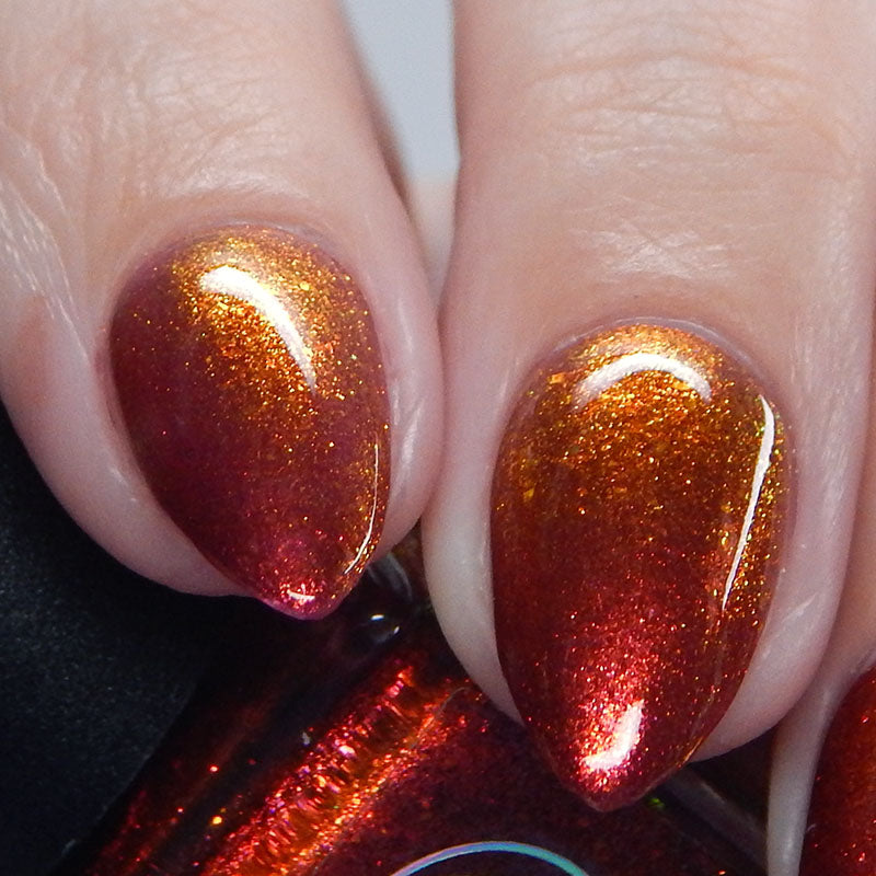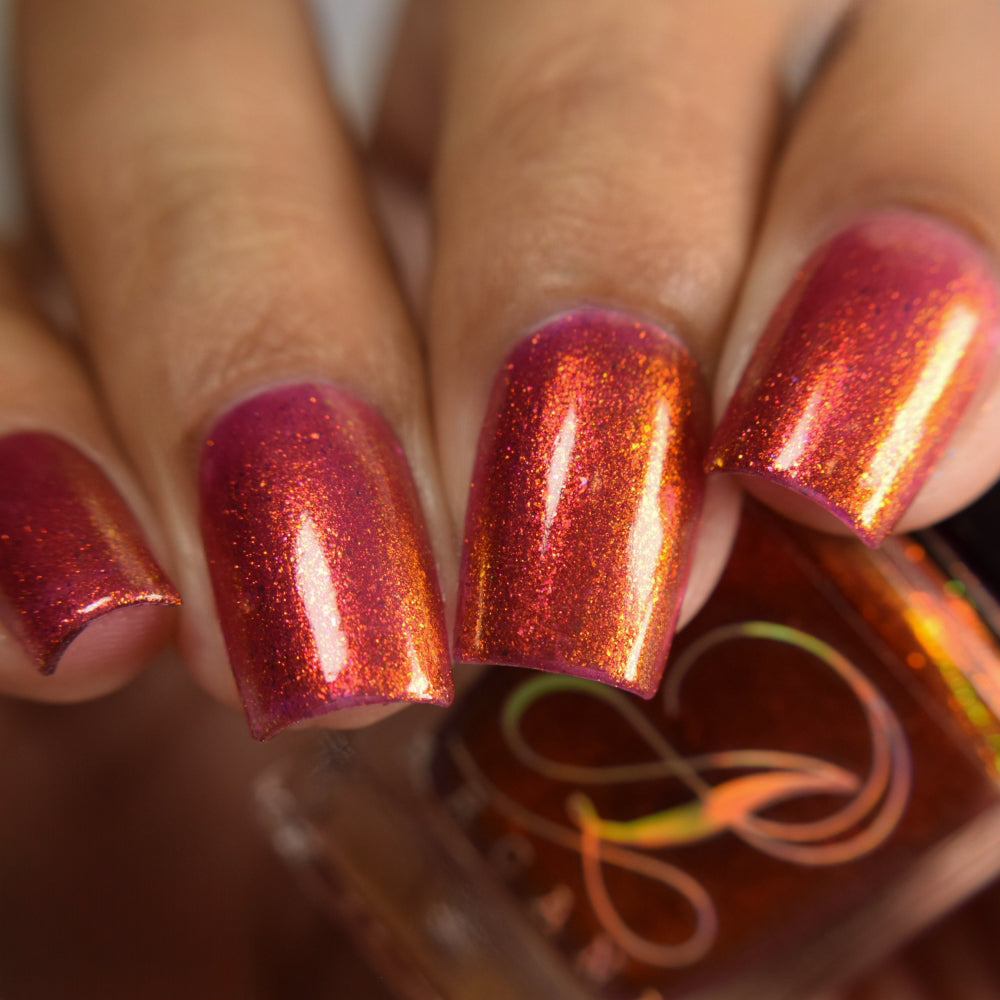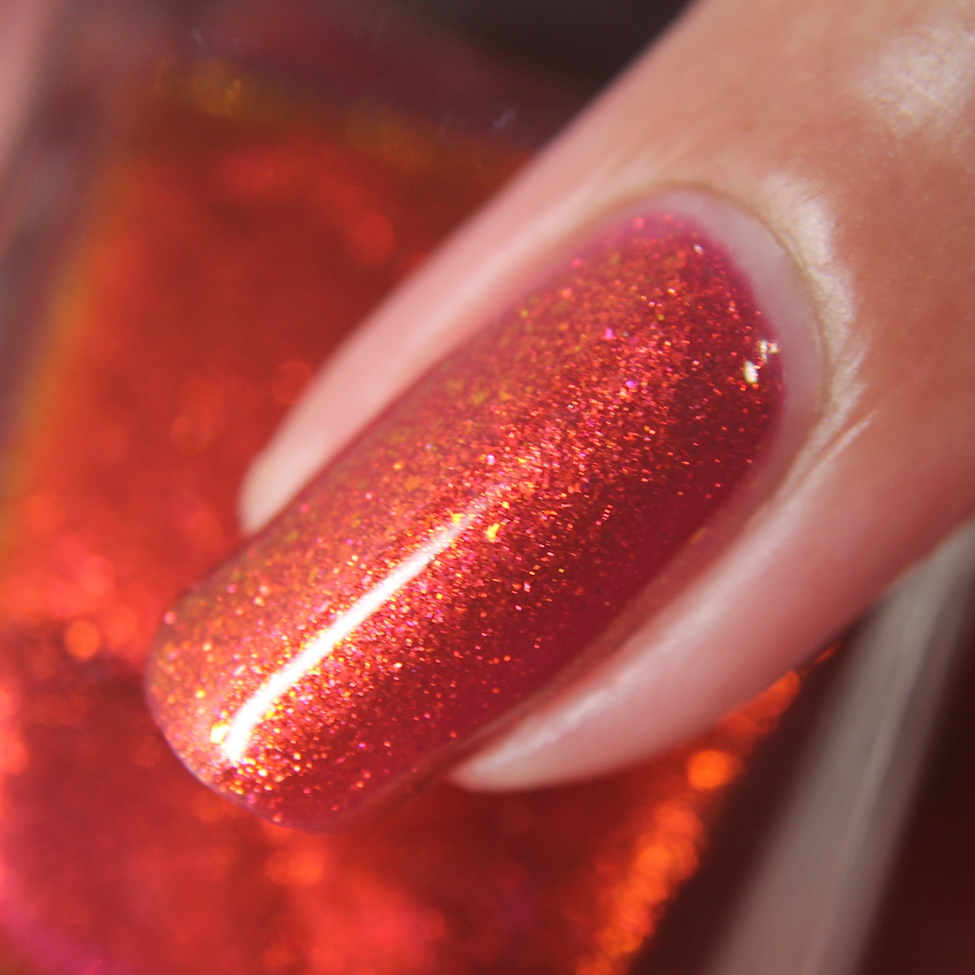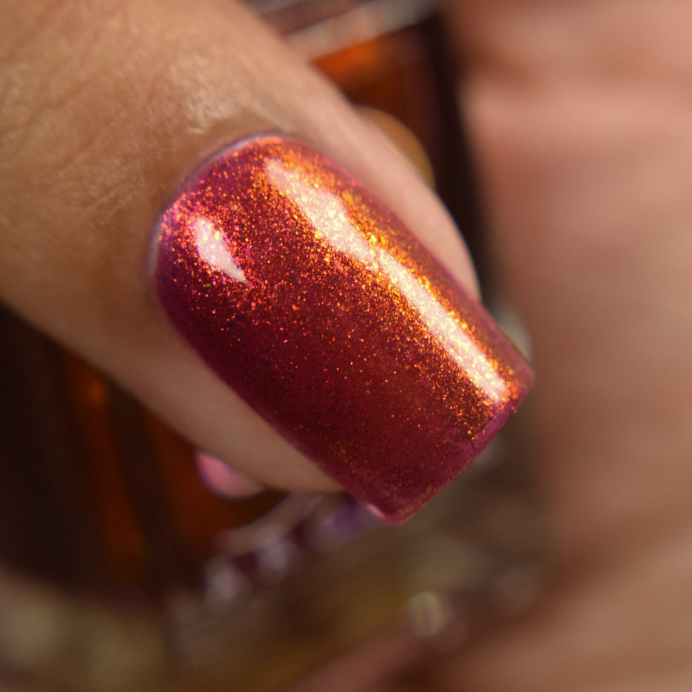 Lost Hope is a darkish red jelly base with strong orange to yellow shimmer.