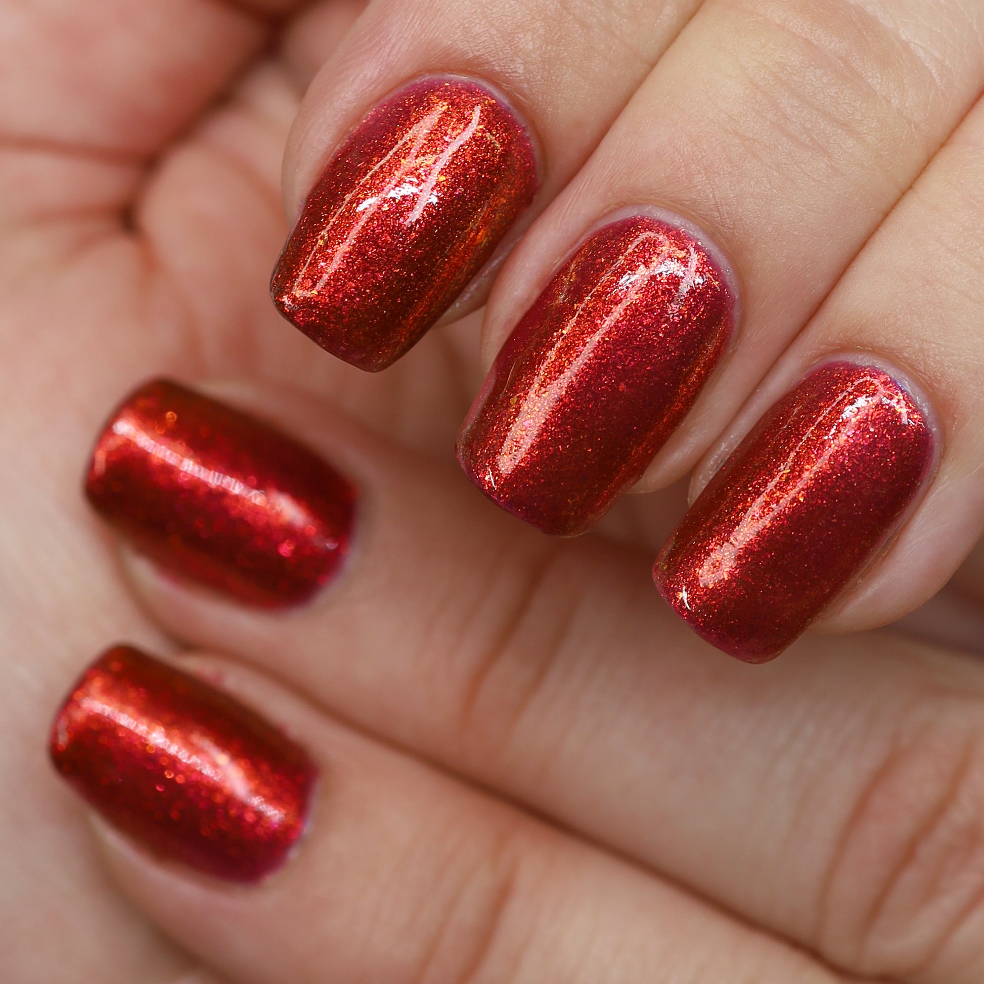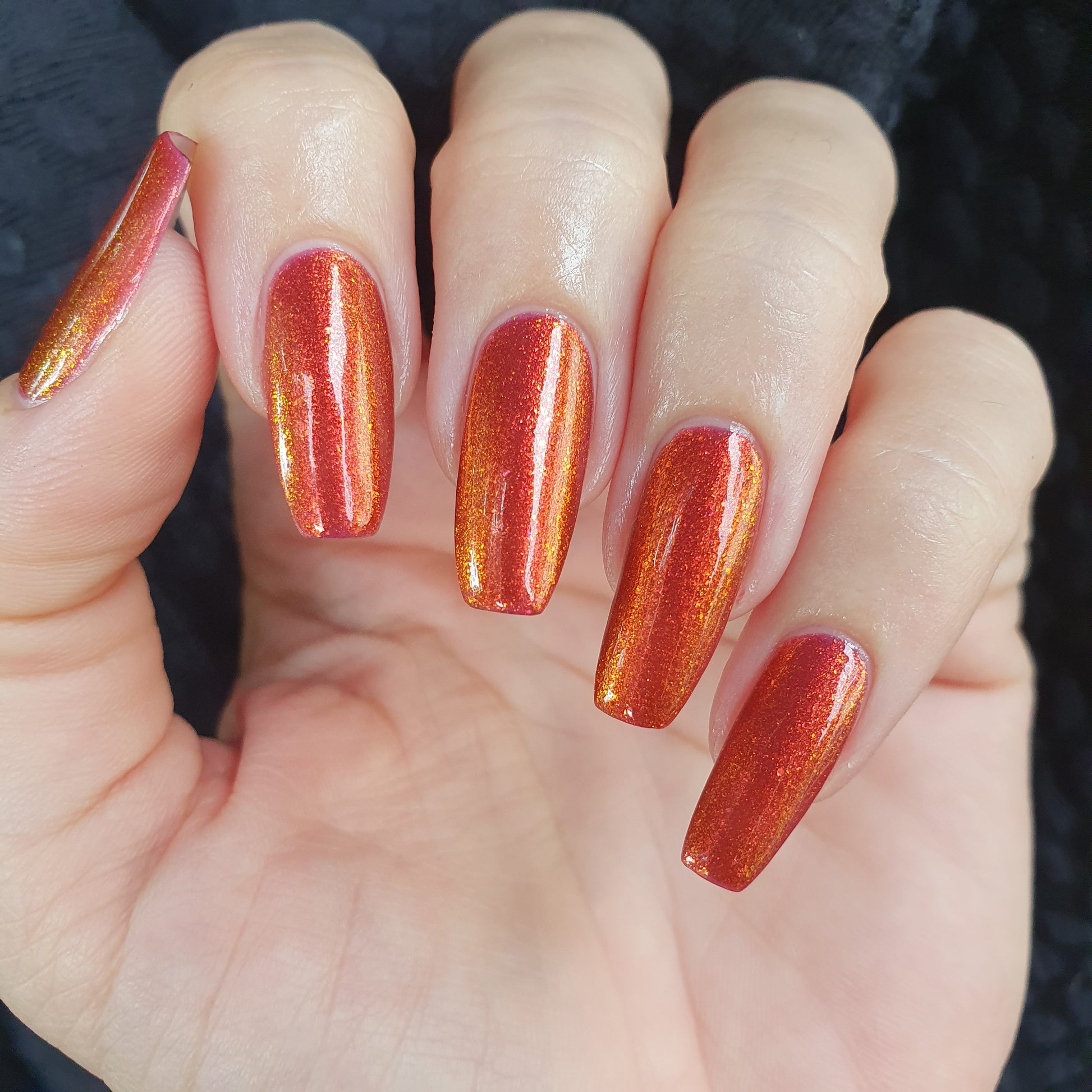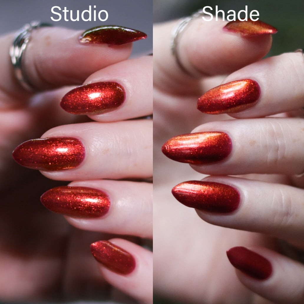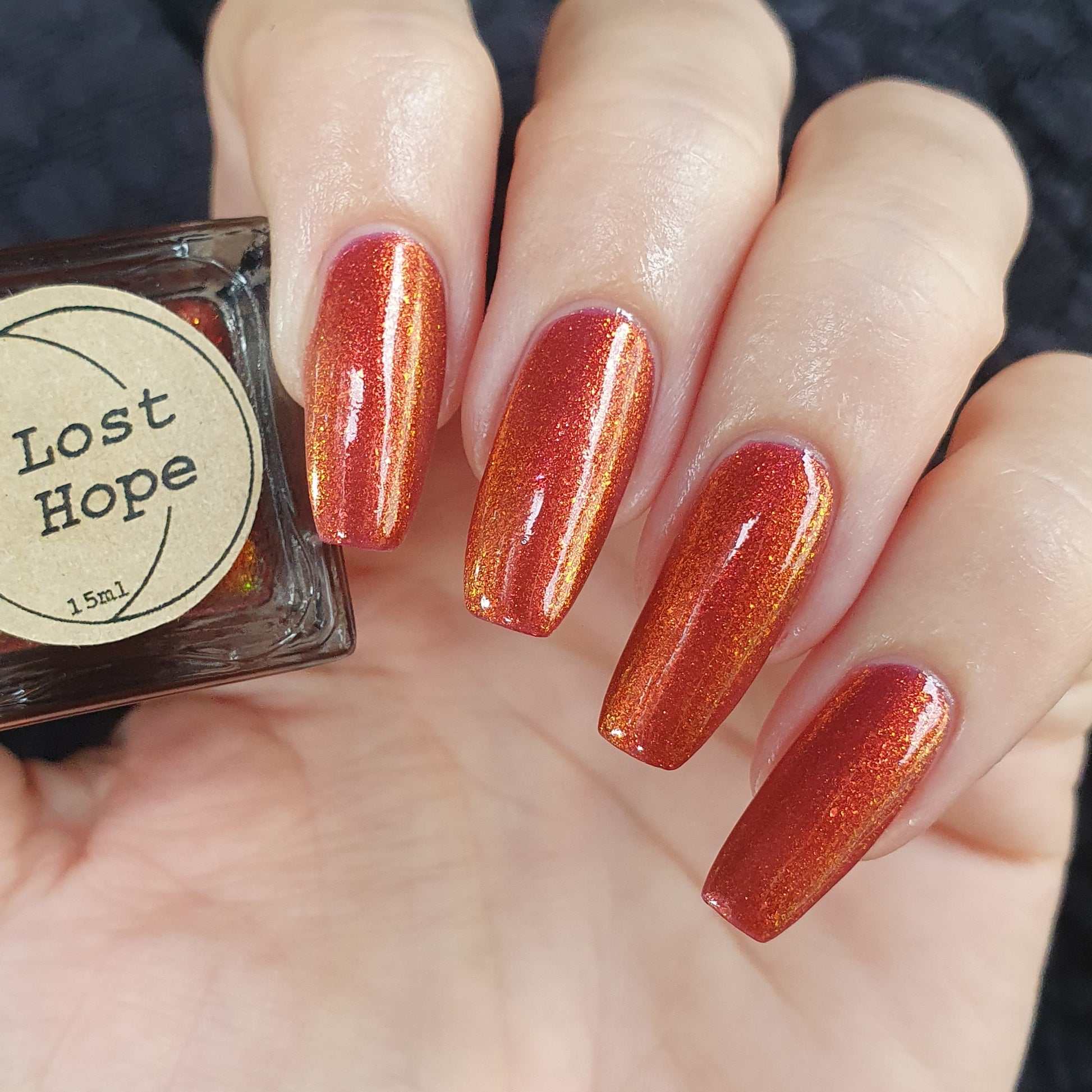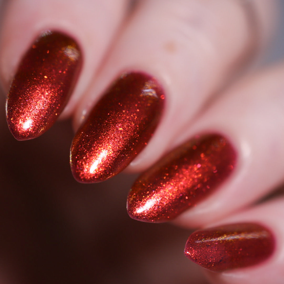 Lost Hope is a darkish red jelly base with strong orange to yellow shimmer.