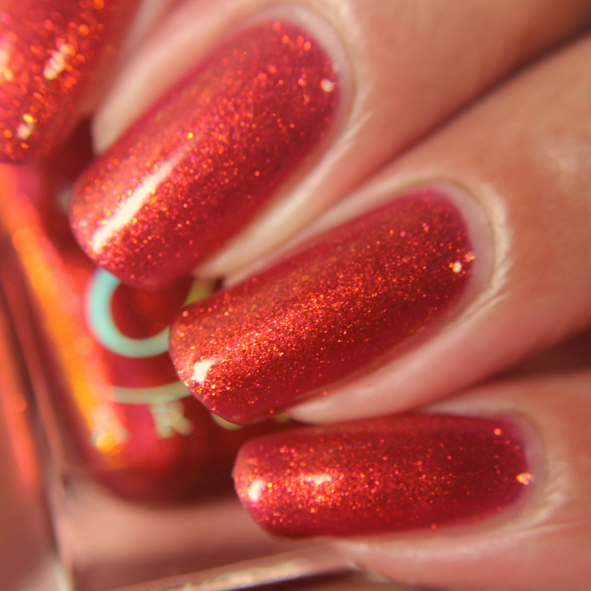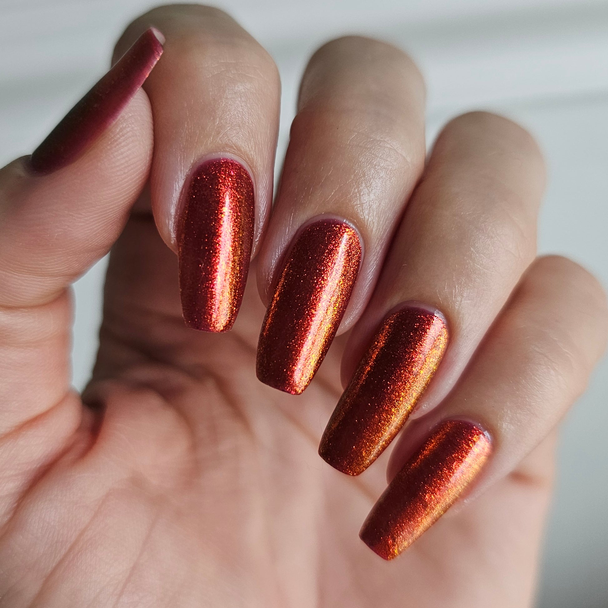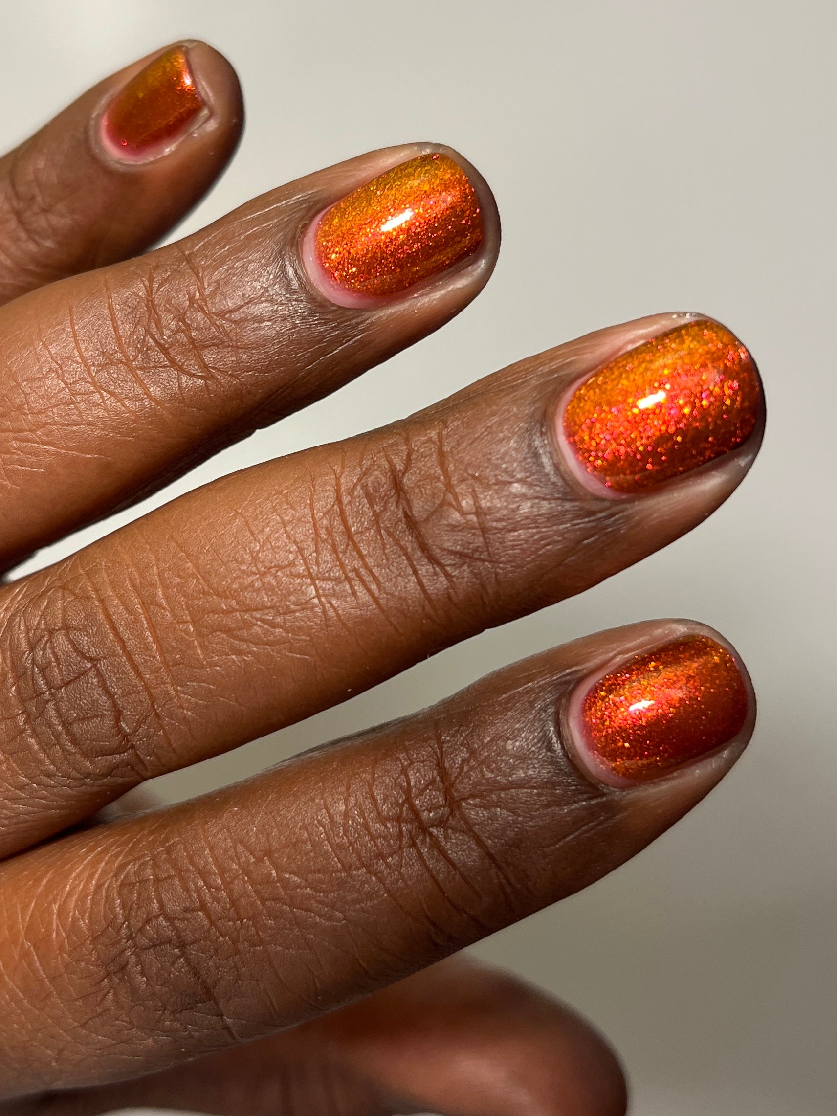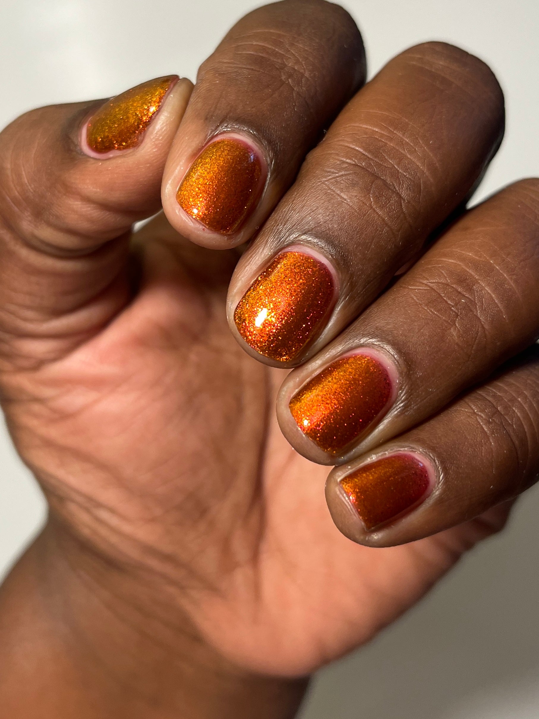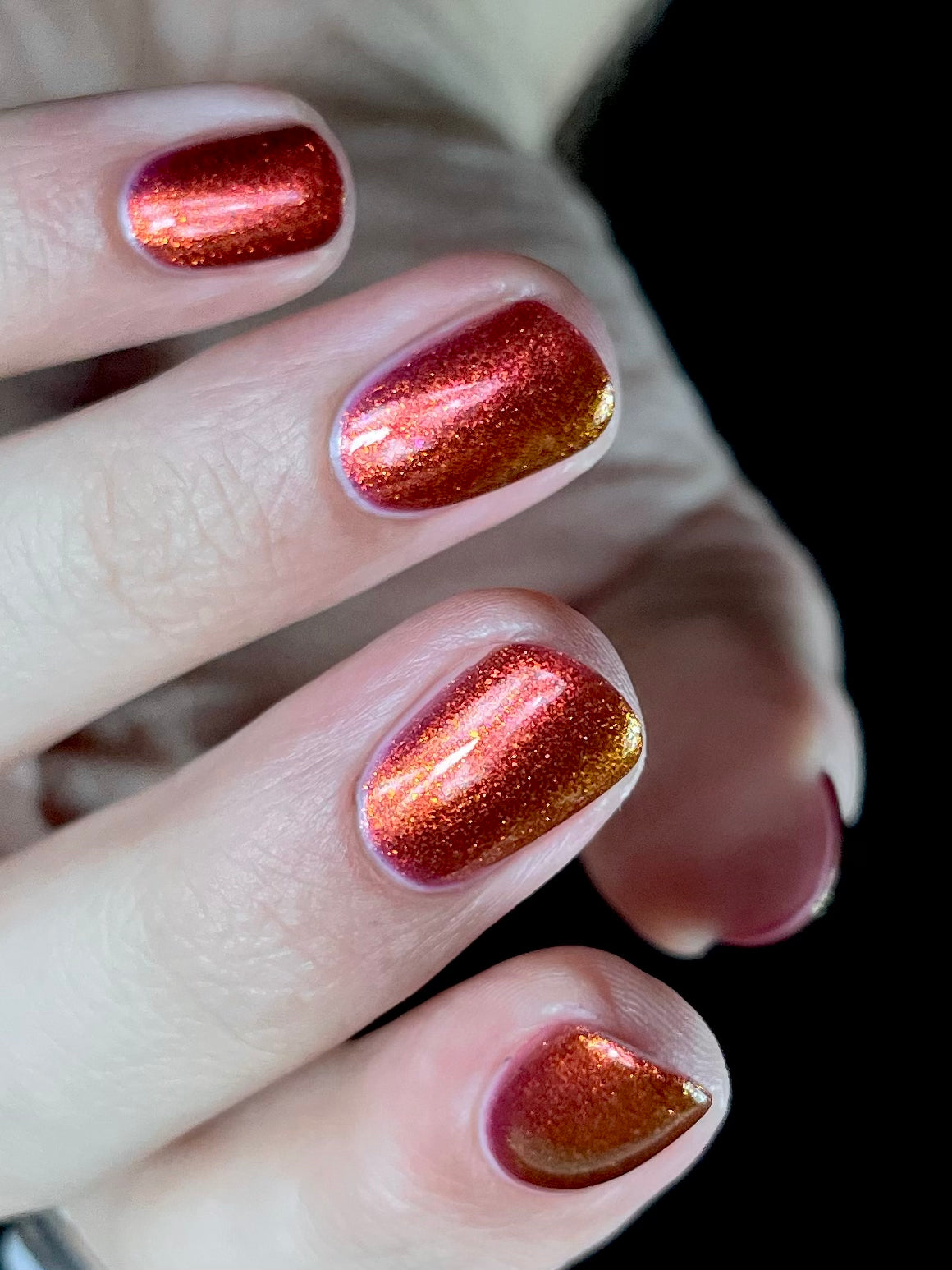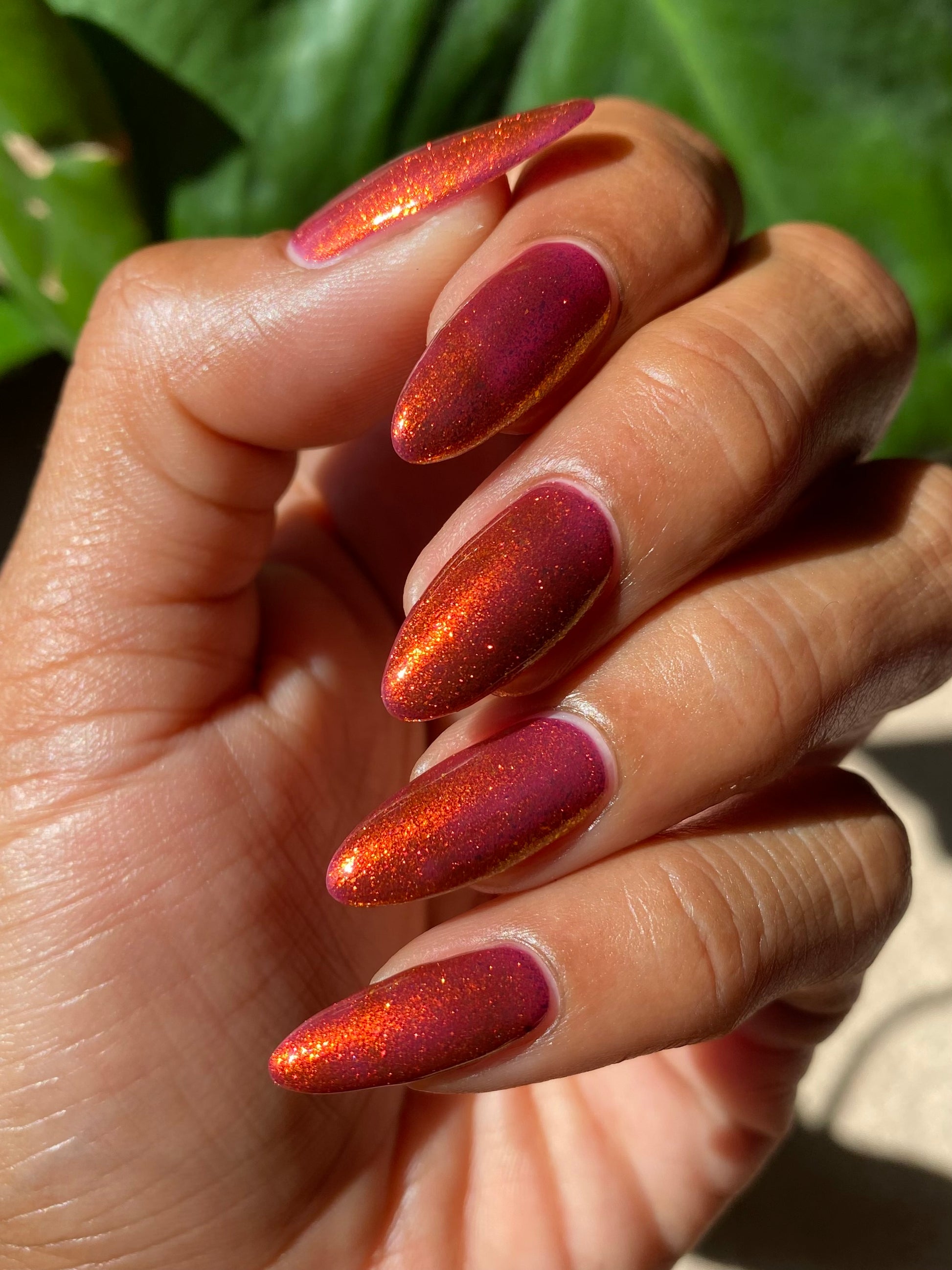 Lost Hope is a darkish red jelly base with strong orange to yellow shimmer.