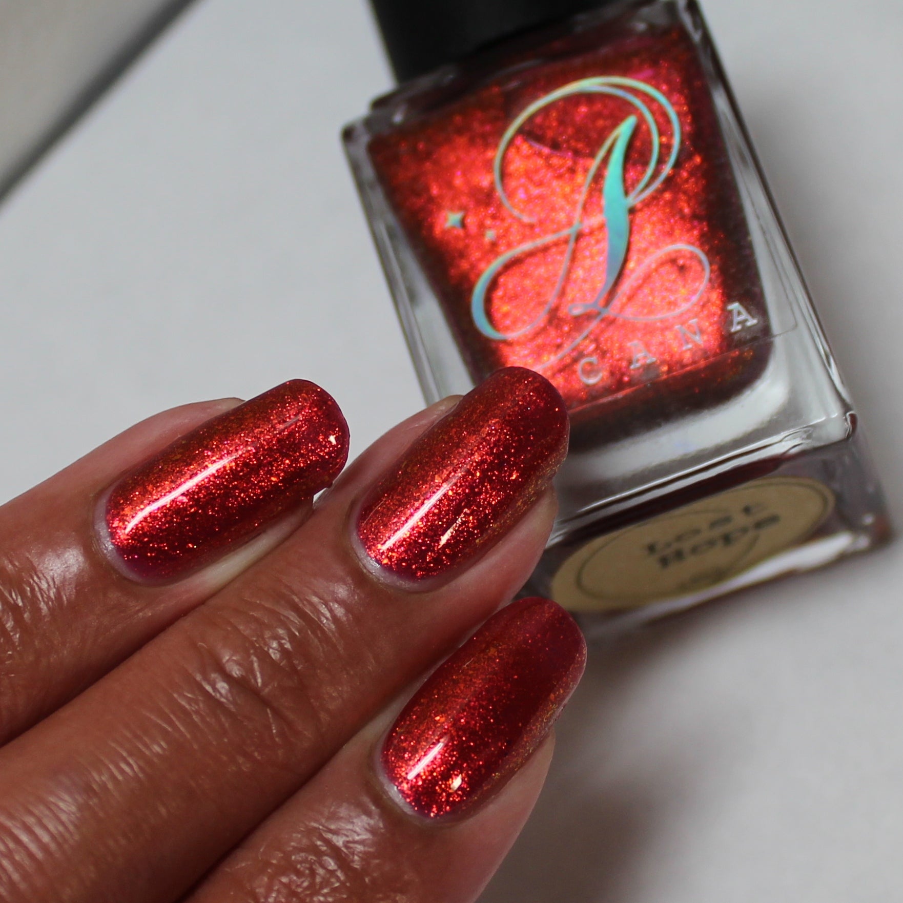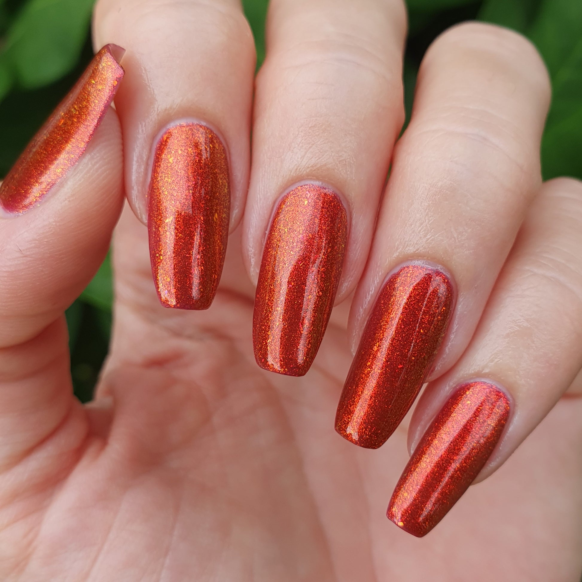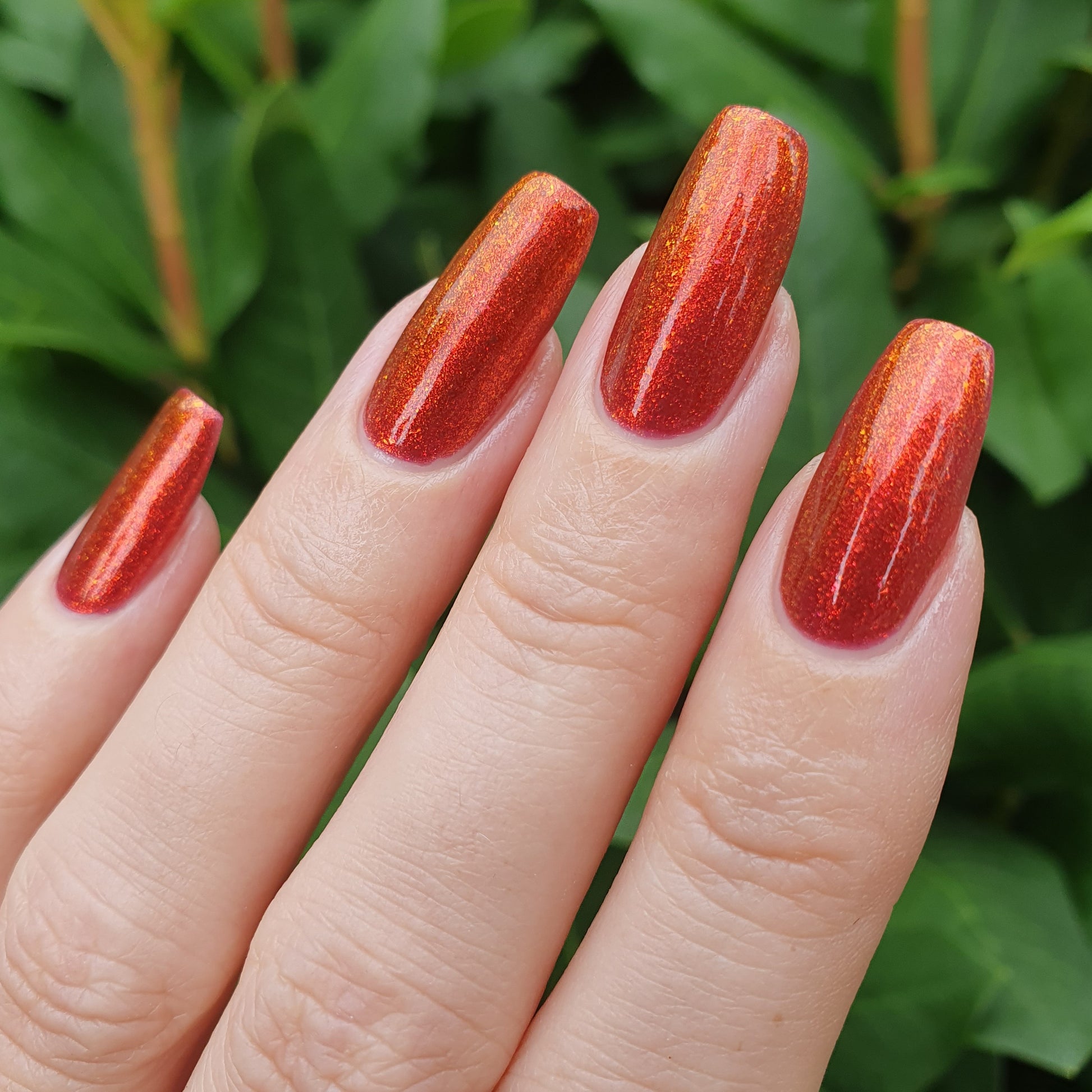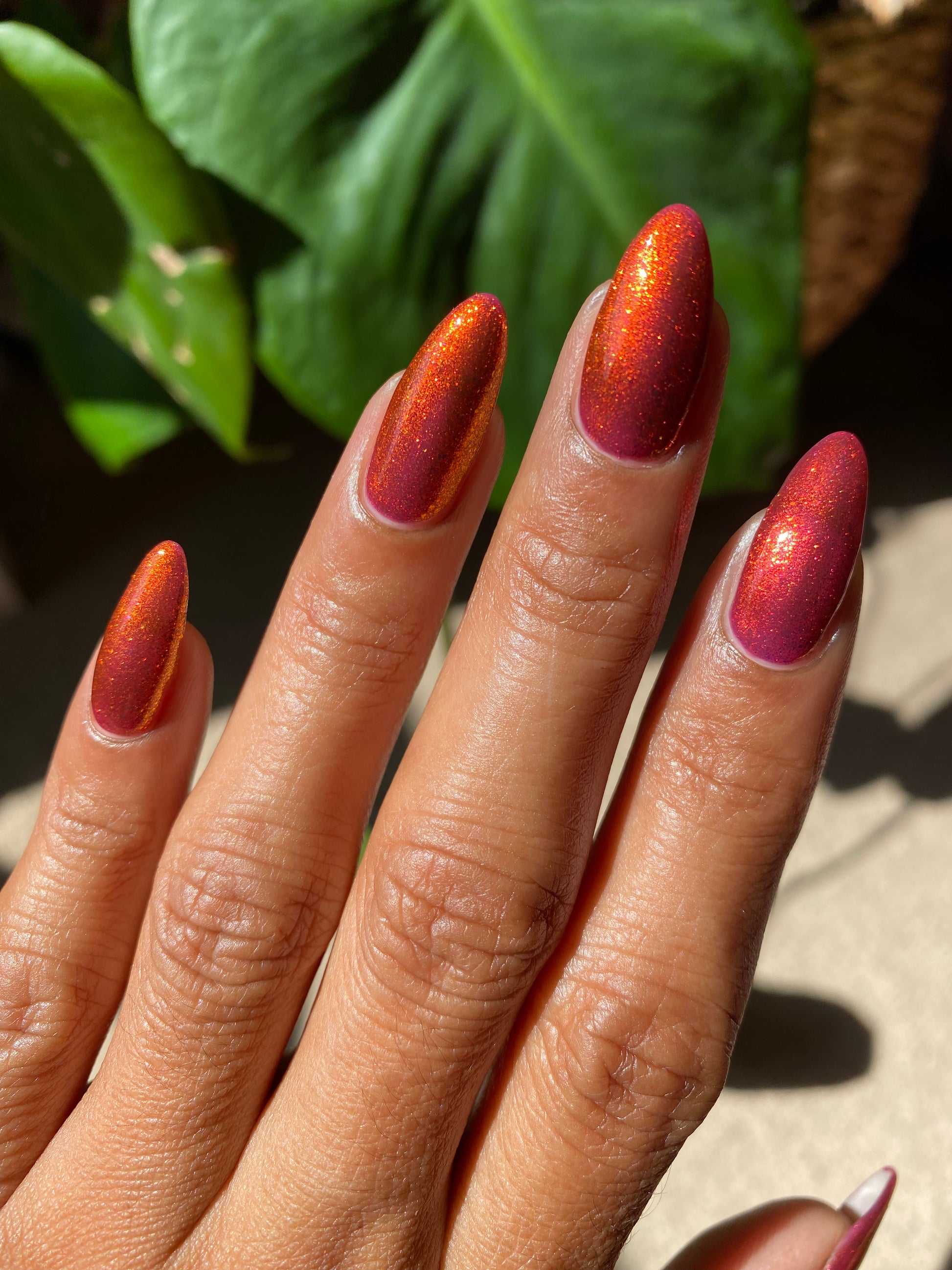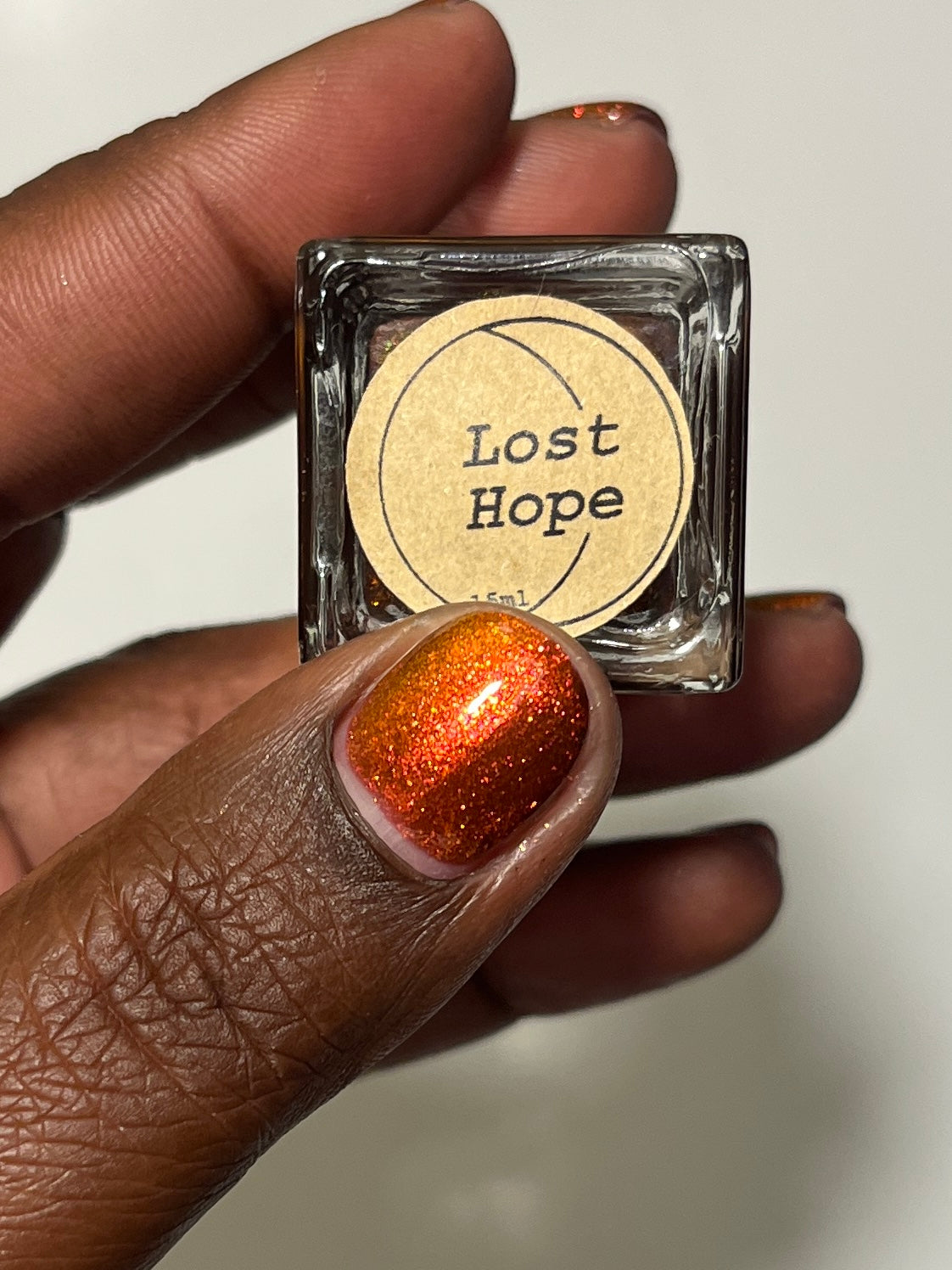 Lost Hope is a darkish red jelly base with strong orange to yellow shimmer.