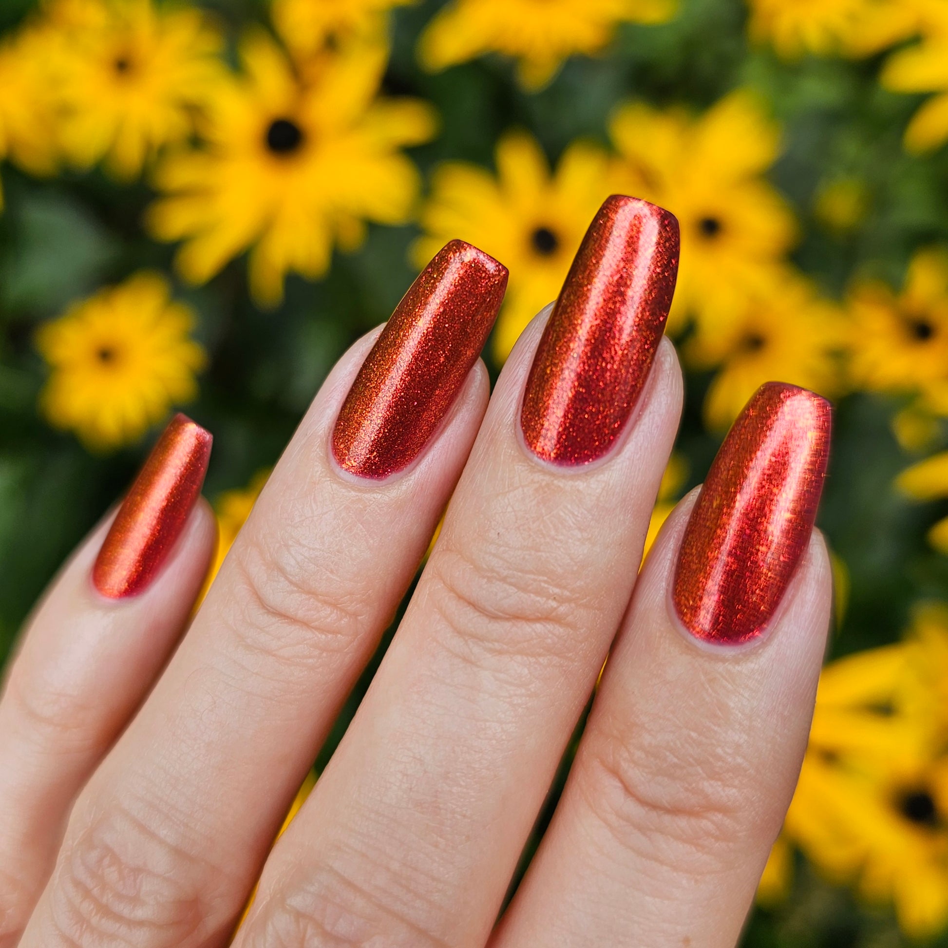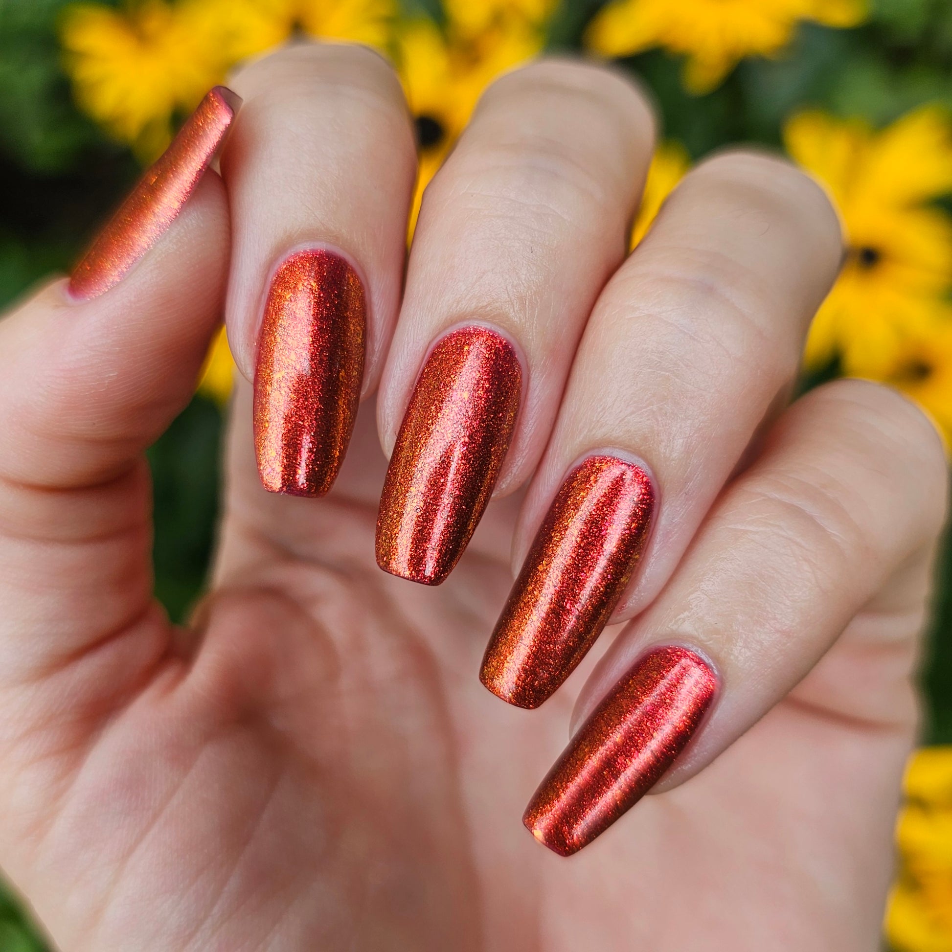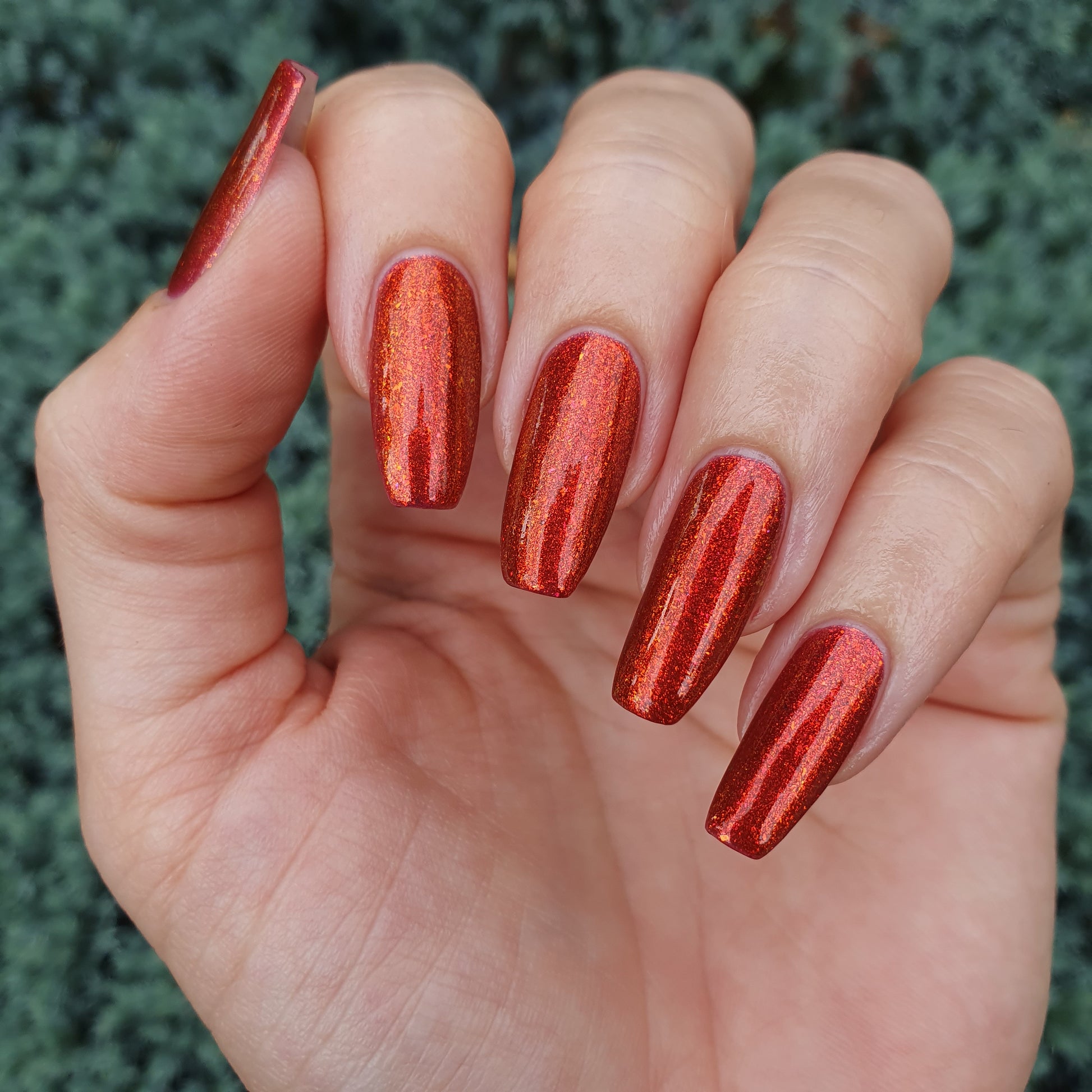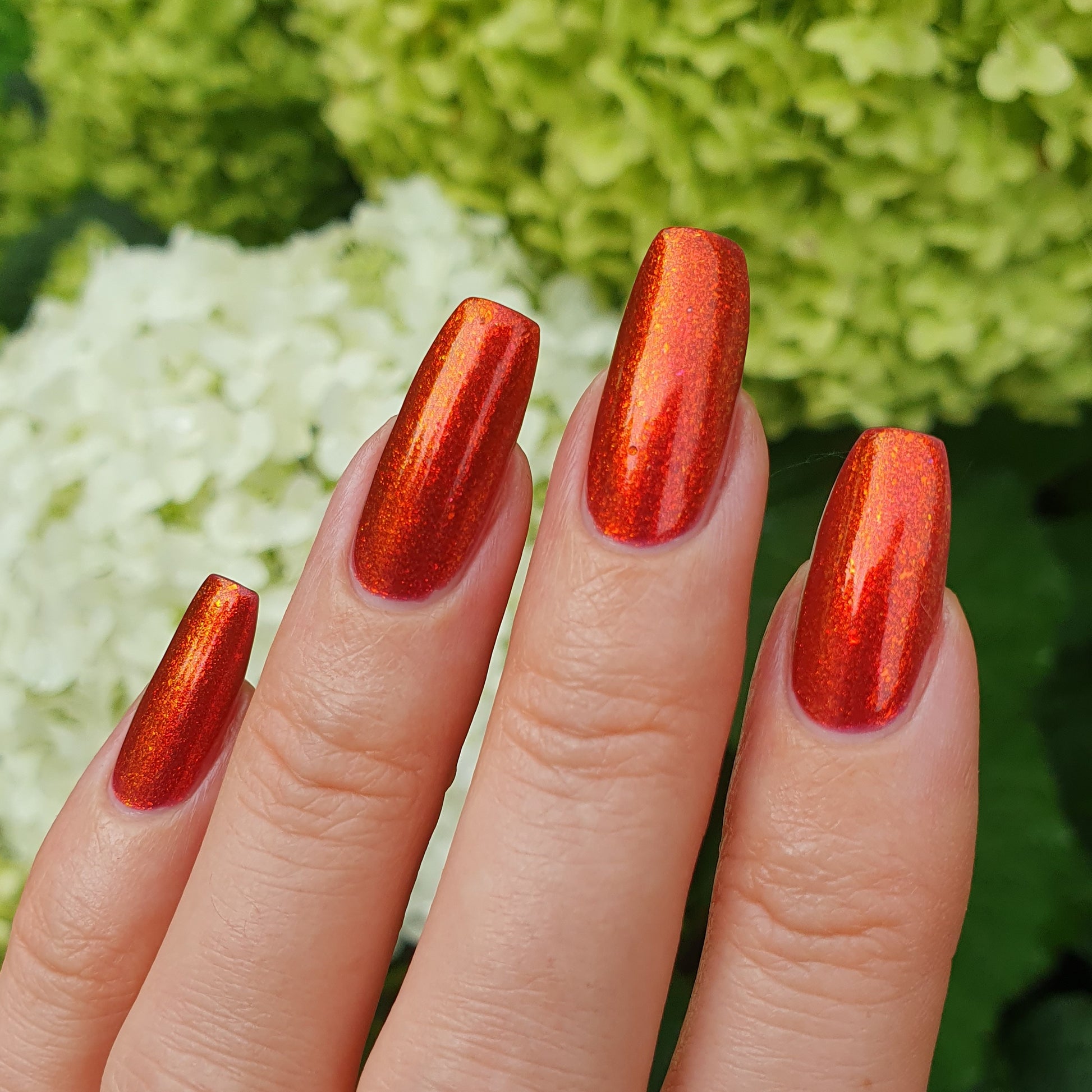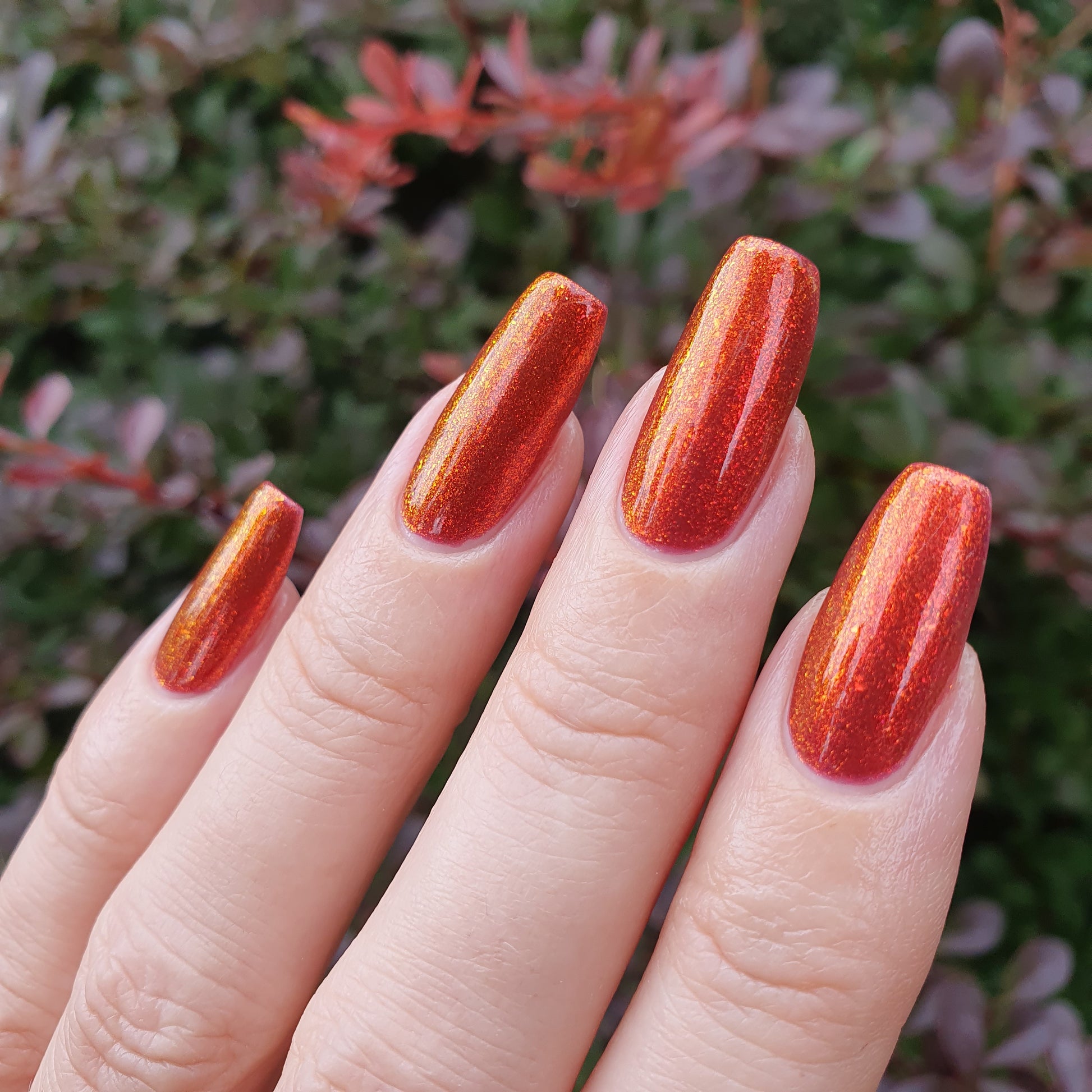 Lost Hope is a darkish red jelly base with strong orange to yellow shimmer.