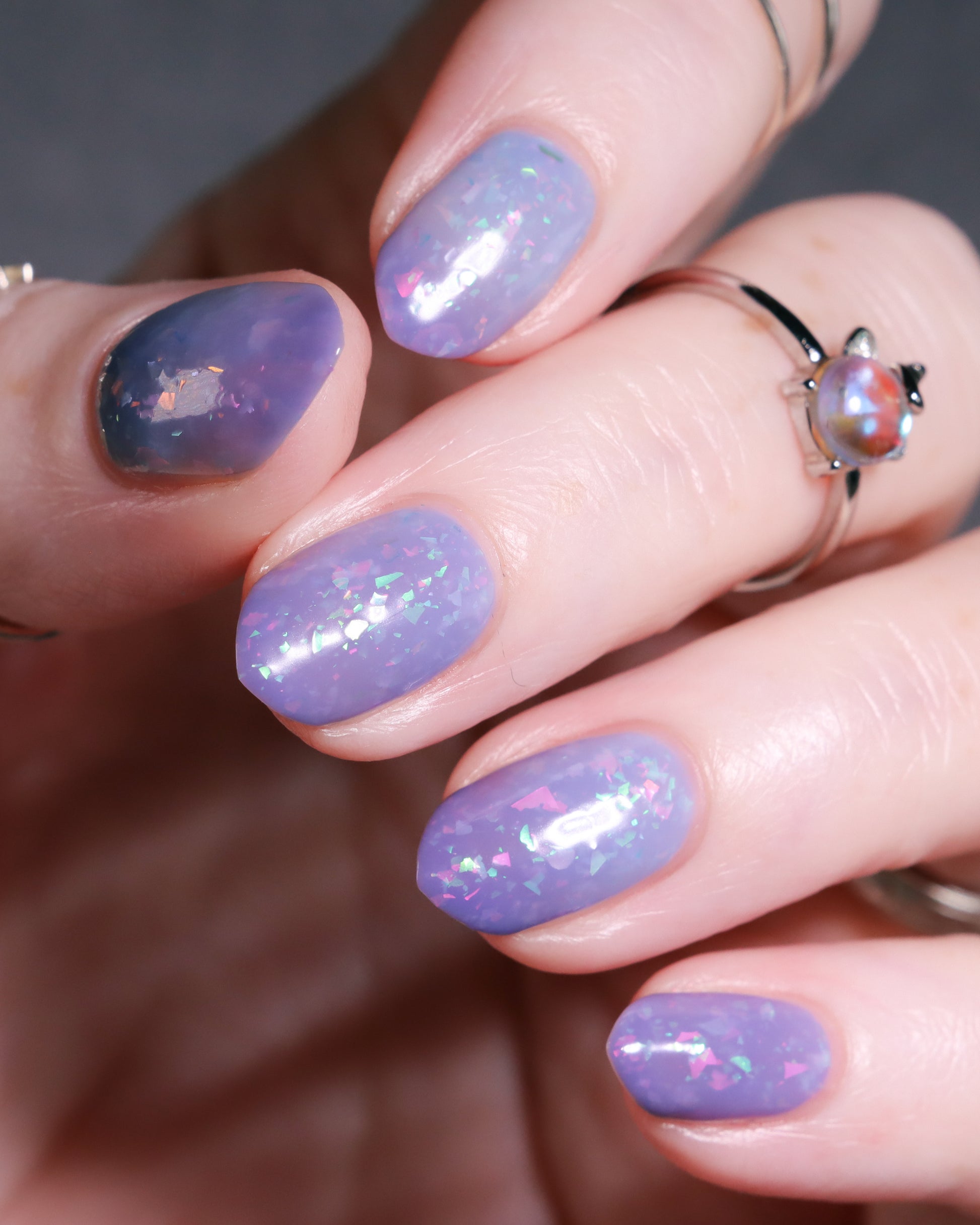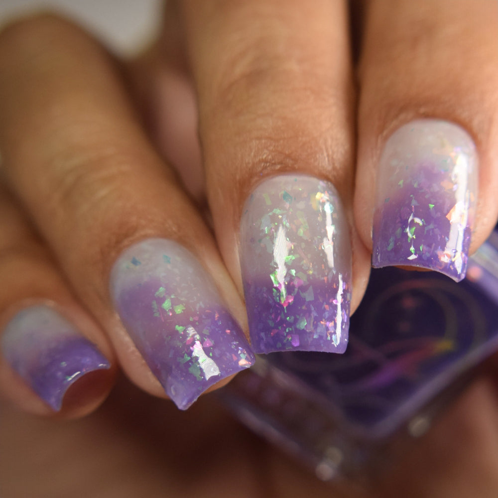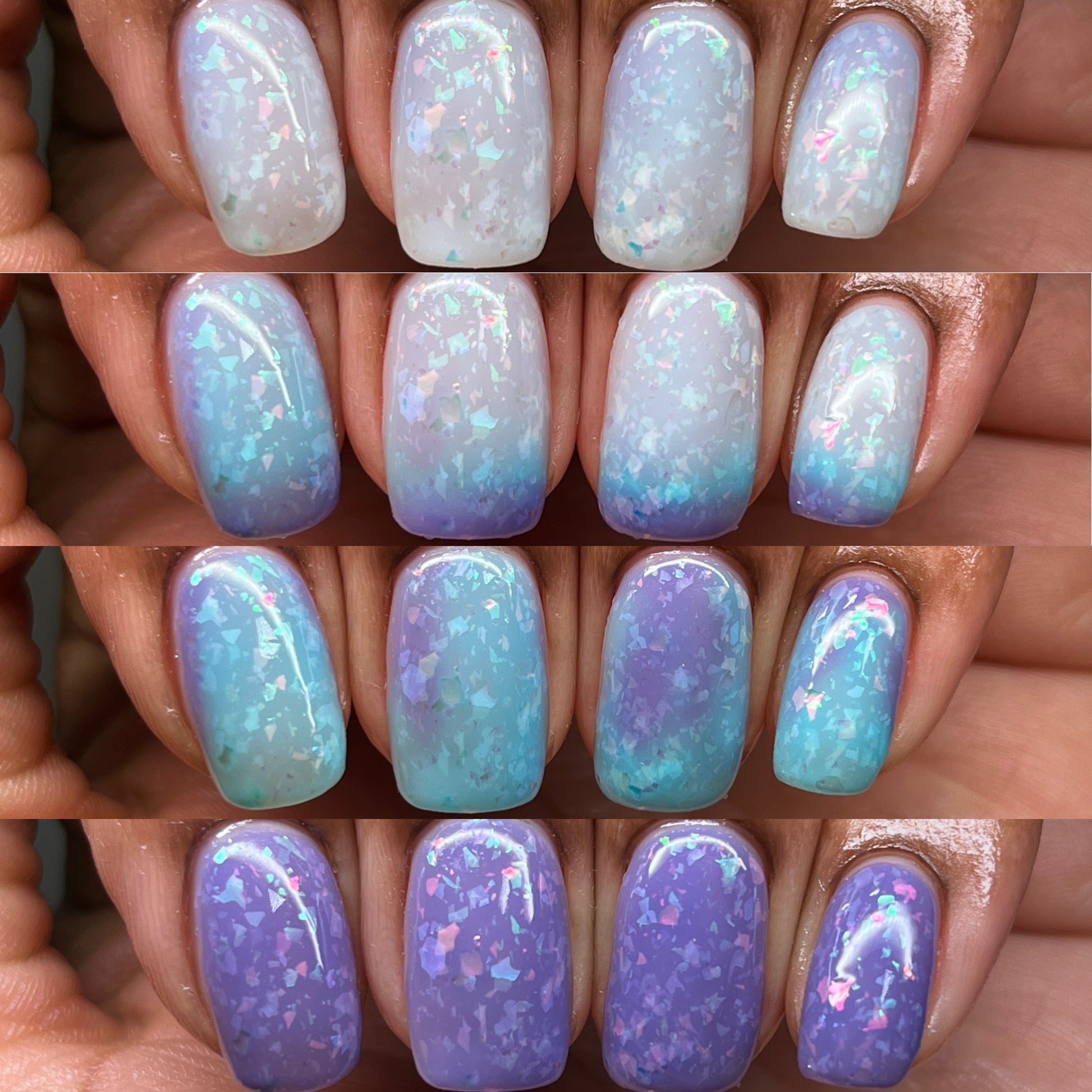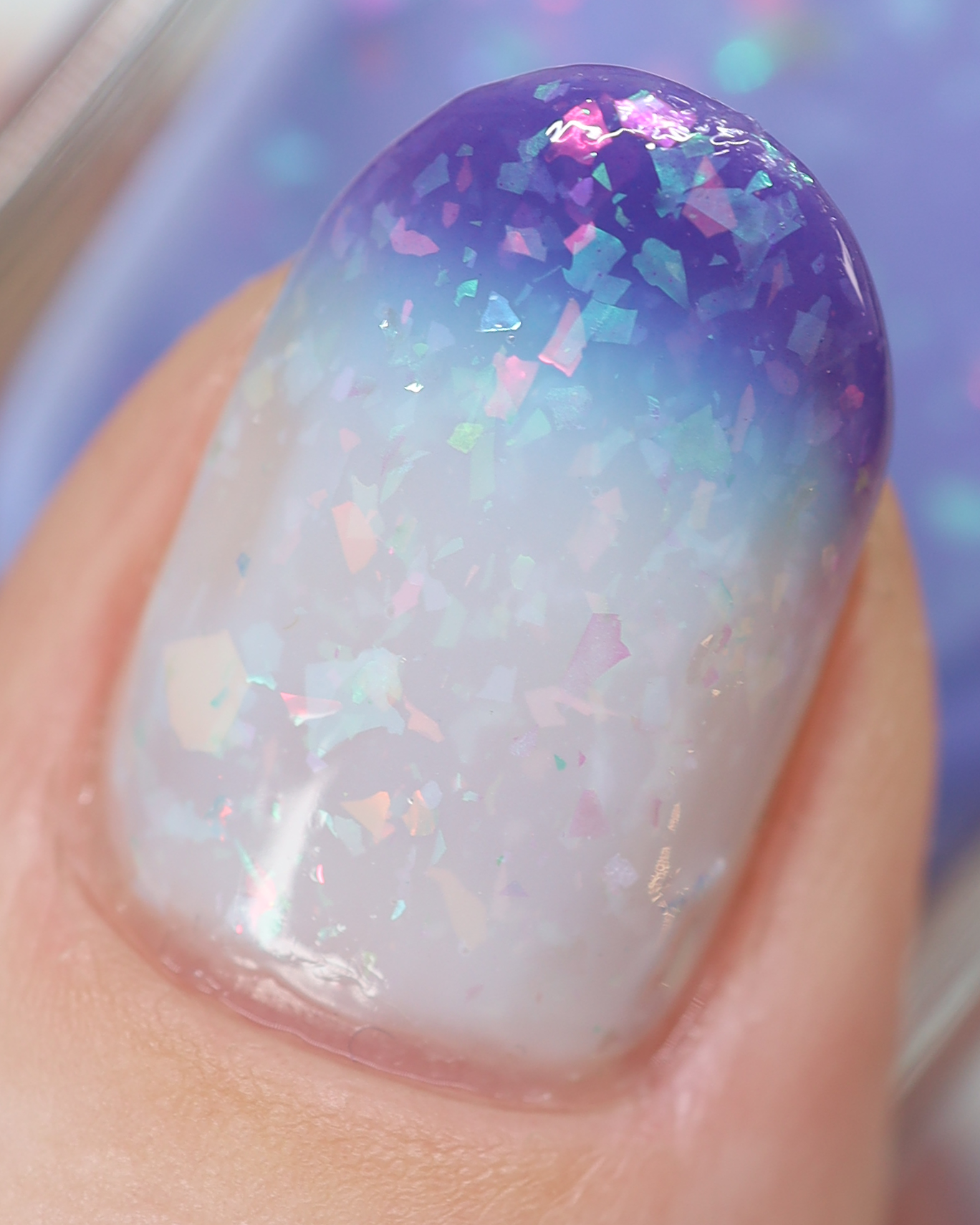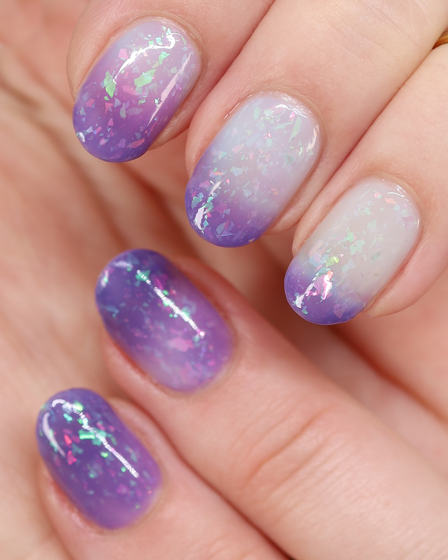 This polish features a thermal base that goes from light lavendar (cold) to sky blue (warm) to white (hot). It also has both pink and green flakes!