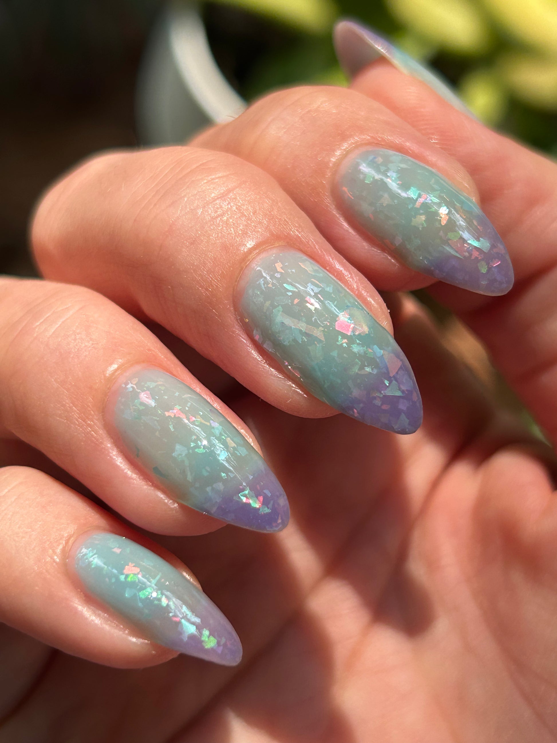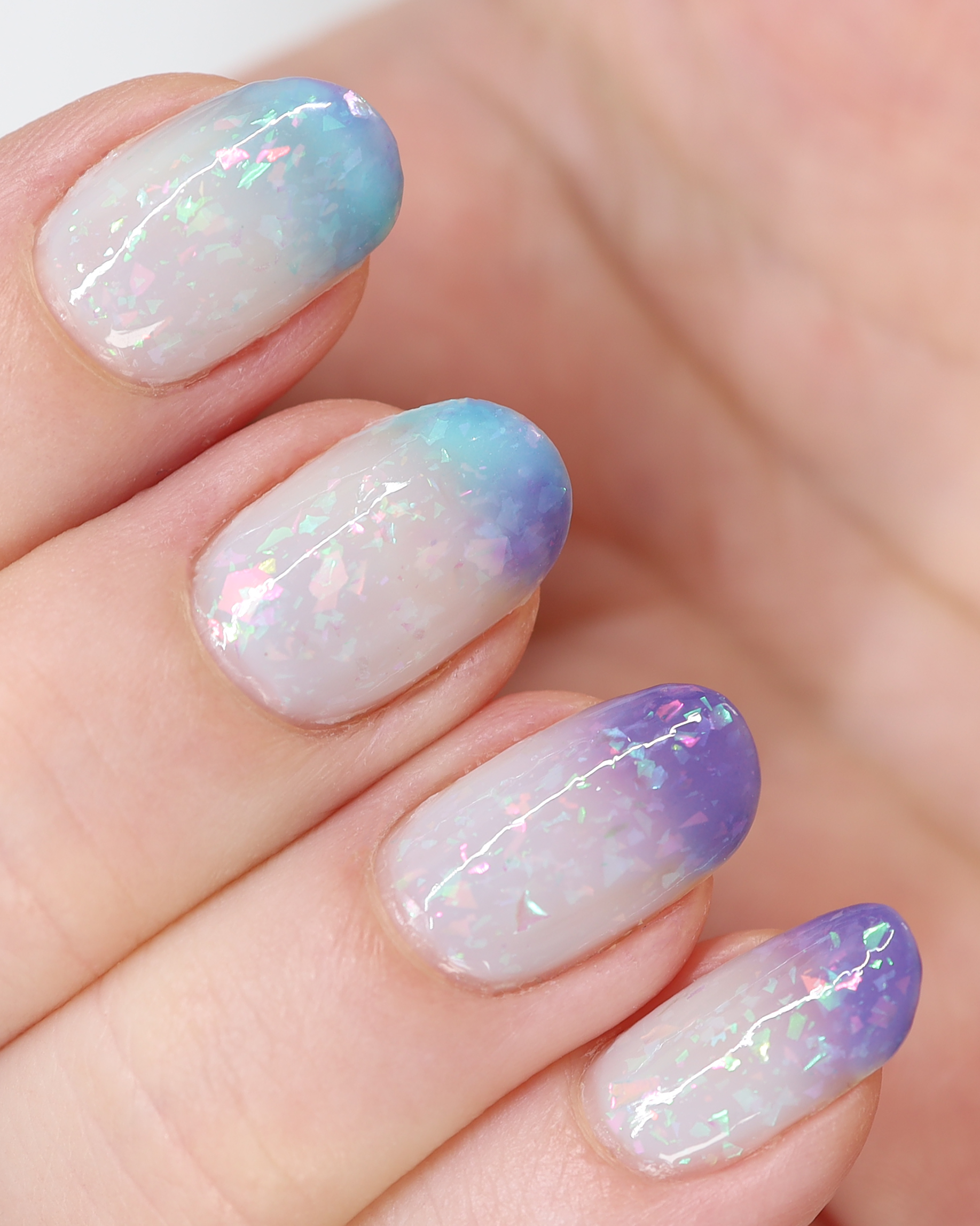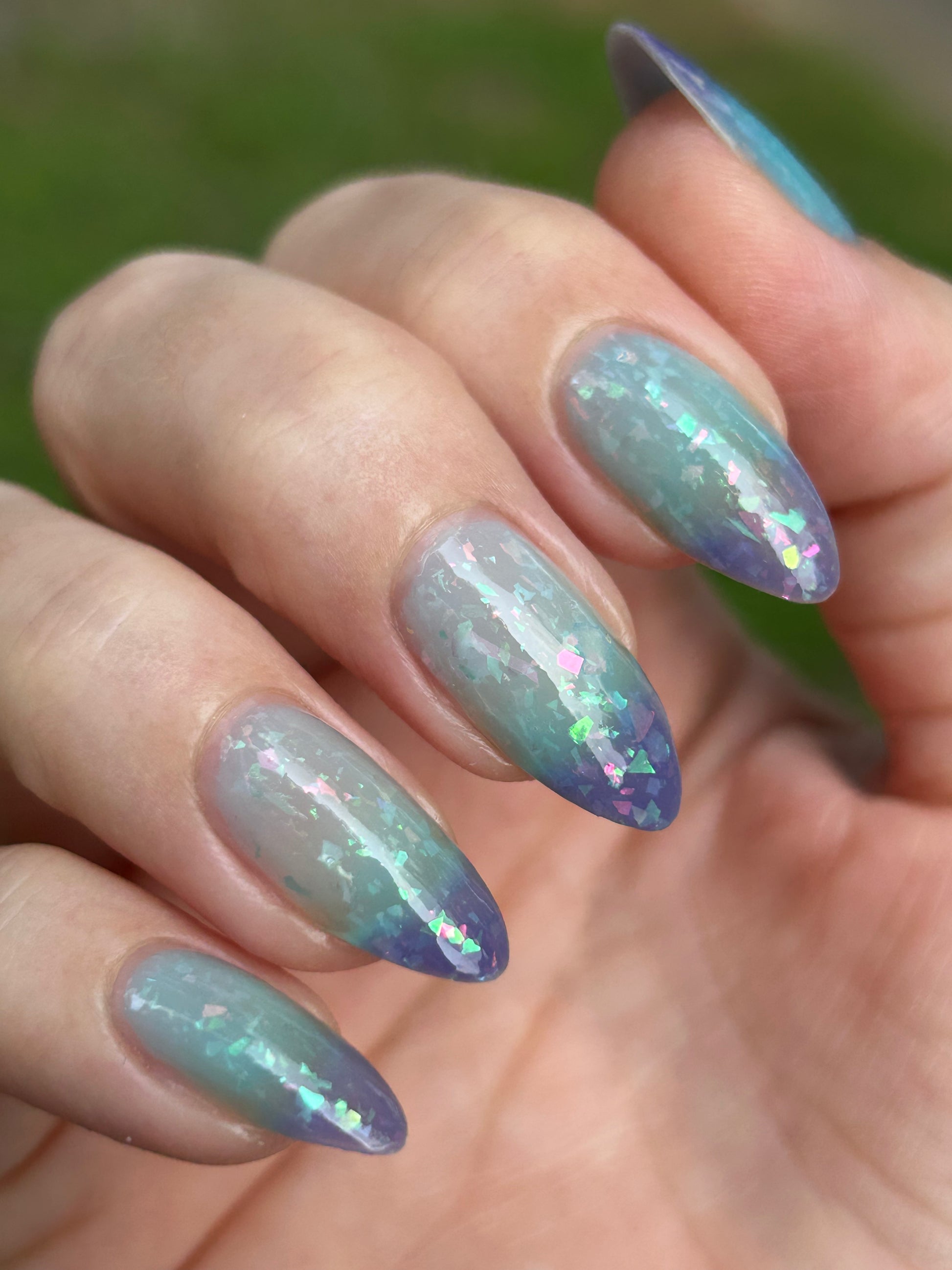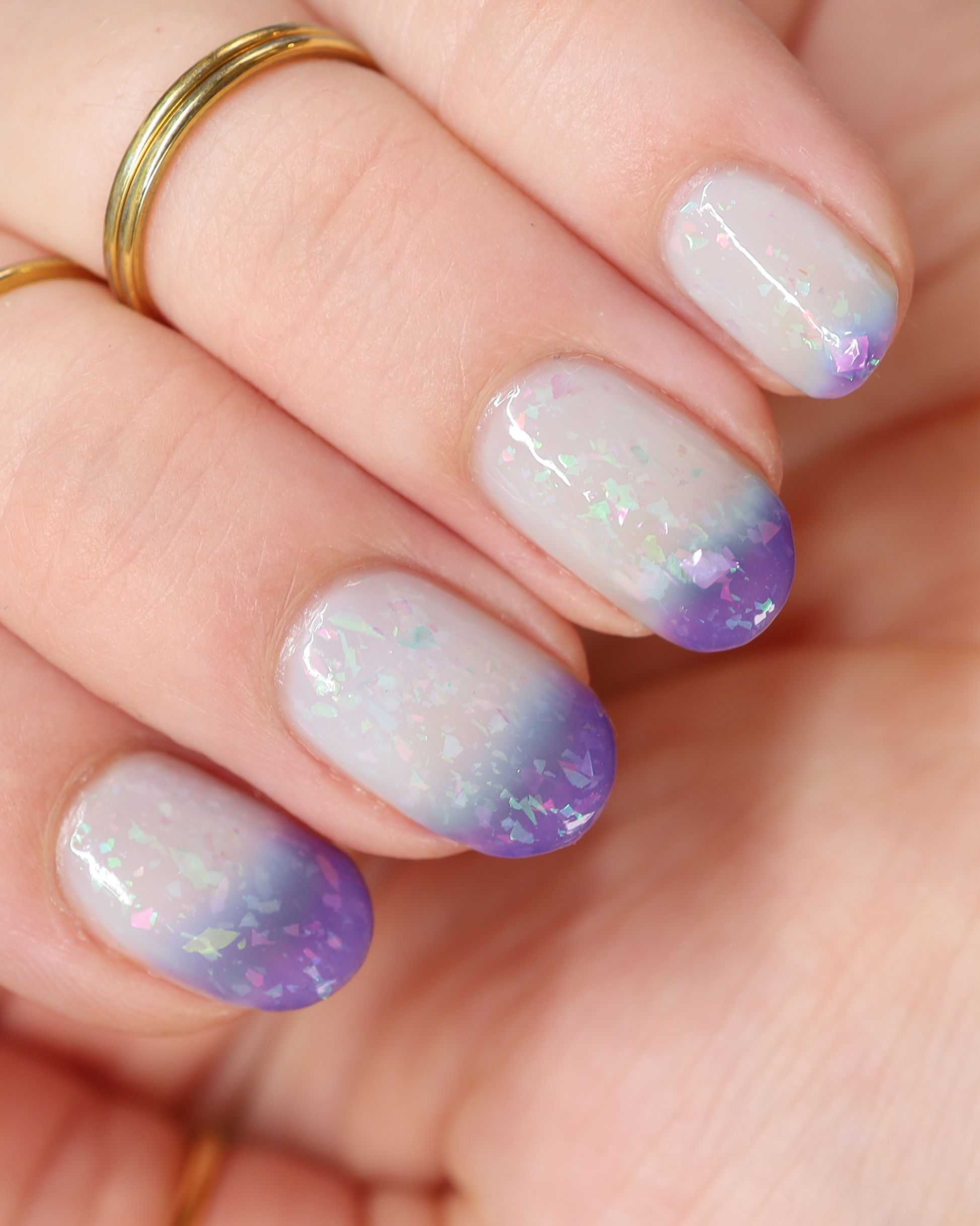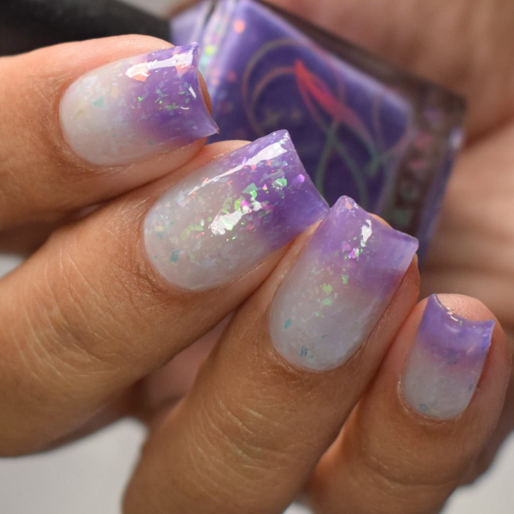 This polish features a thermal base that goes from light lavendar (cold) to sky blue (warm) to white (hot). It also has both pink and green flakes!