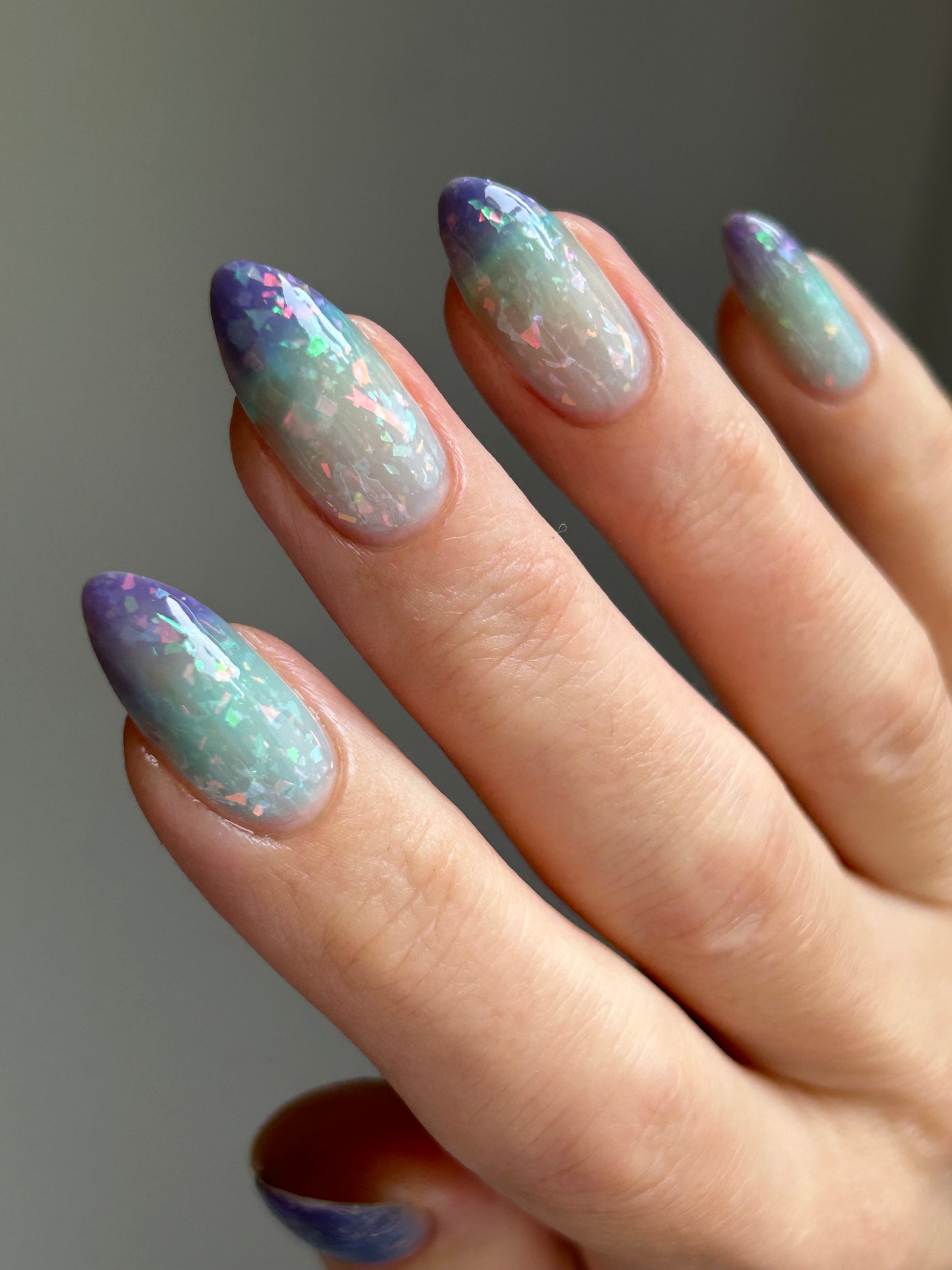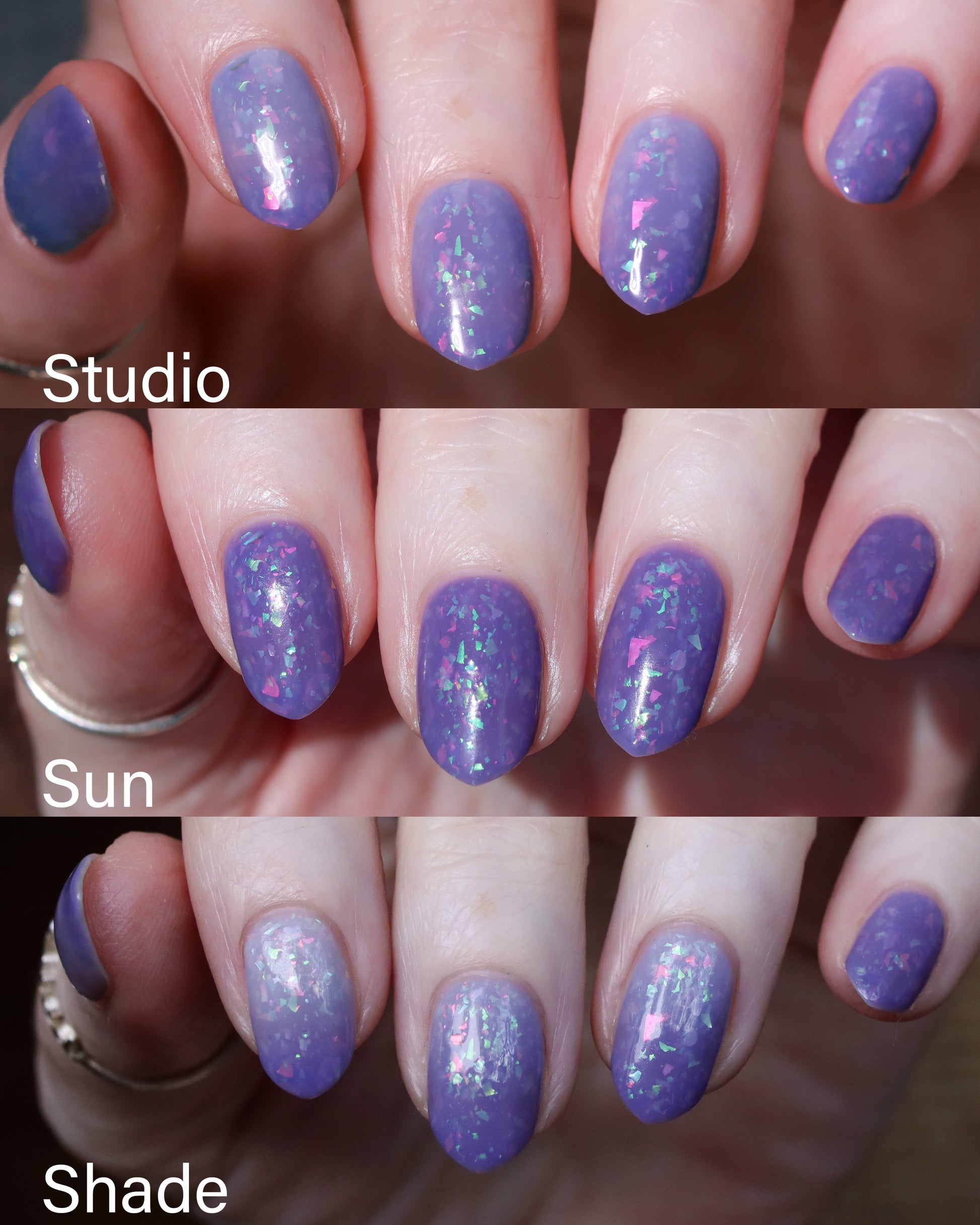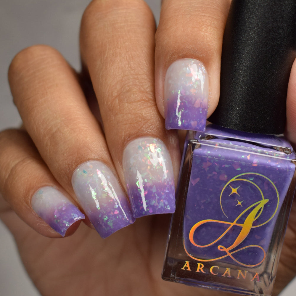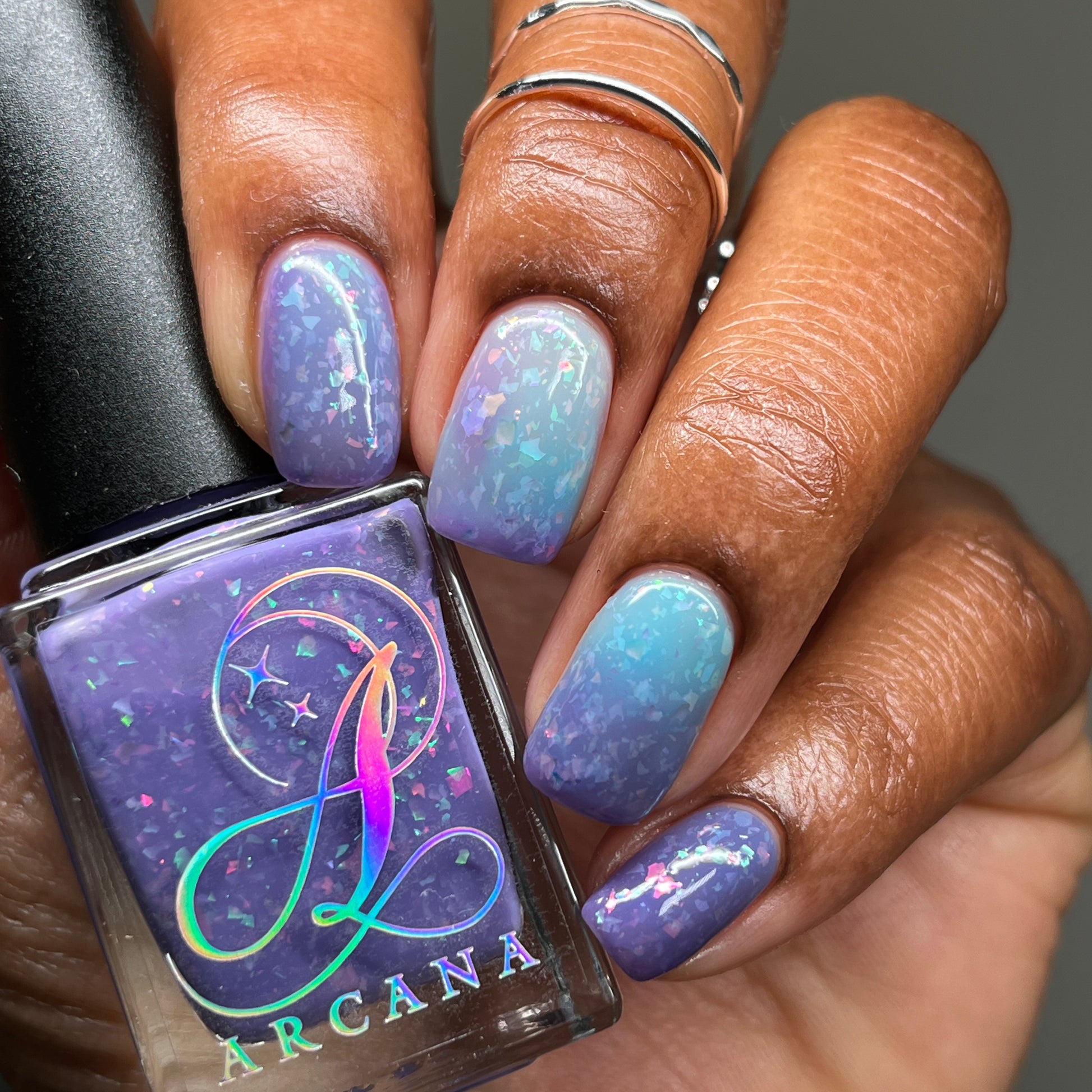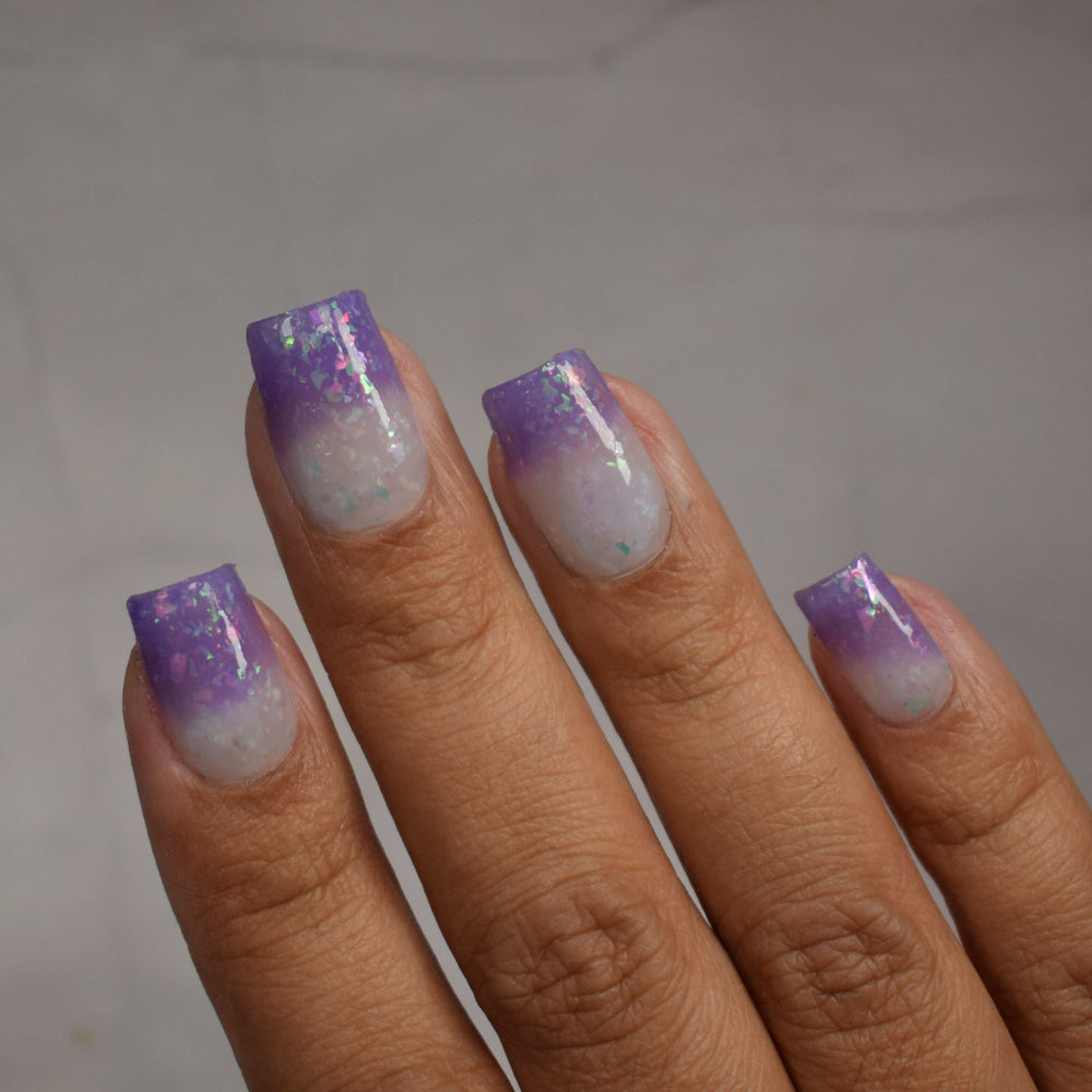 This polish features a thermal base that goes from light lavendar (cold) to sky blue (warm) to white (hot). It also has both pink and green flakes!